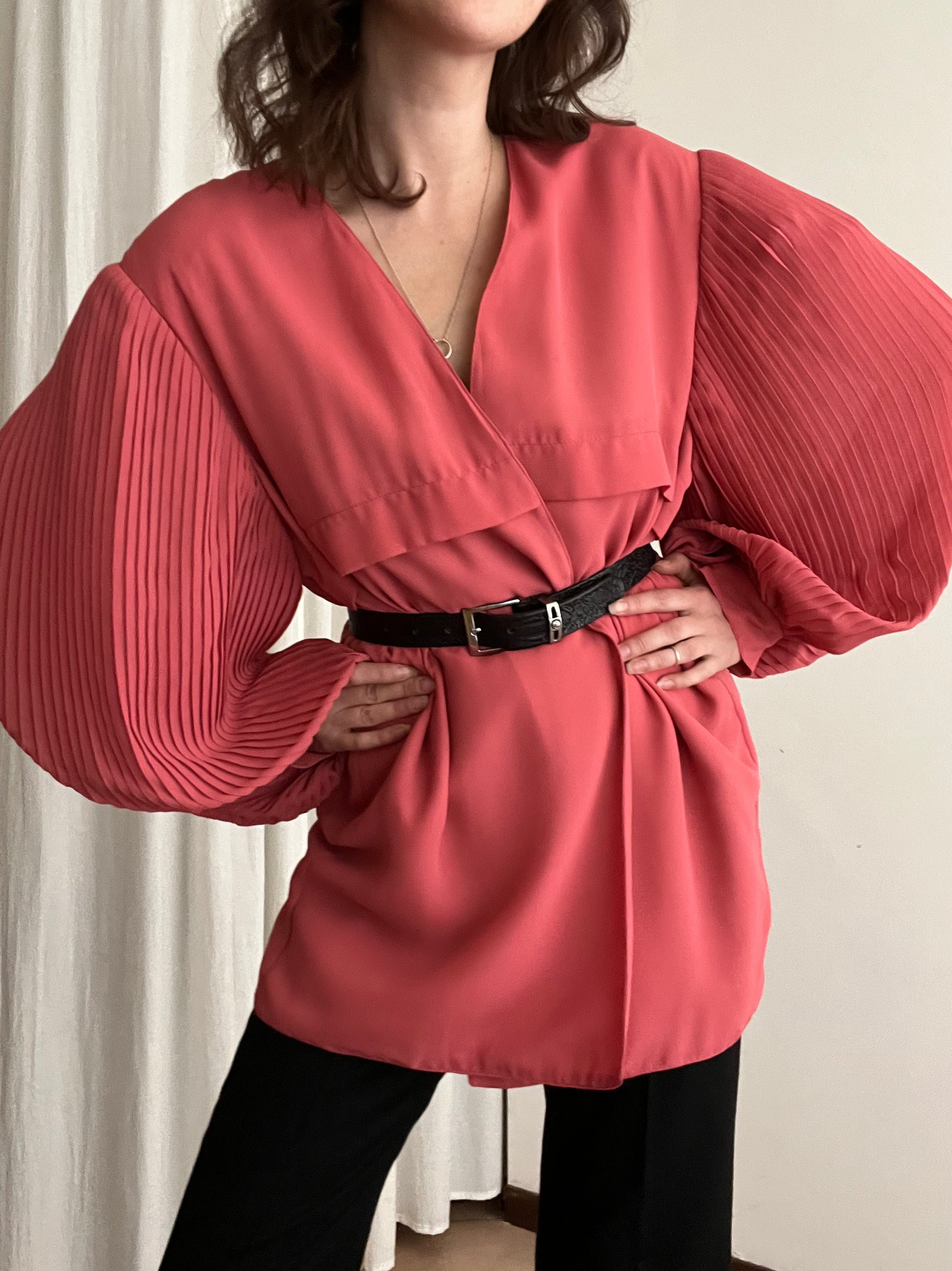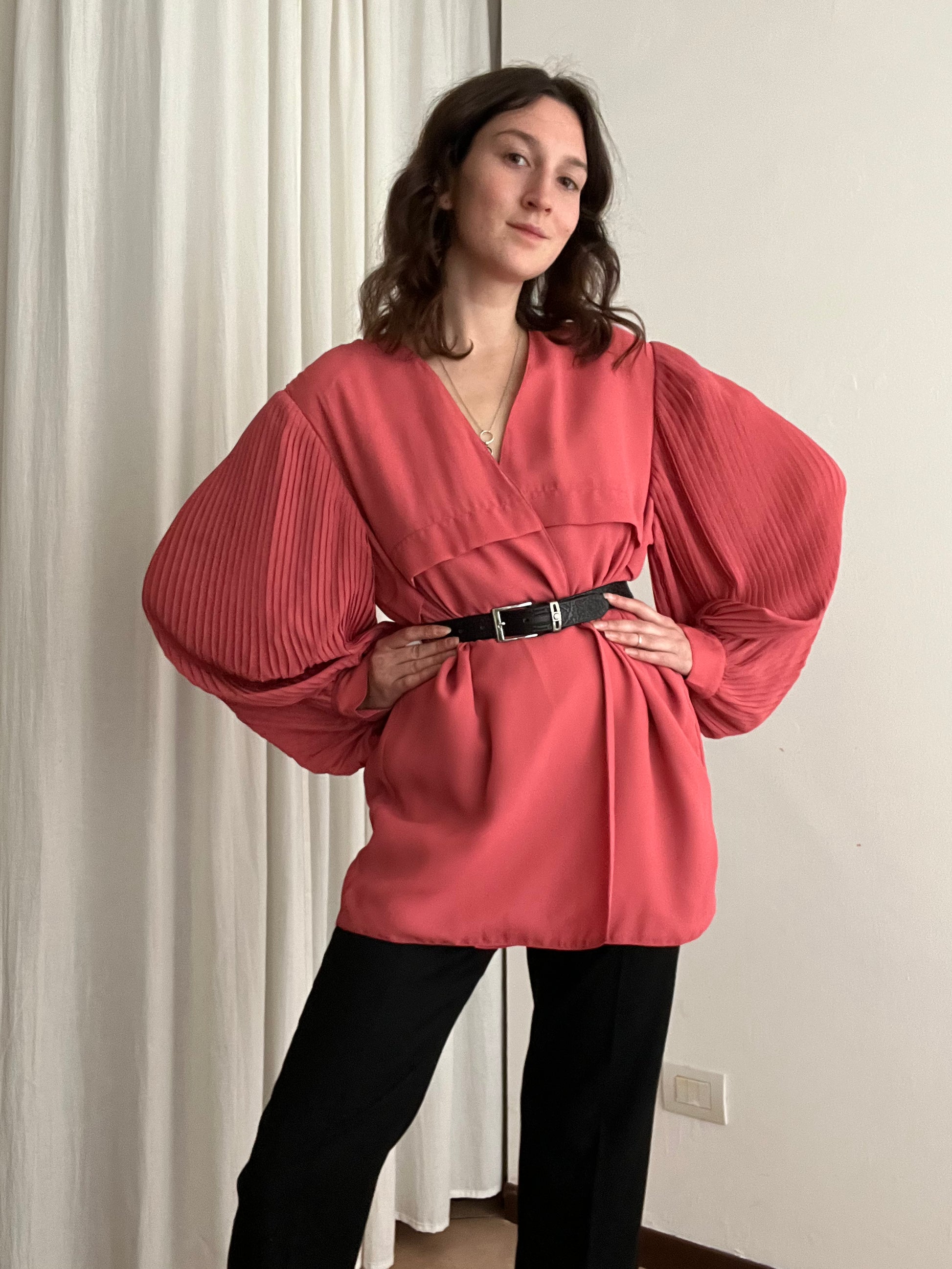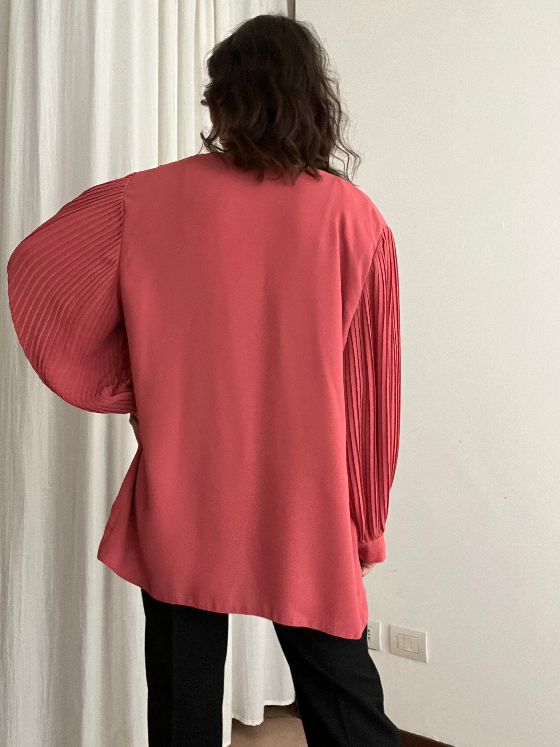 Giacca leggera rosa con maniche a sbuffo plissettate. Taglia 52 ma essendo un tessuto che cade giù si adatta anche su taglie più piccole. Misure: spalle 56, ascelle 59, maniche 60, lunghezza 80.