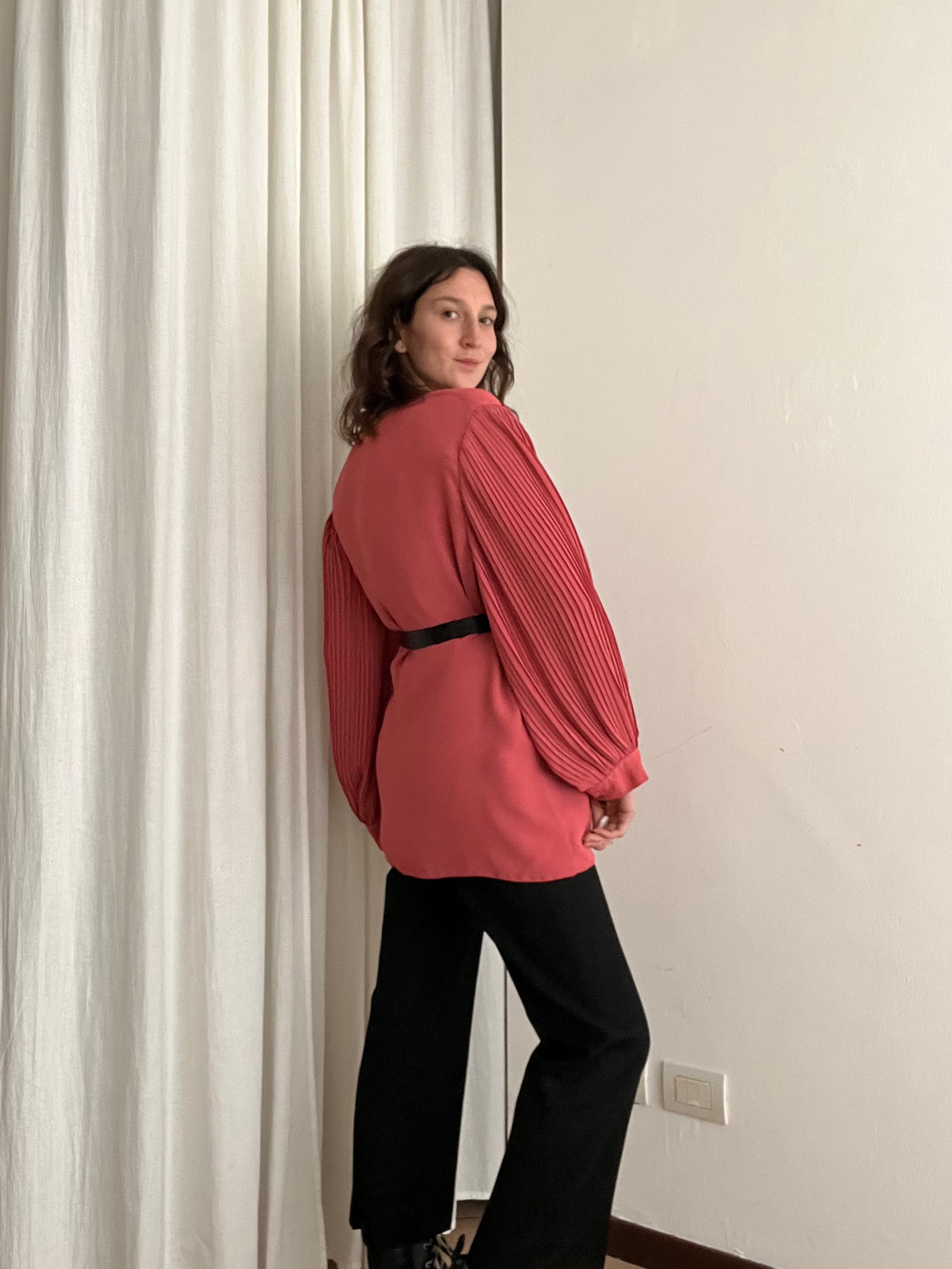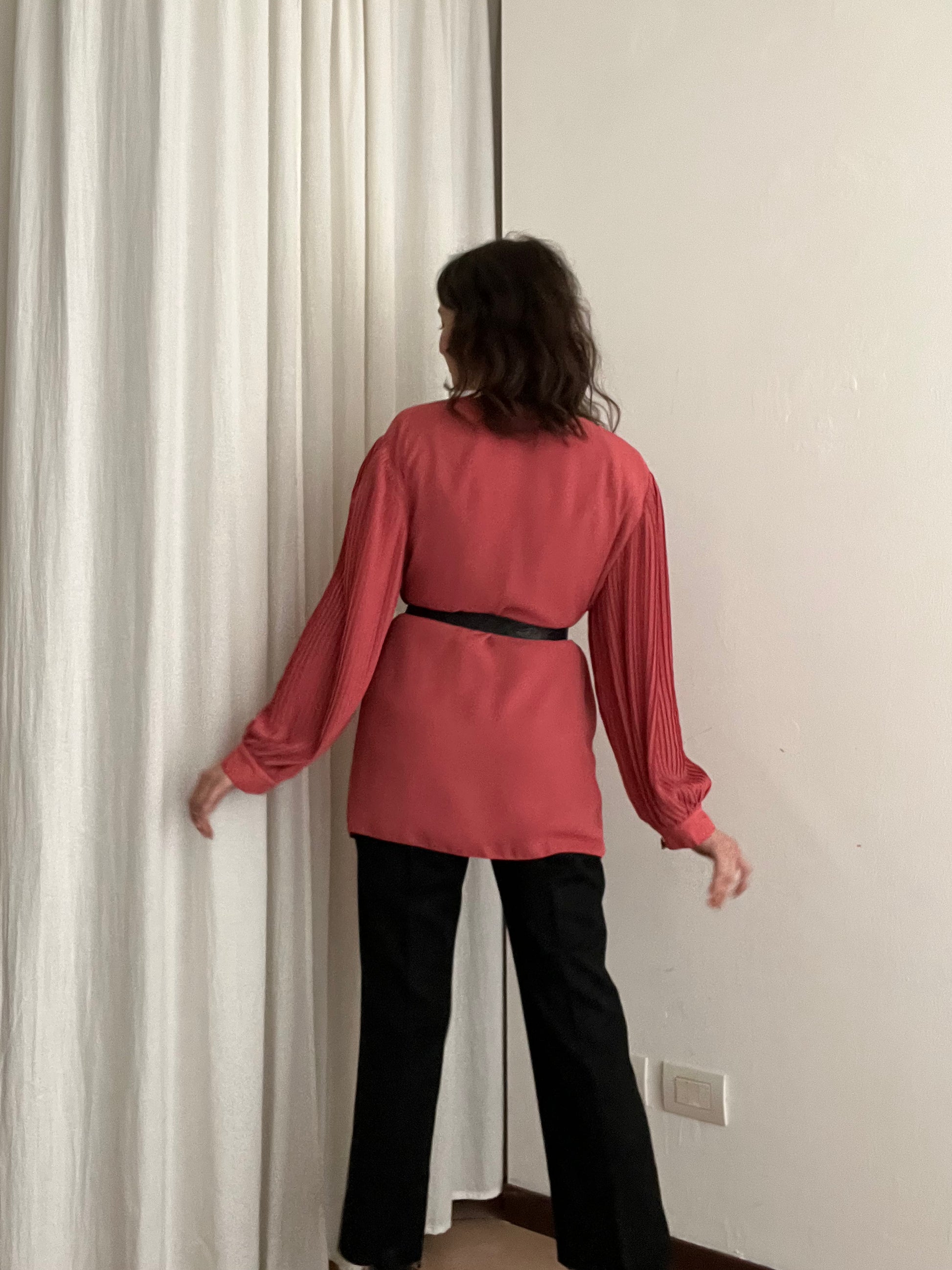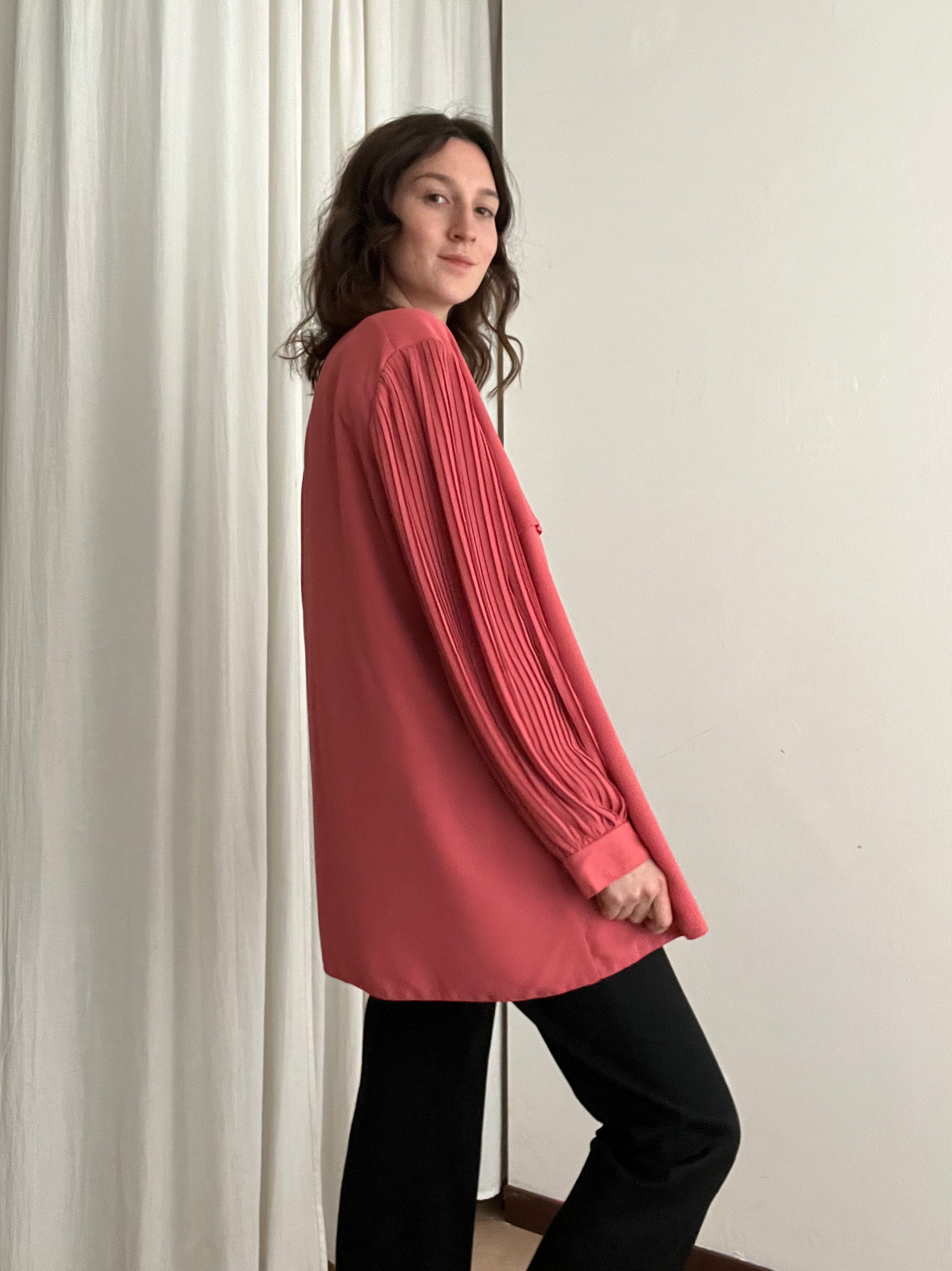 Giacca leggera rosa con maniche a sbuffo plissettate. Taglia 52 ma essendo un tessuto che cade giù si adatta anche su taglie più piccole. Misure: spalle 56, ascelle 59, maniche 60, lunghezza 80.