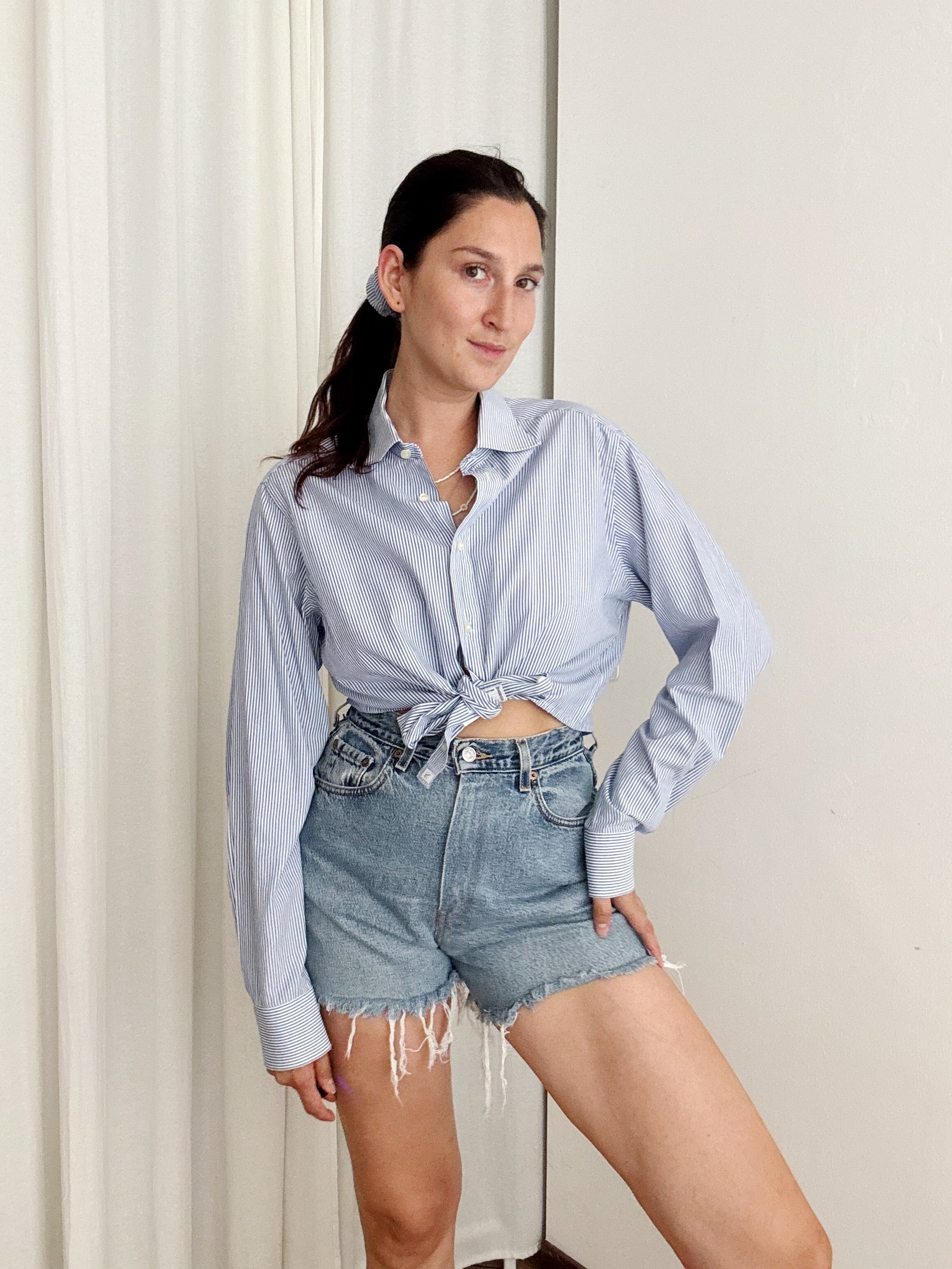 Camicia vintage da uomo tagliata lasciando il fiocco davanti. Con il tessuto ricavato è stato realizzato uno scrunchie per i capelli. Questa è a quadri colorati ed è una taglia L da uomo. In foto su una 42. Misura spalle 45 cm, ascelle 56