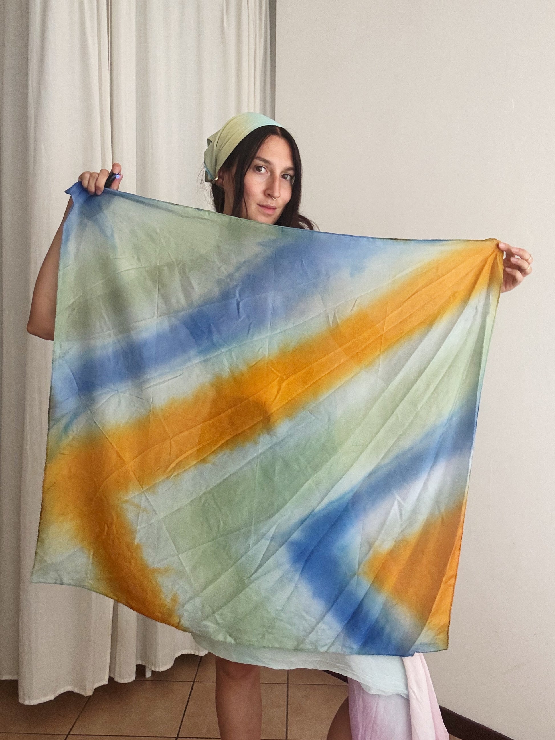 Foulard in pura seta tinto a mano con effetto tiedye. Misura: 84×88