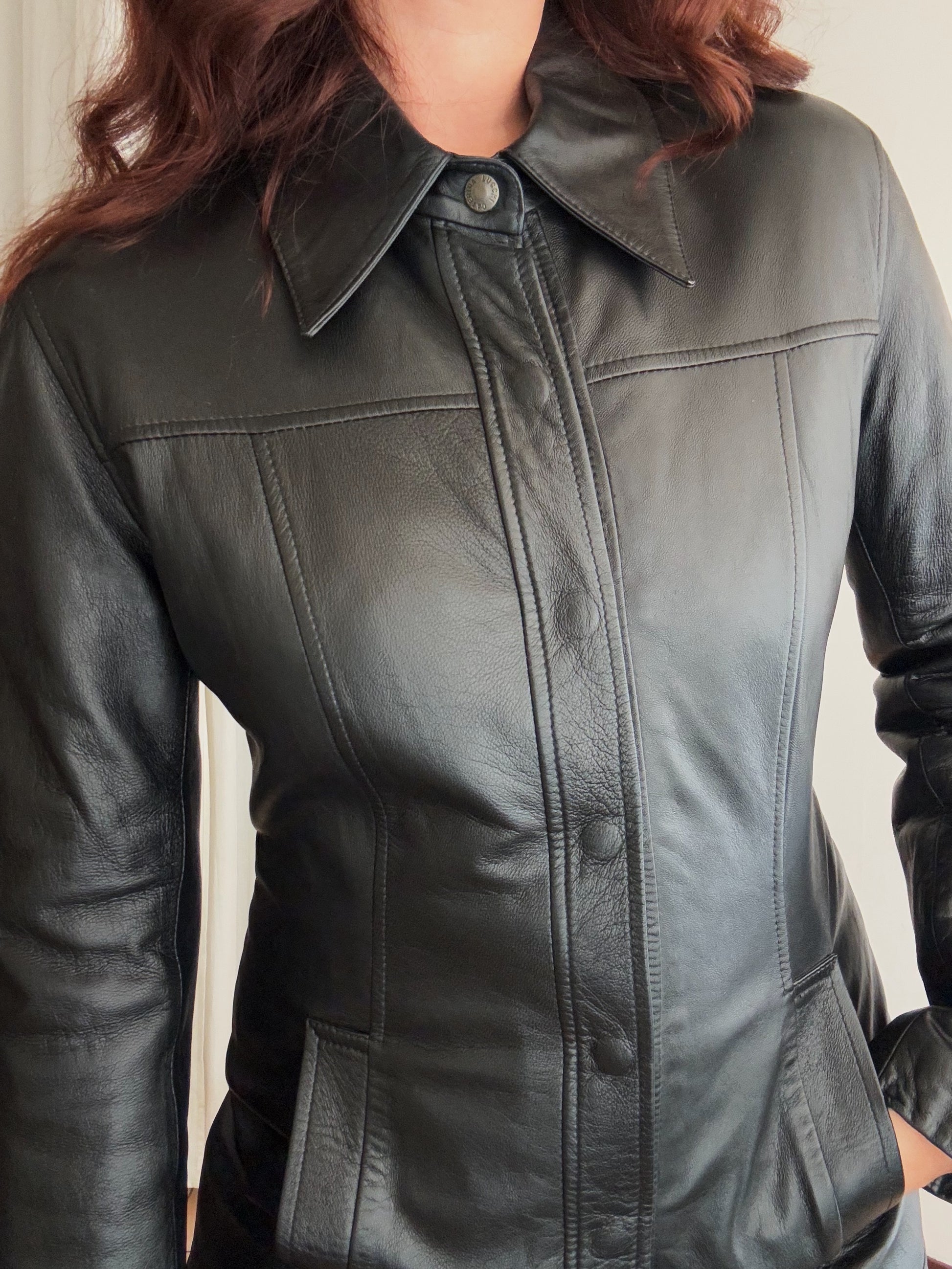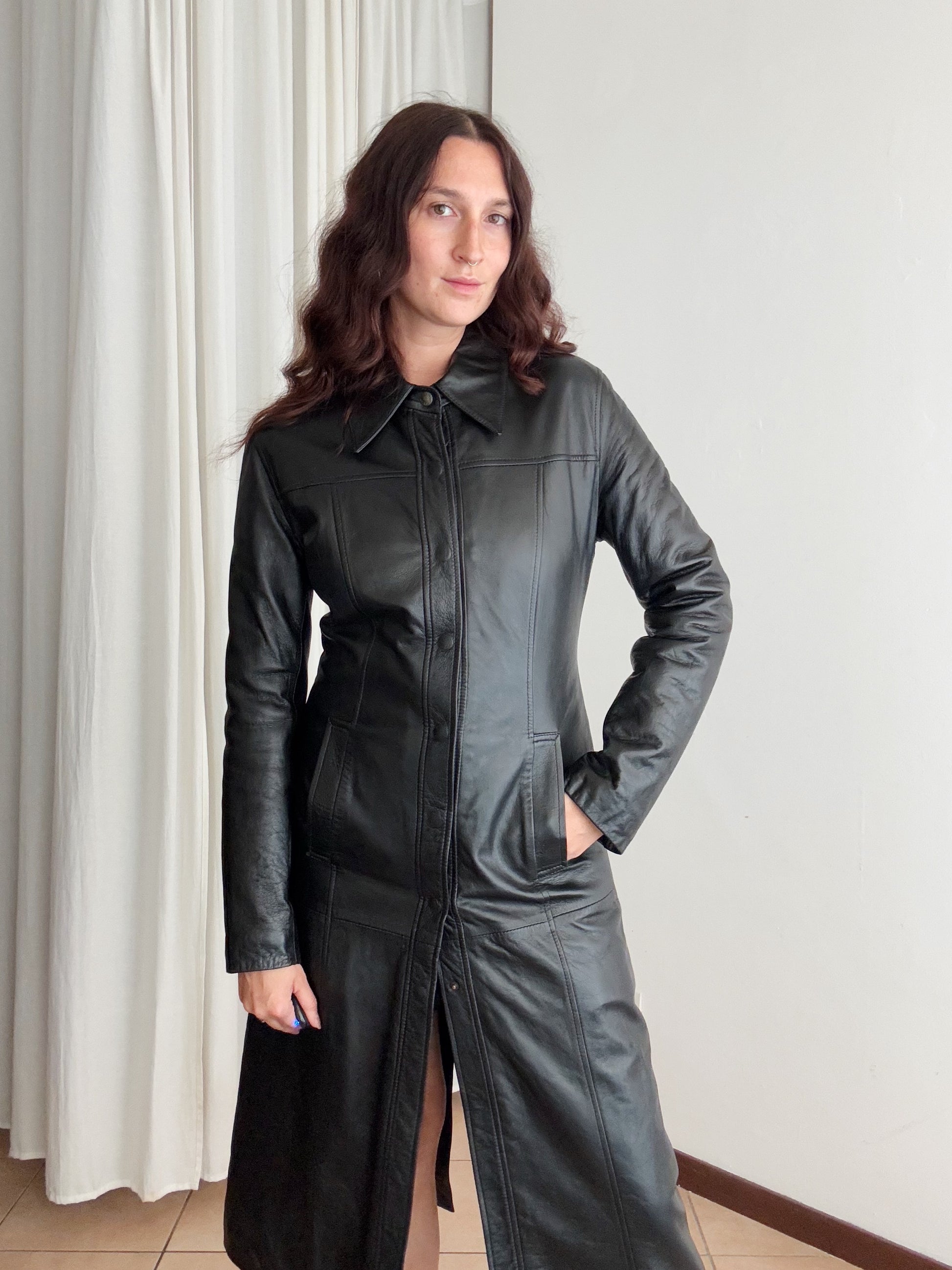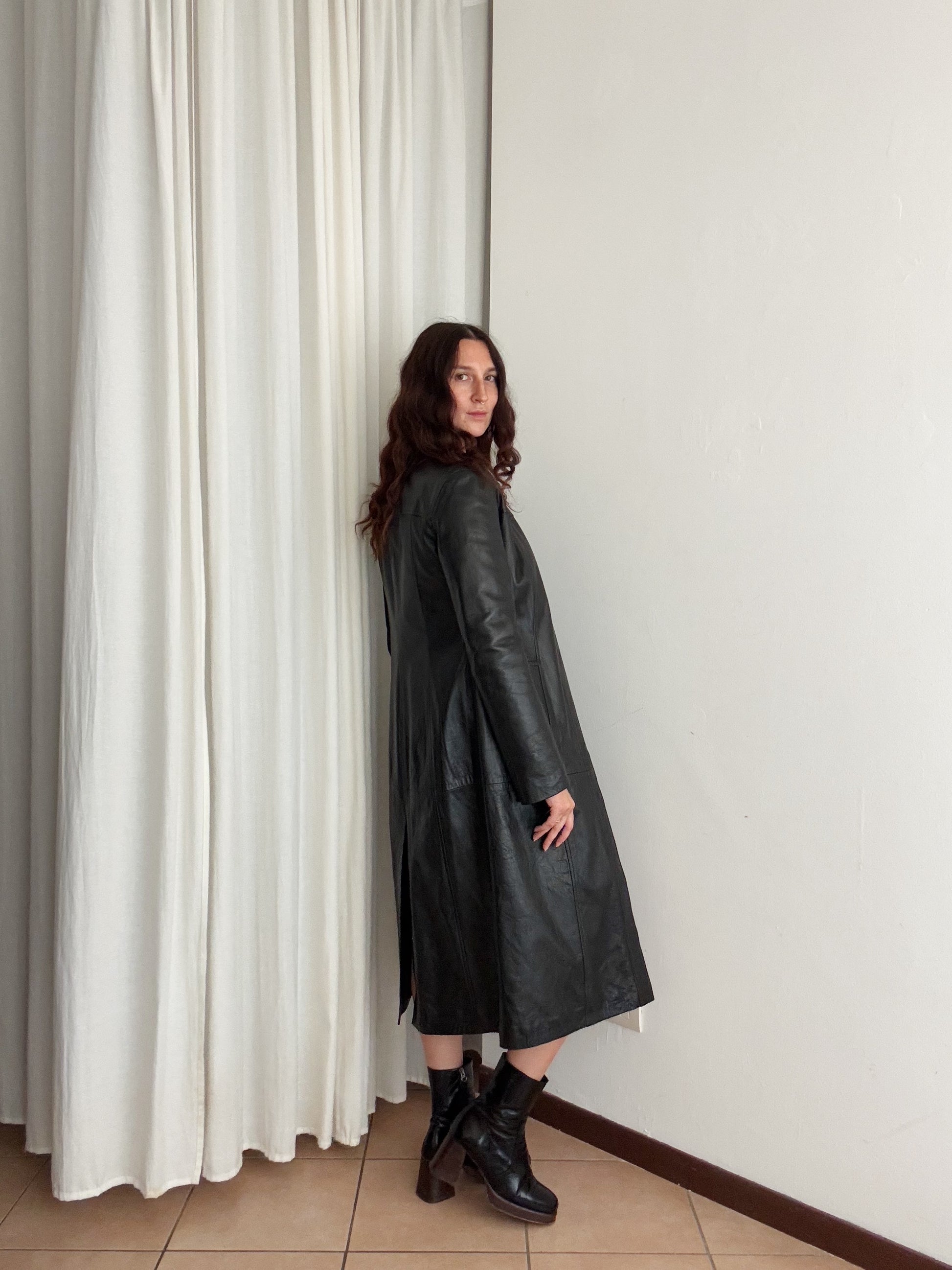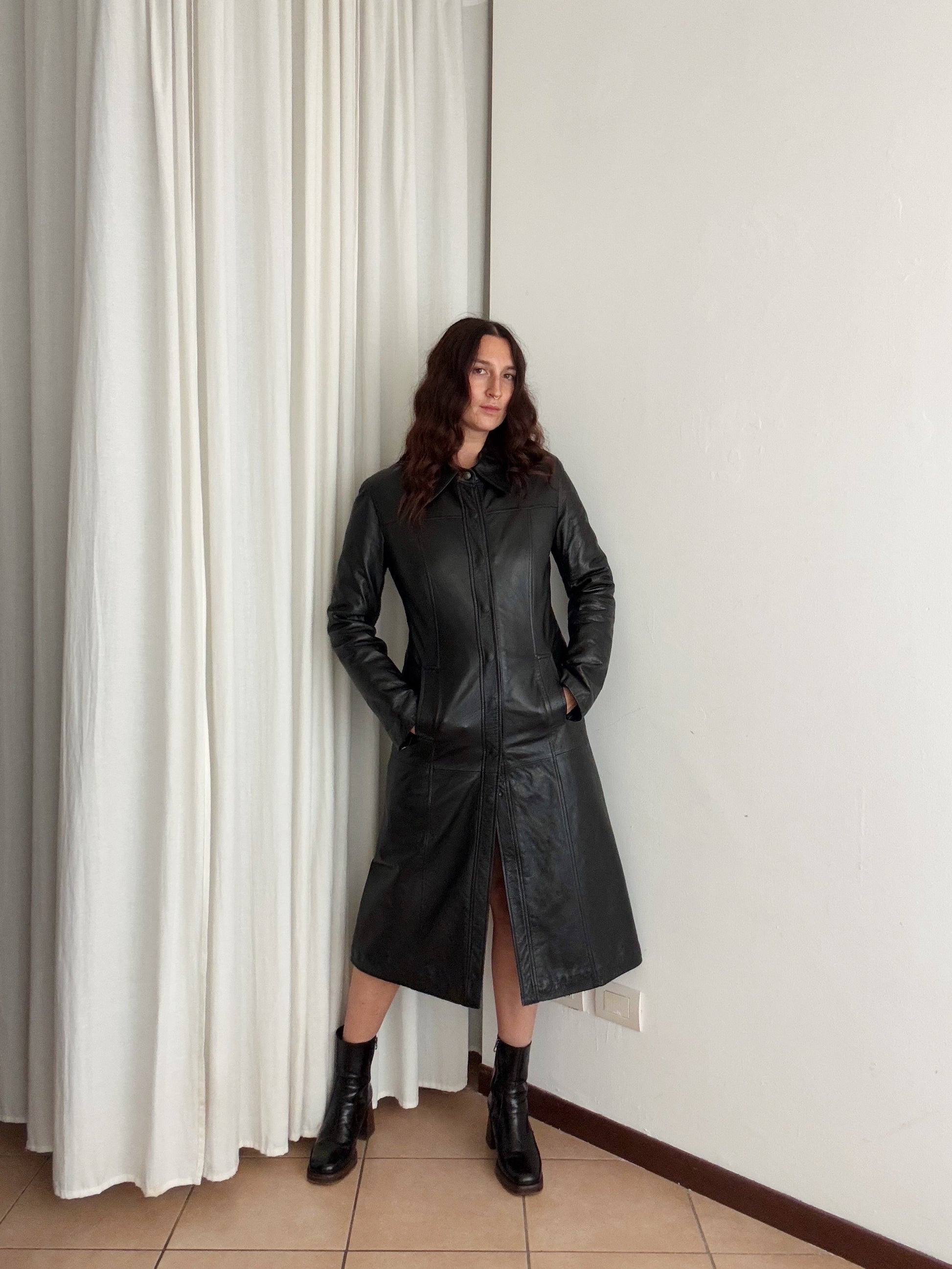 Giacca lunga in pelle vera vintage nera, taglia 44 ma veste meglio fino a una 42. Chiusura con bottoni a clip. Misure: spalle 44, ascelle 37, maniche 63, lunghezza 118