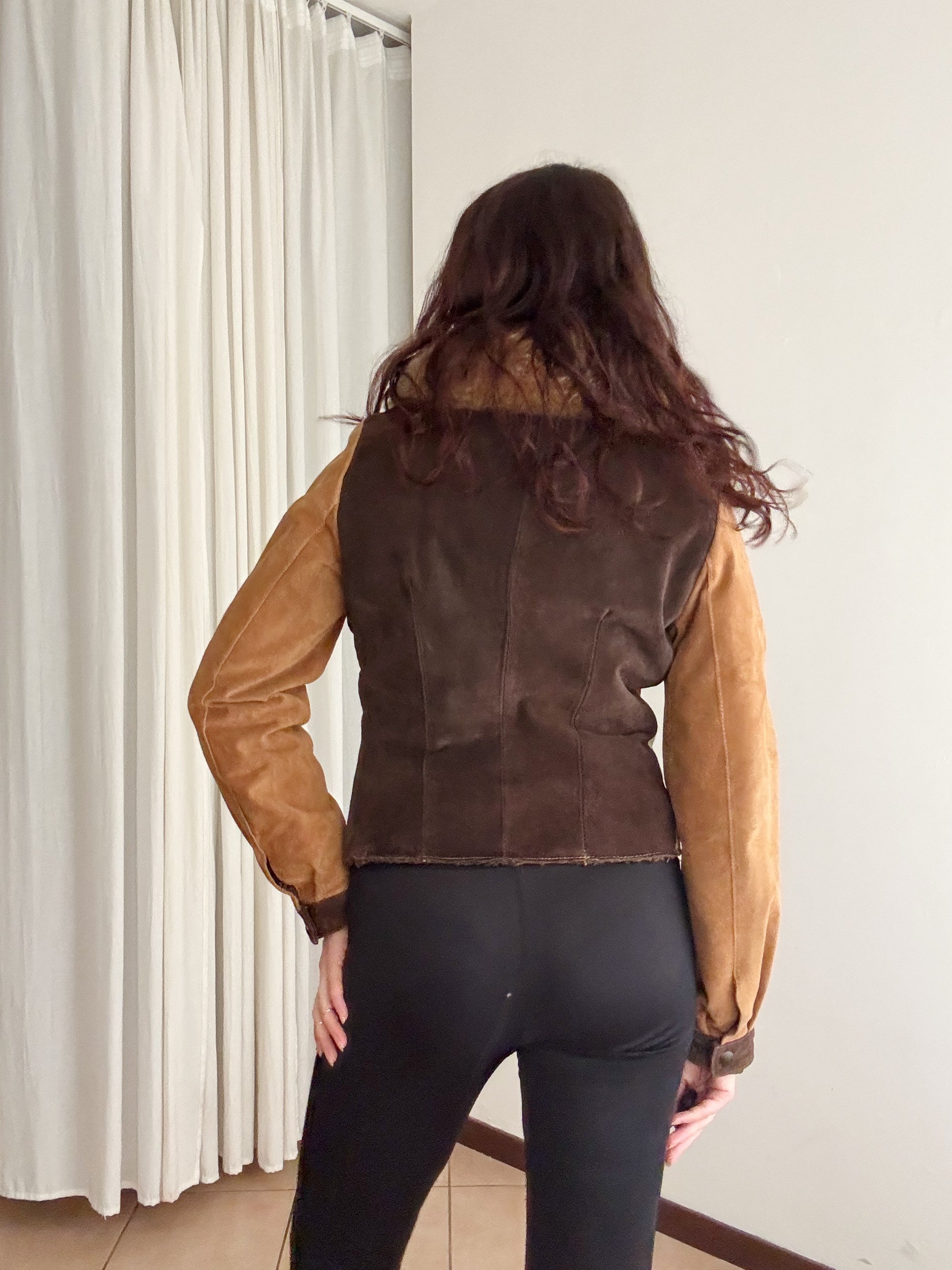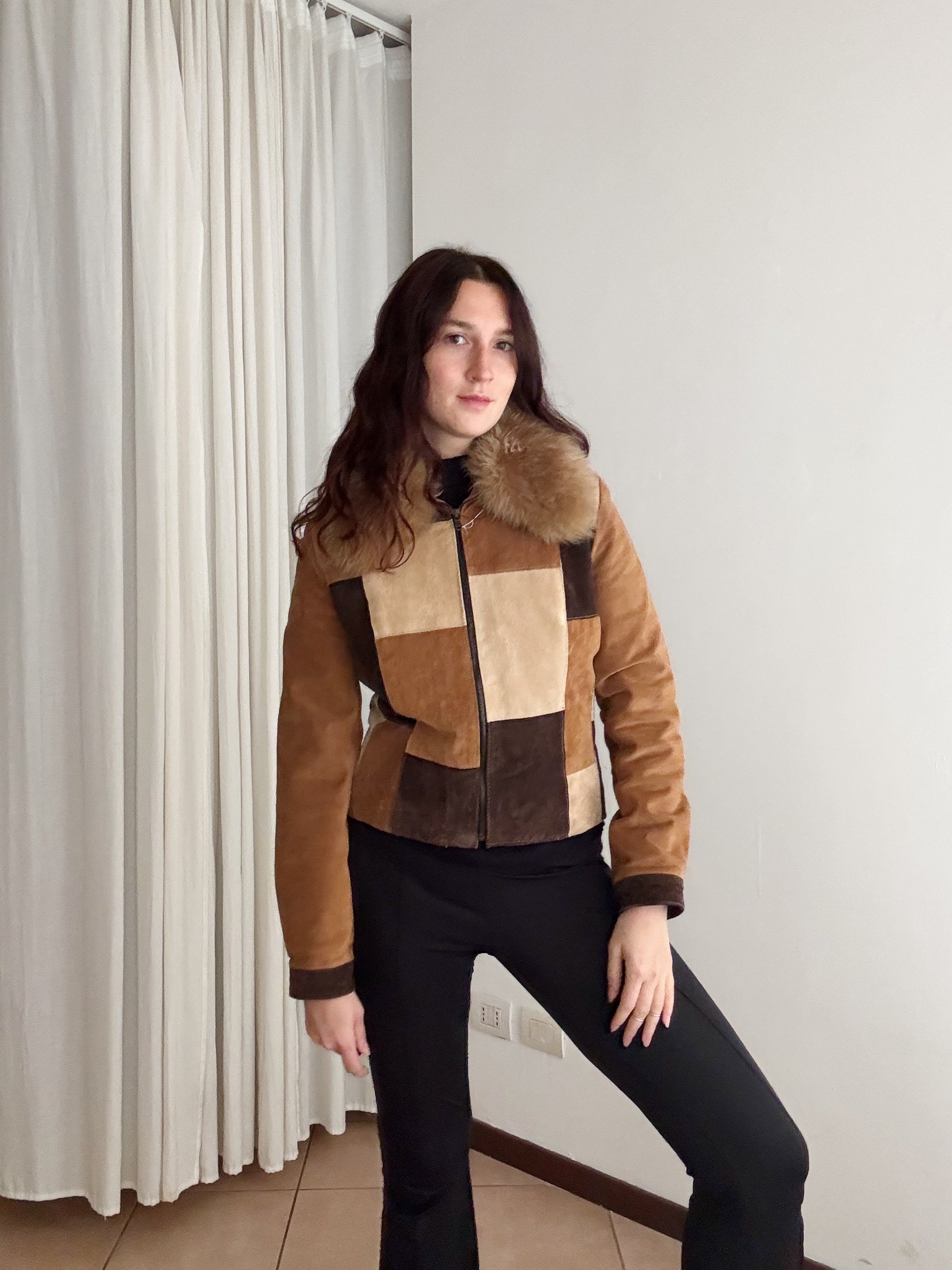 Giacca vintage in pelle vera marrone scampsciata in lavorazione patchwork. Interno in pelliccia sintetica e abche colletto. Taglia M. Misure: spalle 42, ascelle 49, maniche 64, lunghezza 52.