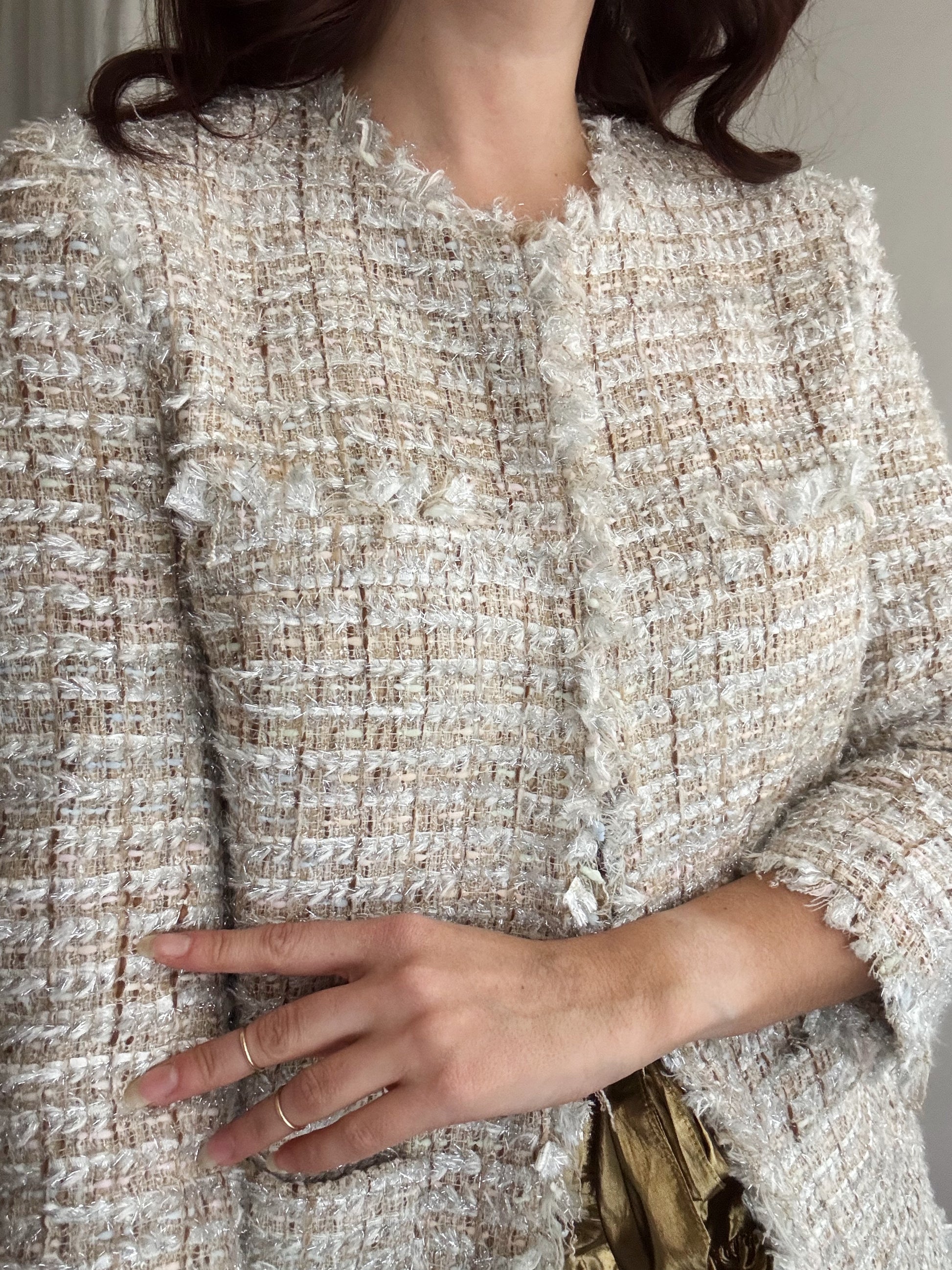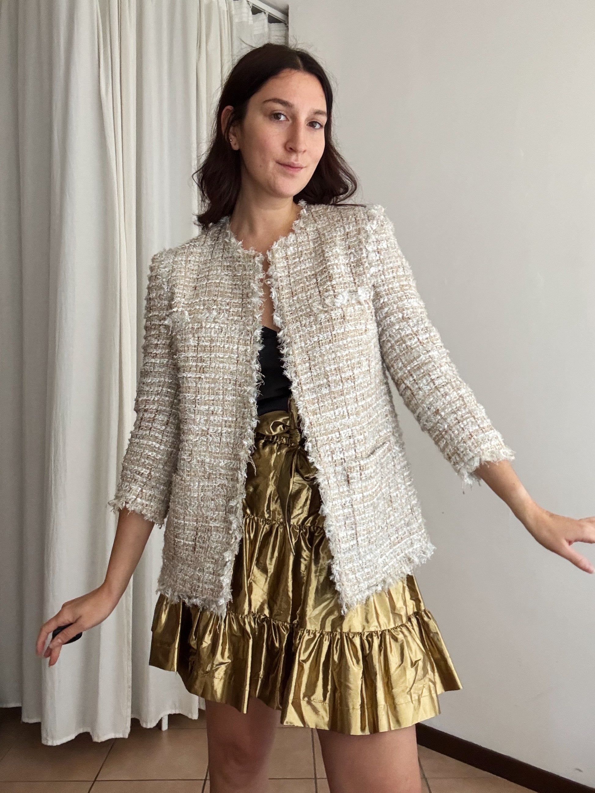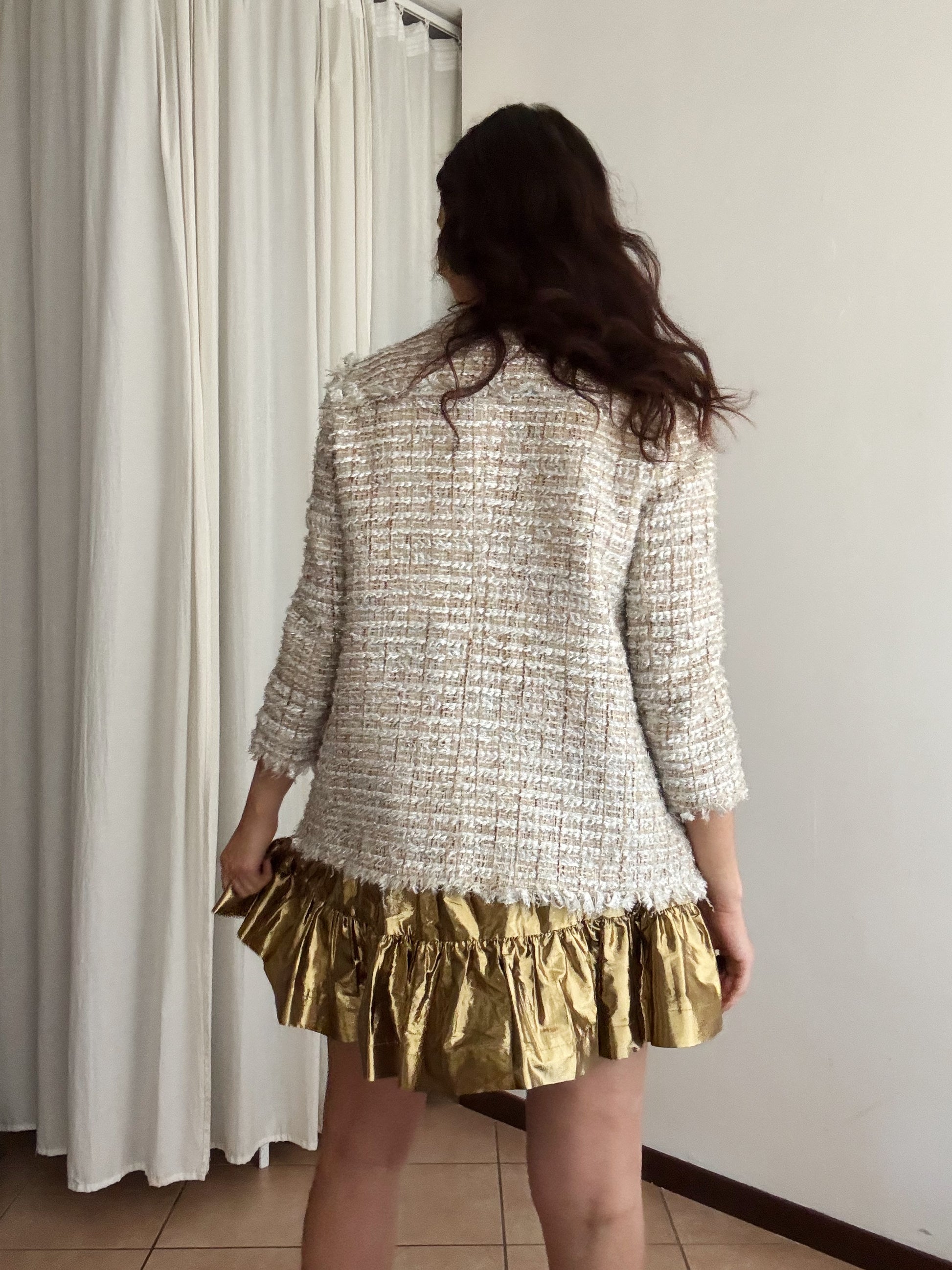Giacca in tessuto trama chanel firmata MSGM taglia 46 ma veste meglio taglia M. Misure: spalle 40, ascelle 50, maniche 48, lunghezza 68