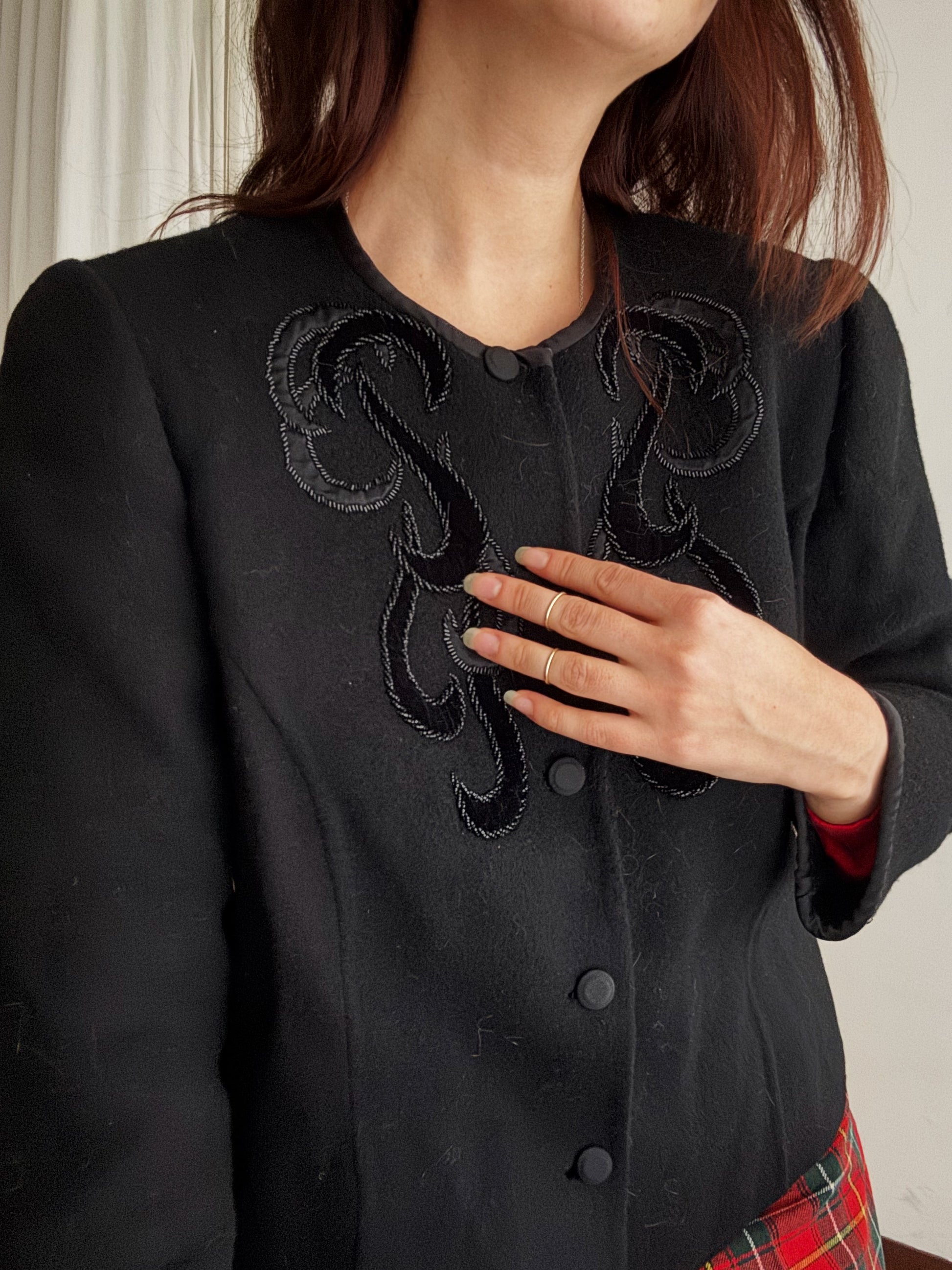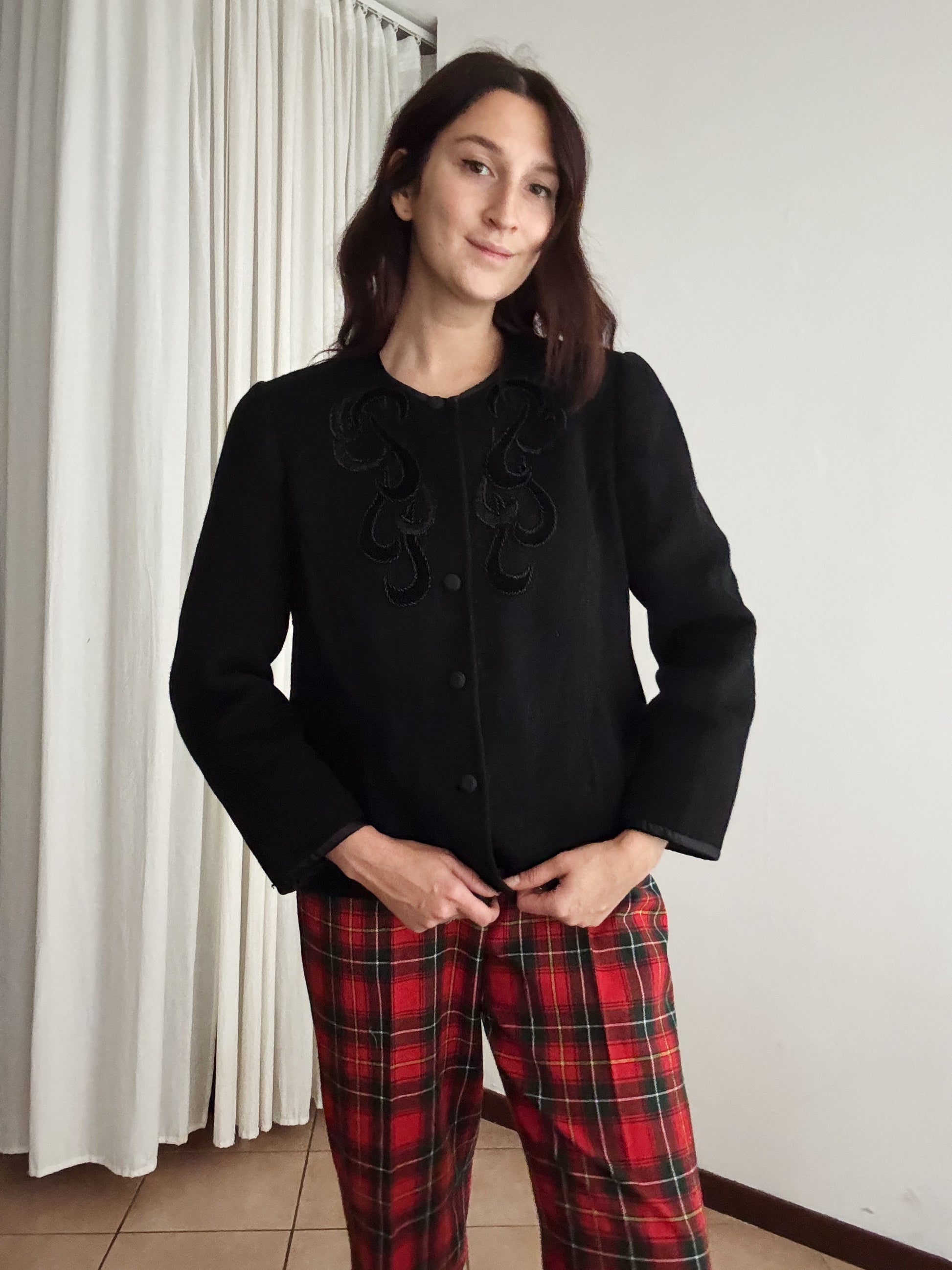 Giacca vintage nera sartoriale con lavorazione sul davanti. Veste taglia M/L. Misure: spalle 40cm, ascelle 55, maniche 58, lunghezza 60.Composizione non riportata ma sicuramente lana e anche molto morbida