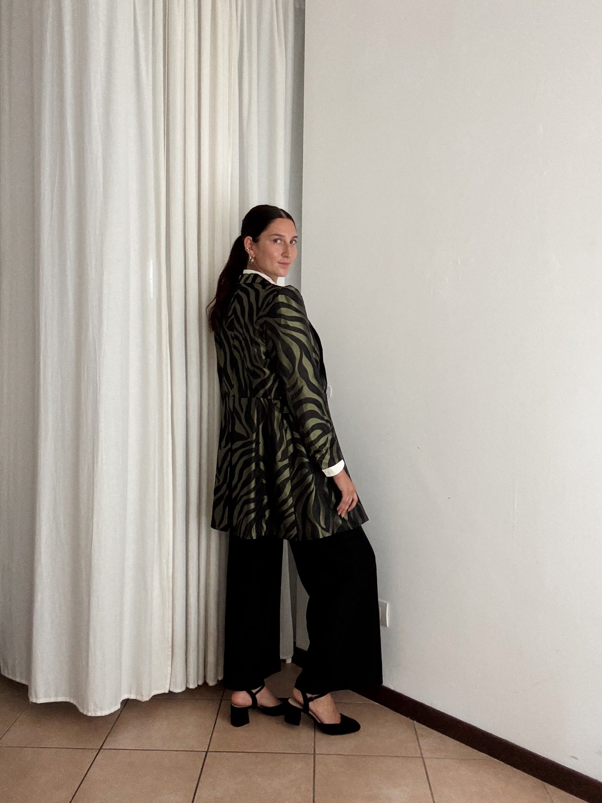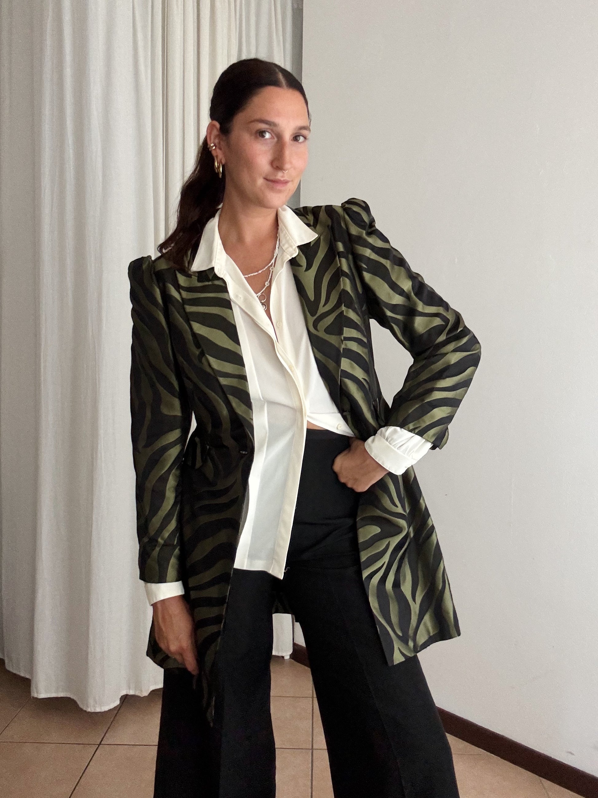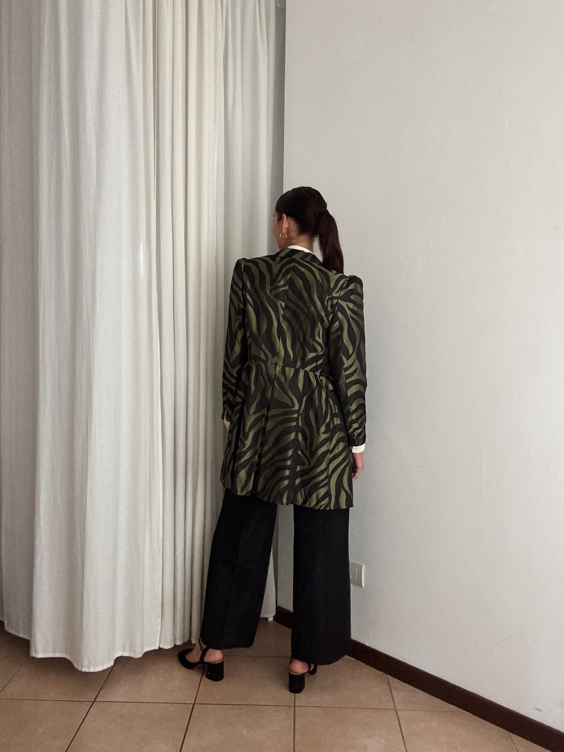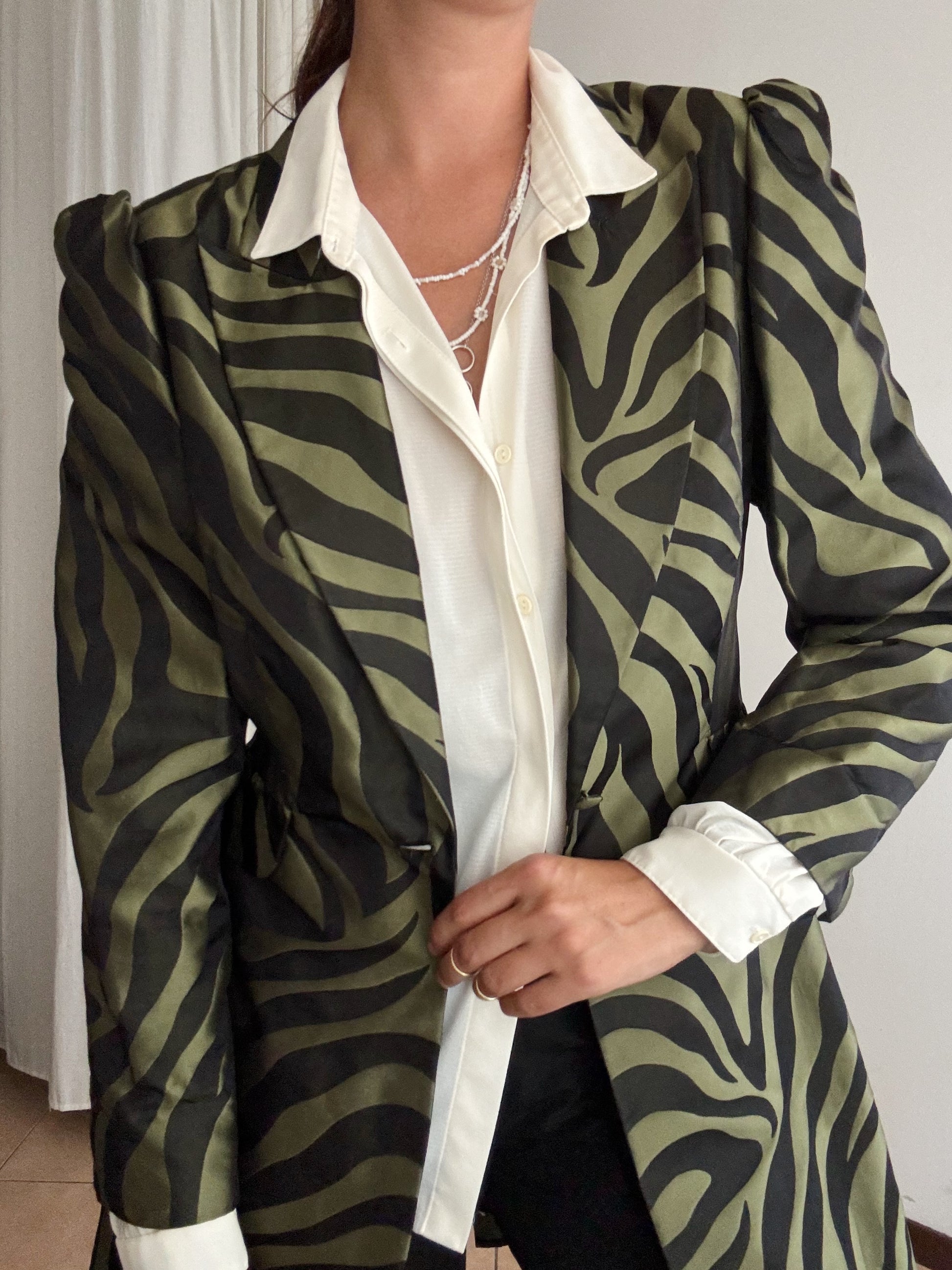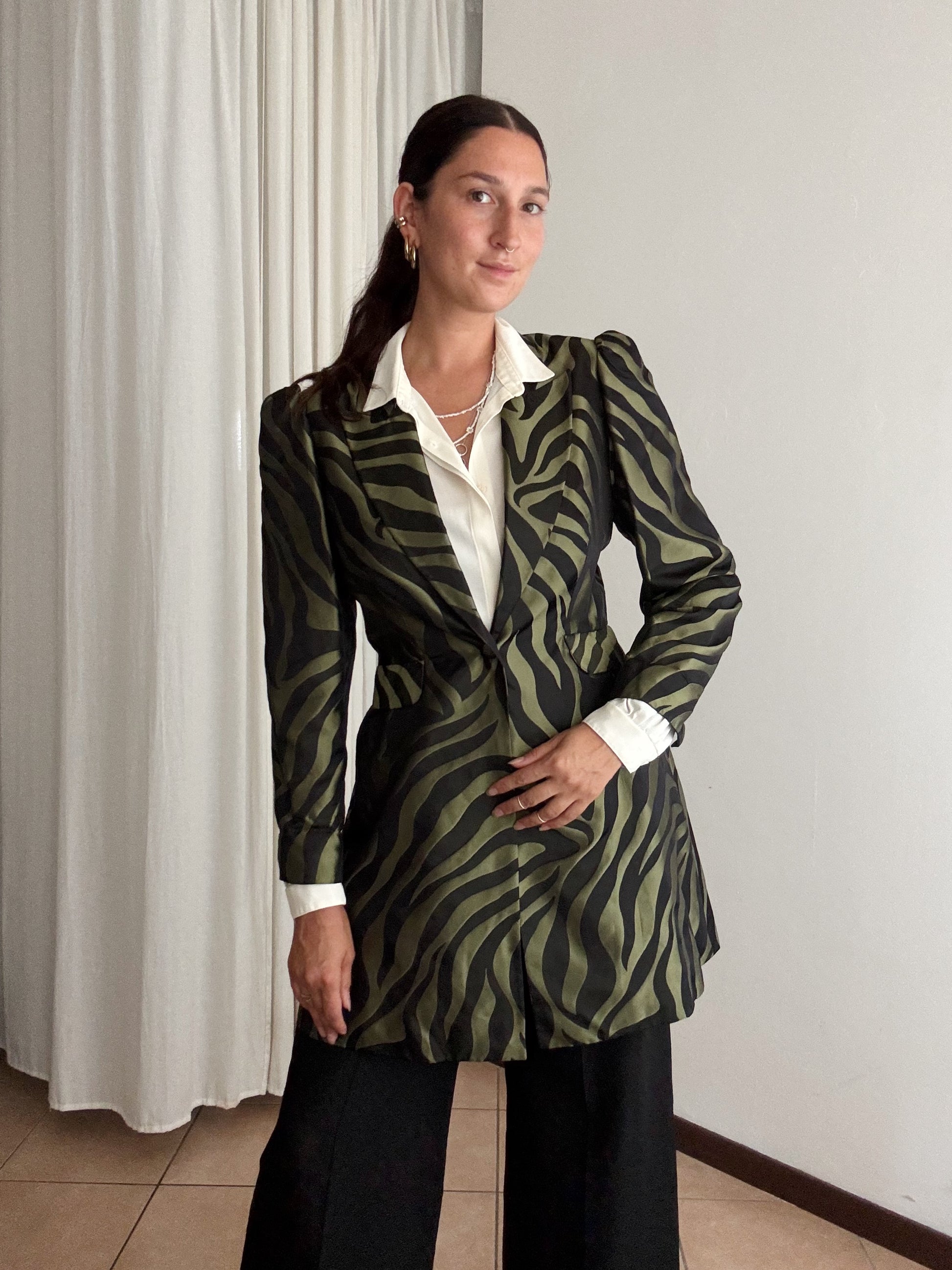 Blazer vintage sartoriale con stampa zebrata verde e nera. Veste taglia M. Composizione non riportata ma potrebbe essere seta. Misure: spalle 37, ascelle 47, maniche 50, lunghezza 88