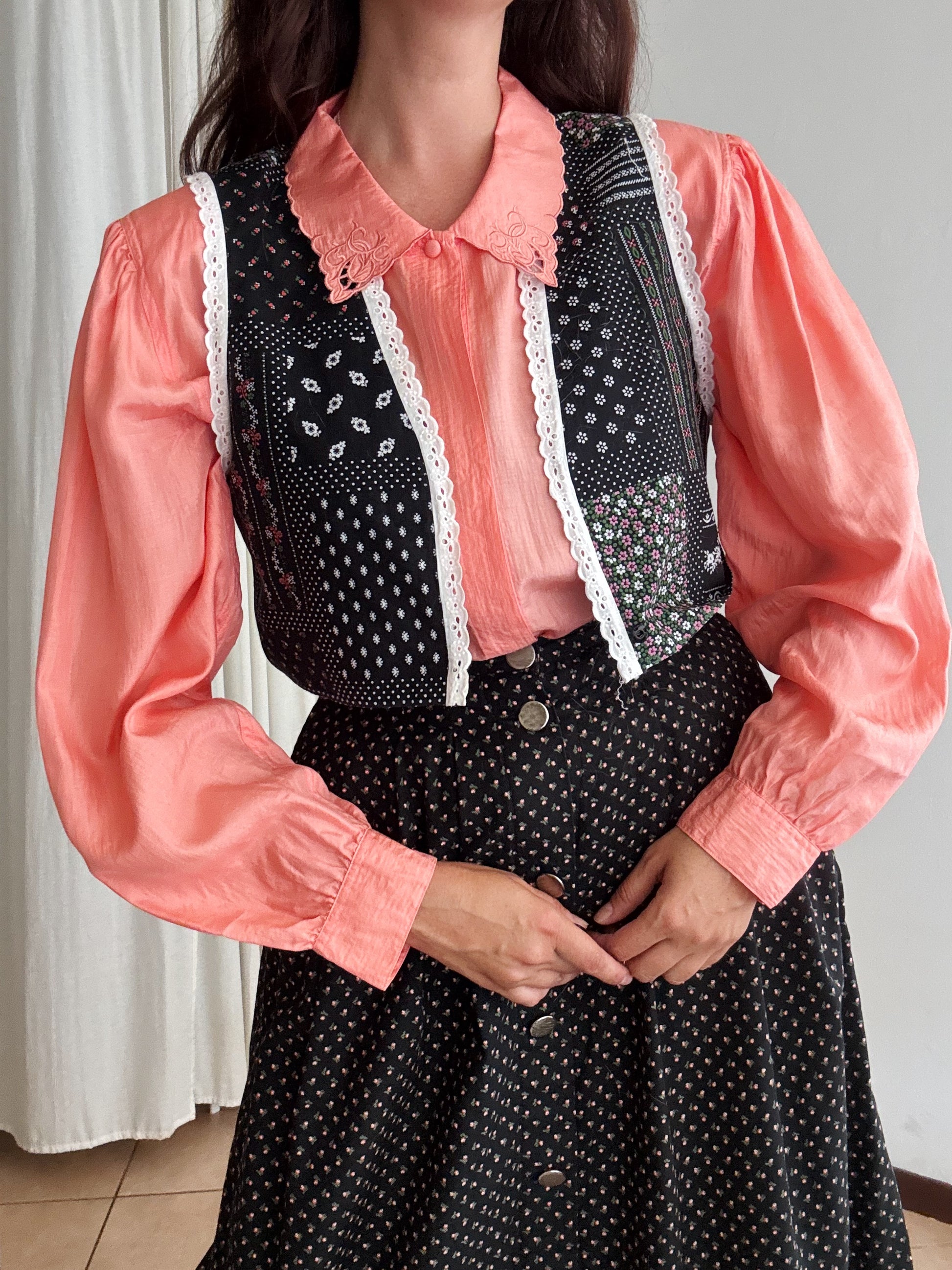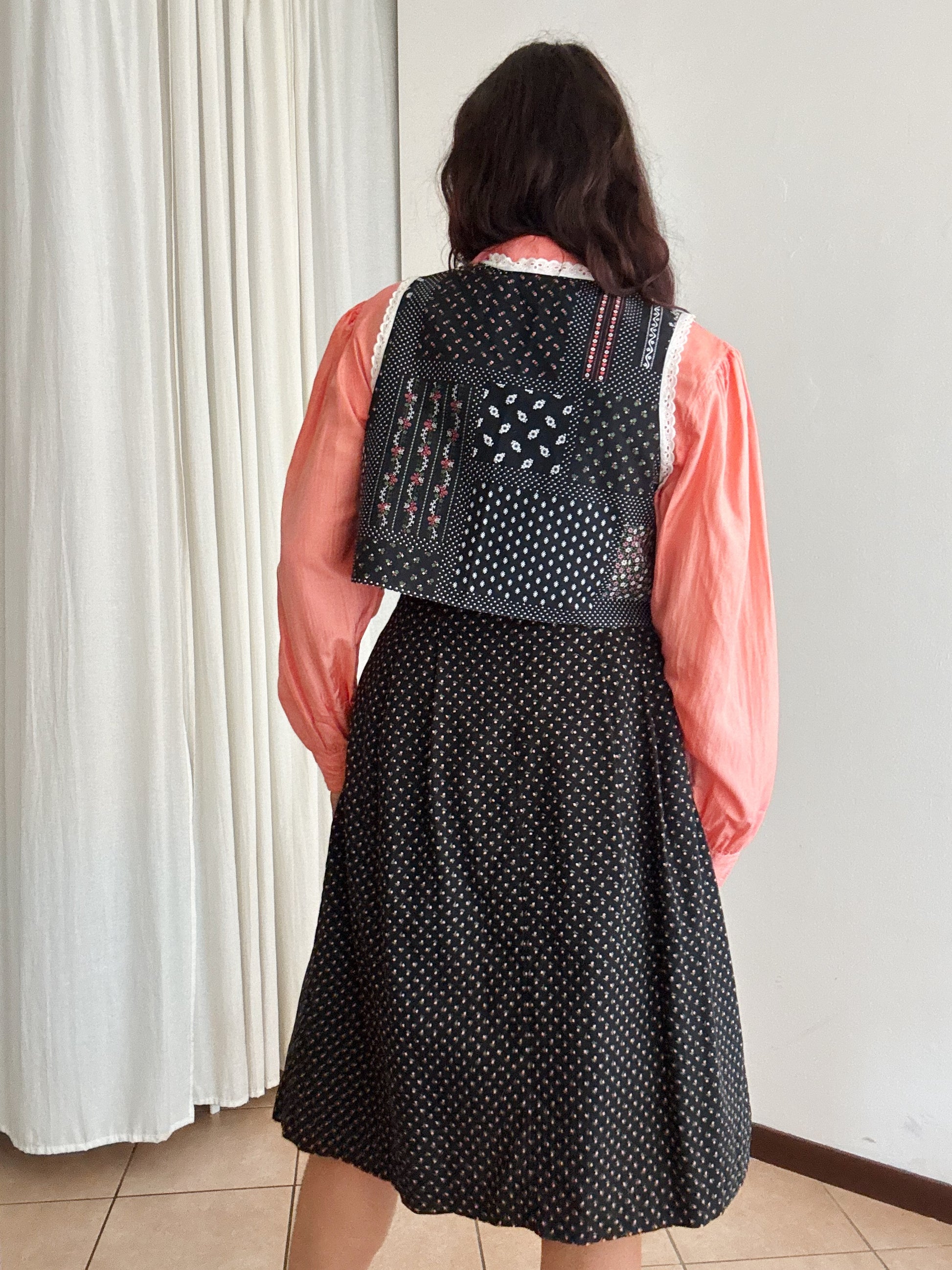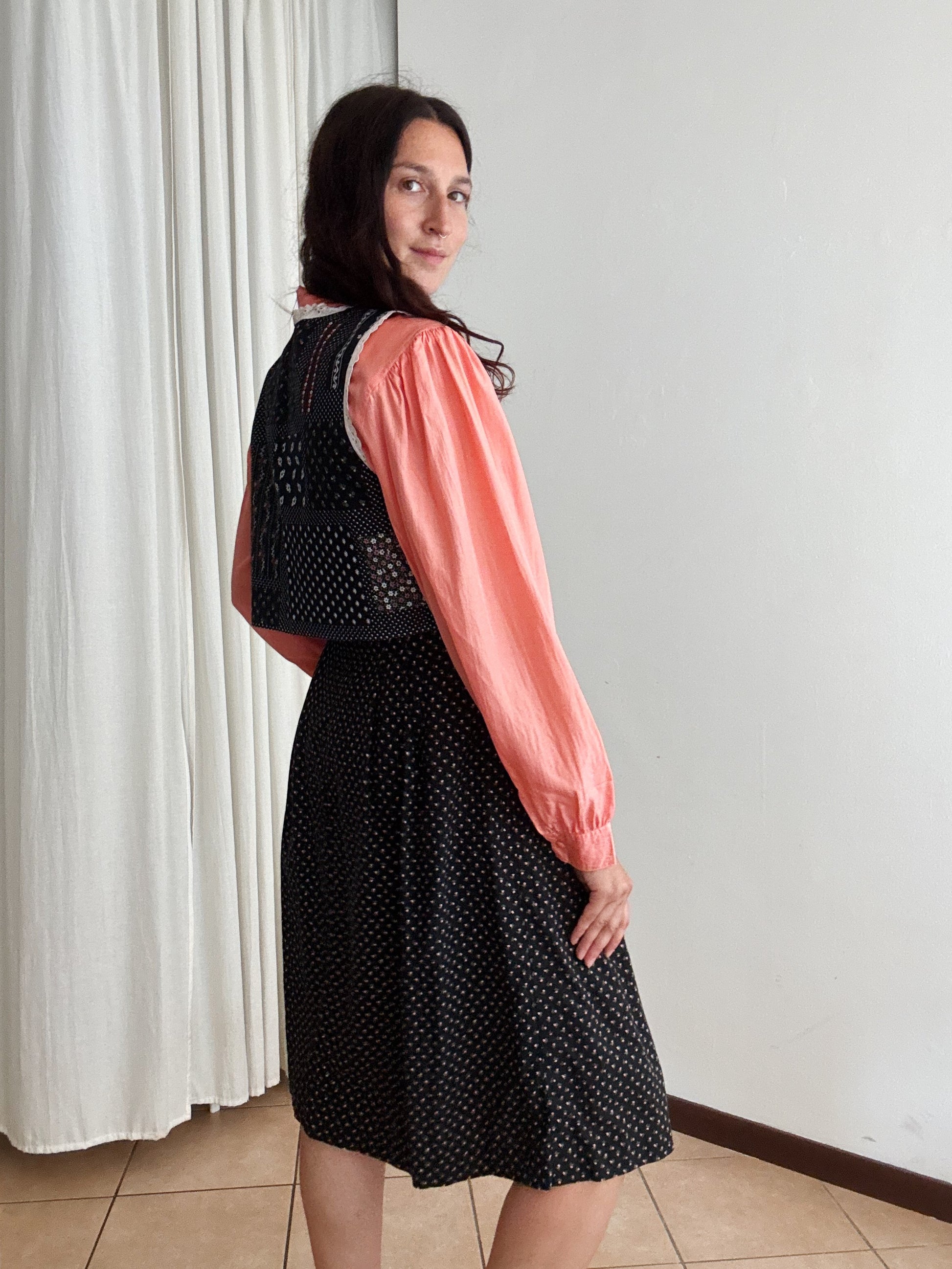Gilet vintage in cotone a fiorellini con bordo in sangallo. Veste taglia S/M. Ascelle 46 cm, lunghezza 41