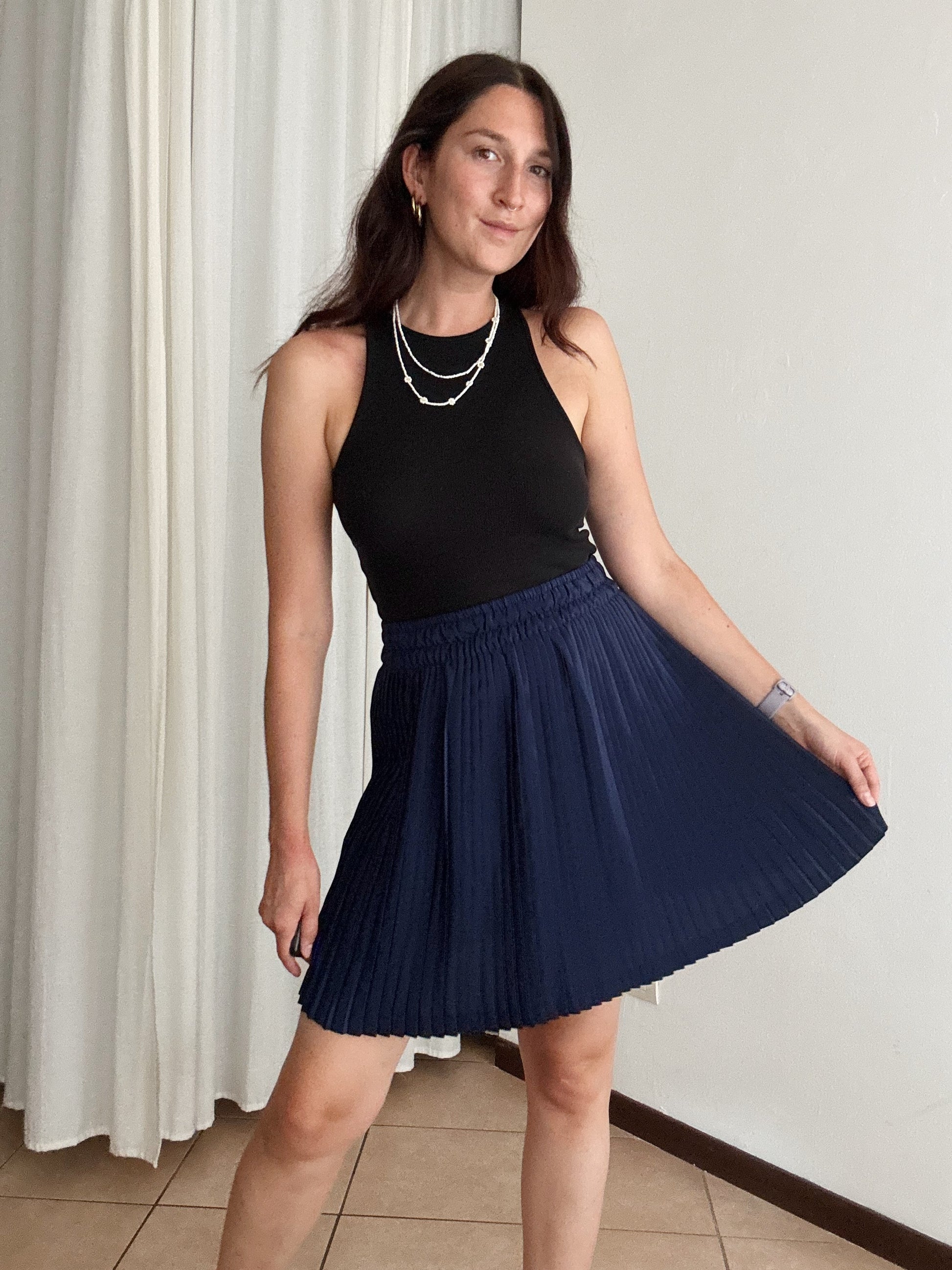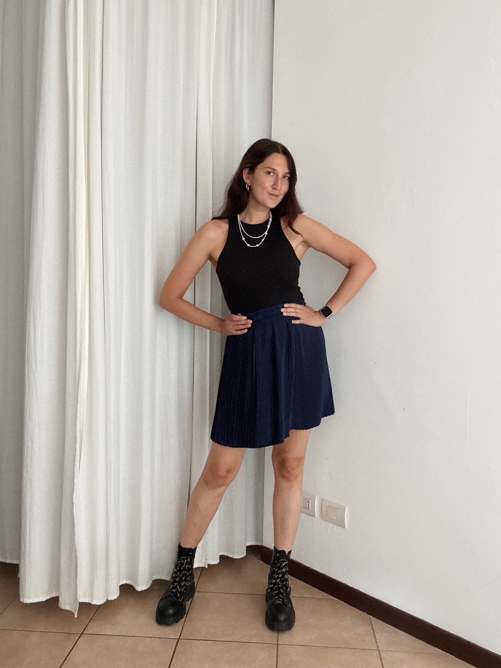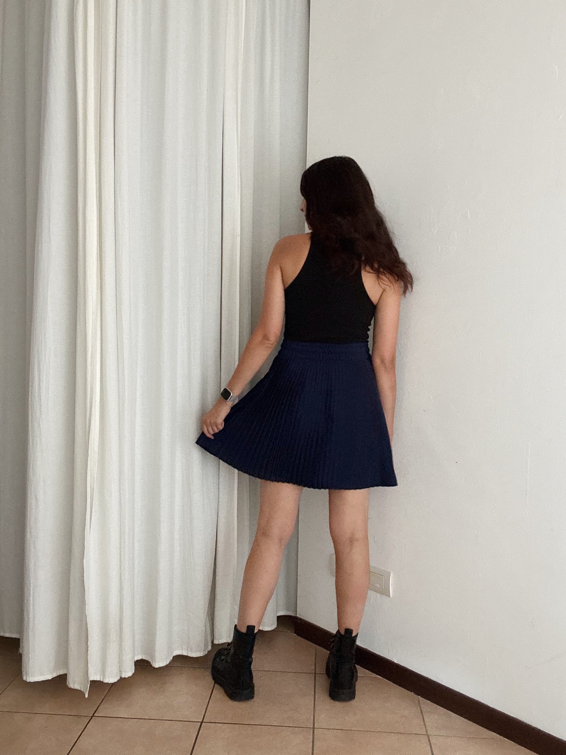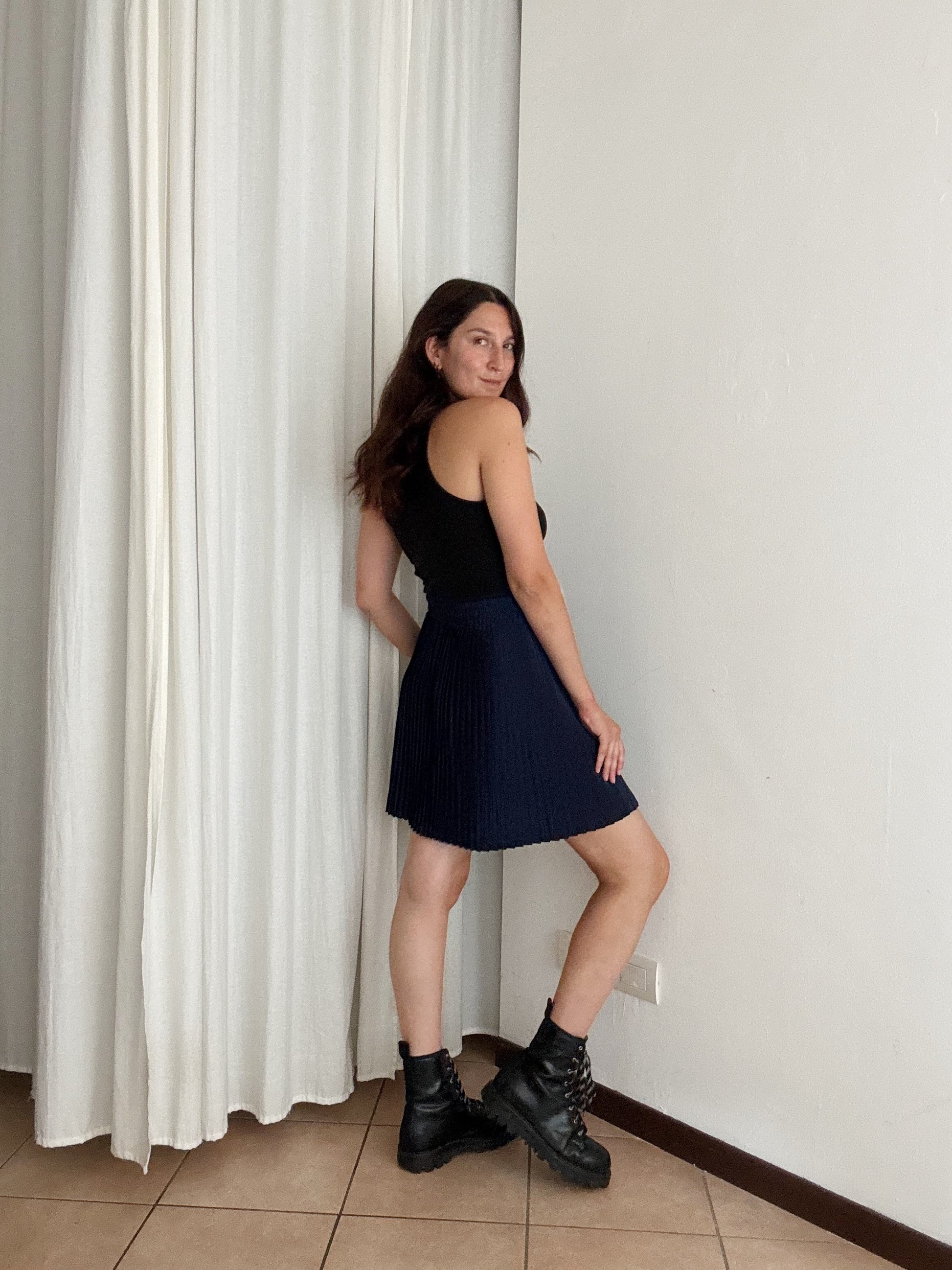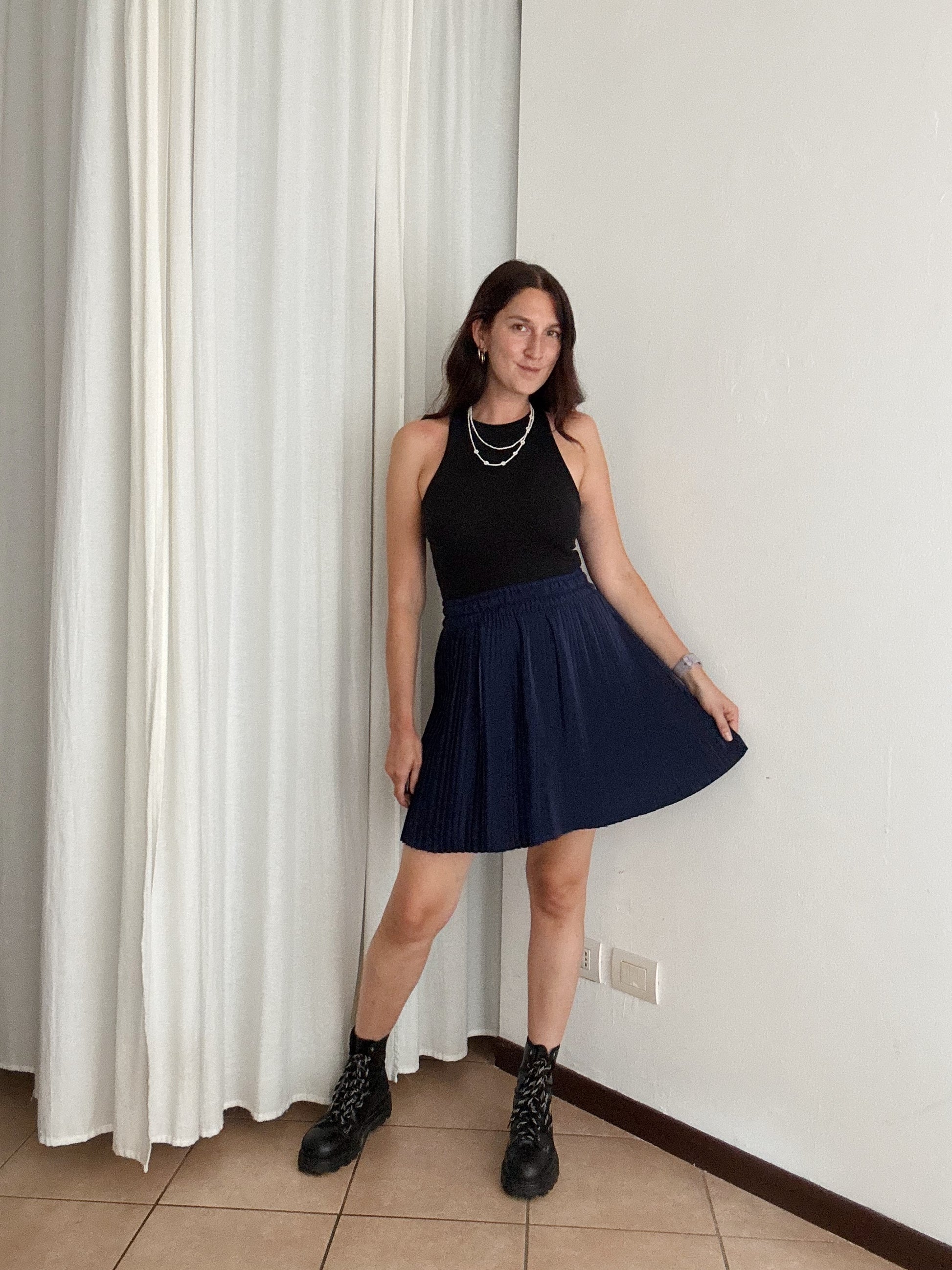 Gonna vintage blu plissettata. Veste taglia S/M. Misure: vita 33-36 con elastico, lunghezza 47. 100% viscosa