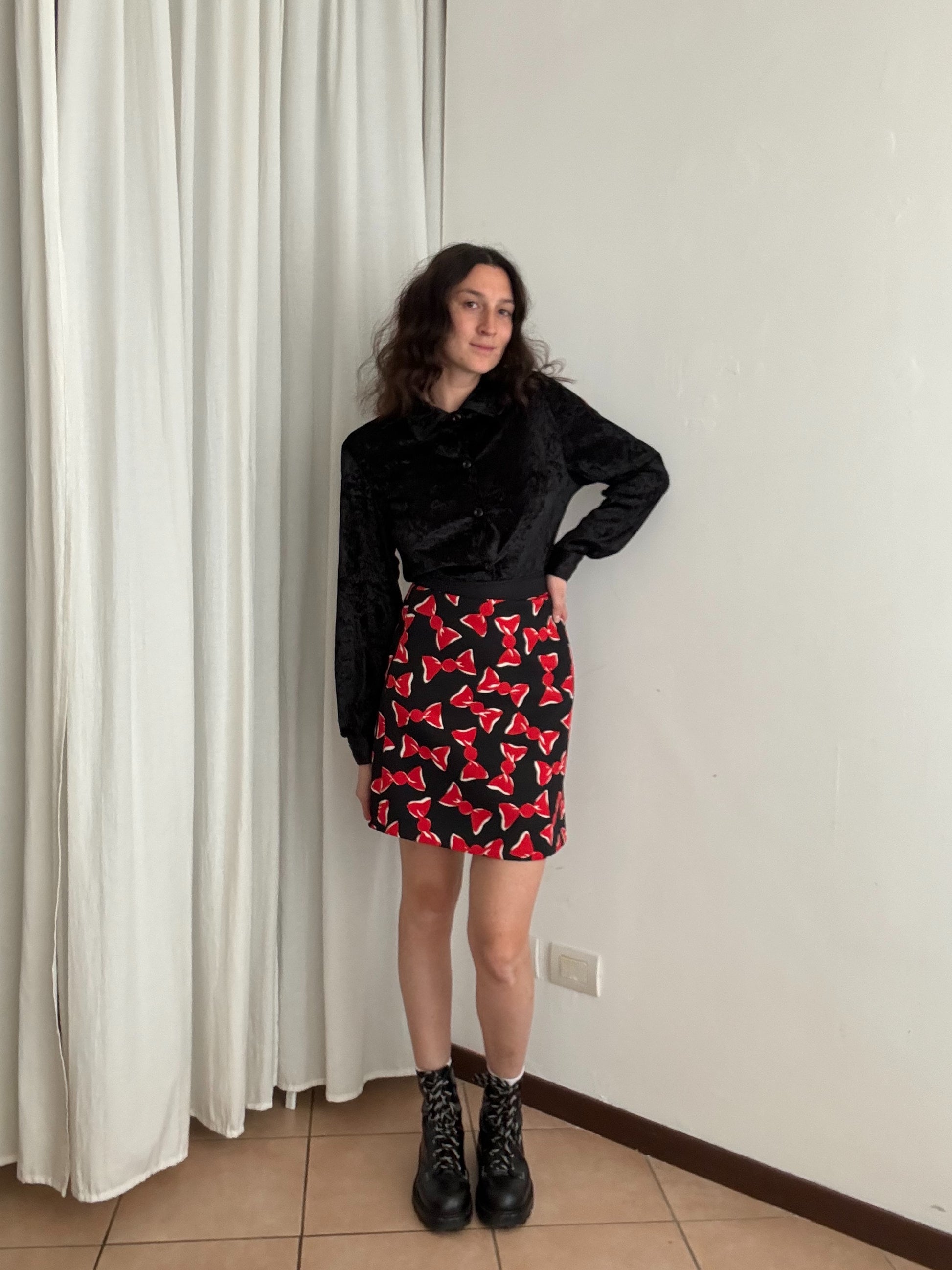Gonna Boutique Moschino nera con fiocchi caramelle rosse. Taglia 38 con il girovita di 66 cm. Lunghezza 52.
