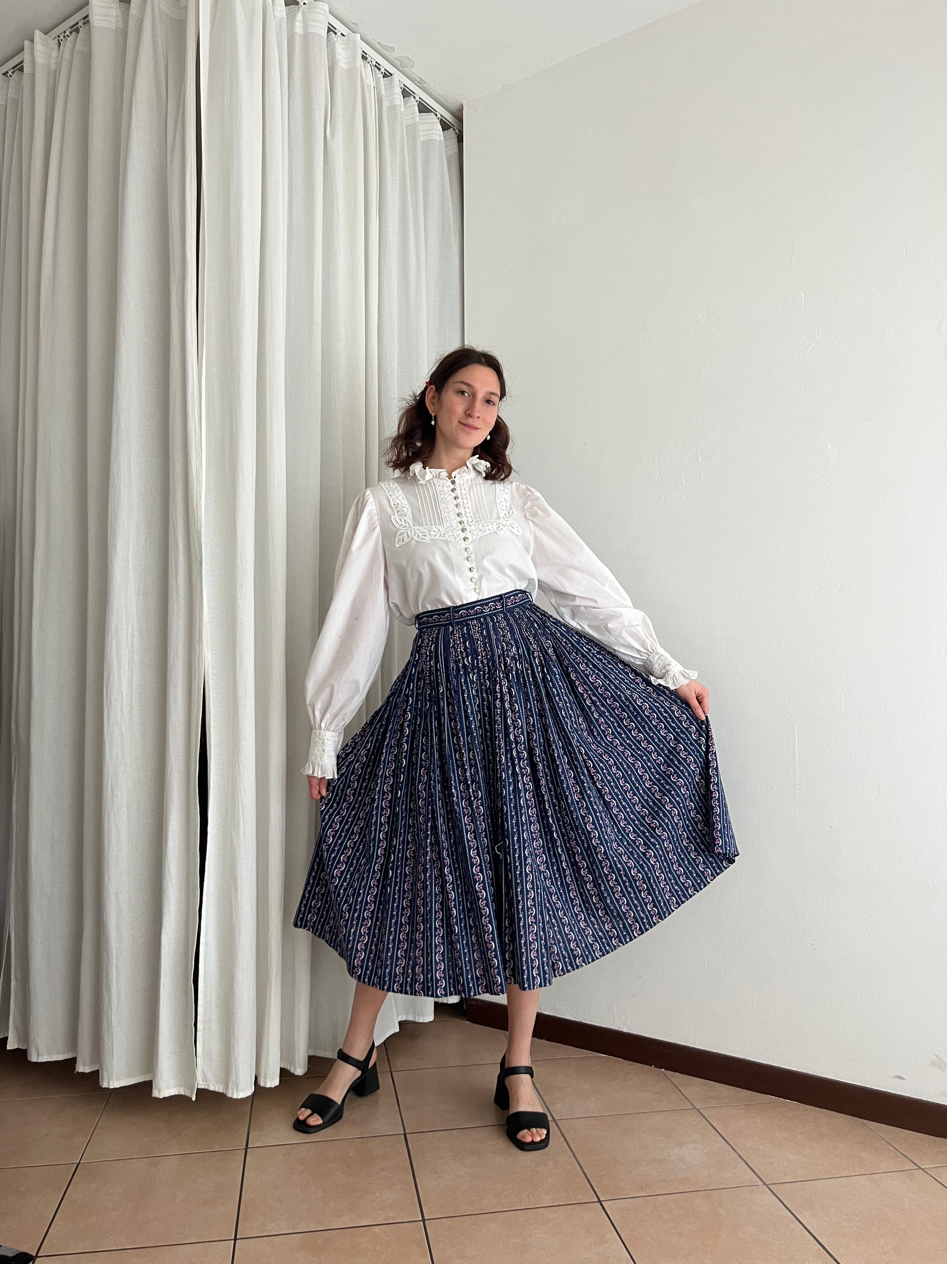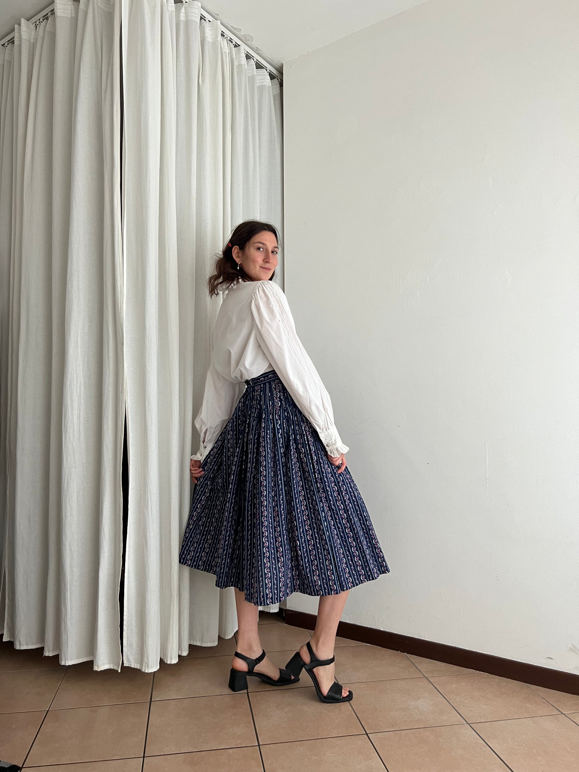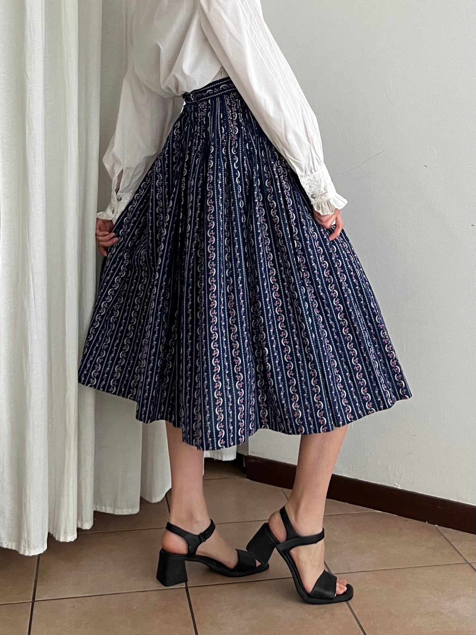 Gonna stile tirolese vintage blu a campana. Sartoriale senza etichette, veste taglia XS ed è in cotone. Misure: girovita 64, lunghezza 82