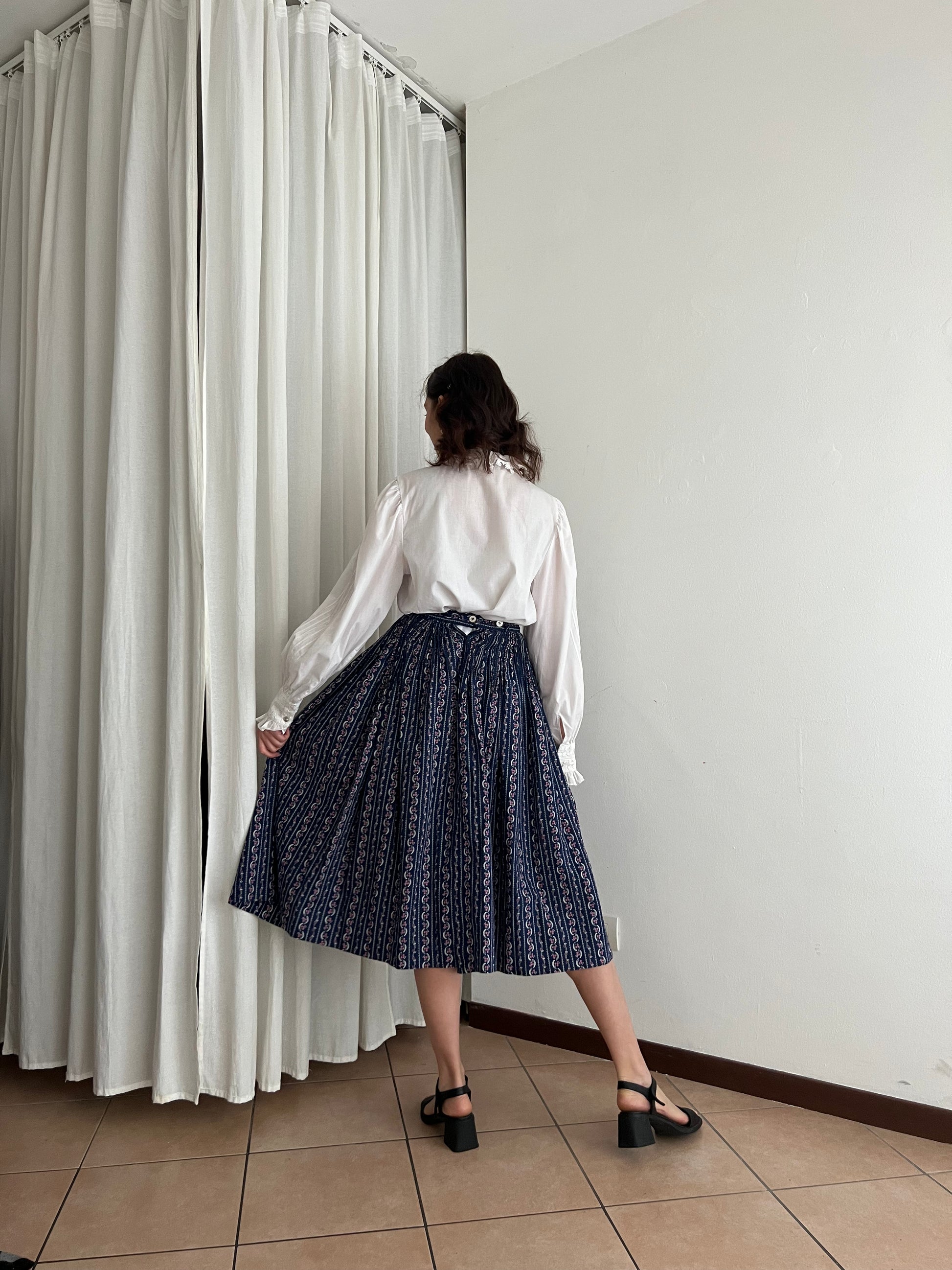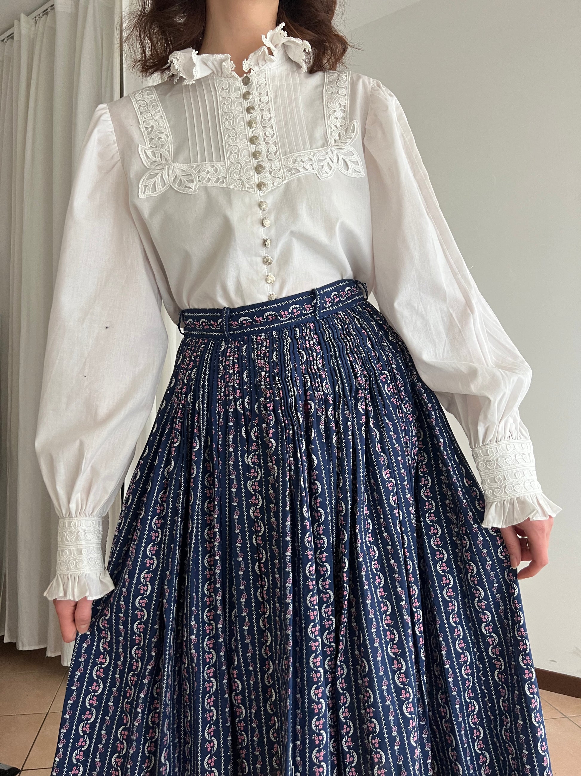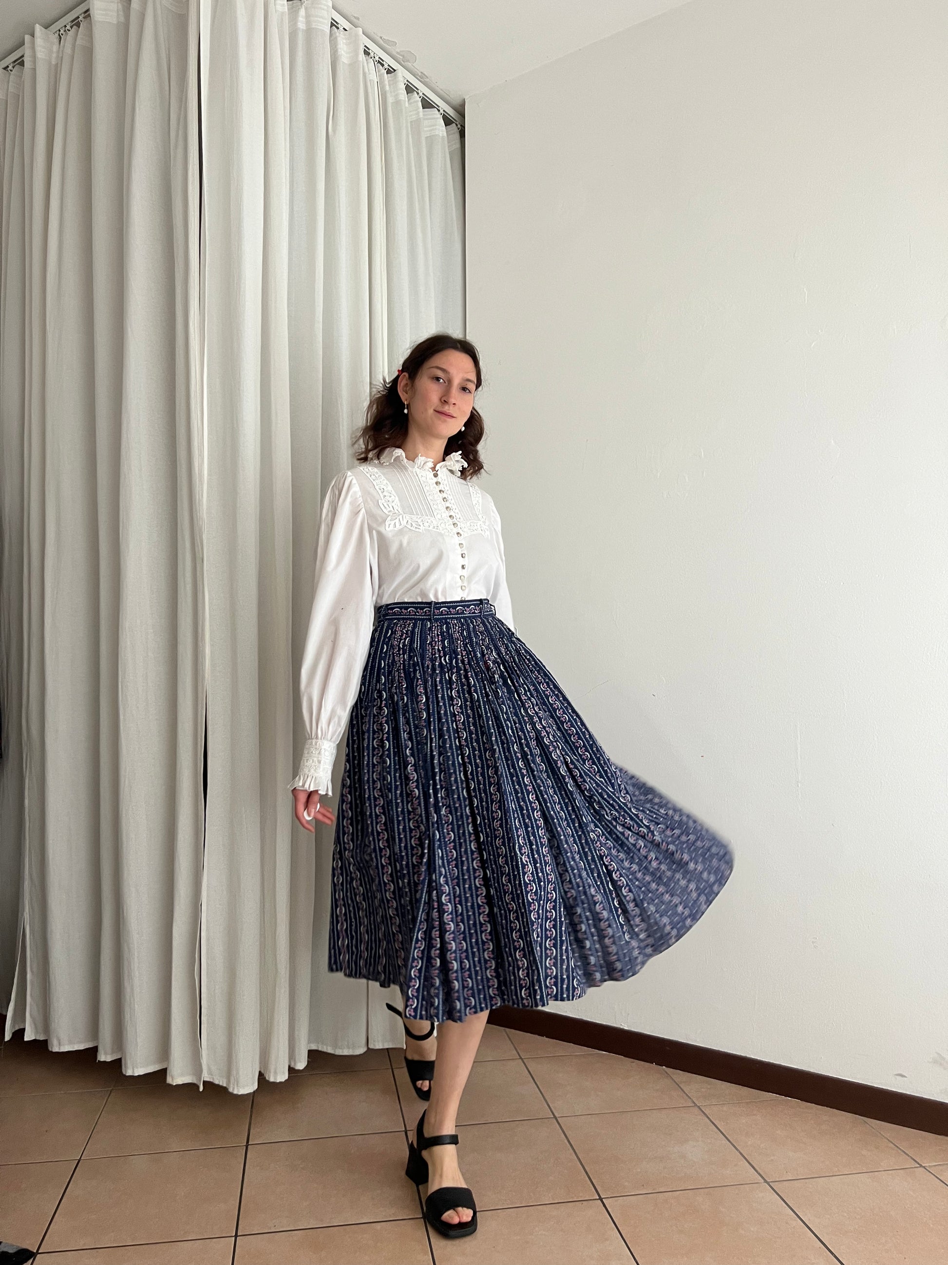 Gonna stile tirolese vintage blu a campana. Sartoriale senza etichette, veste taglia XS ed è in cotone. Misure: girovita 64, lunghezza 82