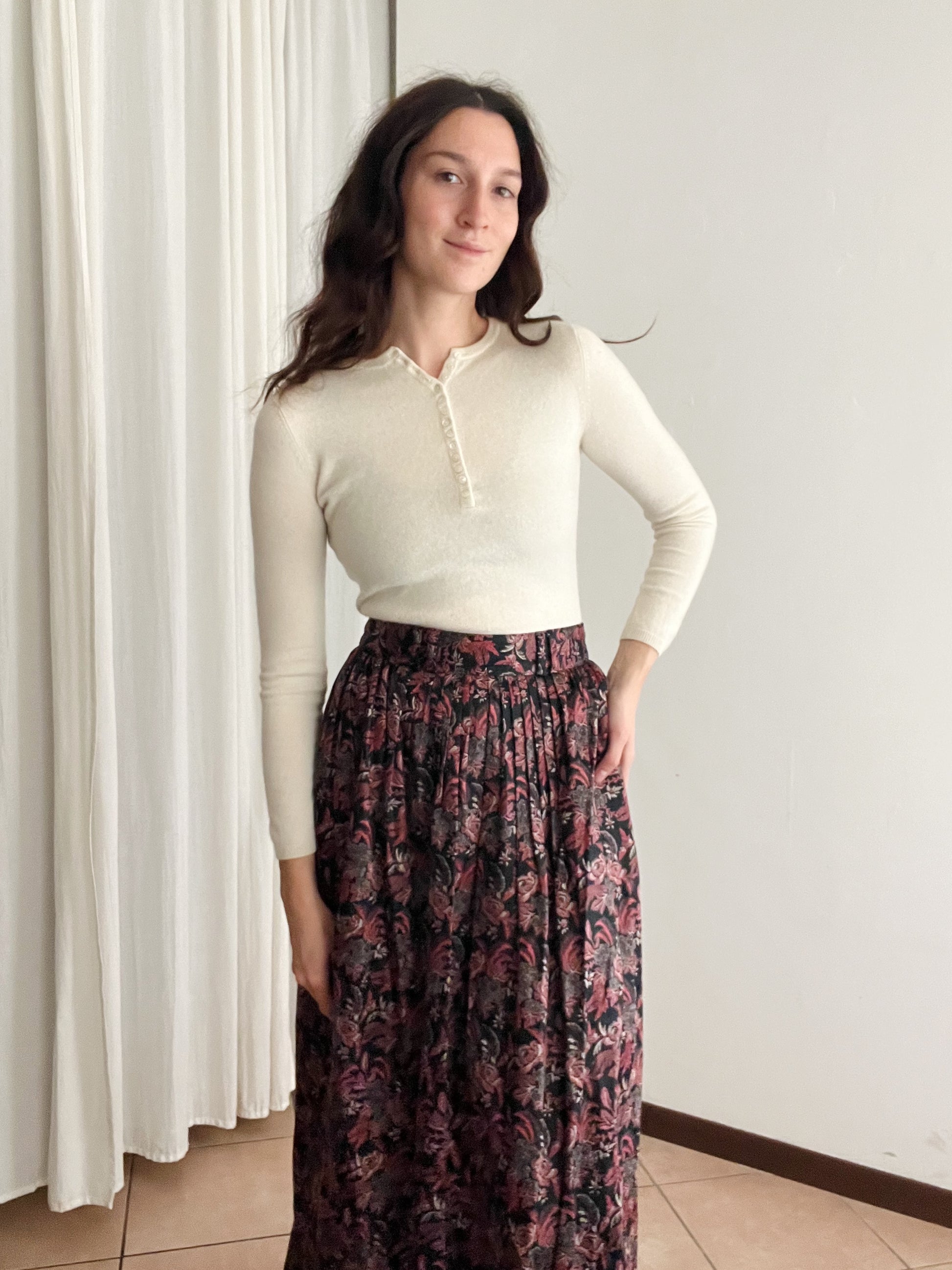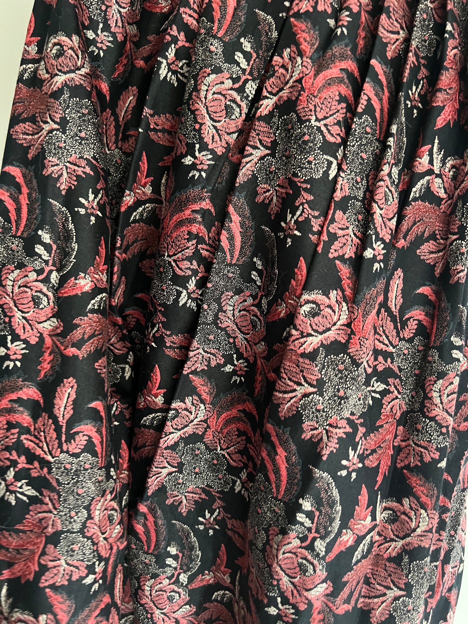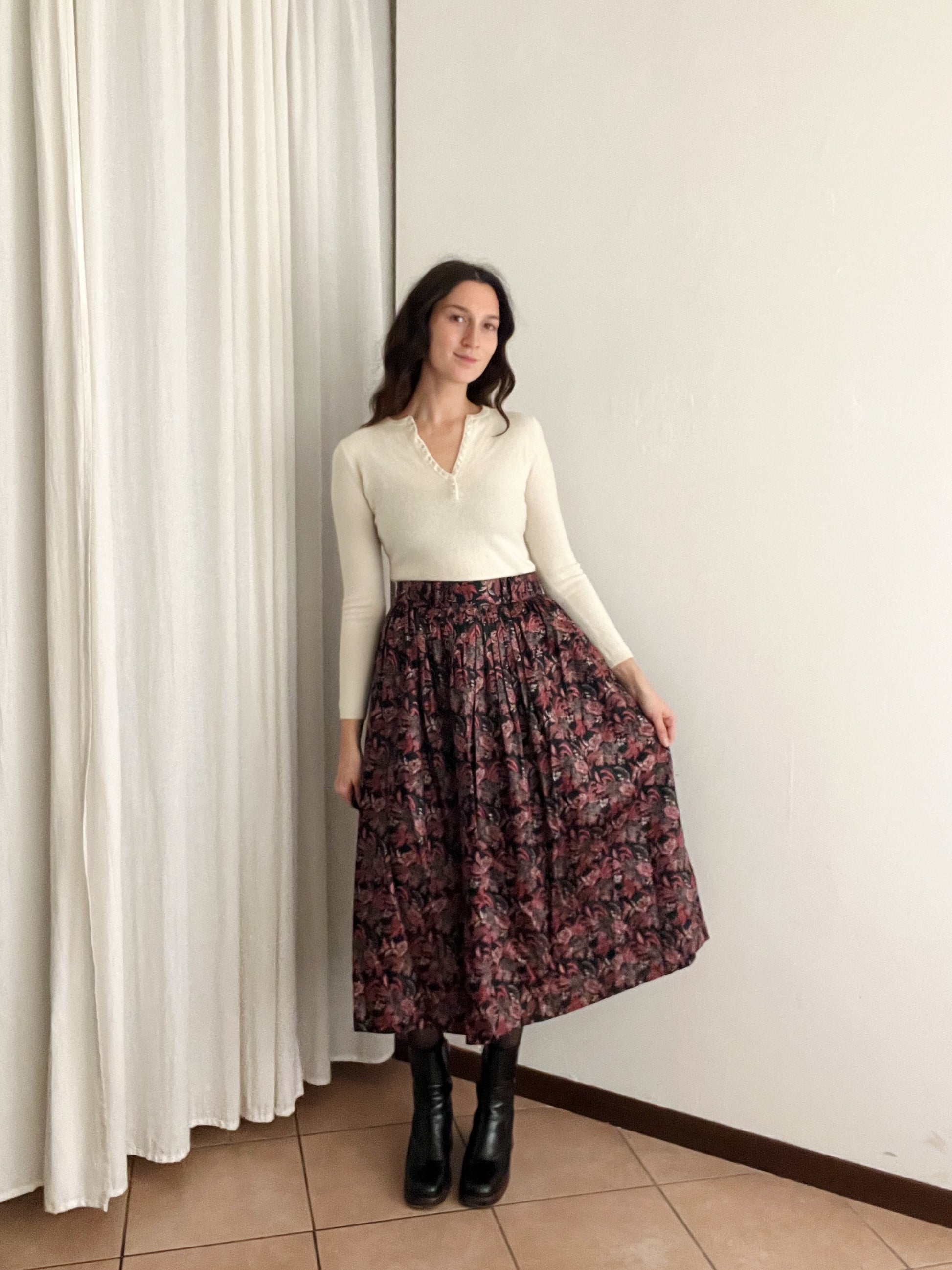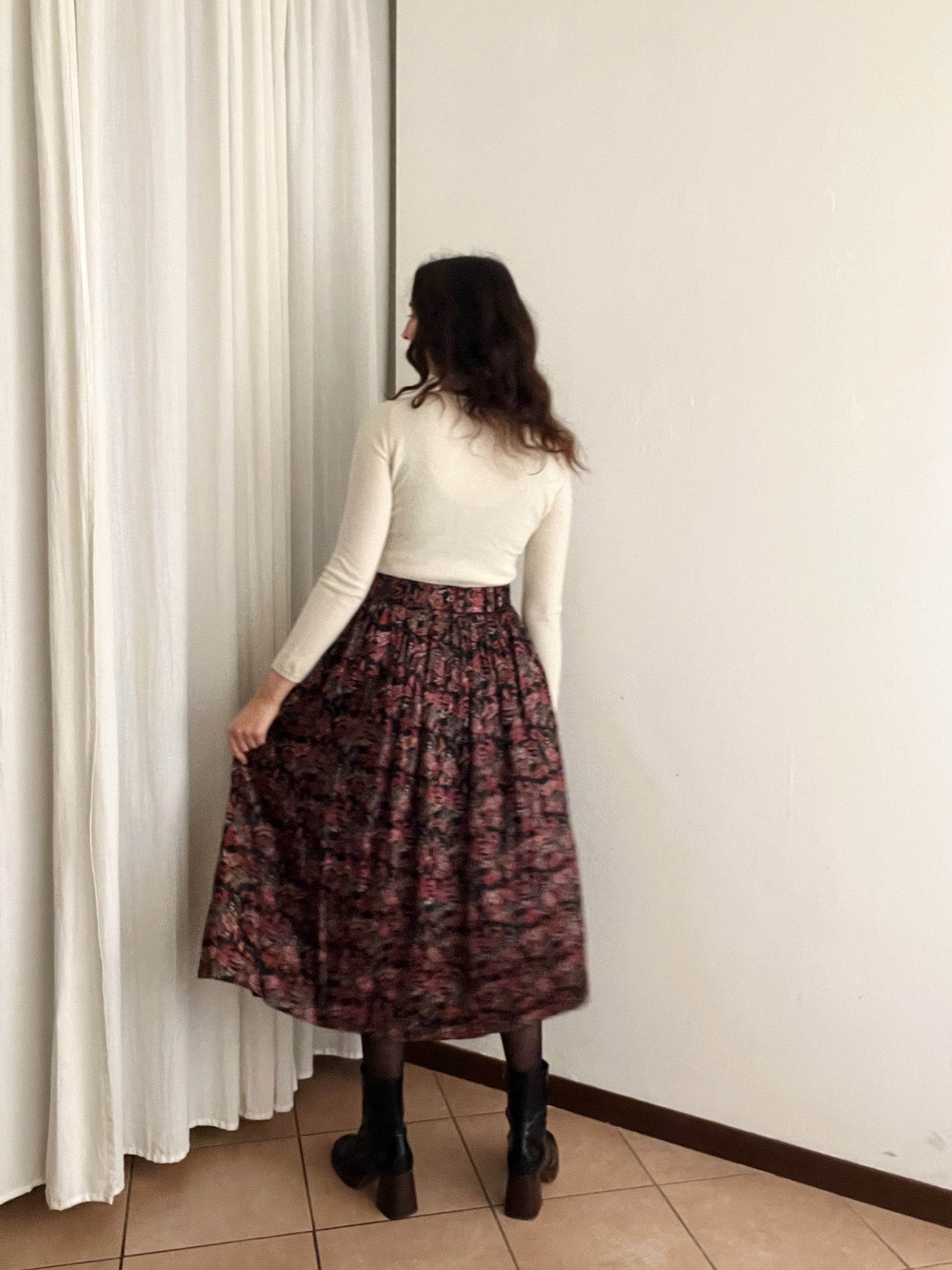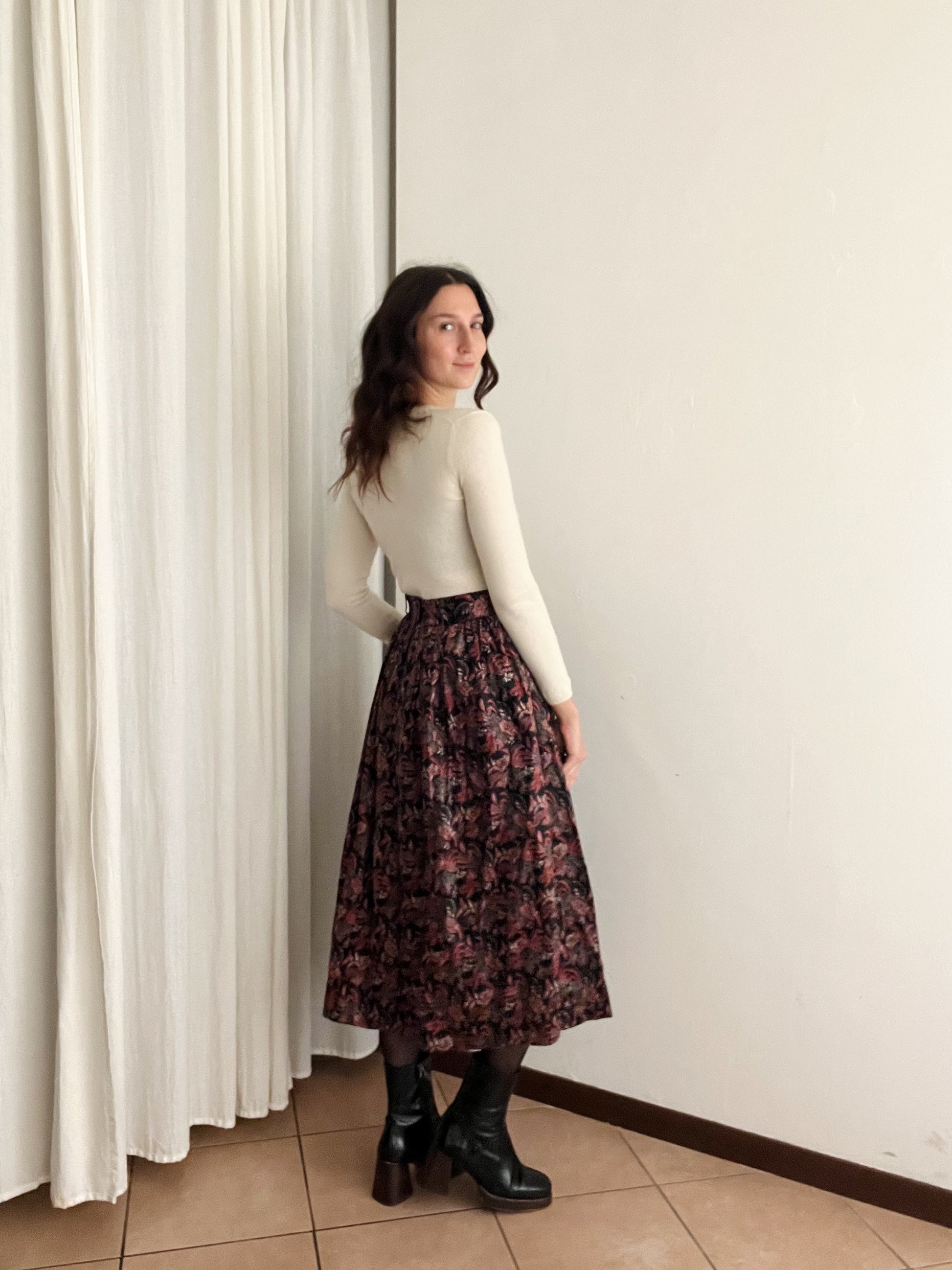 Gonna stile tirolese sartoriale nei colori del nero e bordeaux con trama floreale. Taglia 40 ovvero 44 italiana. Misure: girovita 74, lunghezza 82