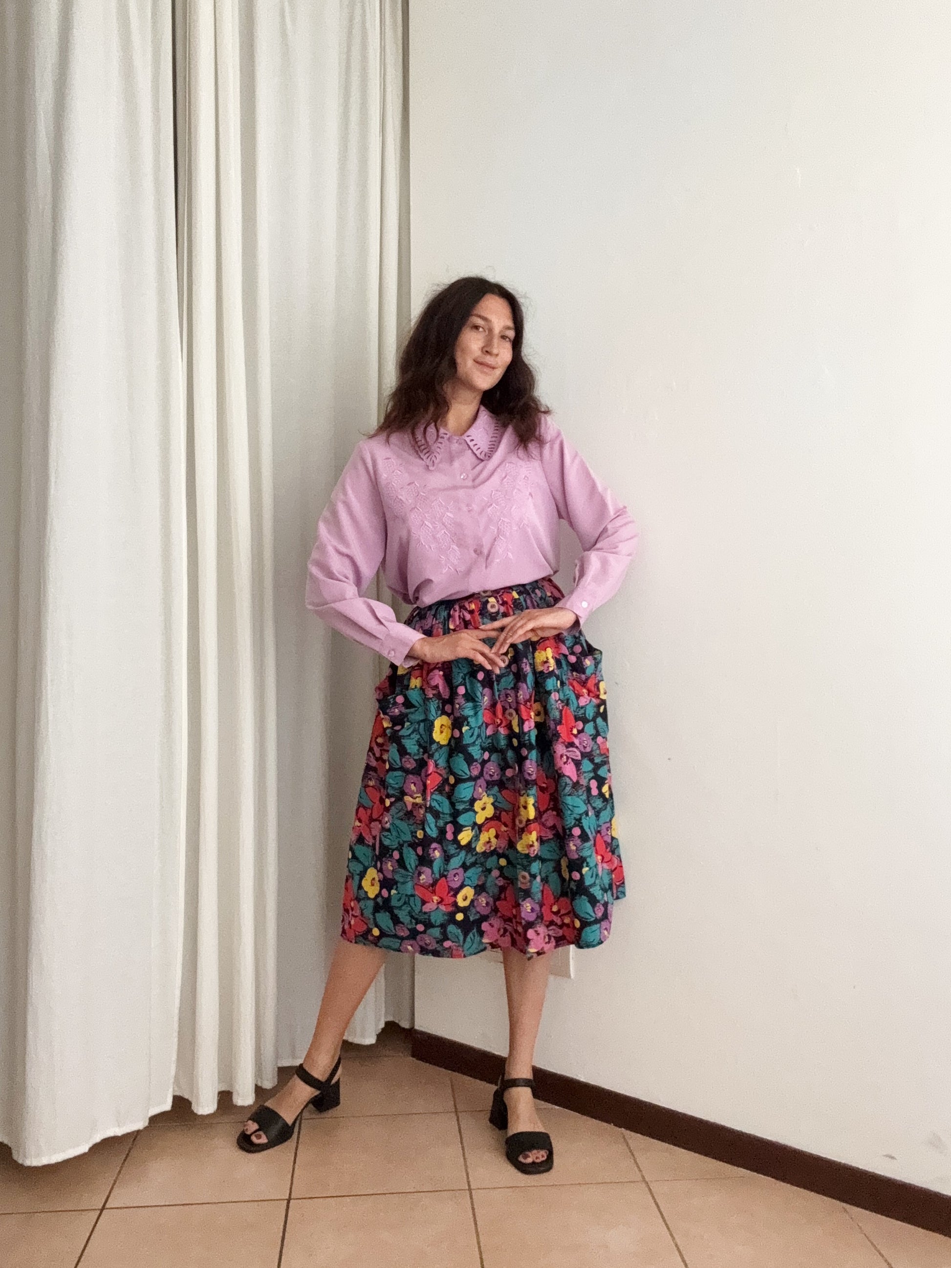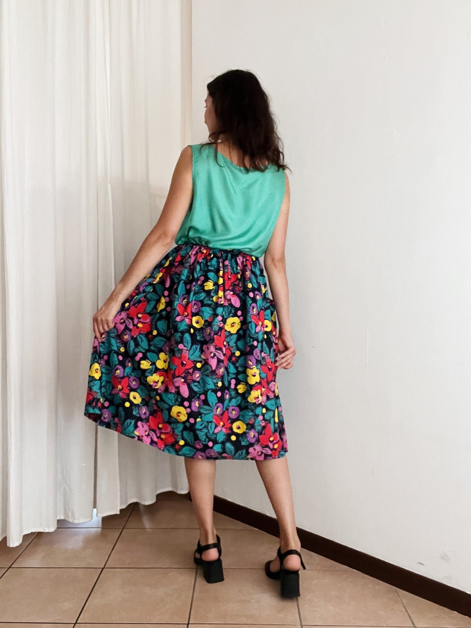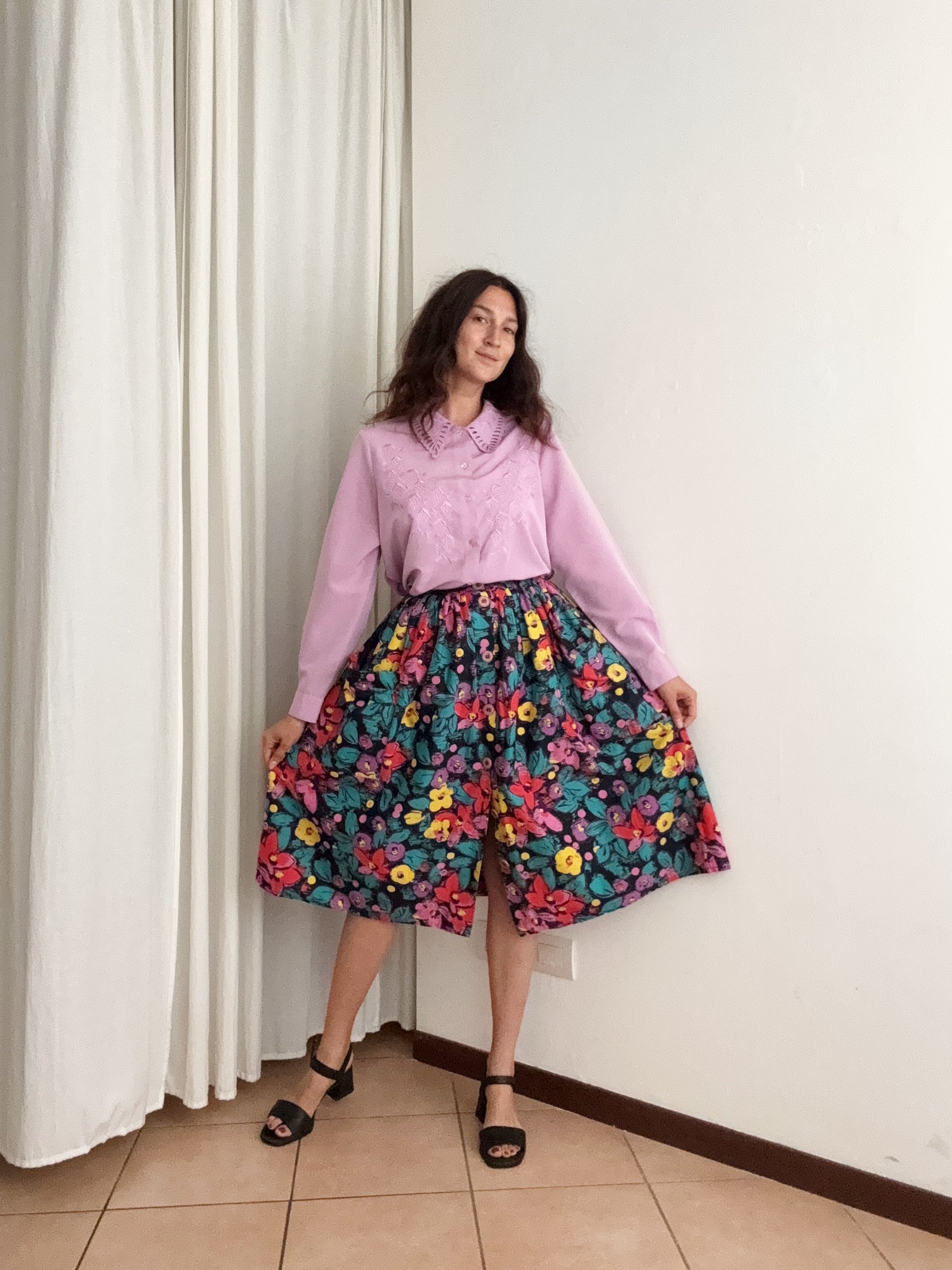 Gonna vintage a campana floreale su base nera. Veste taglia XS con il suo girovita di 58 cm. Lunghezza 75 cm. Composizione non riportata ma direi cotone.