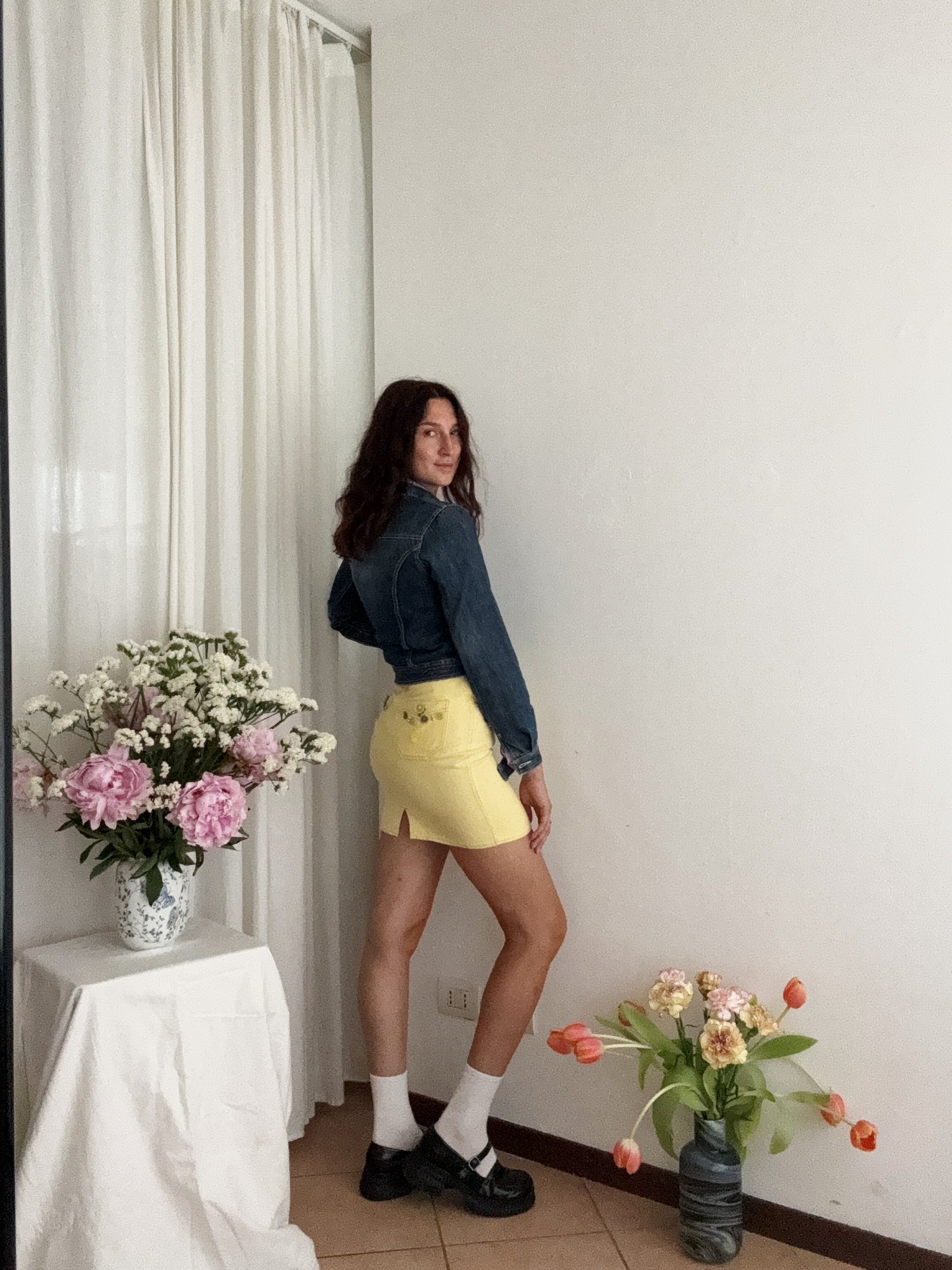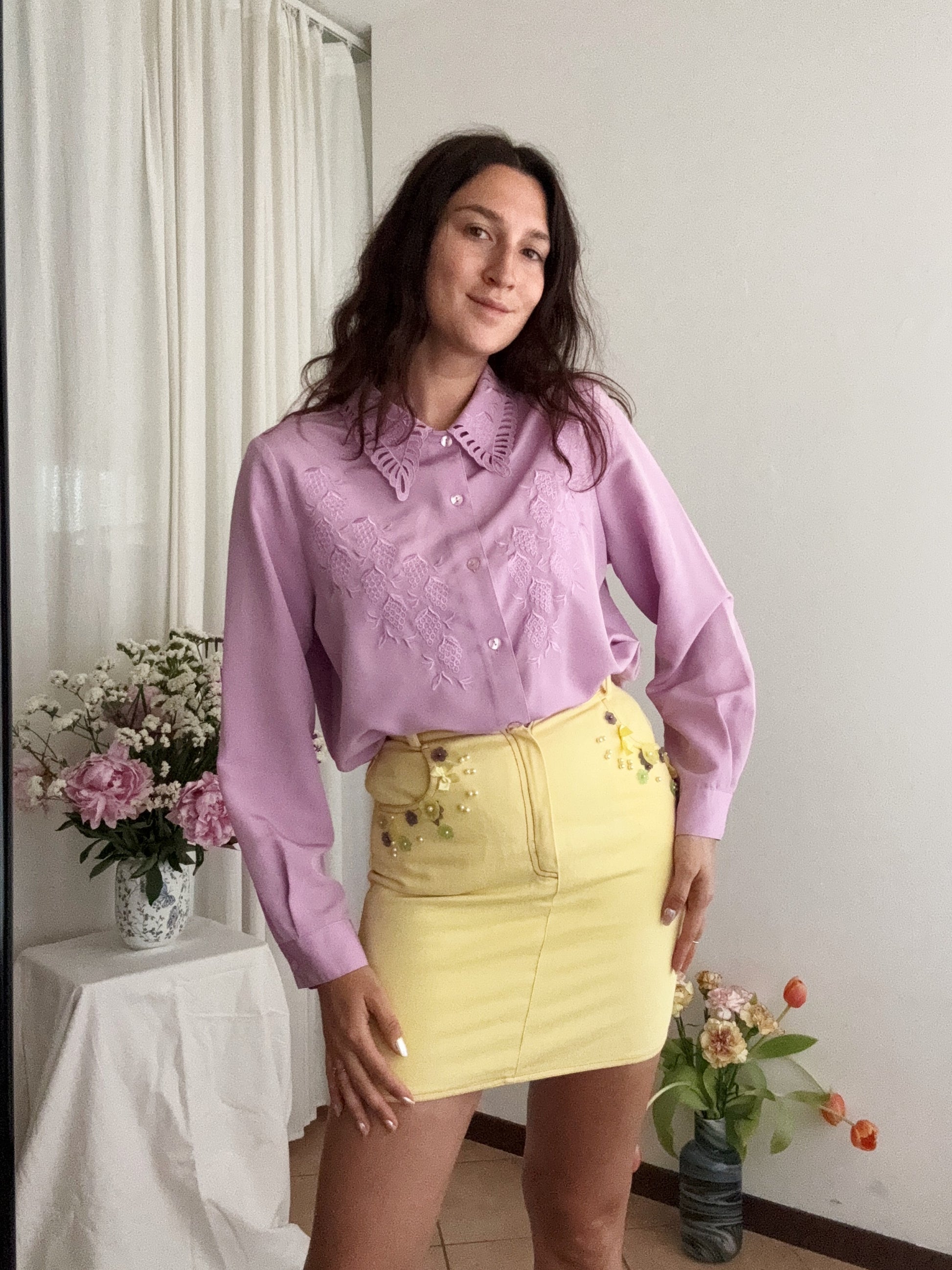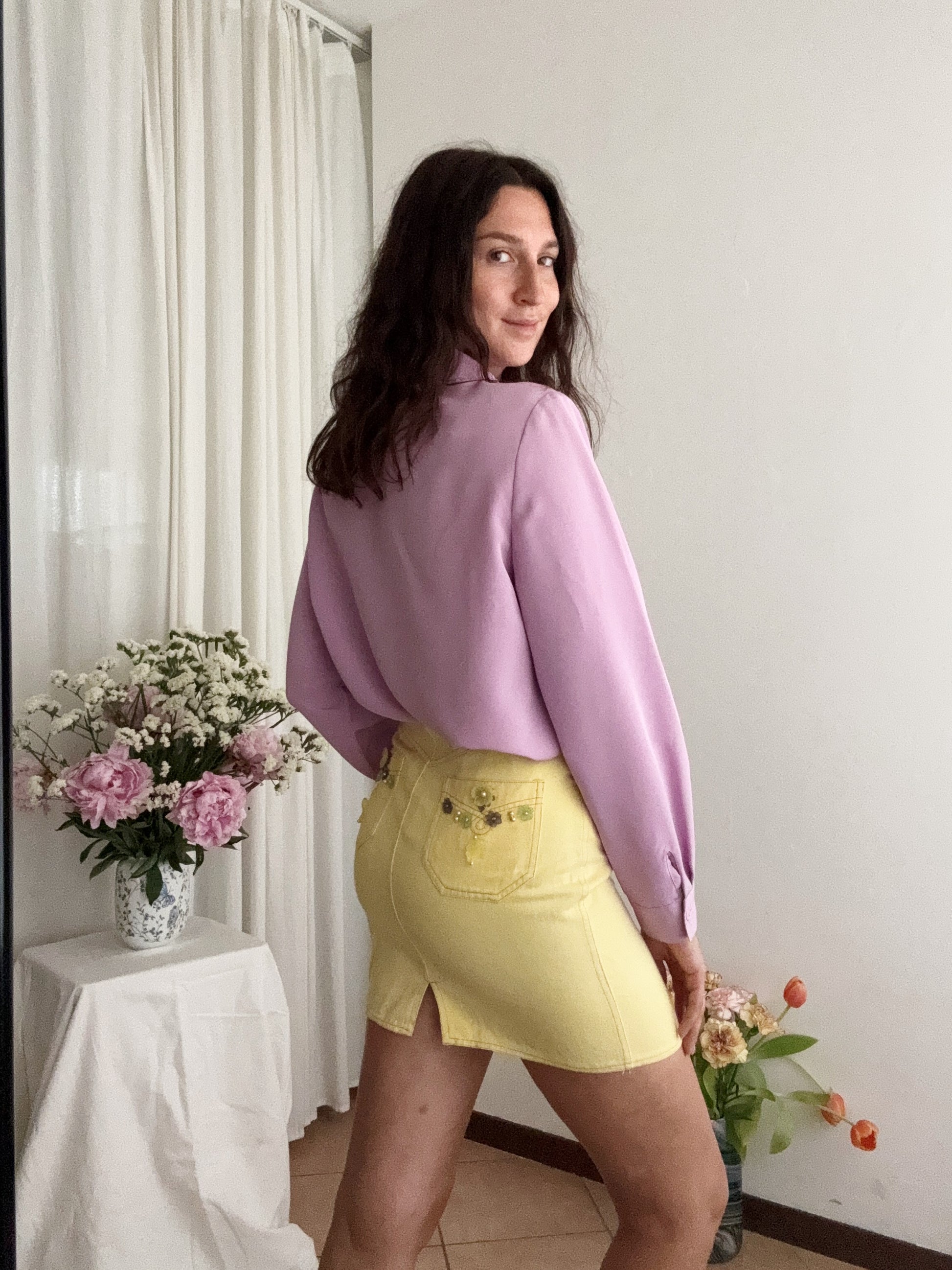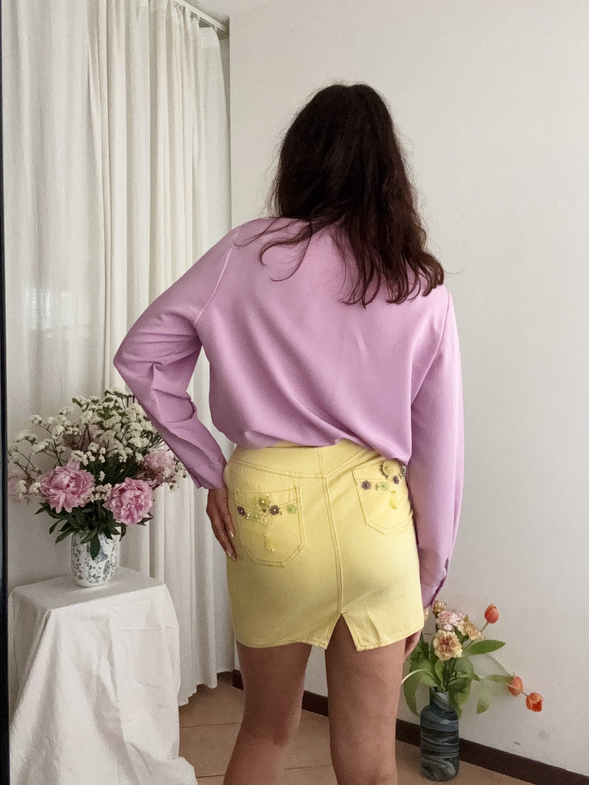 Gonna vintage giallina taglia S, a vita alta in cotone con perline e fiorellini sulle tasche. Vita 33, fianchi 46 circa, lunghezza 44
