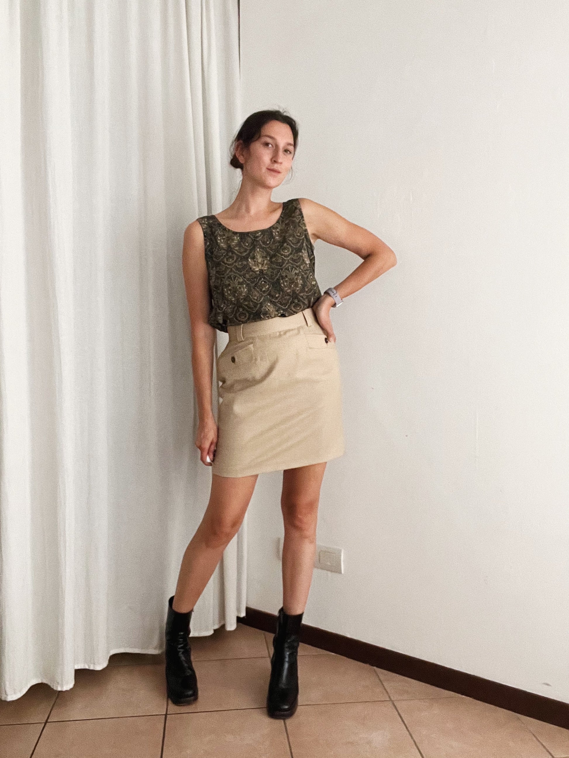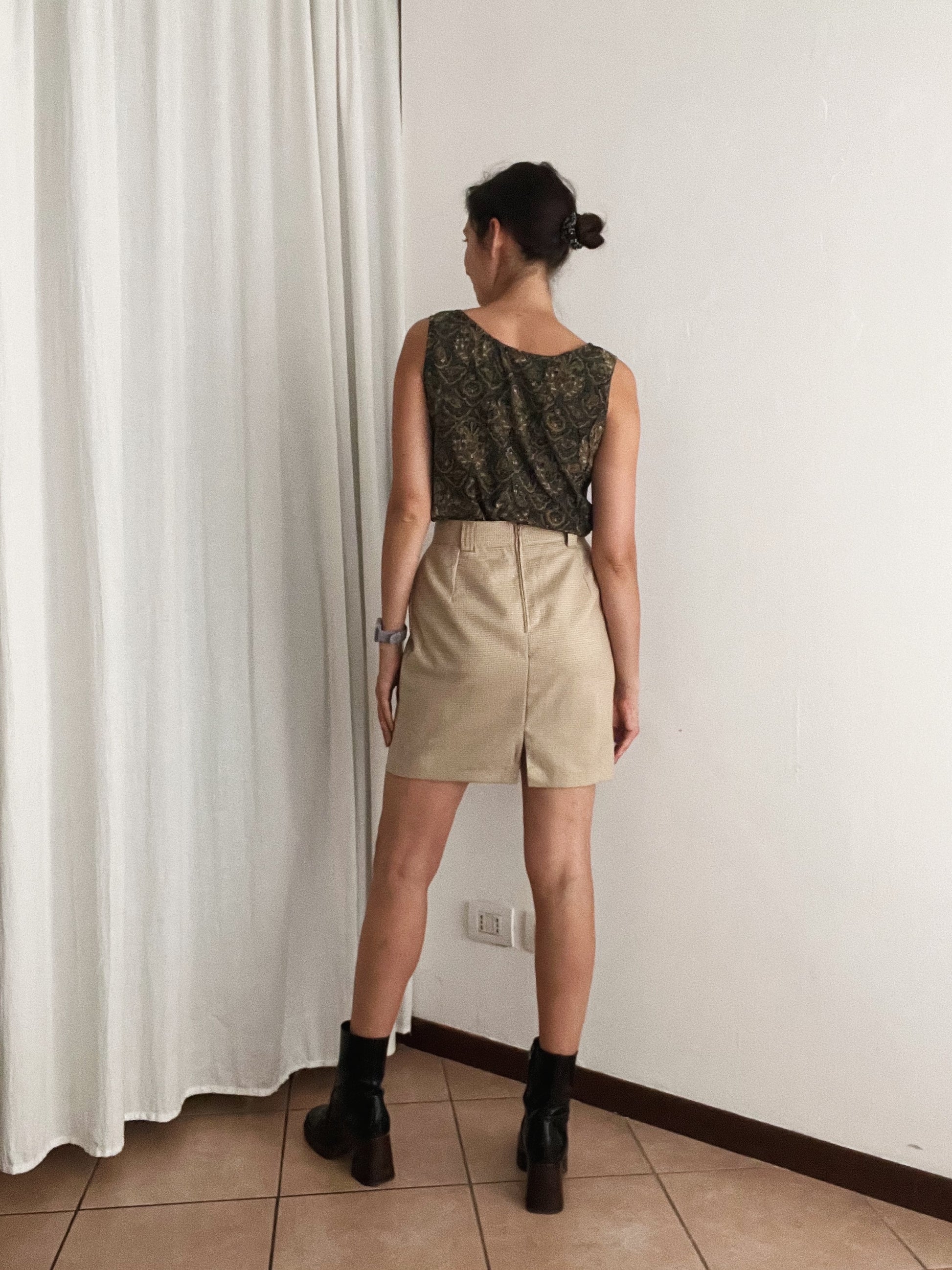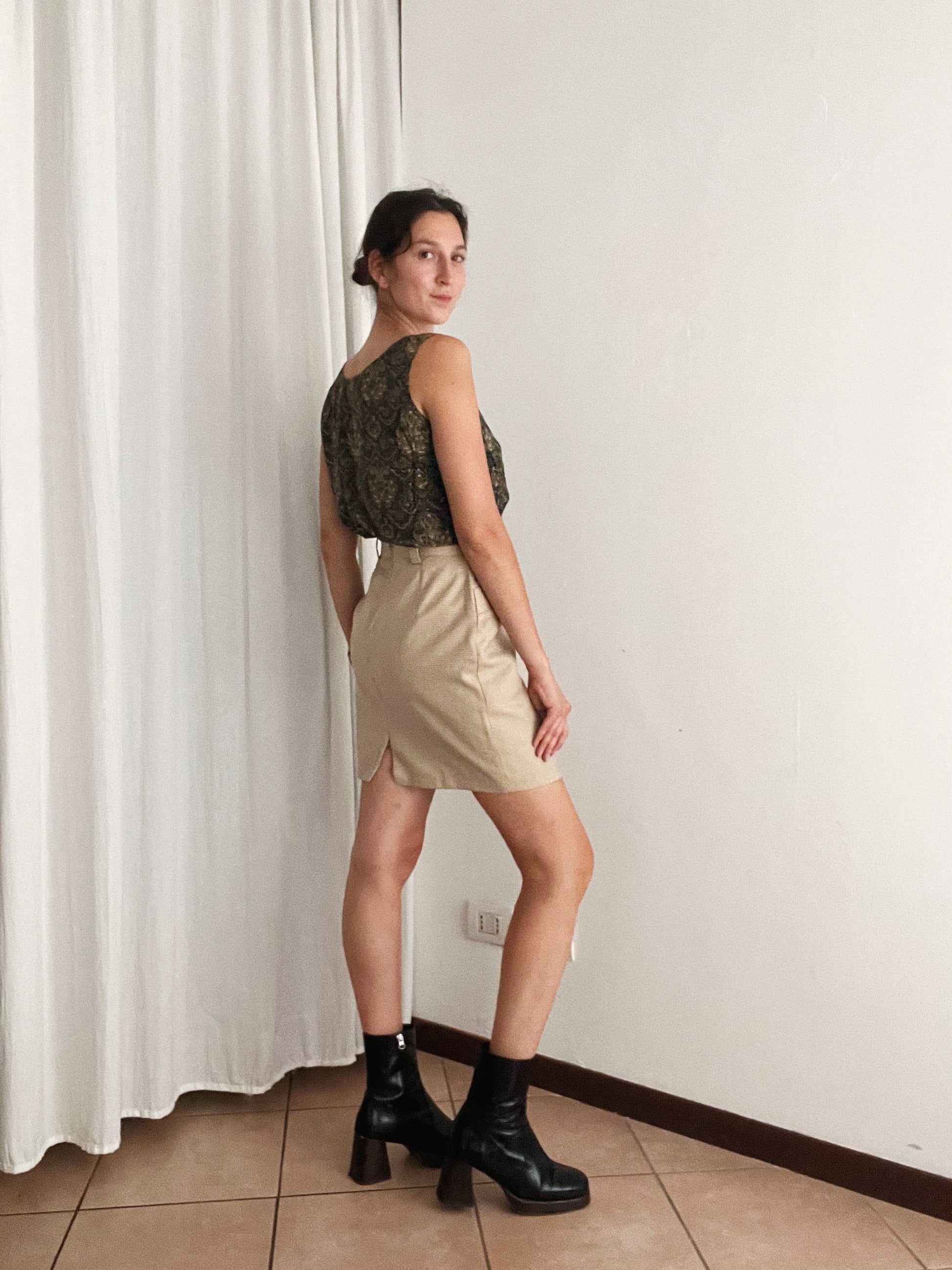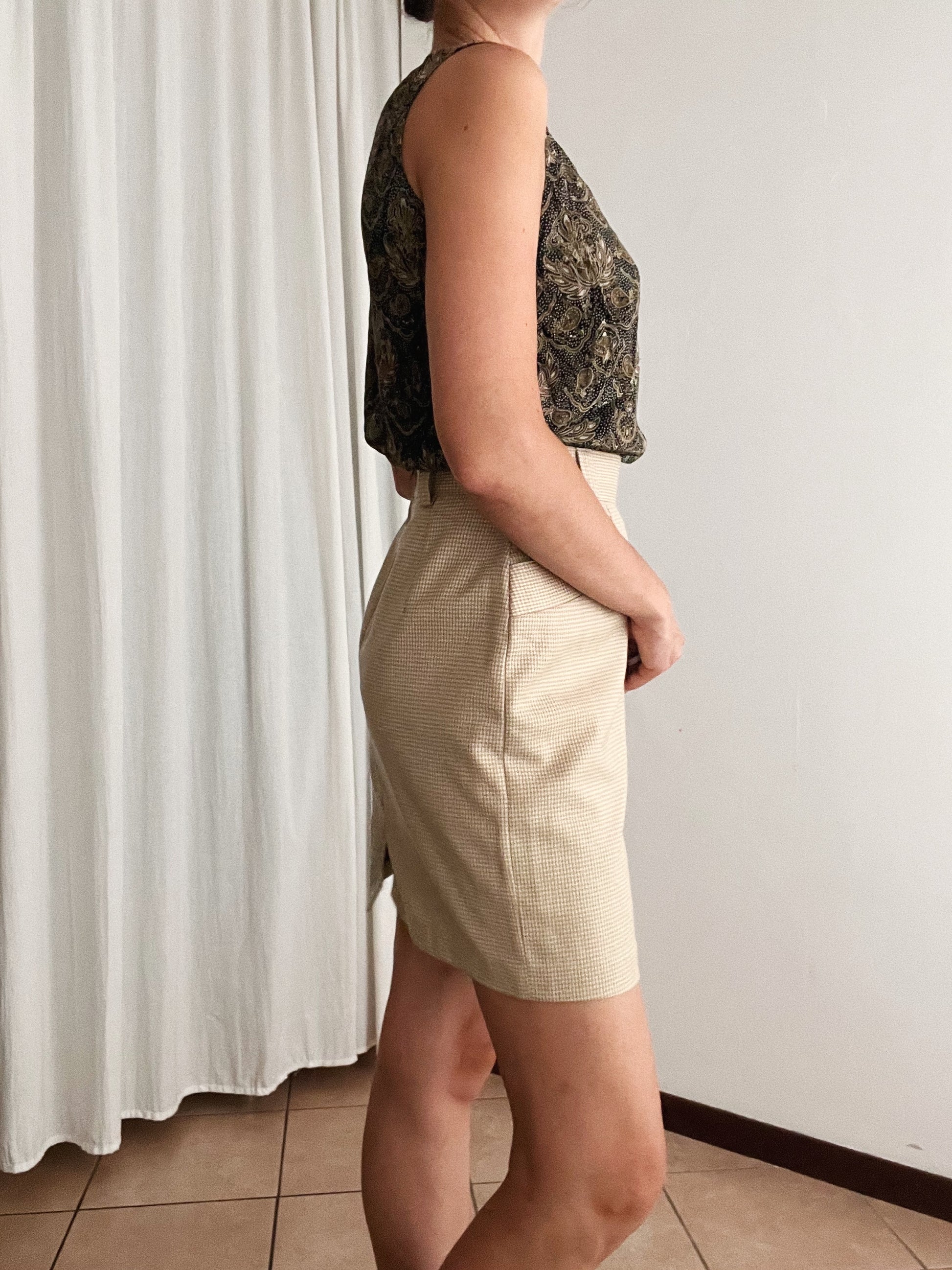 Gonna in fresco di lana motivo pied de poule beige. Riporta taglia 44 ma con il girovita di 72 cm veste meglio una 42. Due tasche laterali, passanti in vita per un’eventuale cintura.