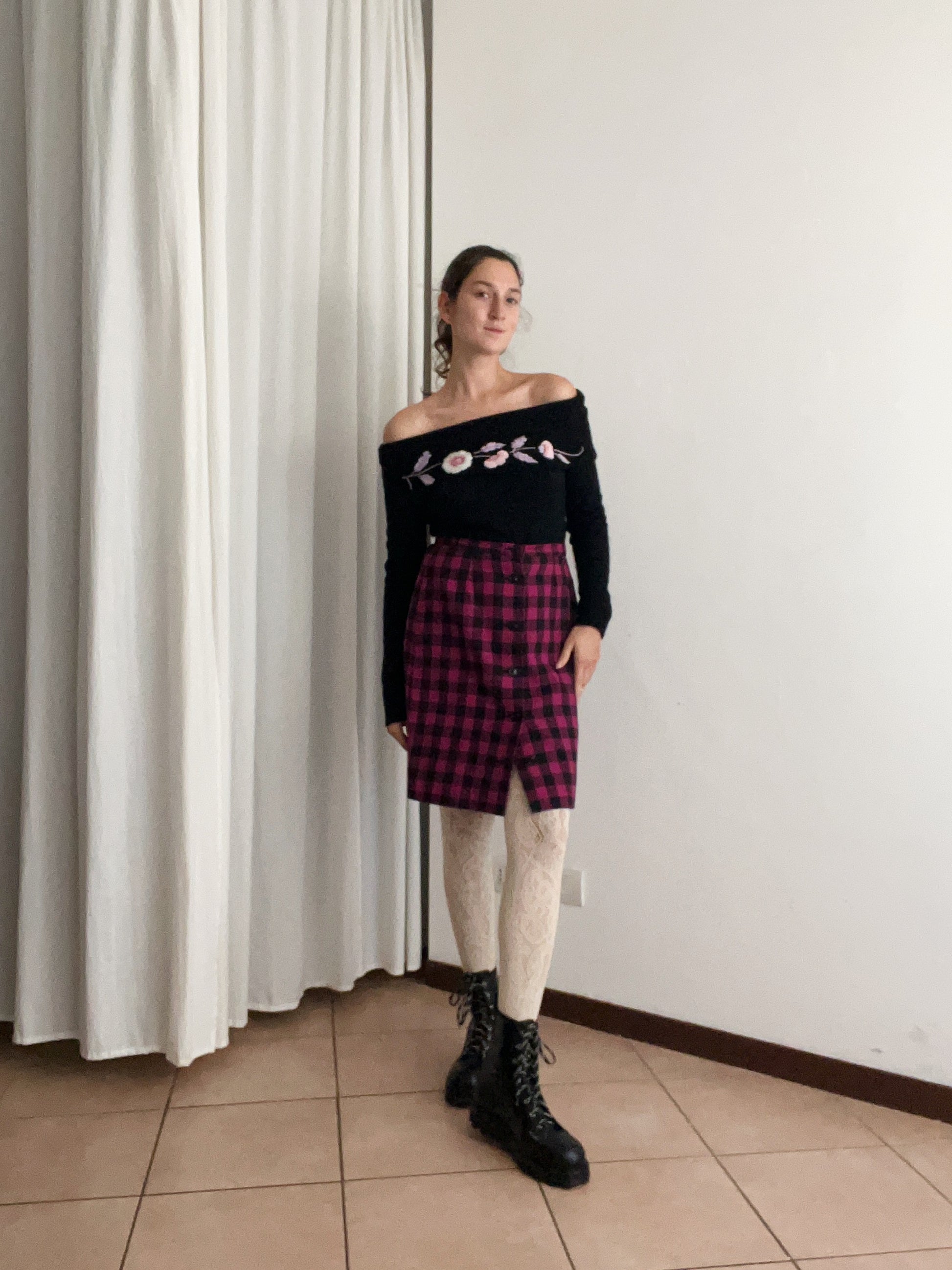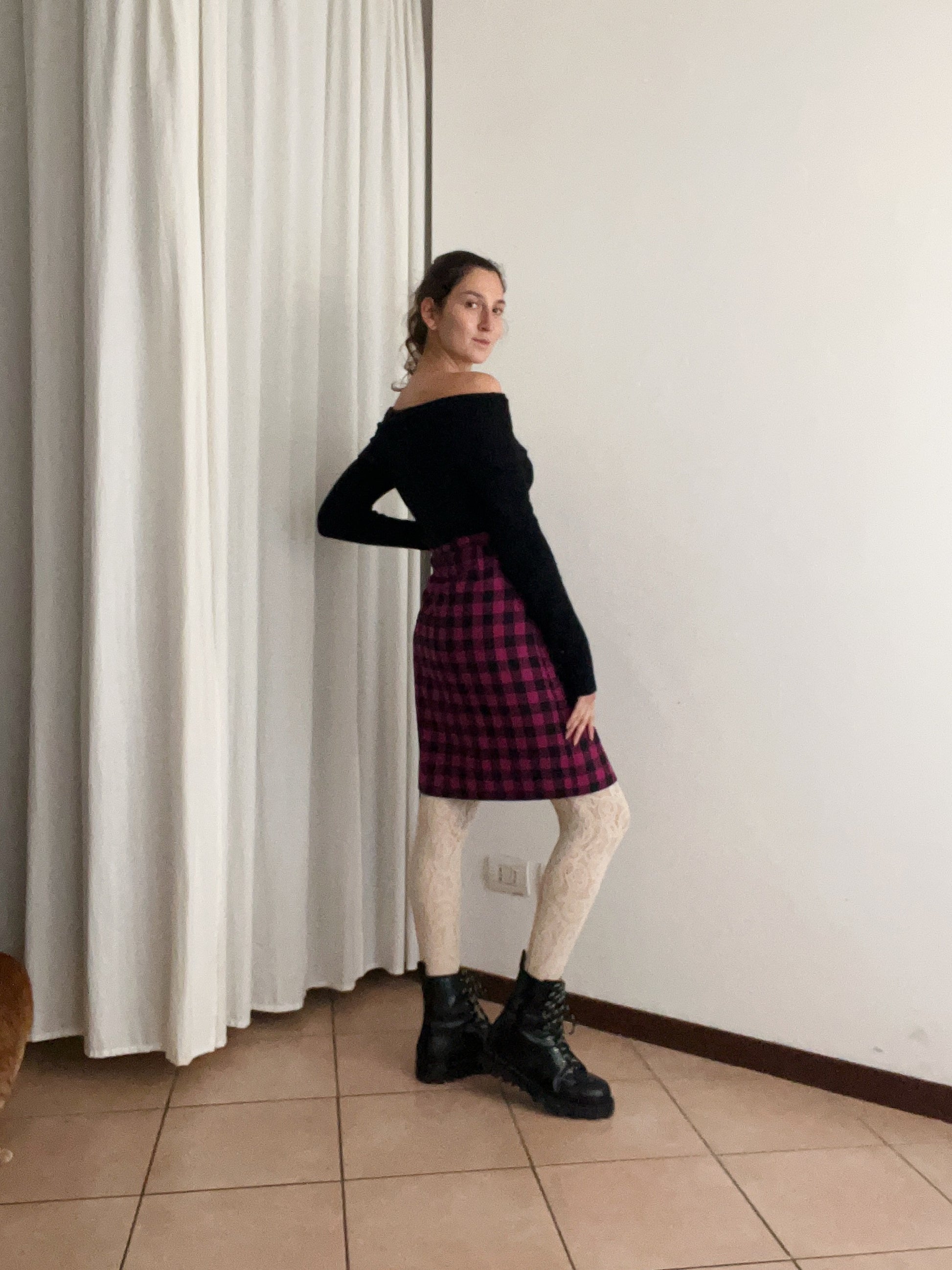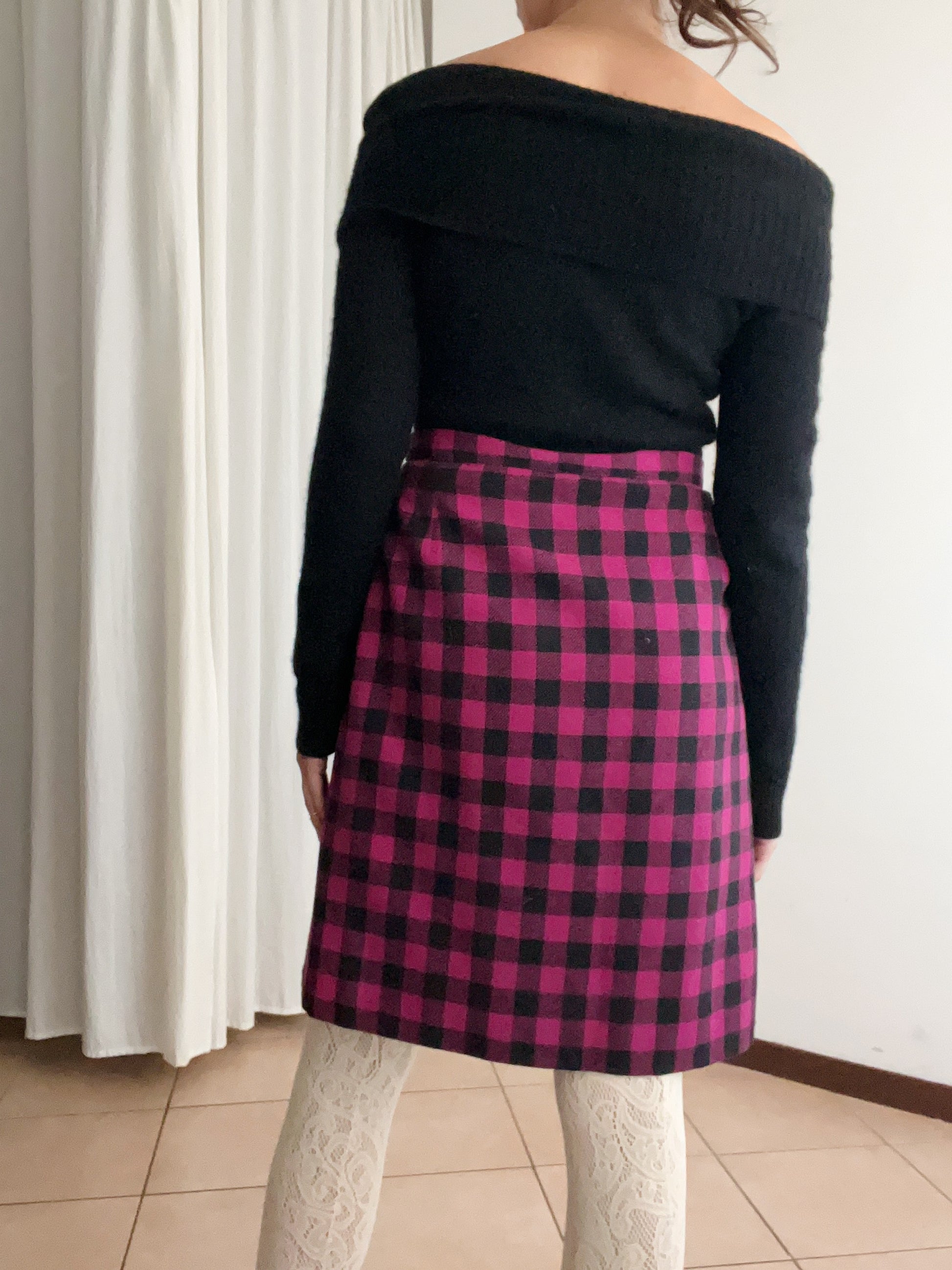 Gonna vintage a quadri fuxia e neri, con fila di bottoni davanti. Non riporta una taglia e composizione ma con il suo girovita di 74 cm veste una taglia 44. Fianchi circa 100. Lunghezza 56. Composizione direi lana, interamente foderata