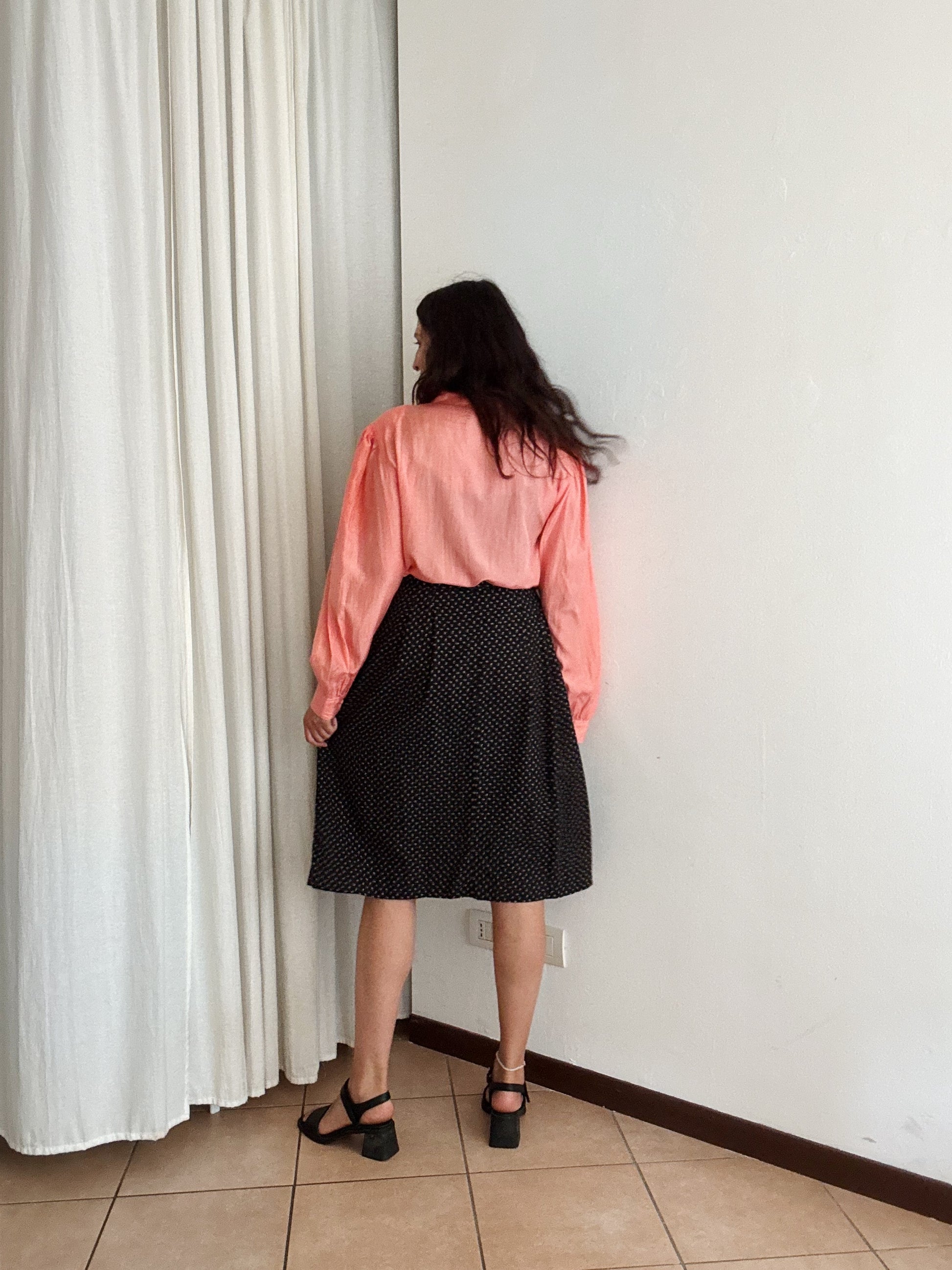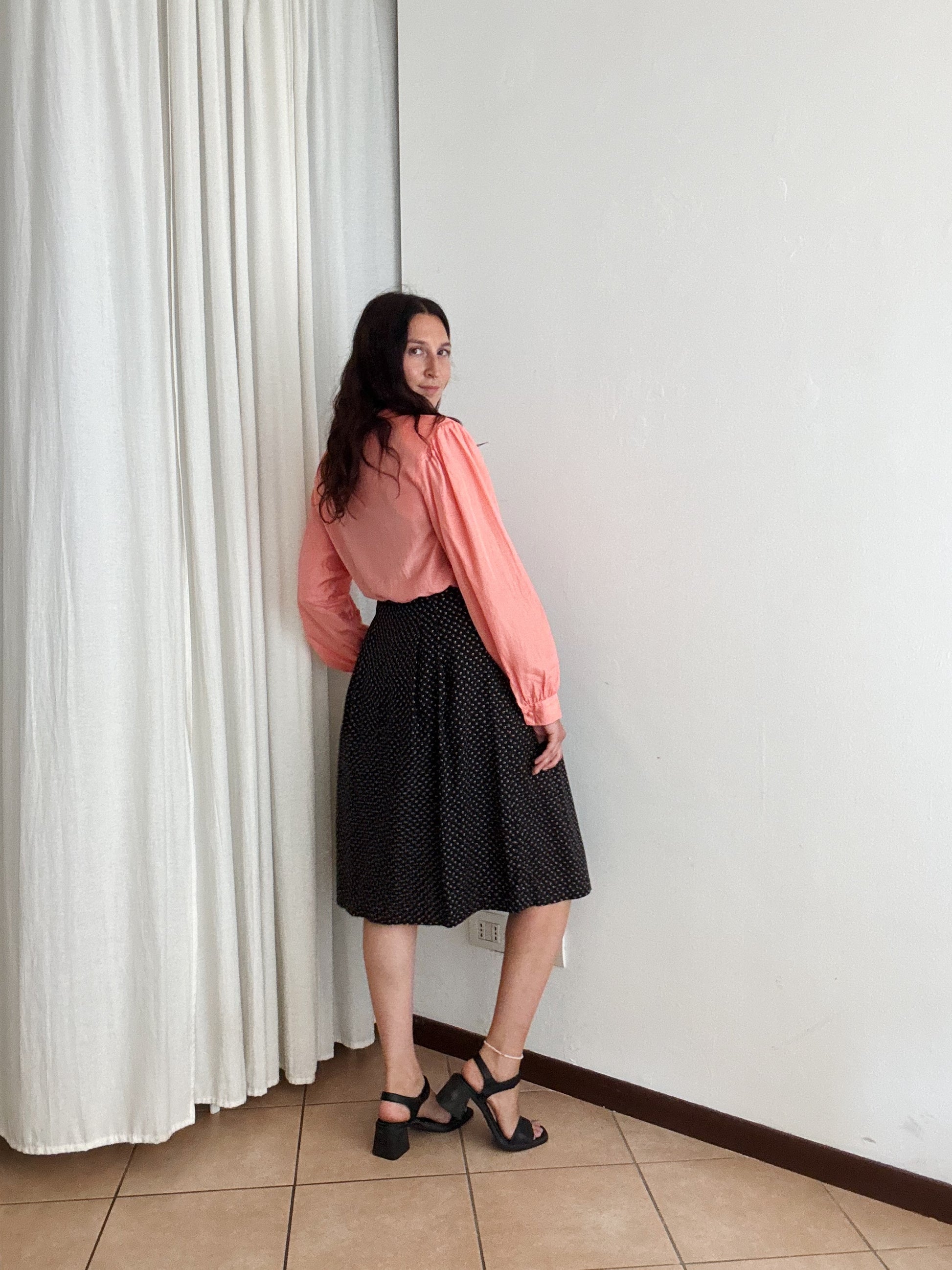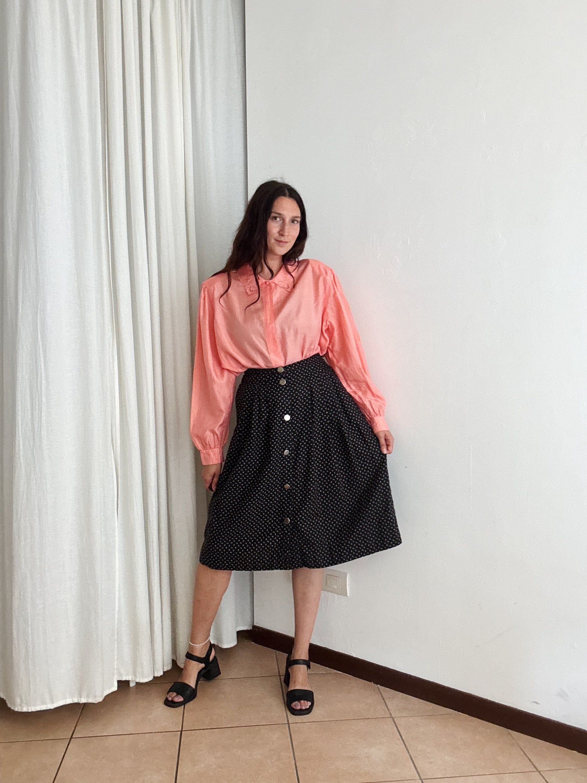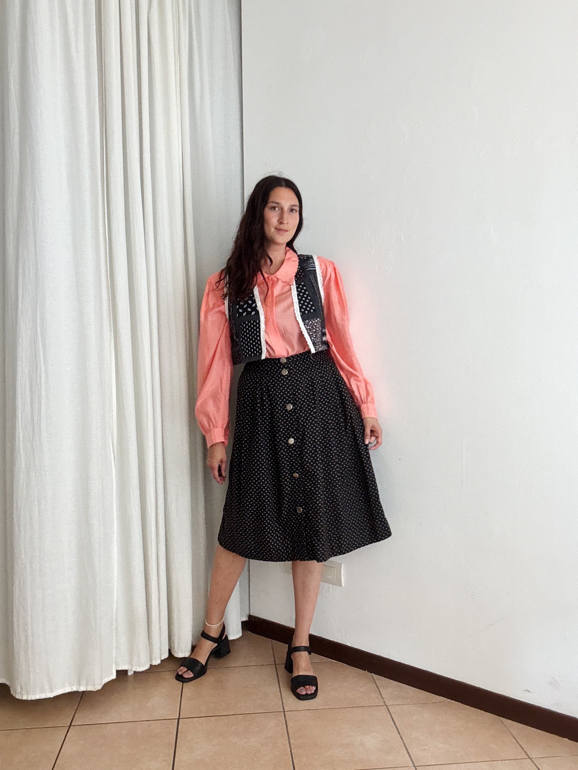 Gonna vintage nera con fiorellini, scampanata con fila di bottoni davanti. LVeste taglia 38/40. Misure: vita 34, lunghezza 68. Sartoriale, composizione non riportata ma direi cotone