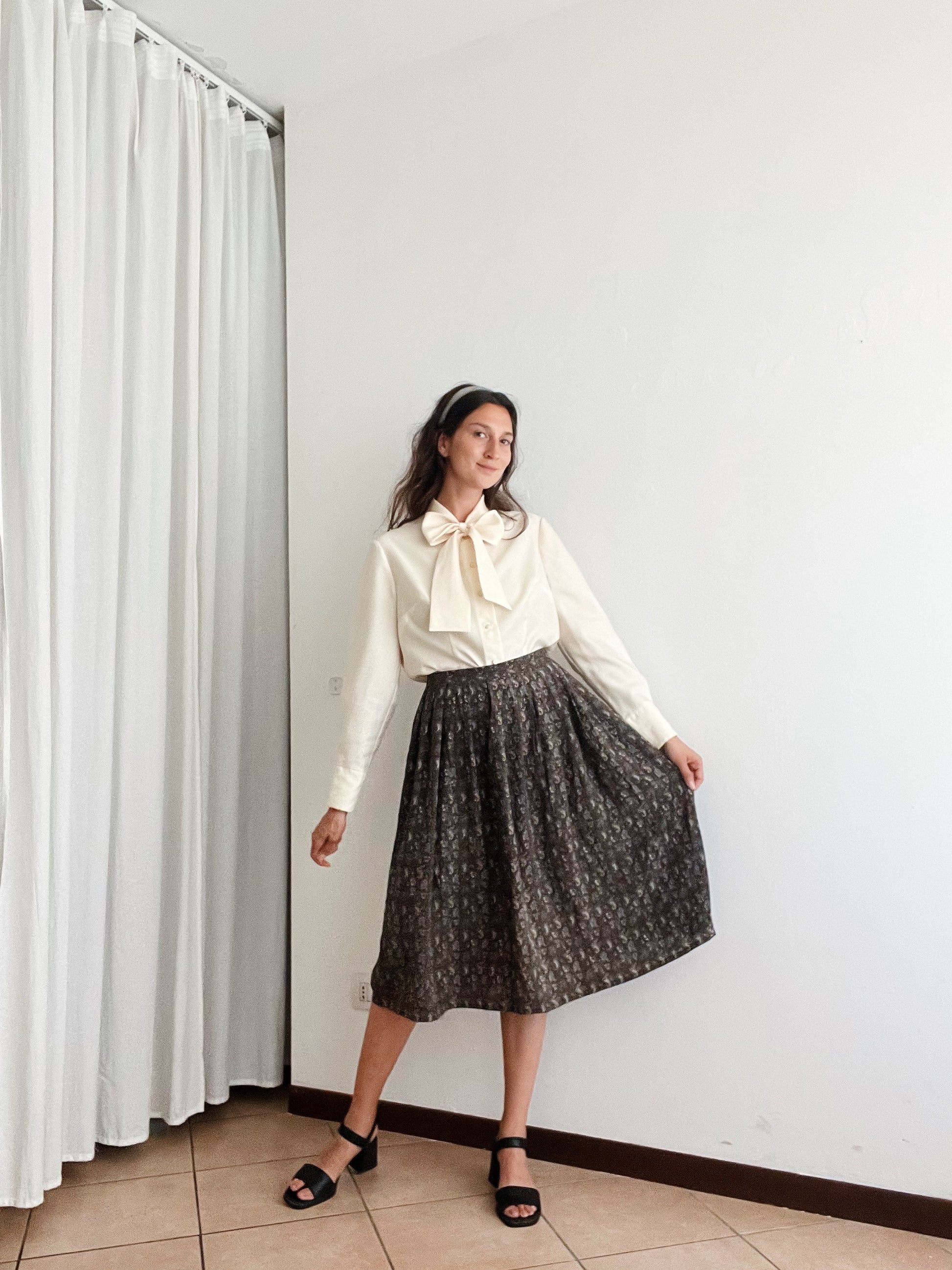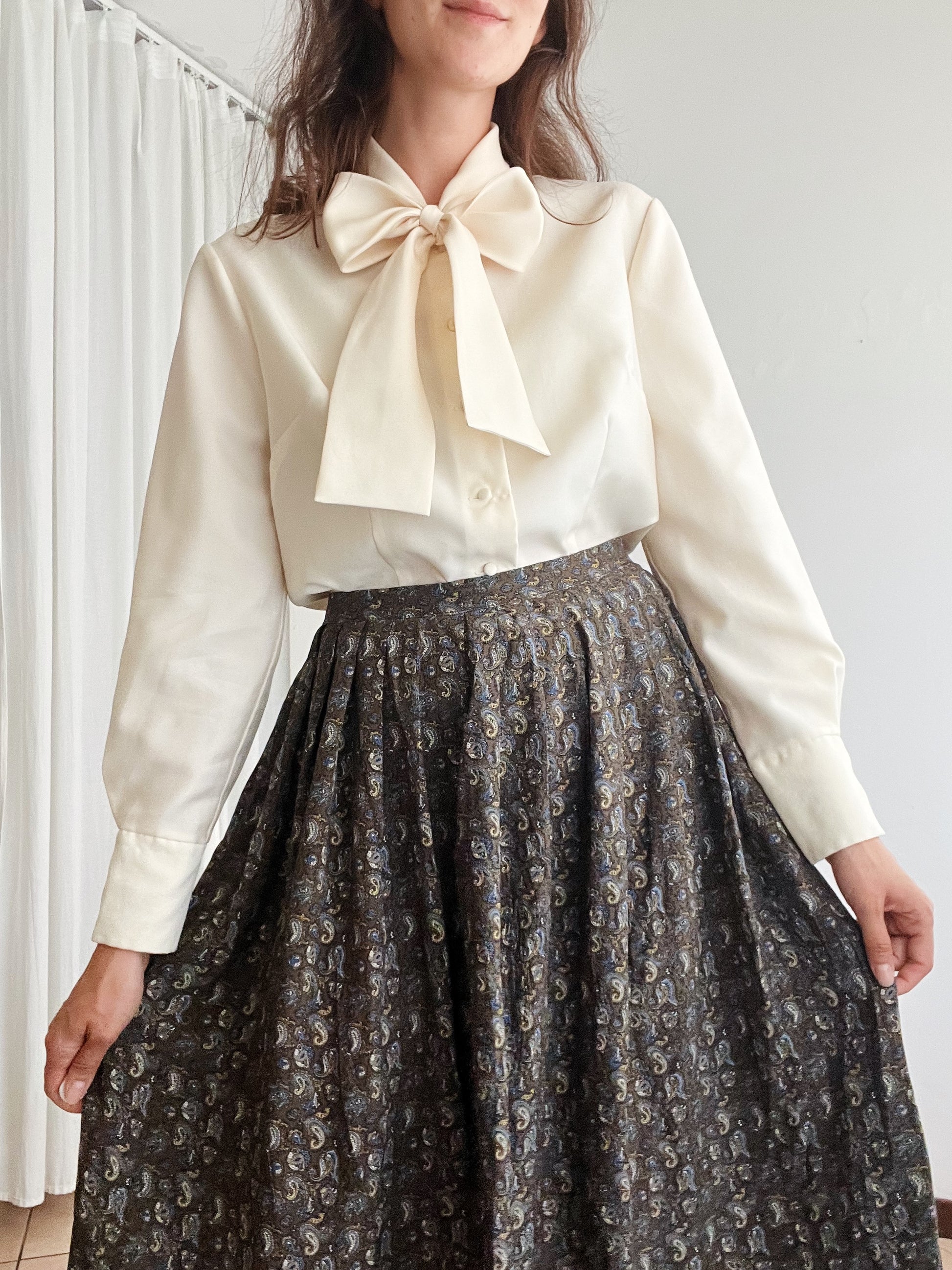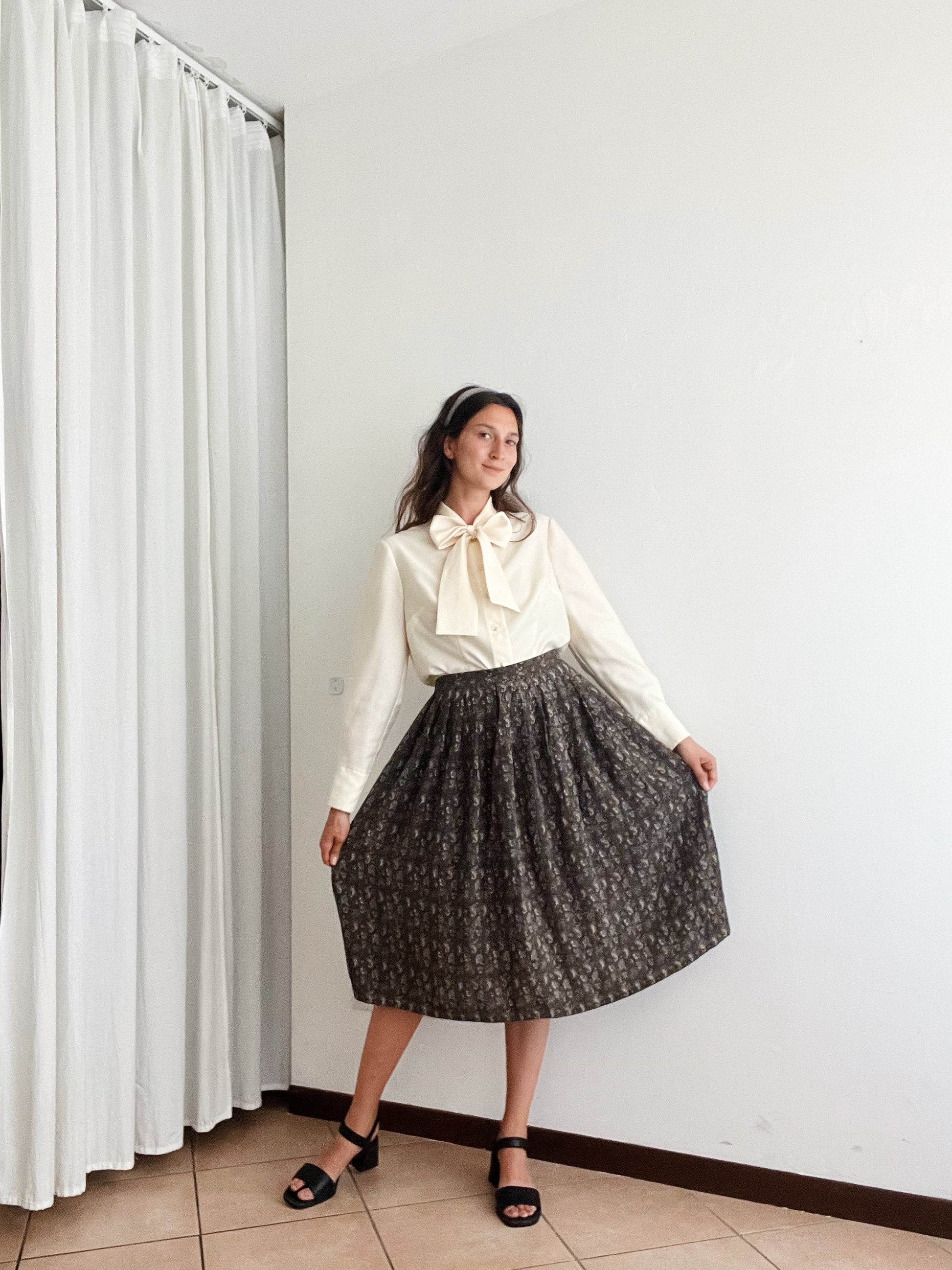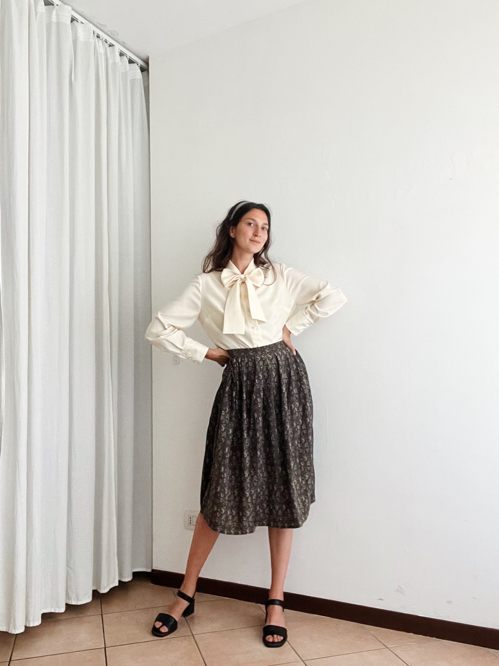Gonna vintage in seta marrone con motivo paisley, veste taglia M con il suo girovita di 73 cm. Composizione non riportata ma decisamente seta. Lunghezza 71