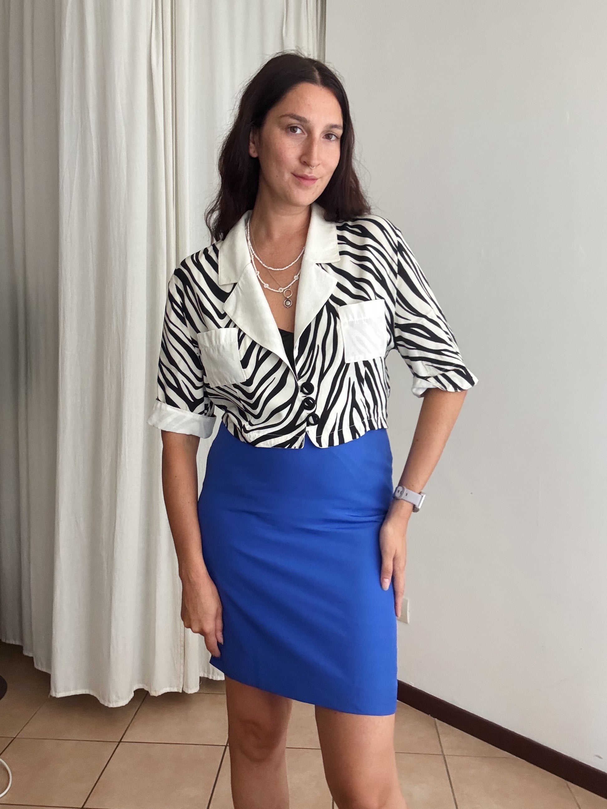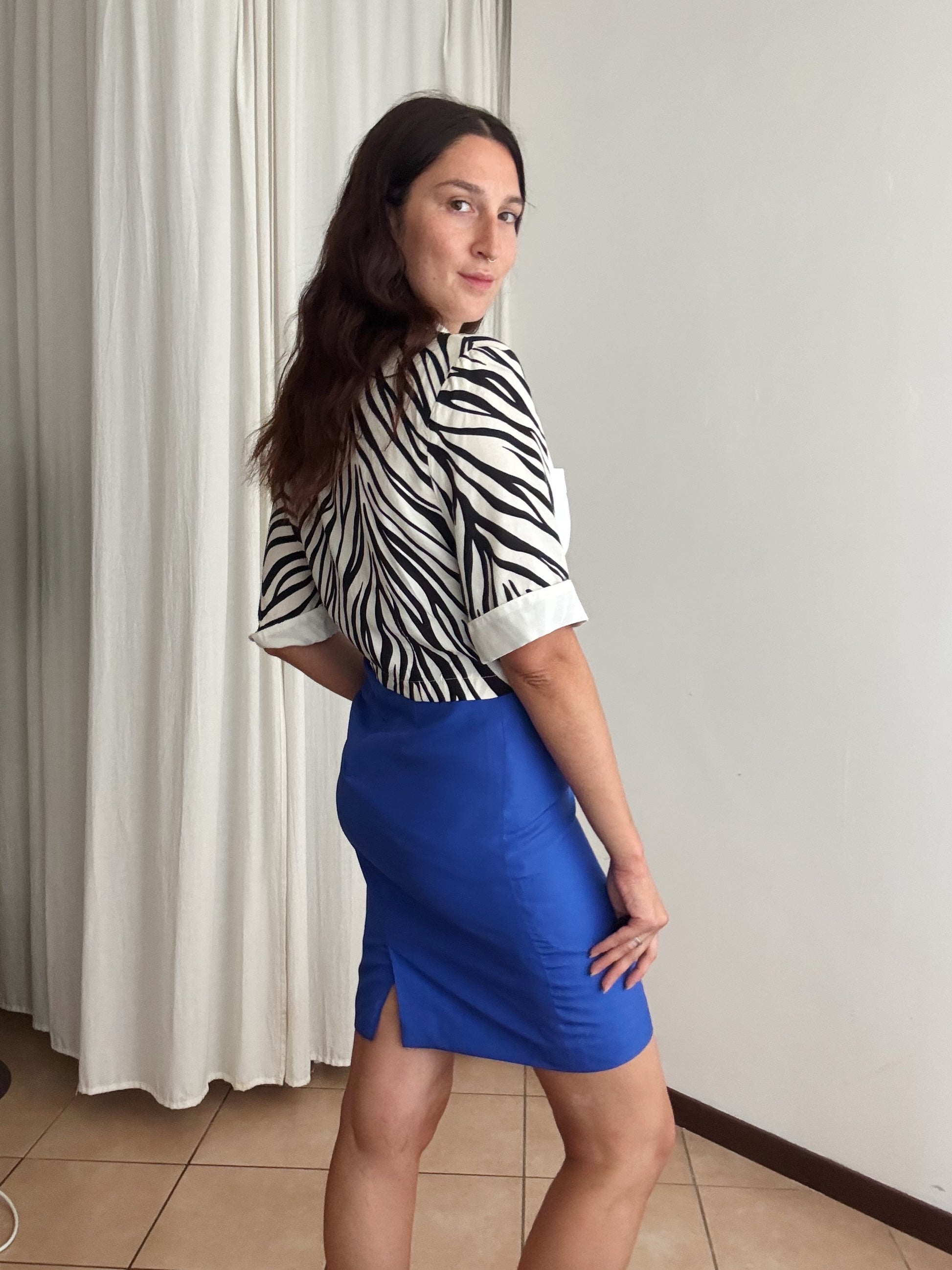Gonna vintage in seta blu taglia 42 ma veste massimo 40. Misure: vita 34 cm, fianchi circa 48, lunghezza 57