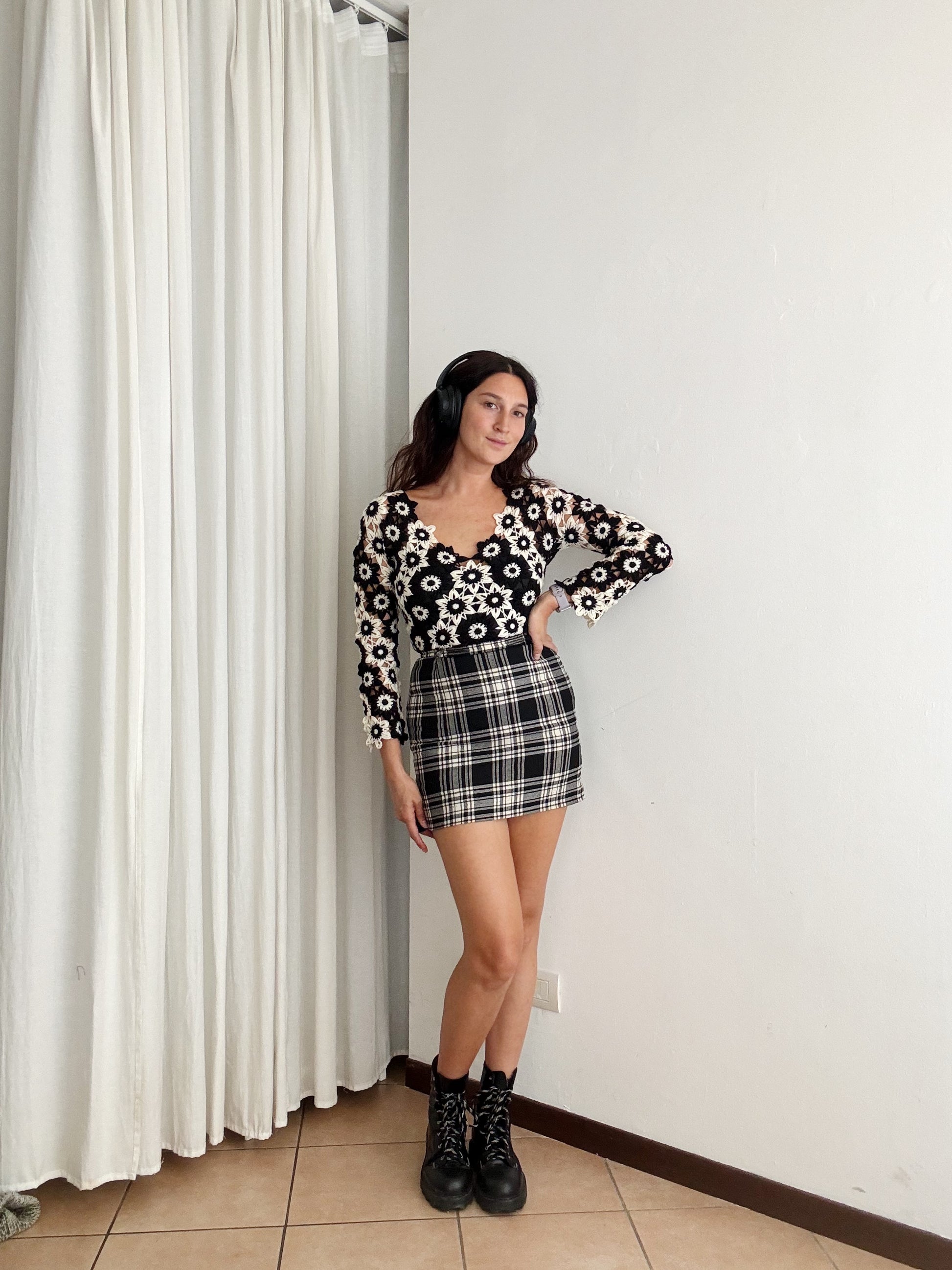 Gonna a tubino in pura lana in tartan bianca e nera.. Riporta taglia 44 ma veste massimo una 38. Girovita 66 cm, fianchi circa 90 cm, lunghezza 41