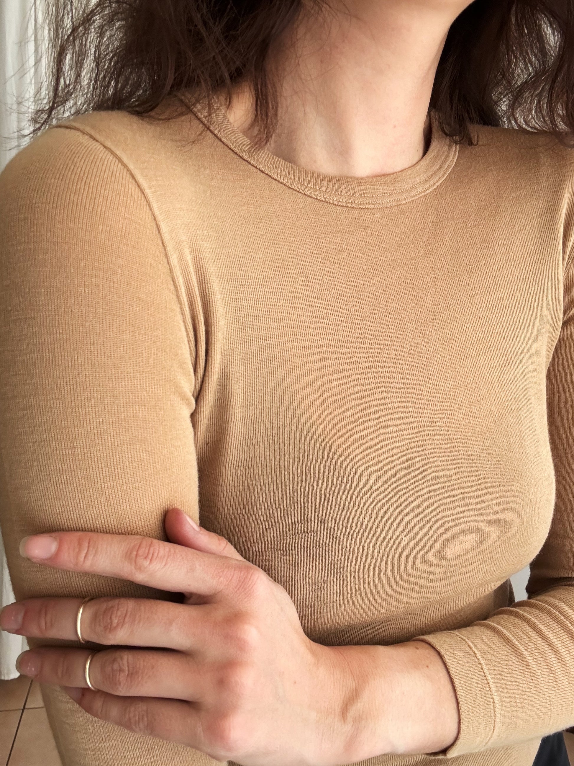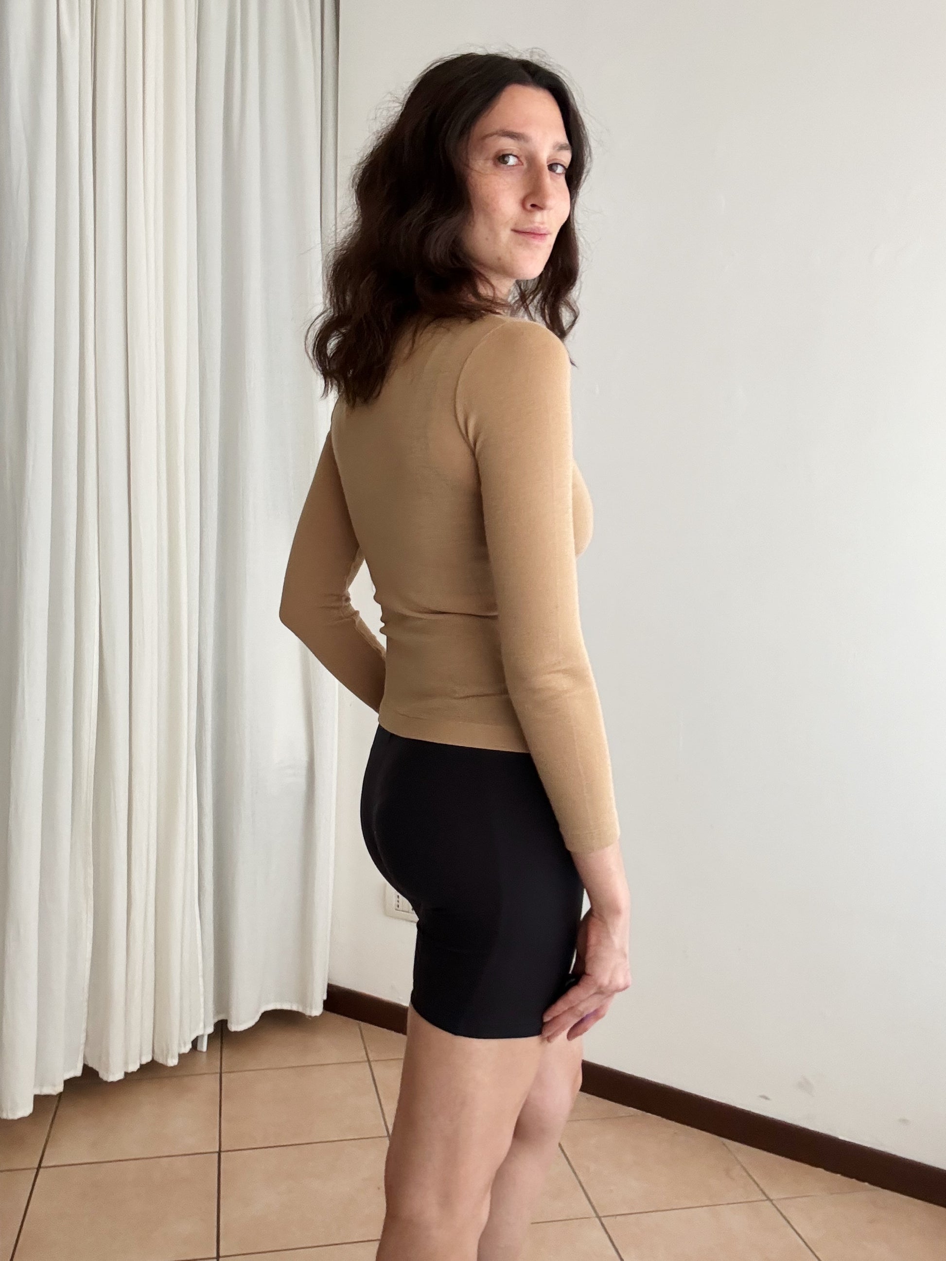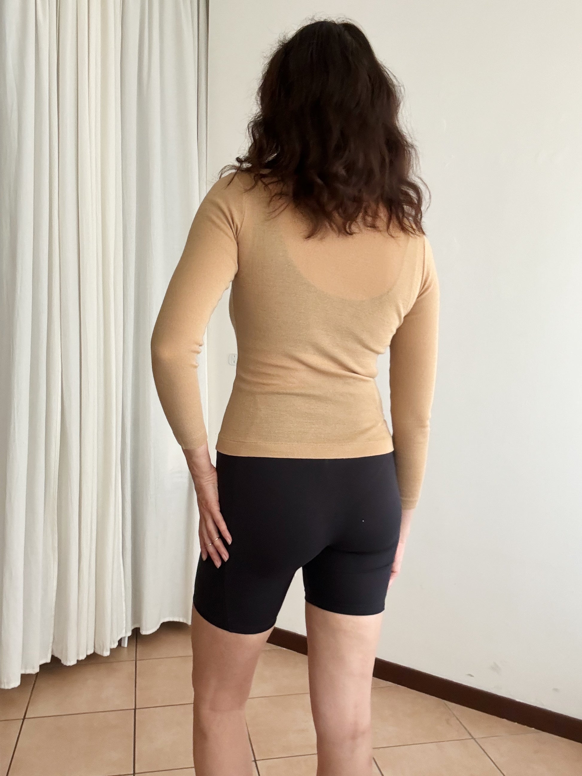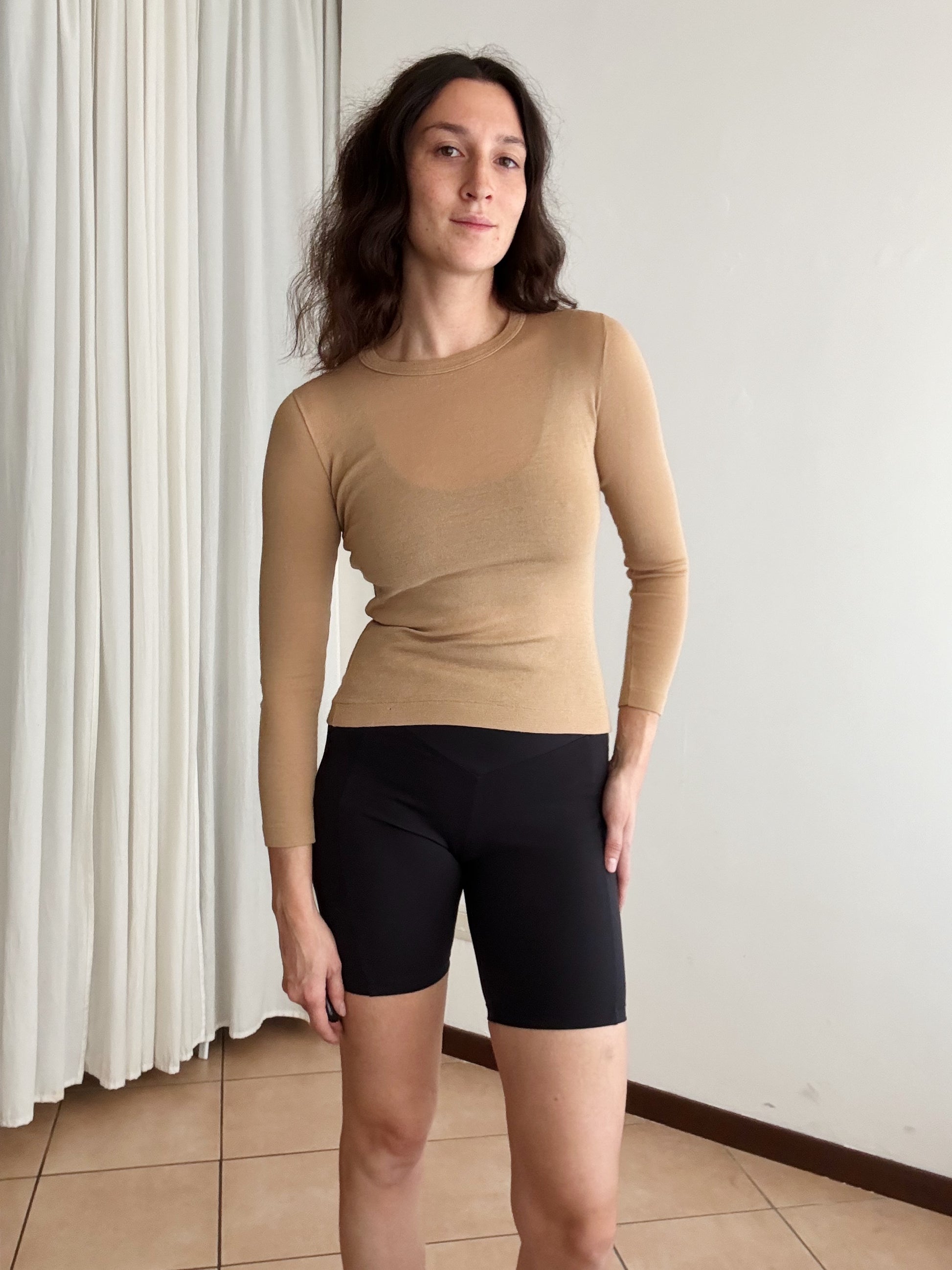 Maglietta vintage beige, senza etichette ma fa parte dello stock vintage in pura lana. Nuova anche se senza cartellino, morbida sulla pelle. Veste XS/S in quanto elasticizzata. Spalle 29, ascelle 33 cm, maniche 54, lunghezza 53.