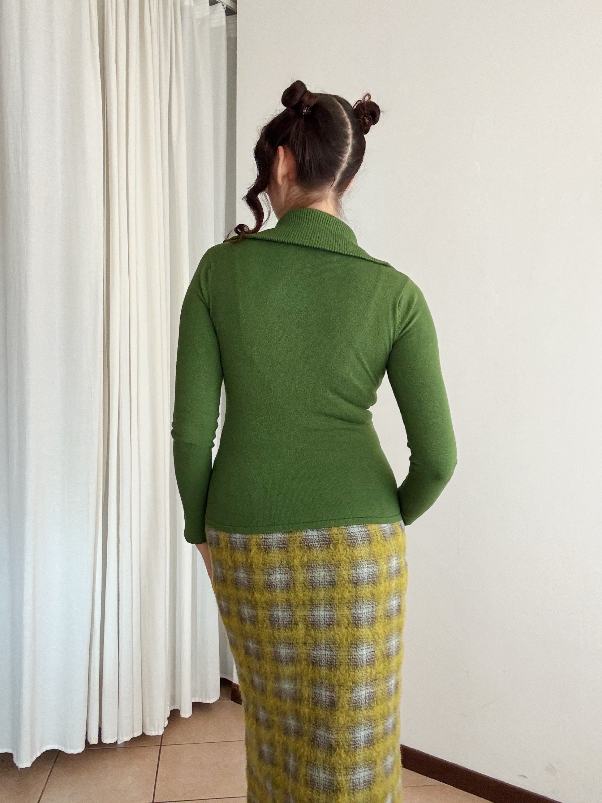 Maglioncino dolcevita second hand verde con zip. Taglia M in 90% viscosa 10% poliammide. Tessuto elasticizzato. Misure: spalle 37, ascelle 38, maniche 57, lunghezza 52.
