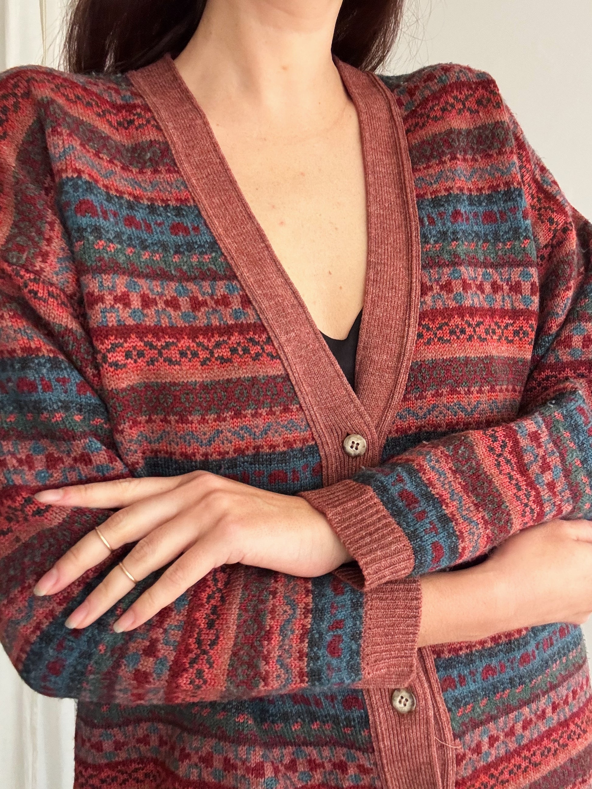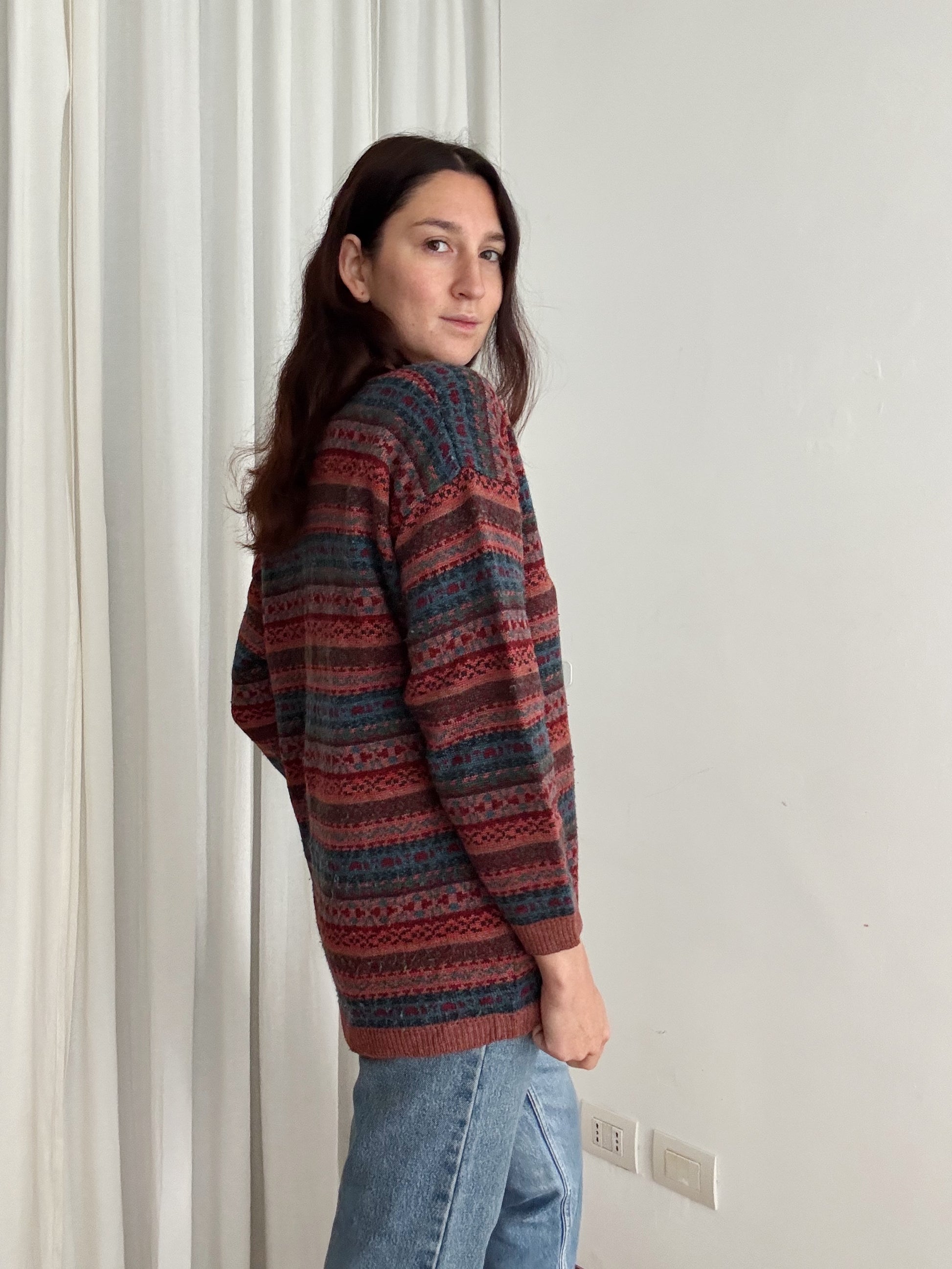 Maglione vintage bordeaux taglia 46. Misure: spalle 59, ascelle 55 cm, maniche 44, lunghezza 67. Composizione non più leggibile ma direi lana