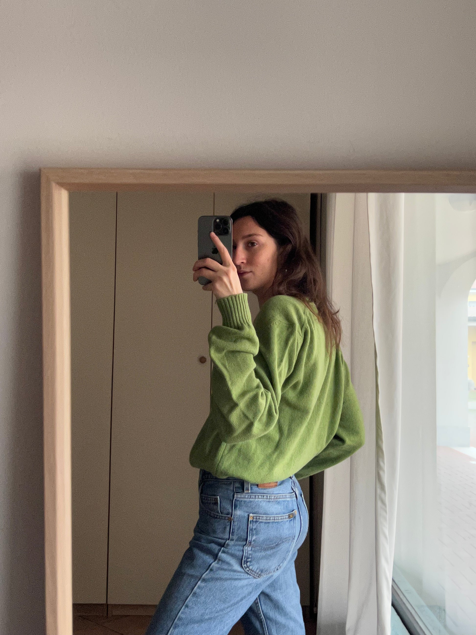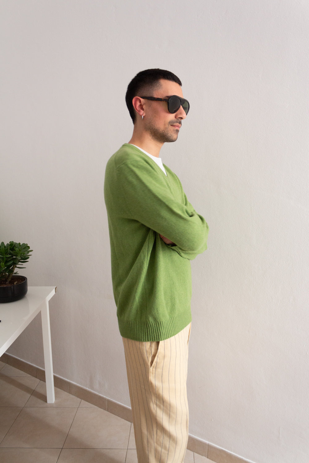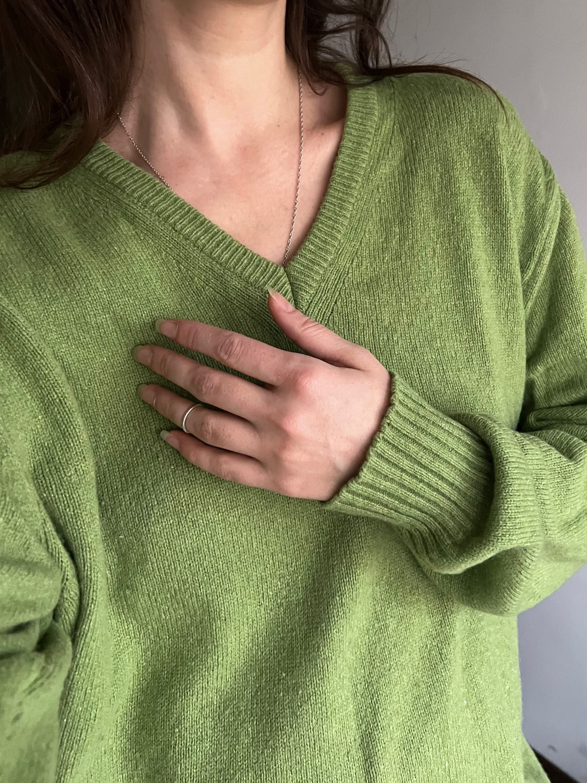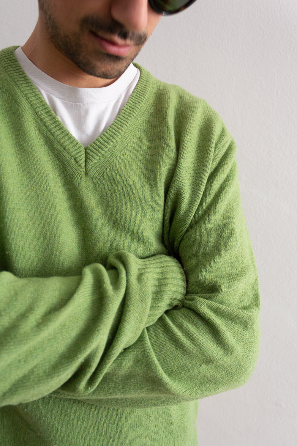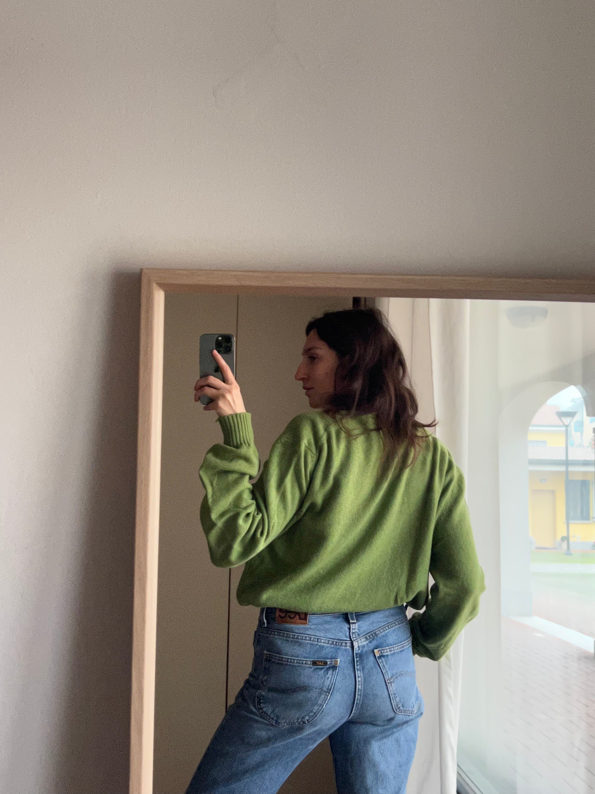 Maglione Ungaro verde. Non riporta taglia ma direi una XL da uomo. Composizione 65% lana 15% viscosa 10% cachemire 10% poliammide. Misure: spalle 49, ascelle 59, maniche 69, lunghezza 70