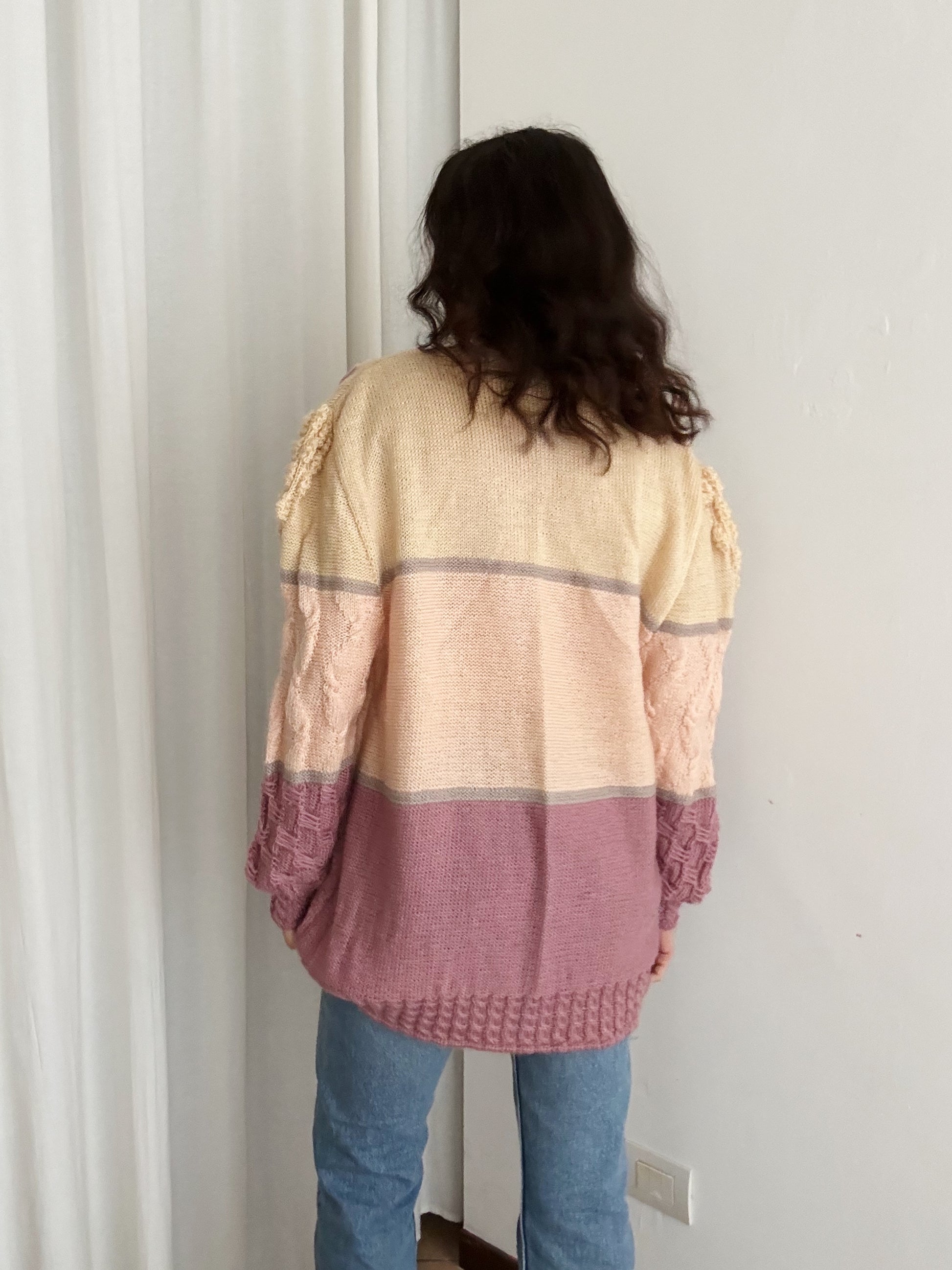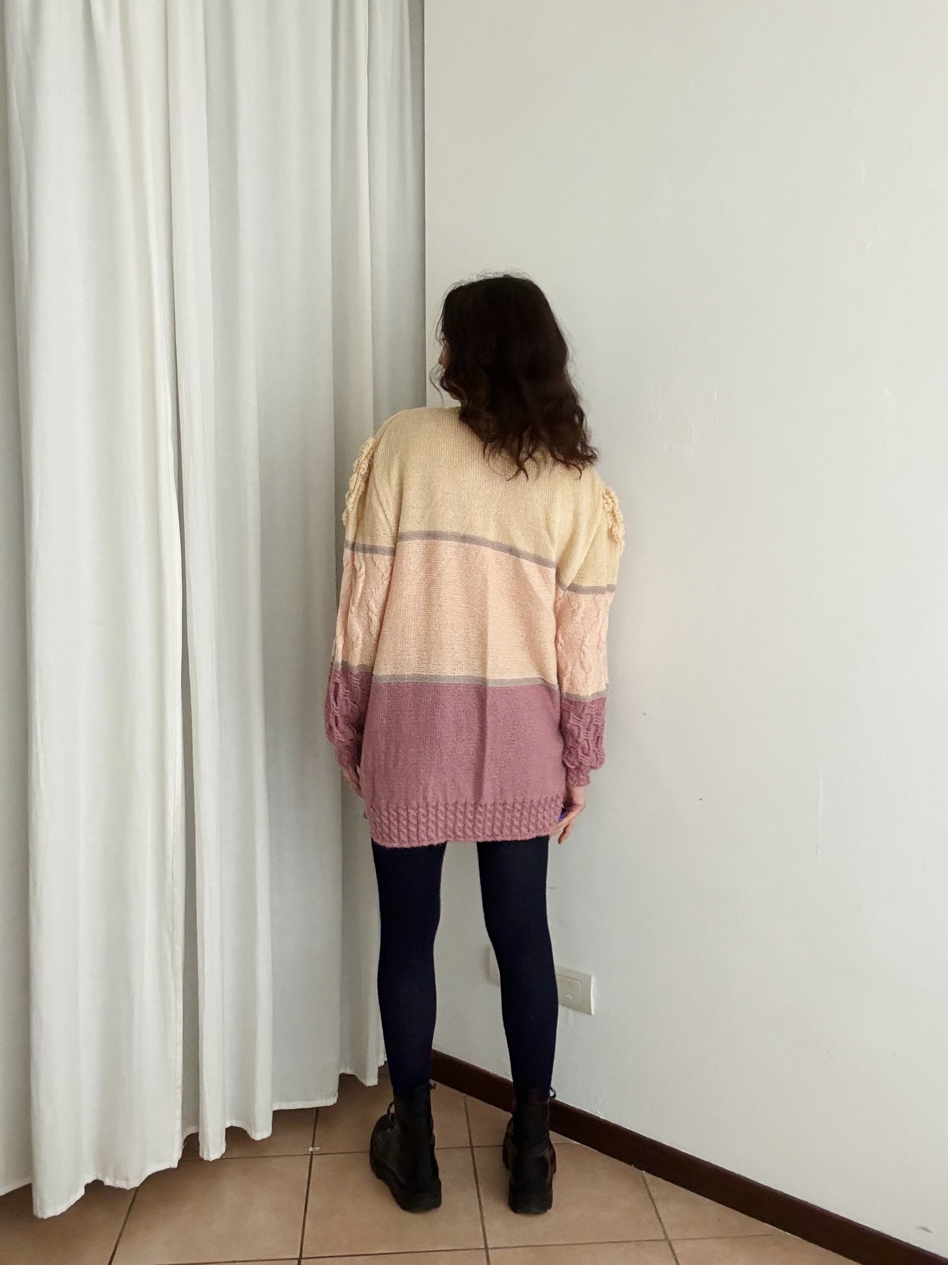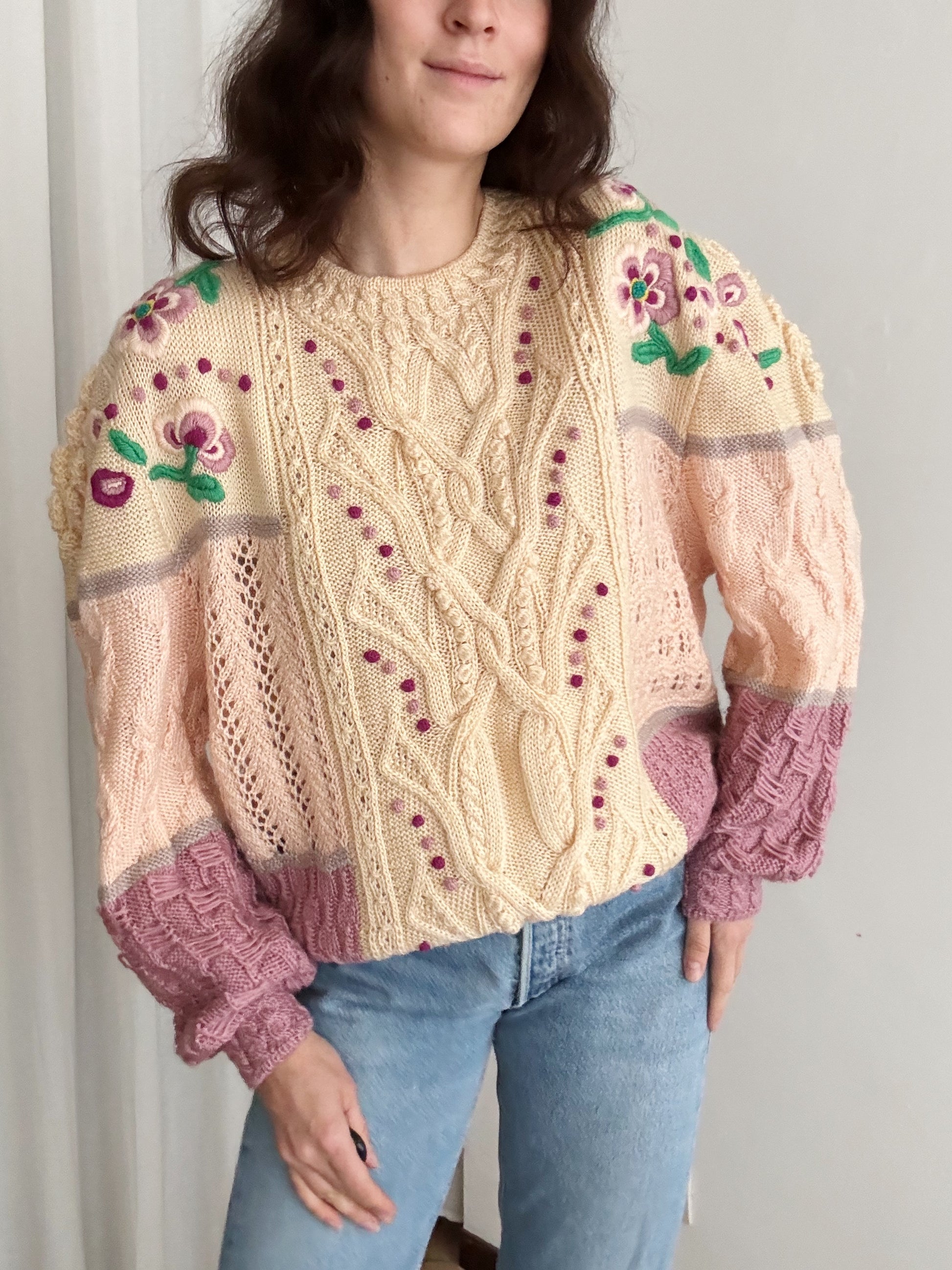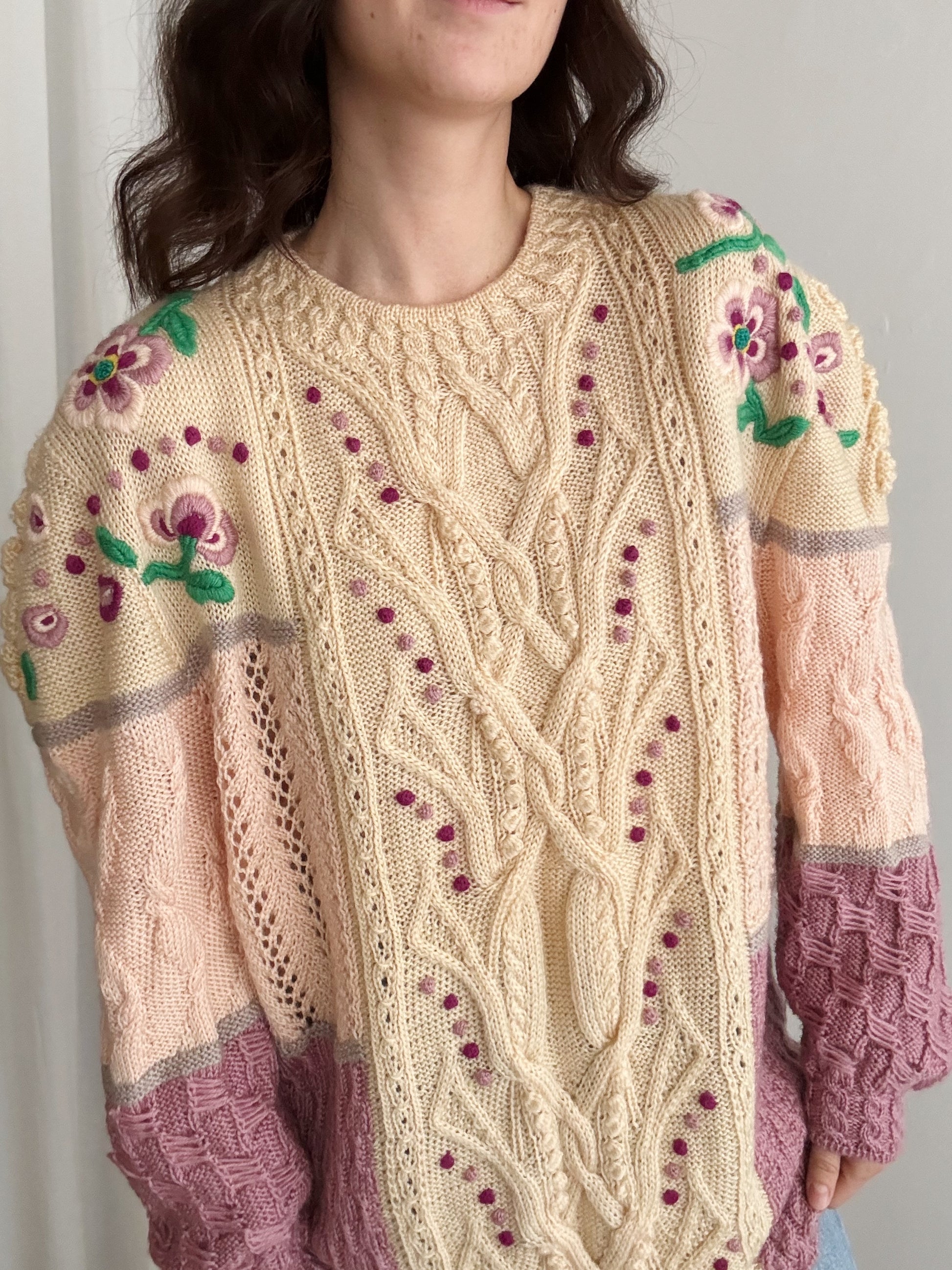 Maglione vintage in diverse tonalità del rosa con ricami. Veste fino a una XL e su taglie piccole può essere usato anche come mini dress. Misure: spalle 47, ascelle 59 cm, maniche 61, lunghezza 70. Composizione non riportata ma direi lana misto acrilico