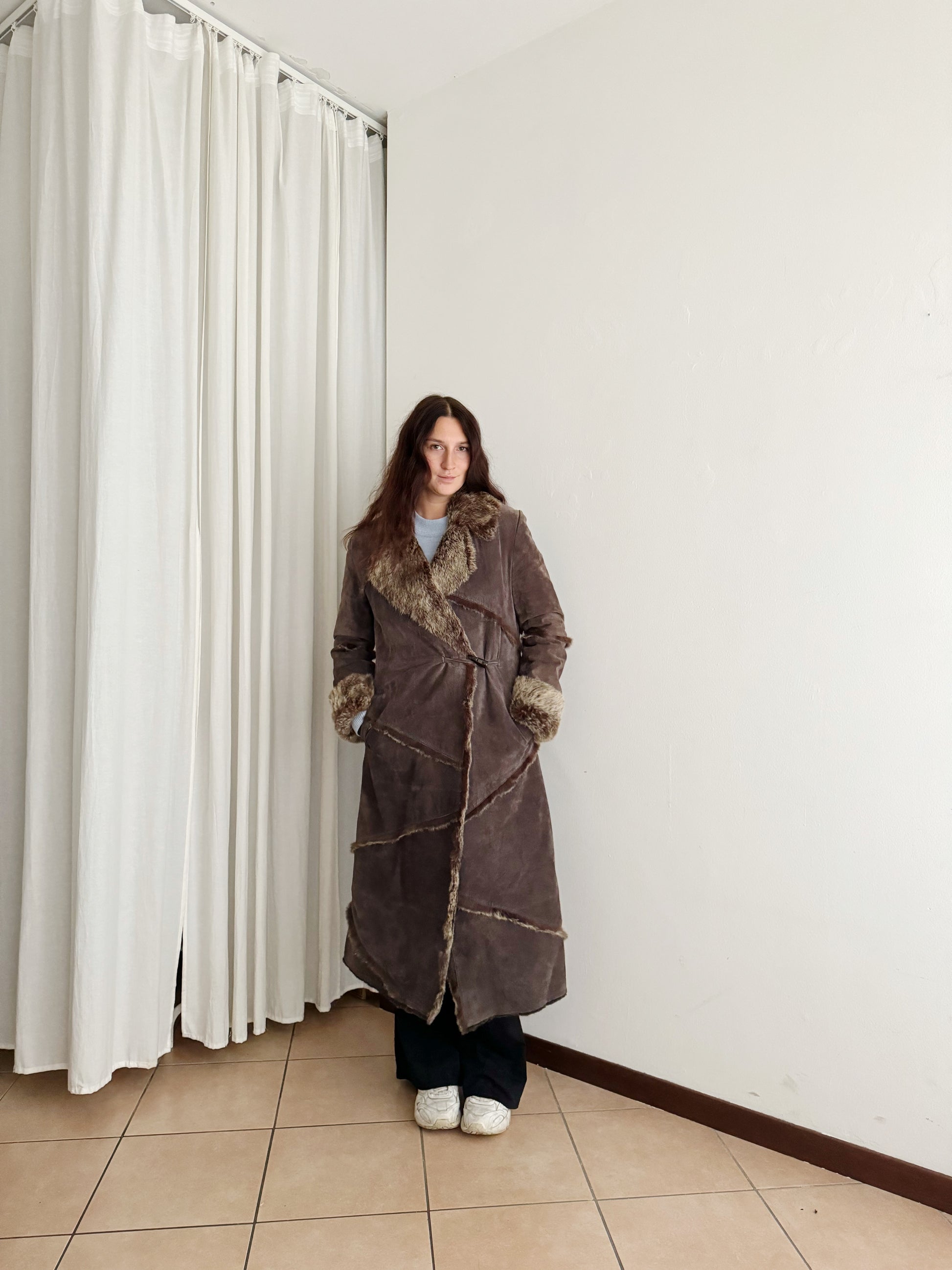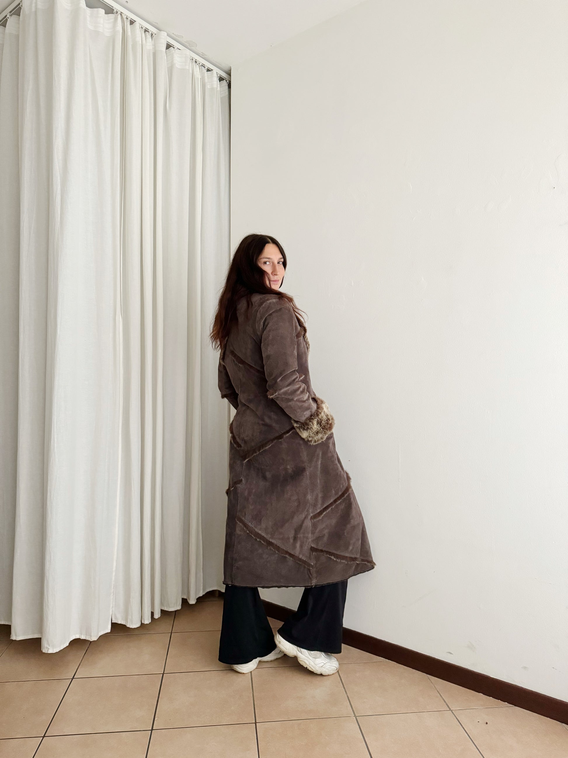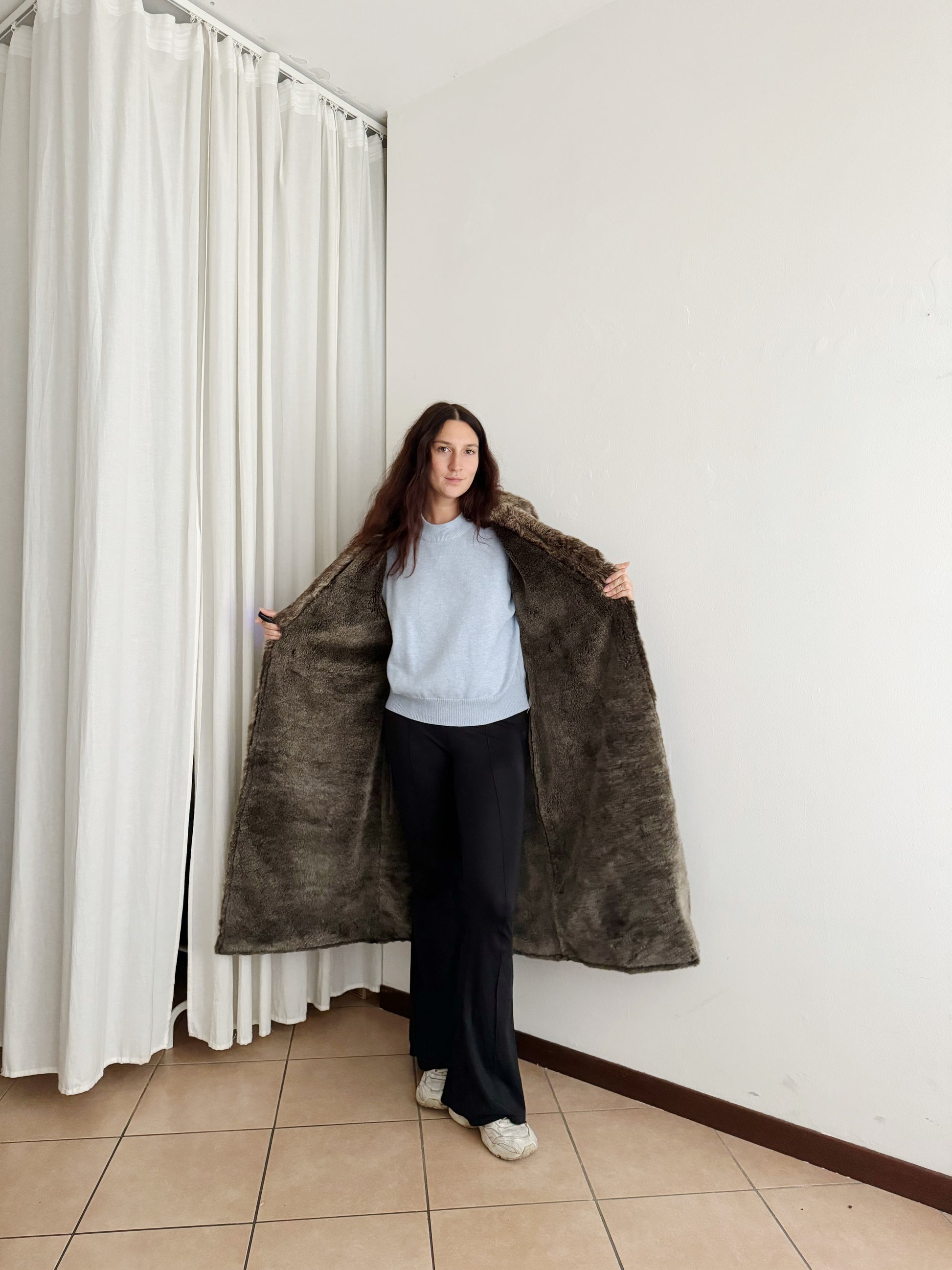 Cappotto montone vintage in pelle vera con caldo pelo sintetico interno. Colletto e maniche in pelliccia vera di lapin. Taglia M. Misure: spalle 44, ascelle 51, maniche 62, lunghezza 124.