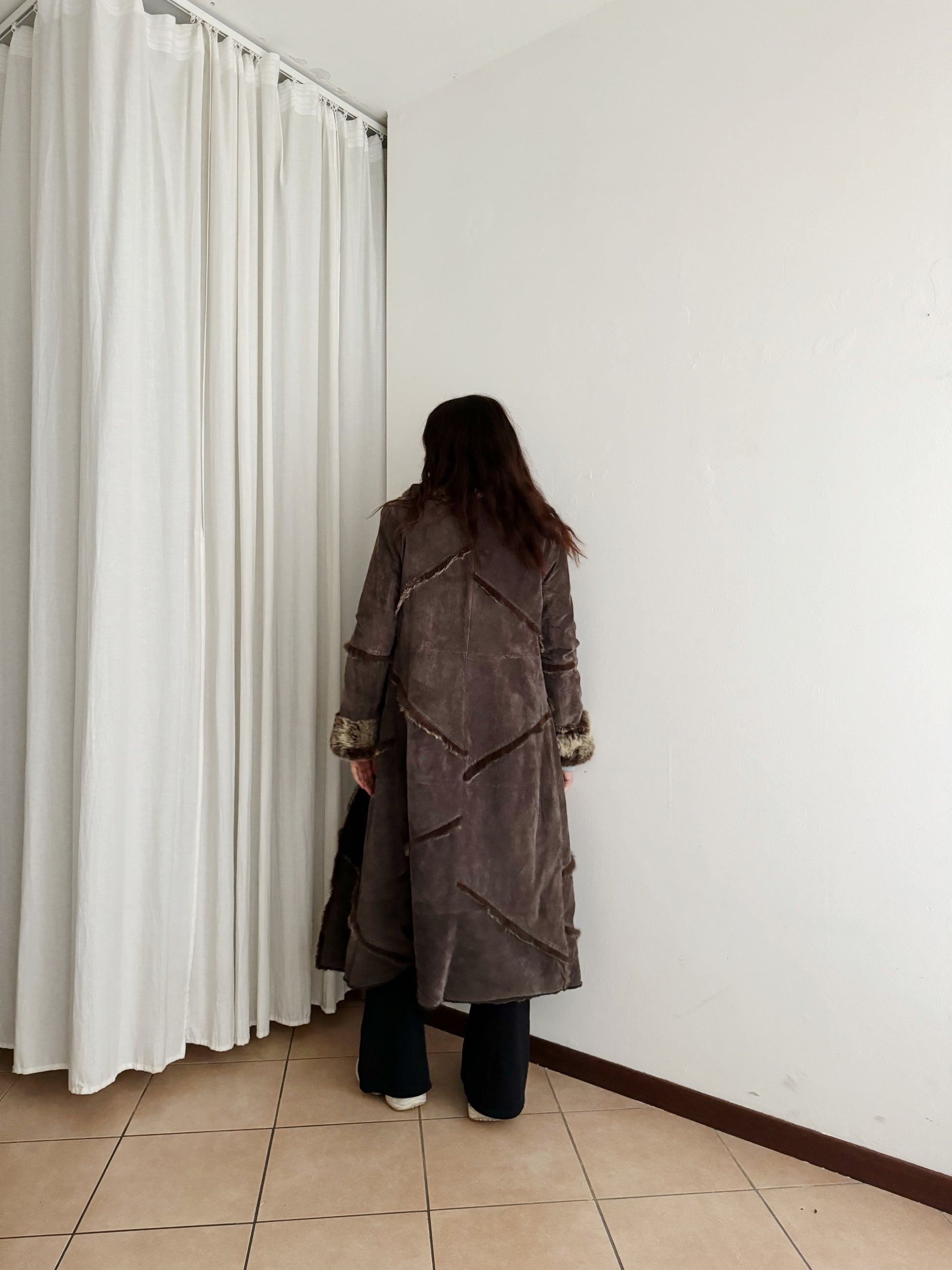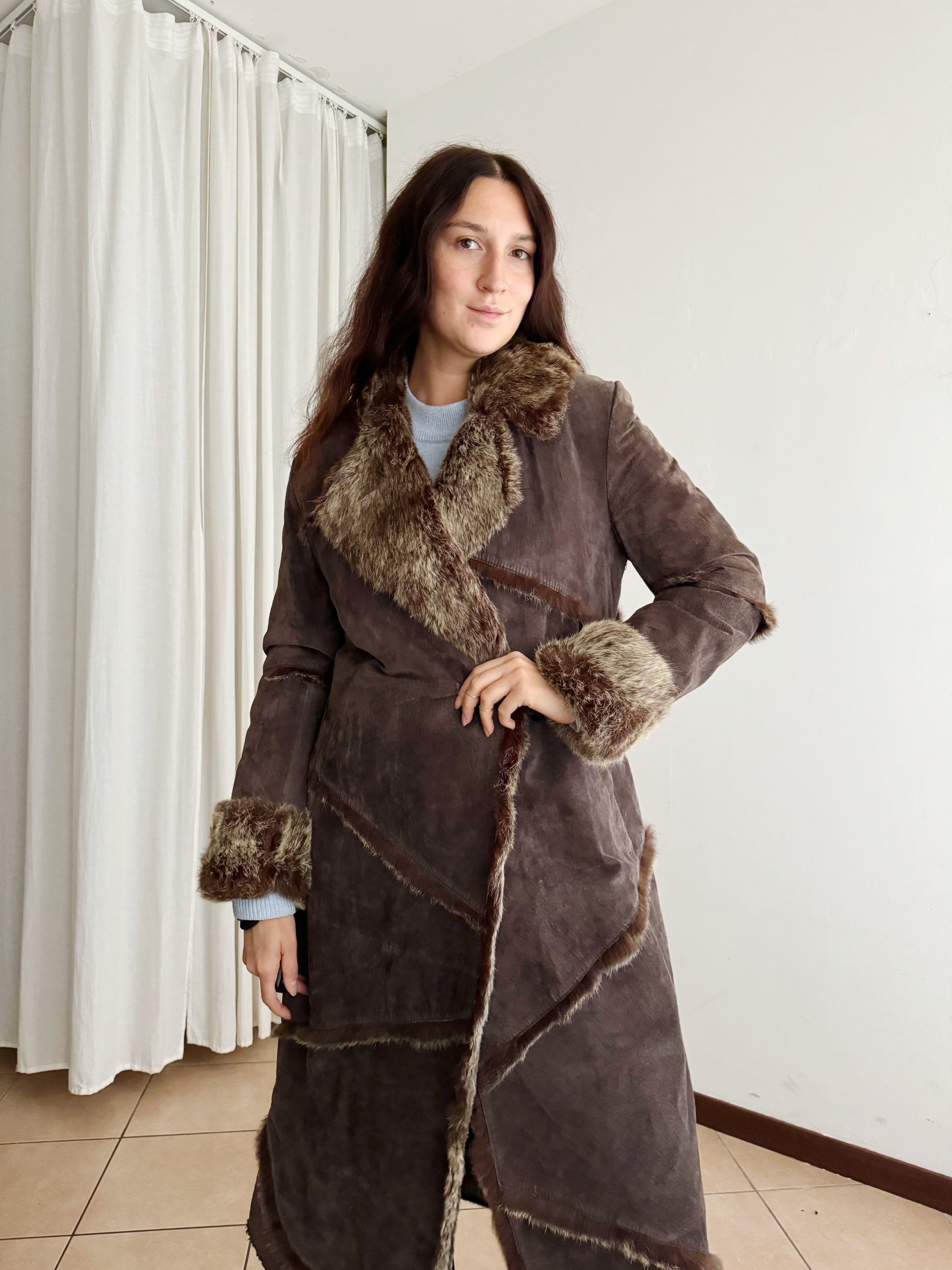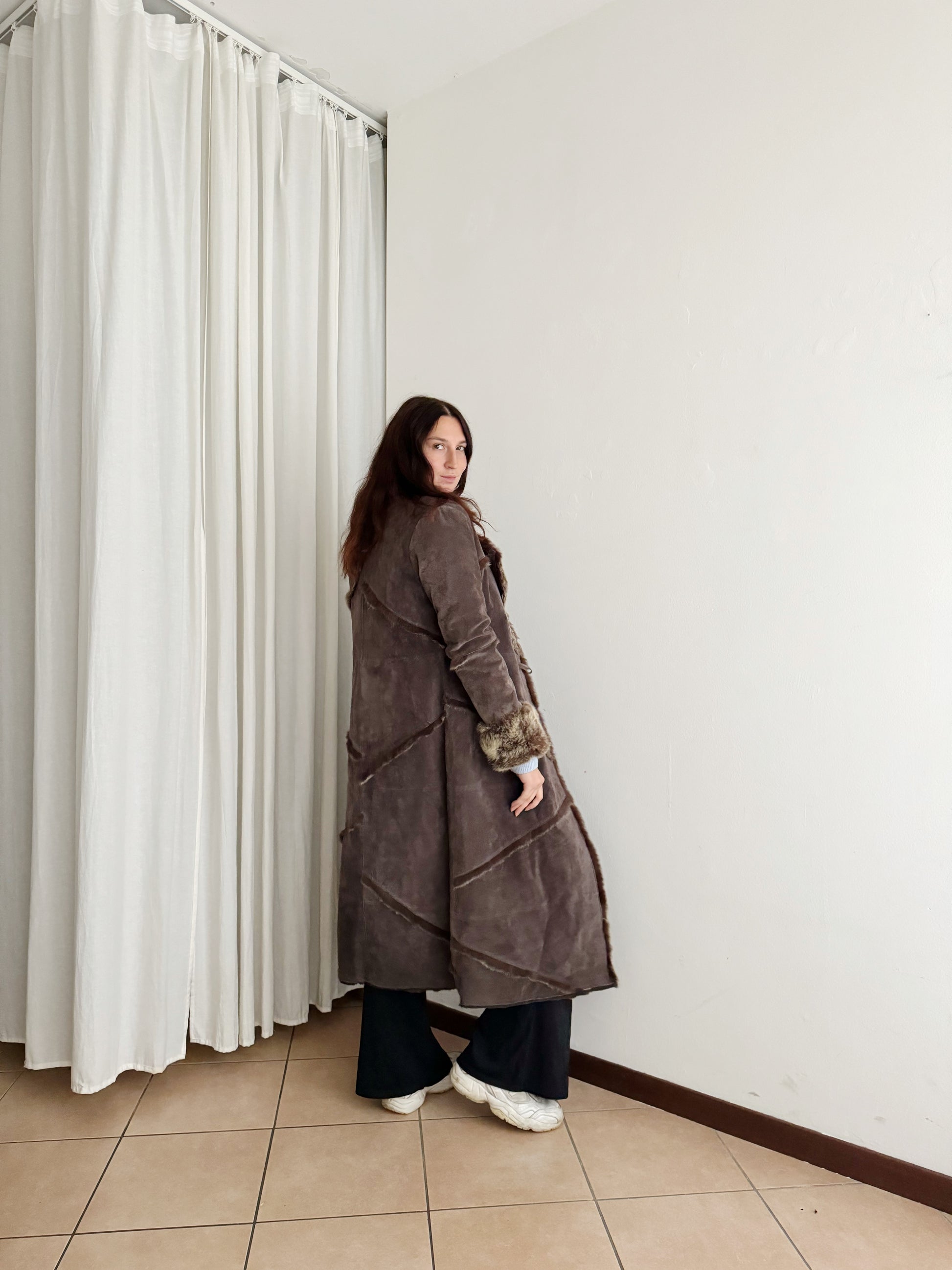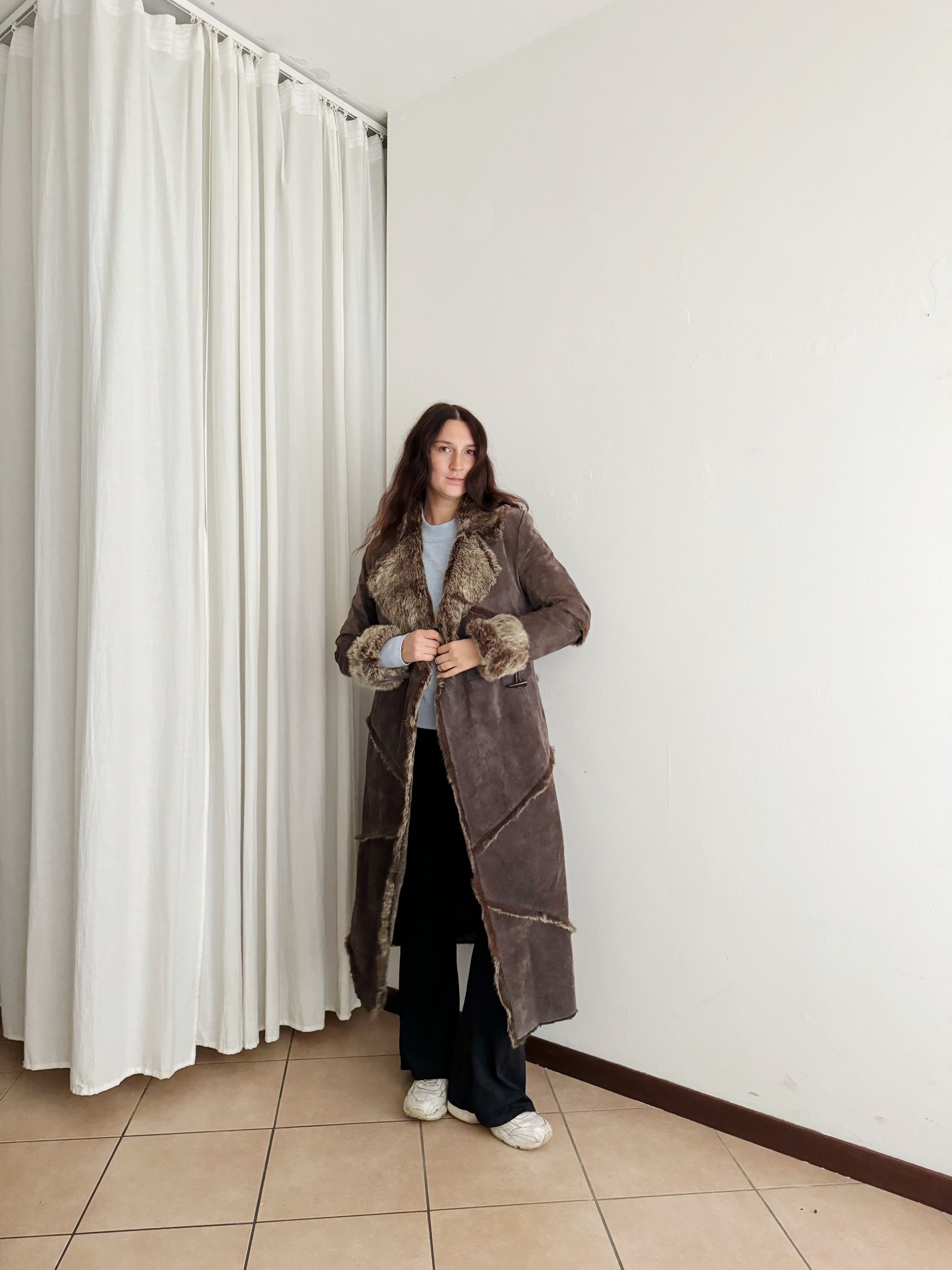 Cappotto montone vintage in pelle vera con caldo pelo sintetico interno. Colletto e maniche in pelliccia vera di lapin. Taglia M. Misure: spalle 44, ascelle 51, maniche 62, lunghezza 124.