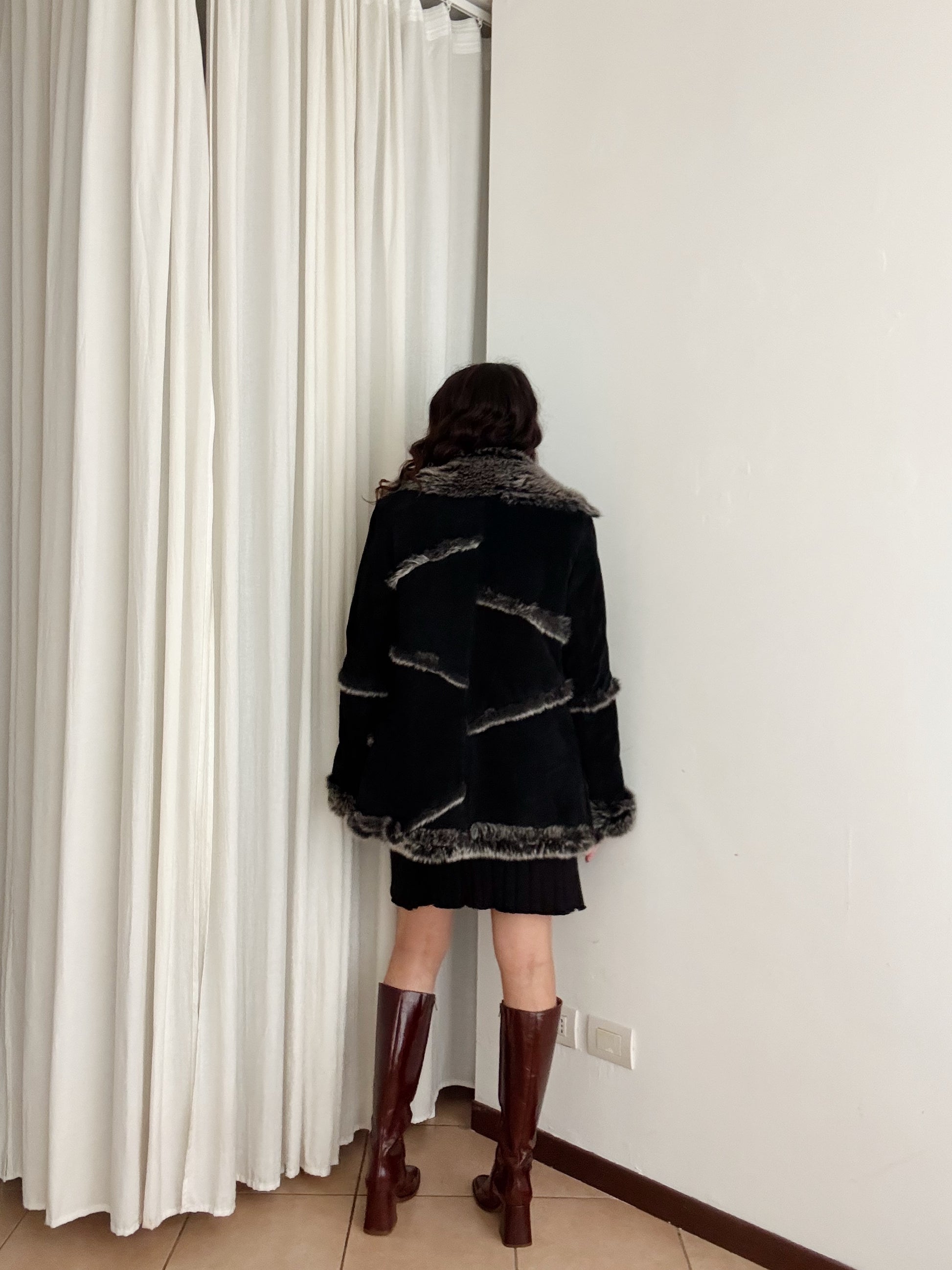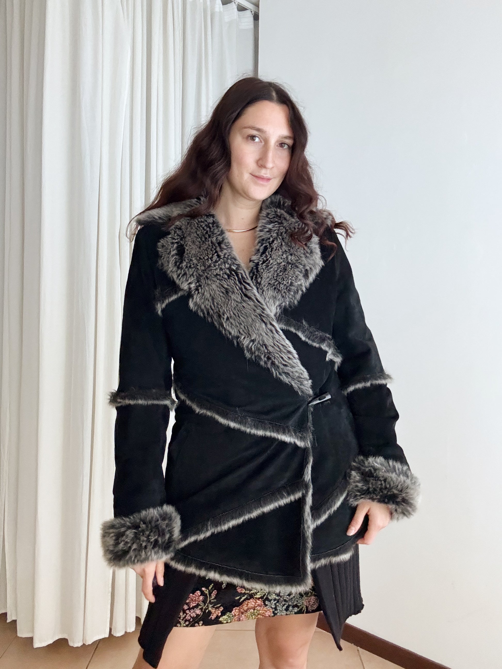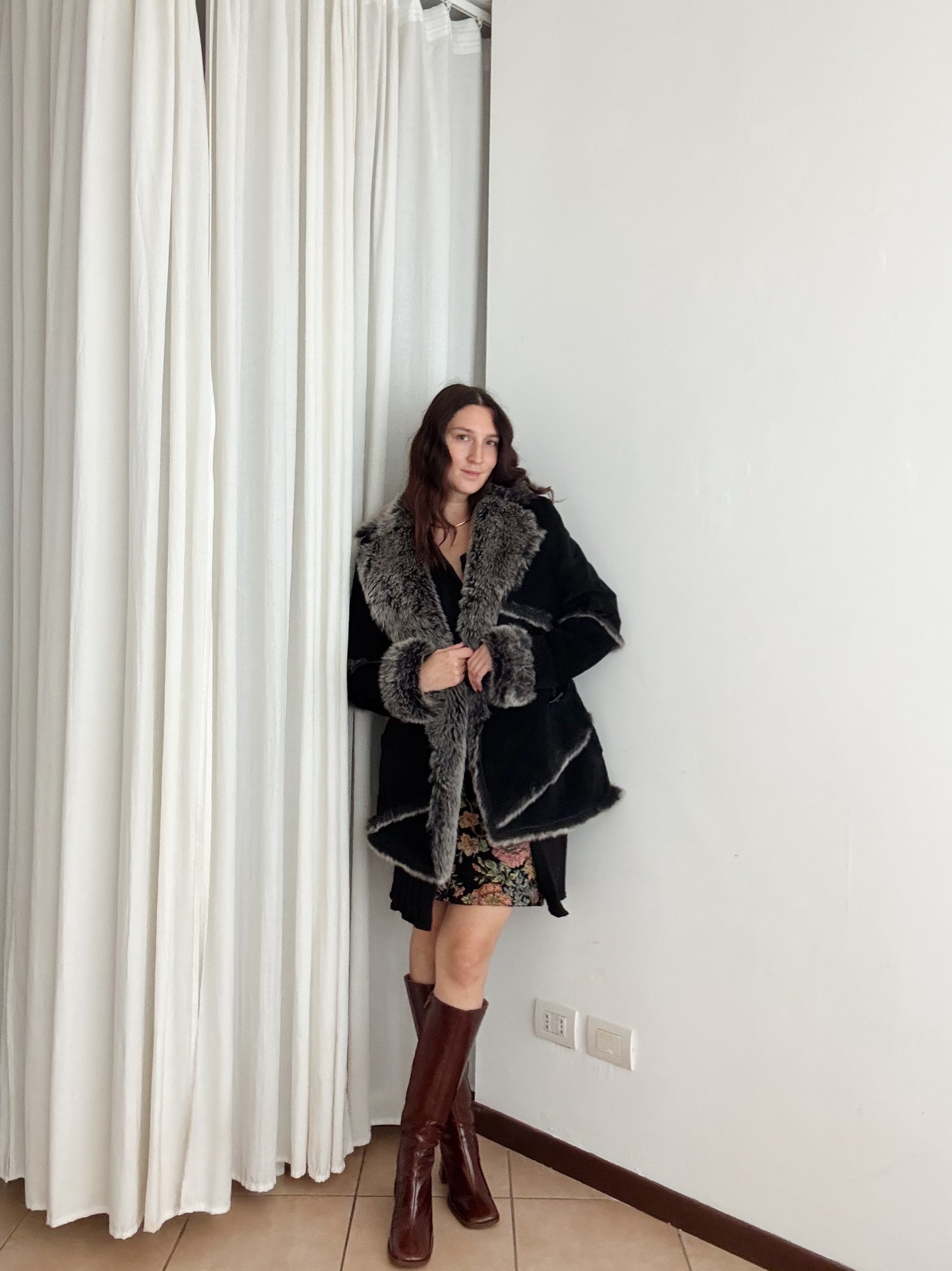 Cappotto montone vintage in pelle vera con caldo pelo sintetico interno. Taglia M. Misure: spalle 43, ascelle 52, maniche 65 ma si possono arrotolare a piacere , lunghezza 75.