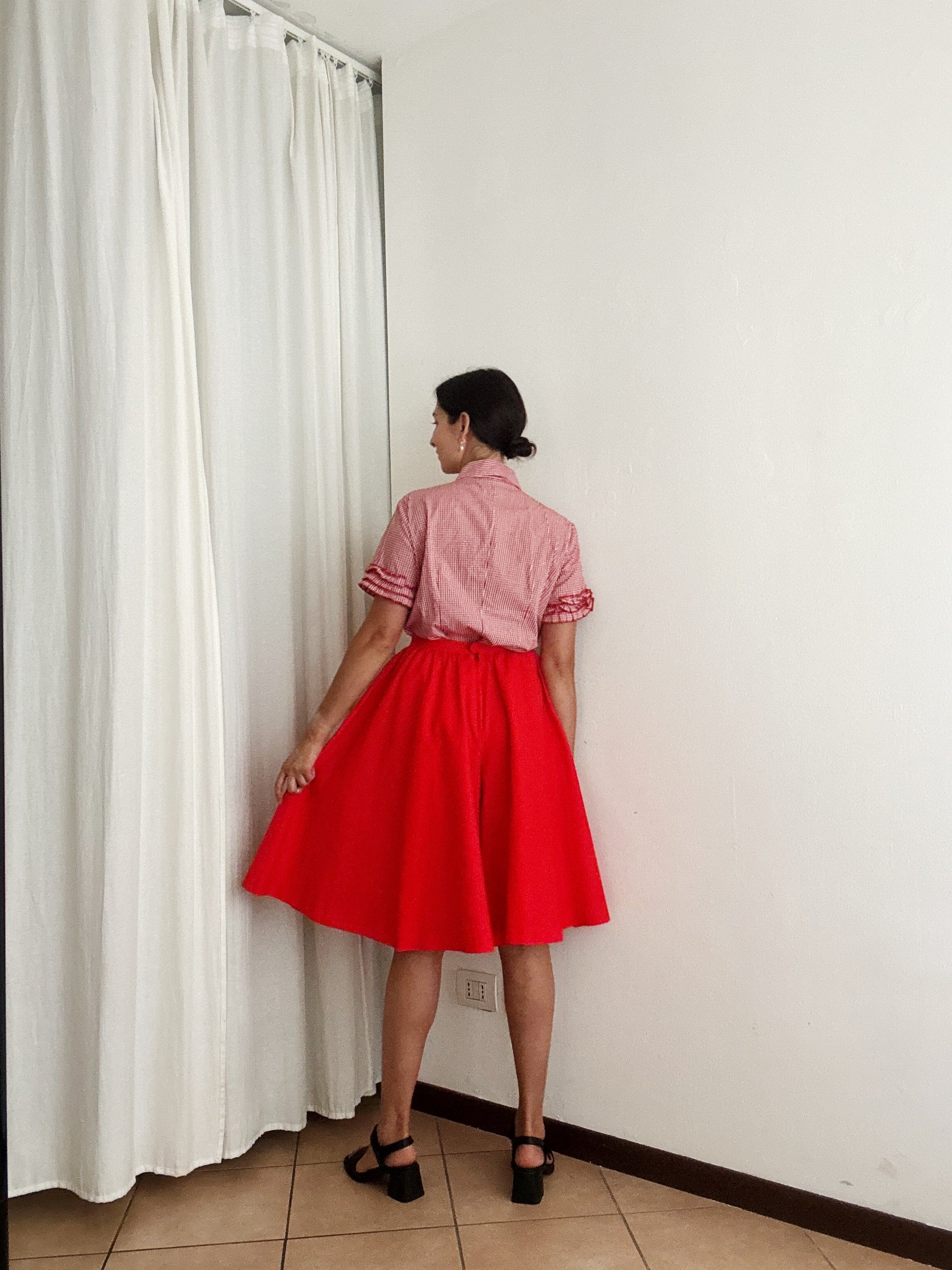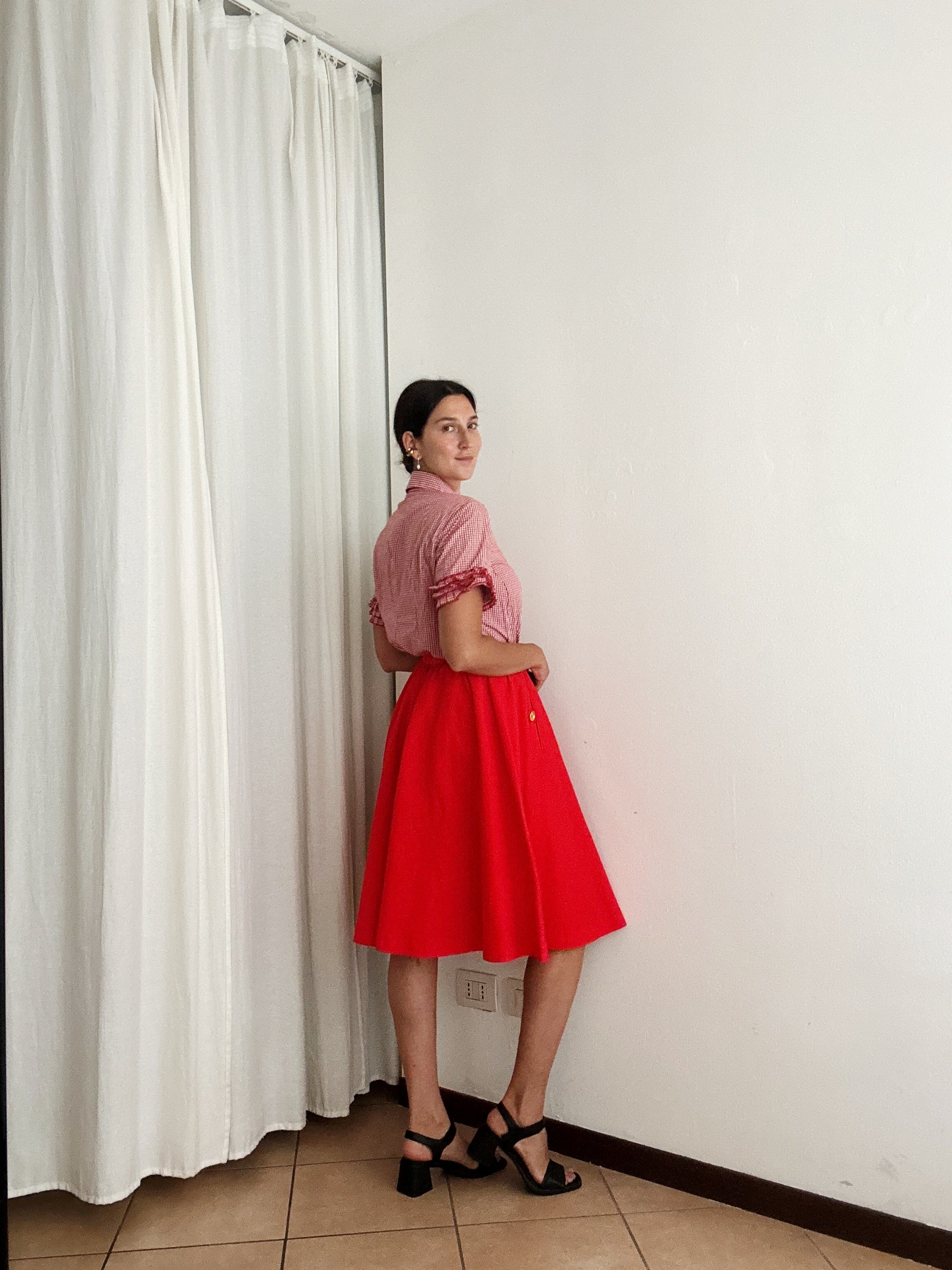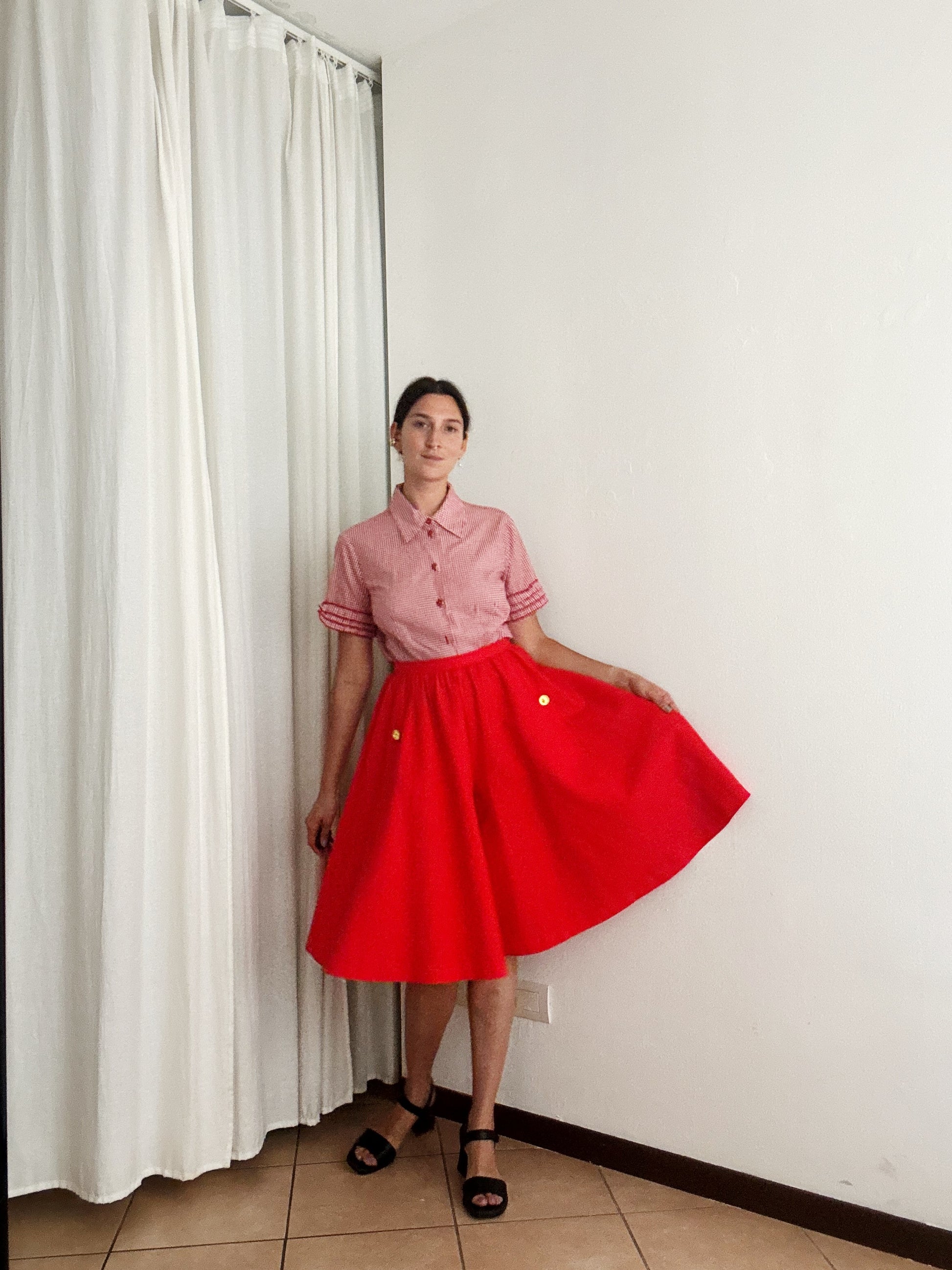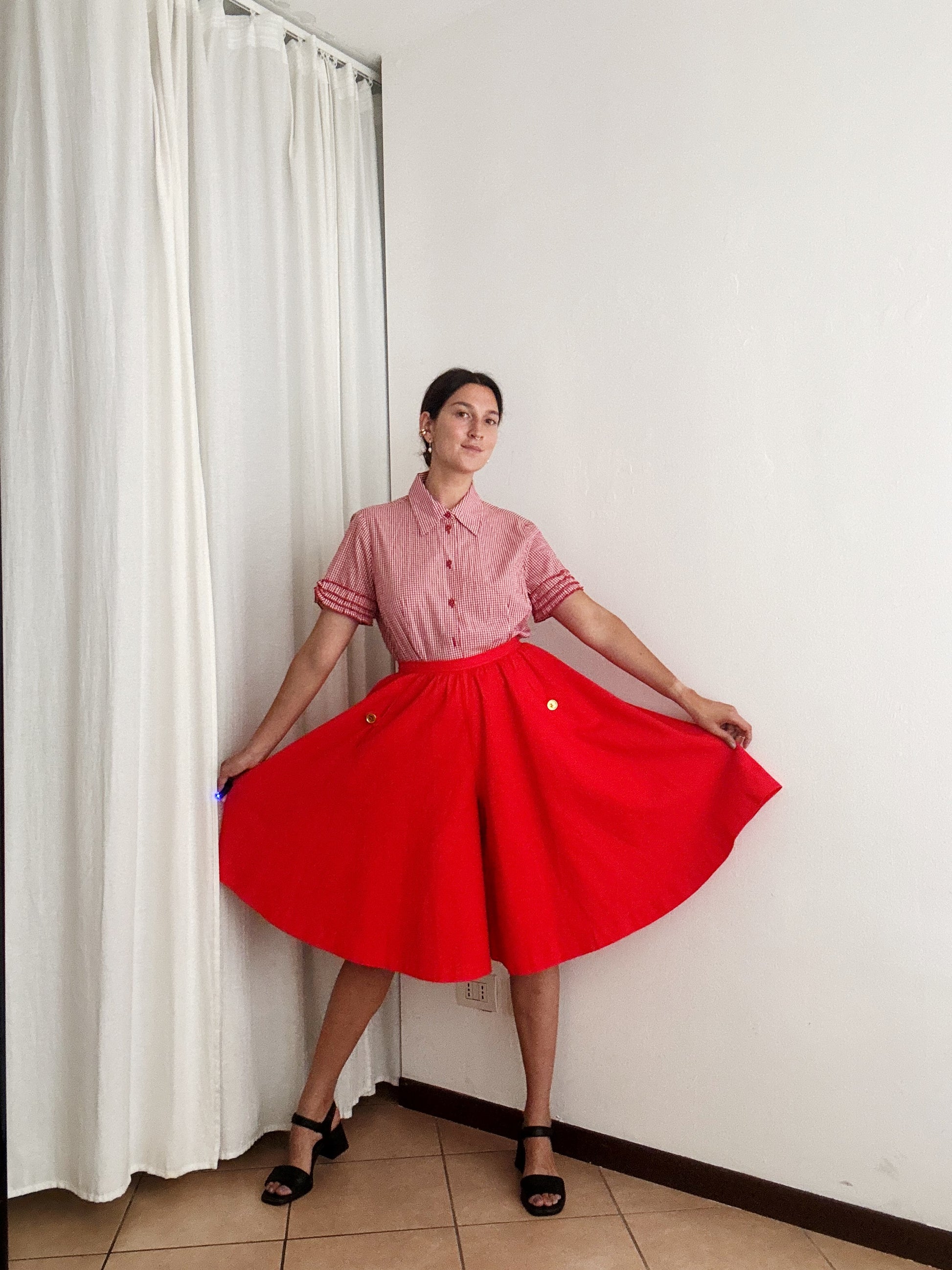 Meravigliosa gonna pantalone firmata Celine rossa ampissima, composizione non riportata ma direi cotone. Veste taglia 40/42. Misure: vita 35, lunghezza 66
