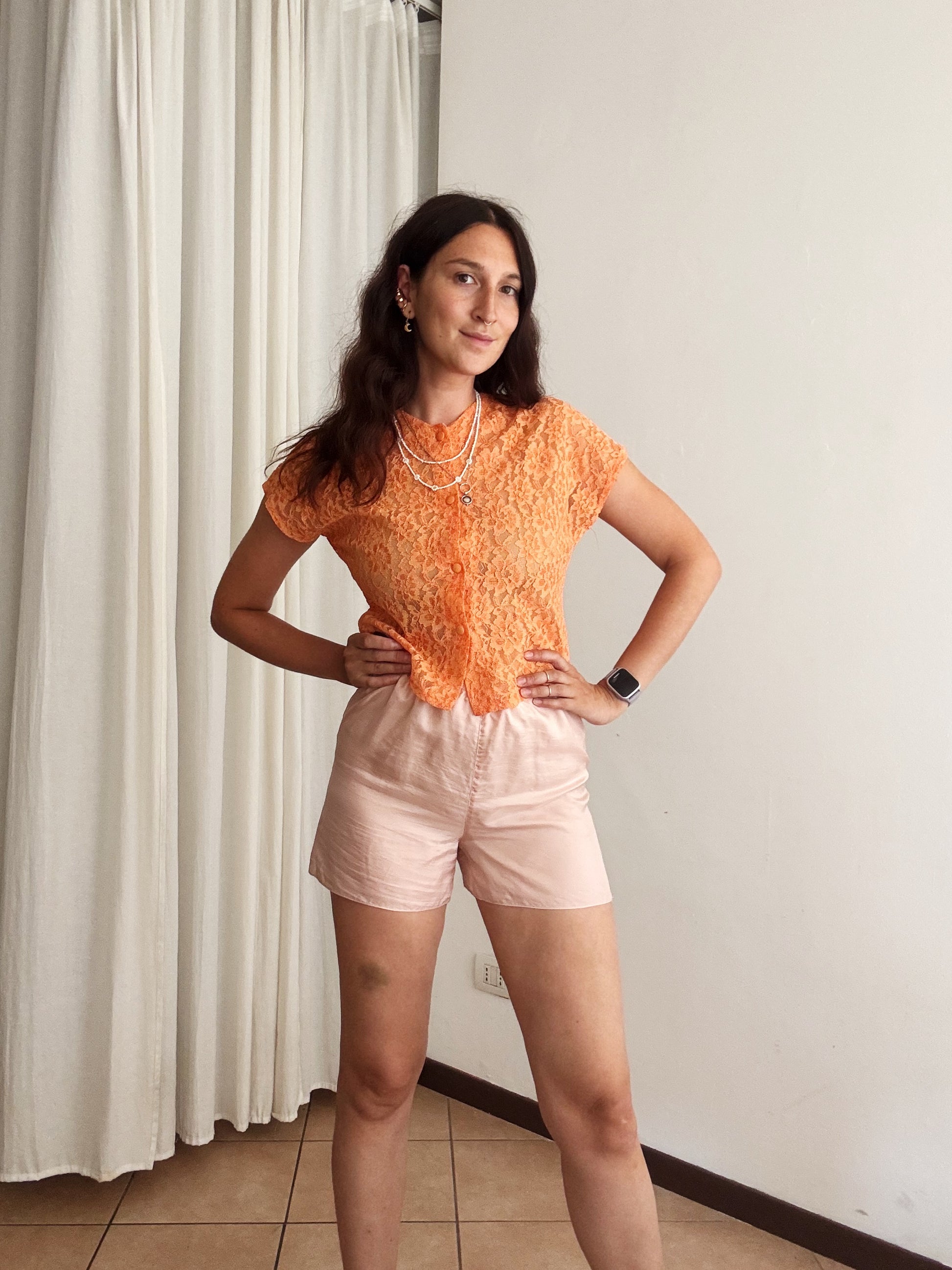 Pantaloncini in seta rosa firmati Tod’s taglia 40. Misure: vita 34-40, fianchi circa 48, cavallo 32
