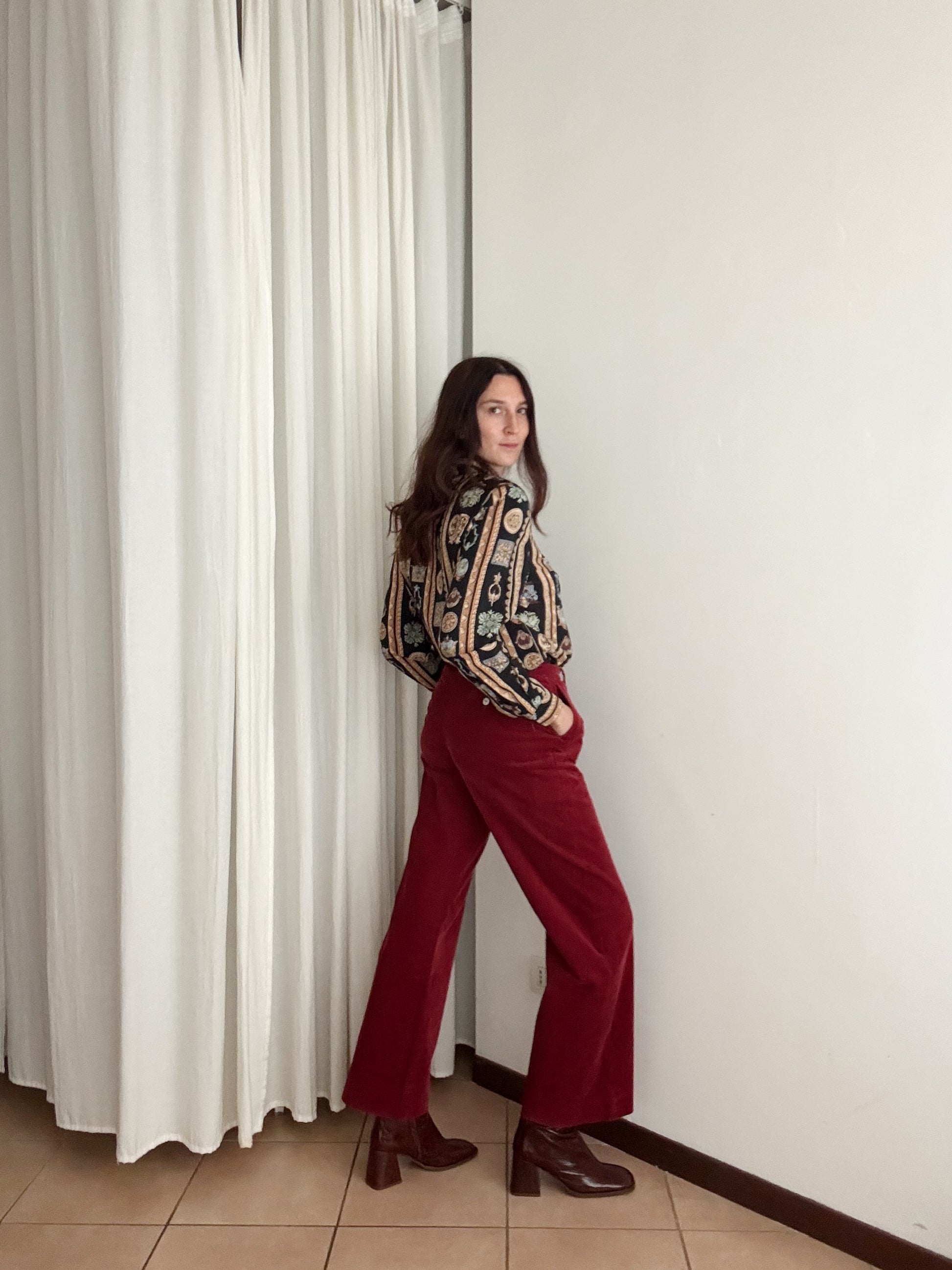 Pantaloni in velluto a costine bordeaux. Misure: vita 37, fianchi 49, cavallo 39-32, coscia 30, gamba dal cavallo 78