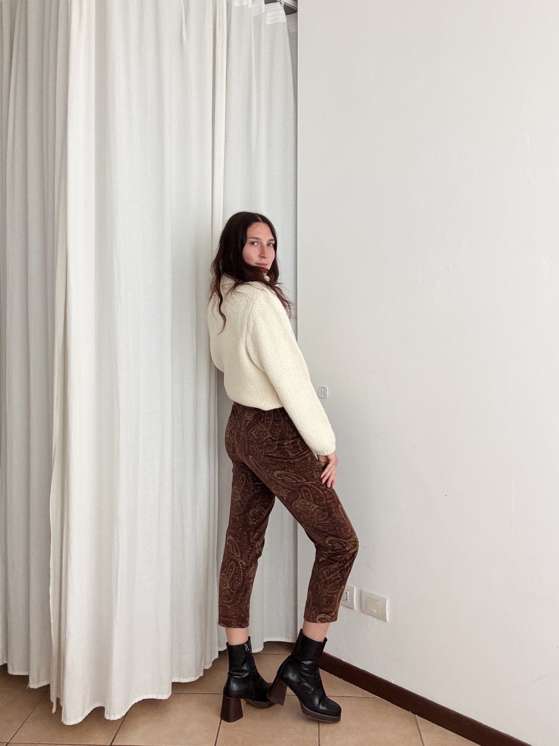 Pantaloni in velluto nei toni del marrone con stampa pasley. Misure: vita 34, fianchi 48, cavallo 33, coscia 27, gamba dal cavallo 66
