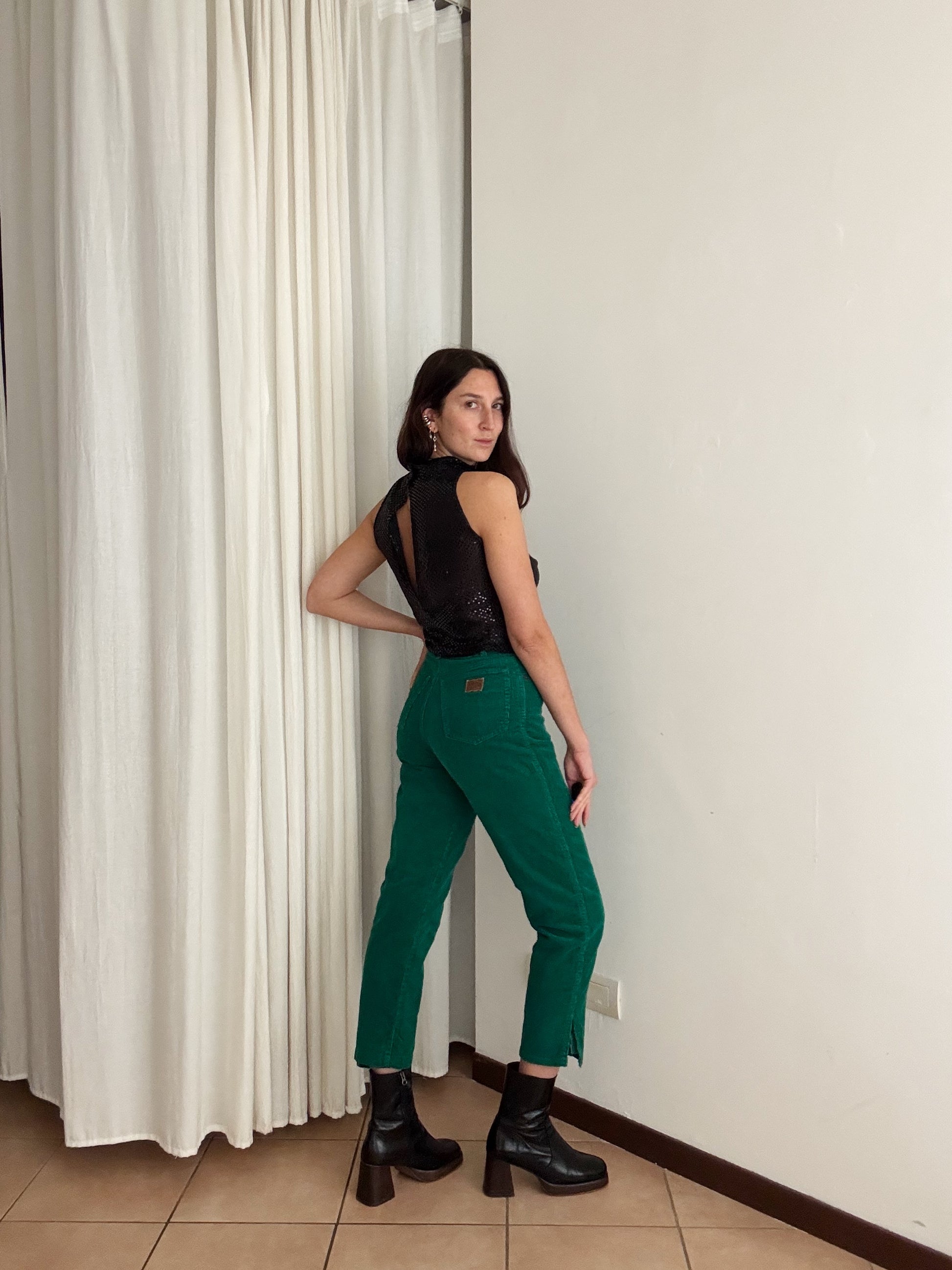Pantaloni in velluto a costine verdi. Misure: vita 31, fianchi 49, cavallo 31-33, coscia 29, gamba dal cavallo 69