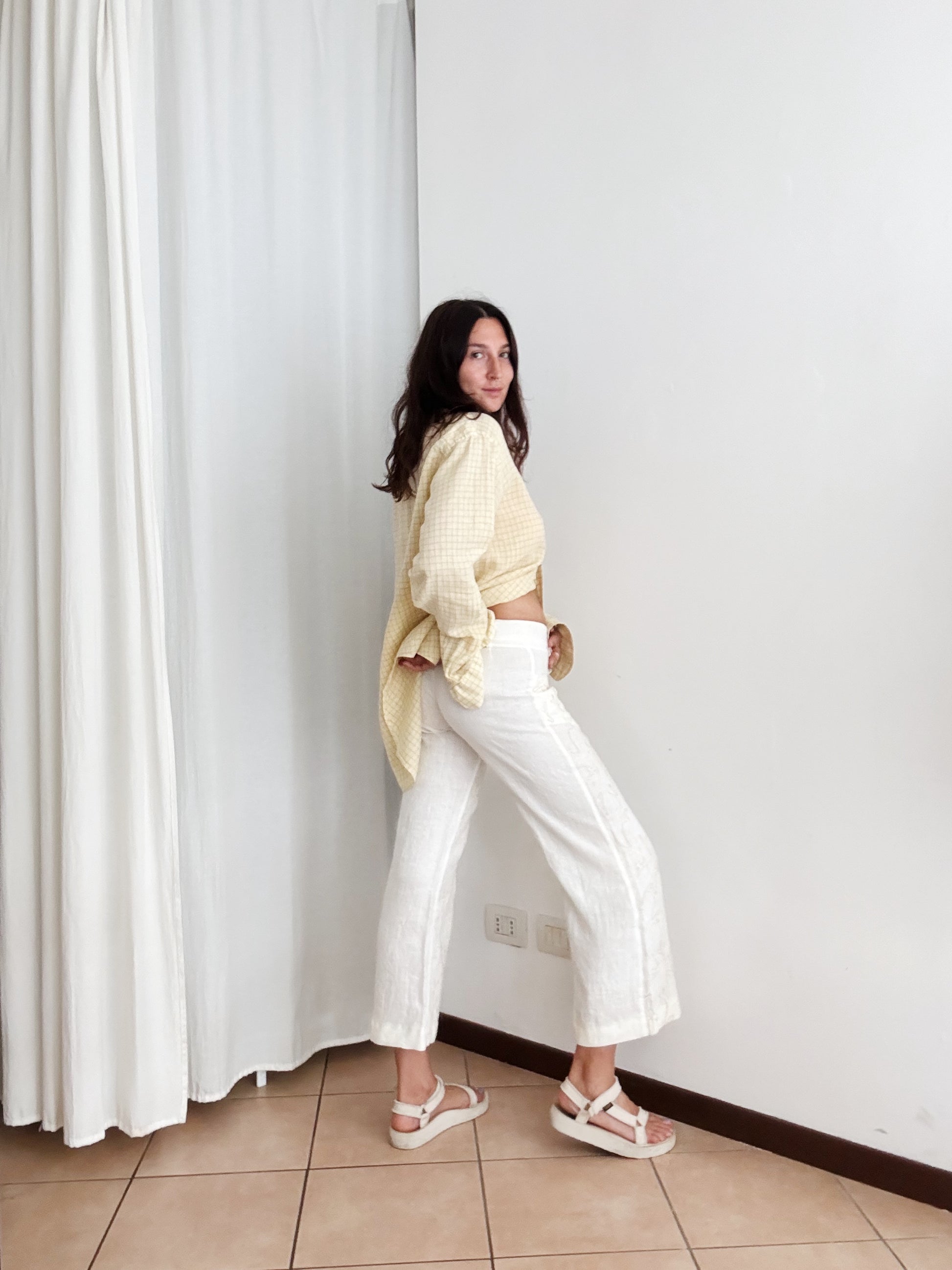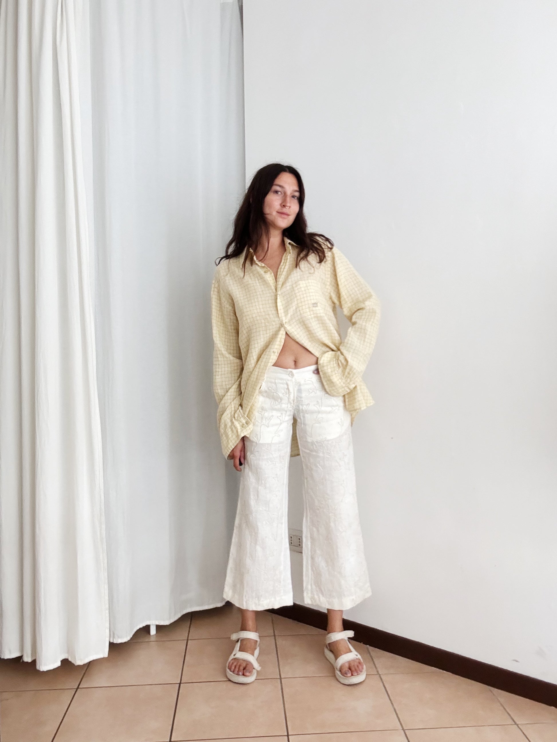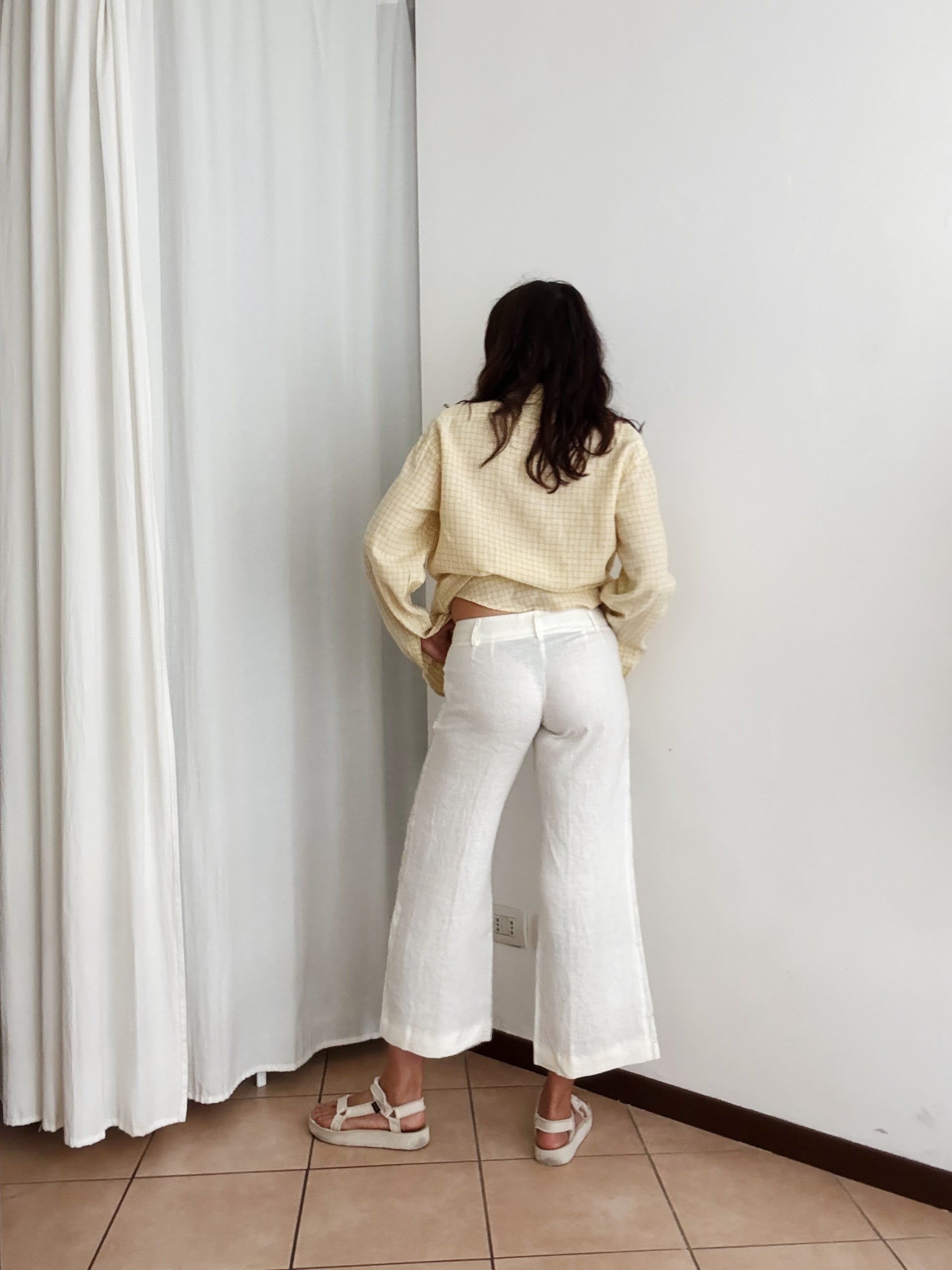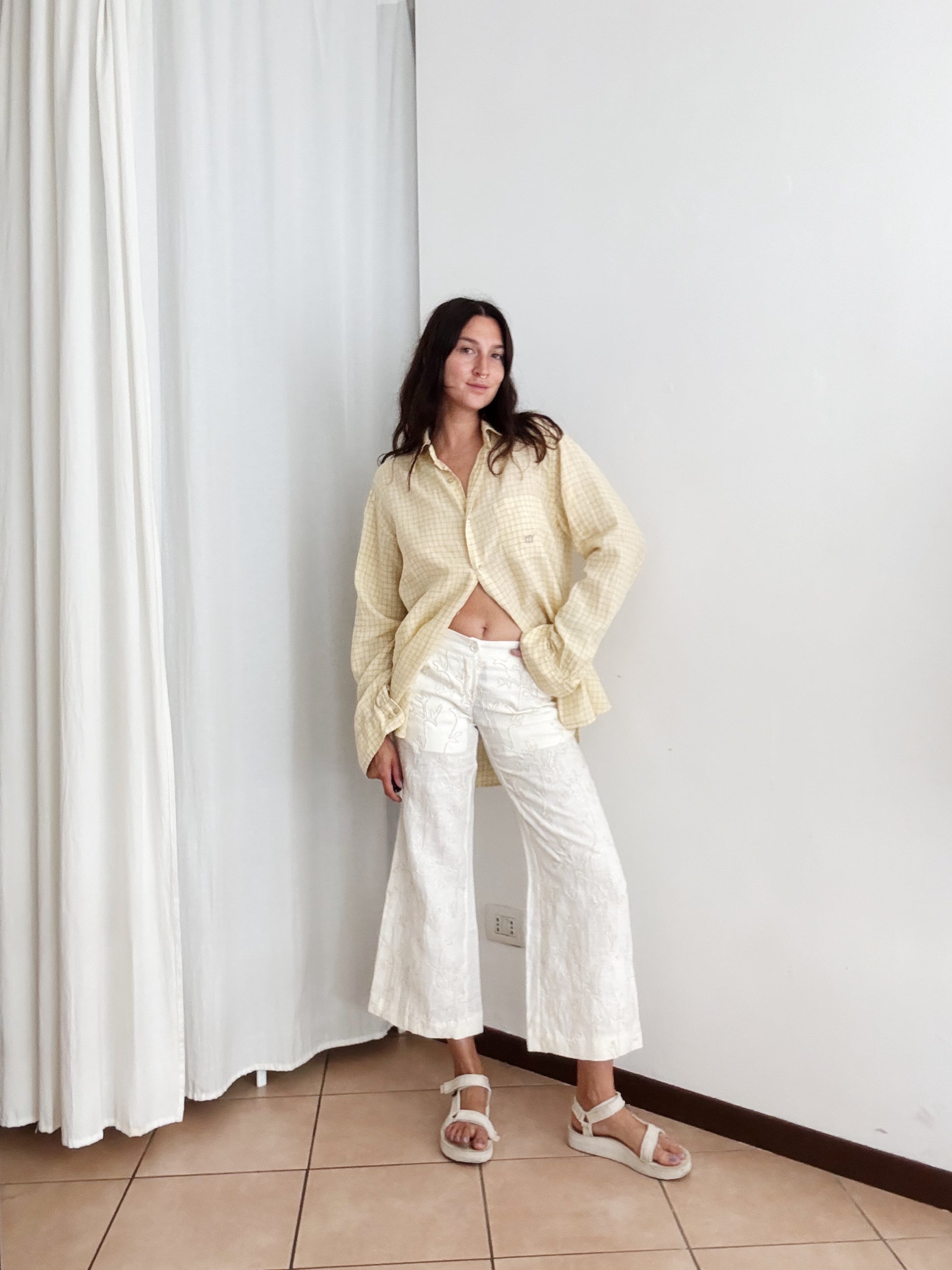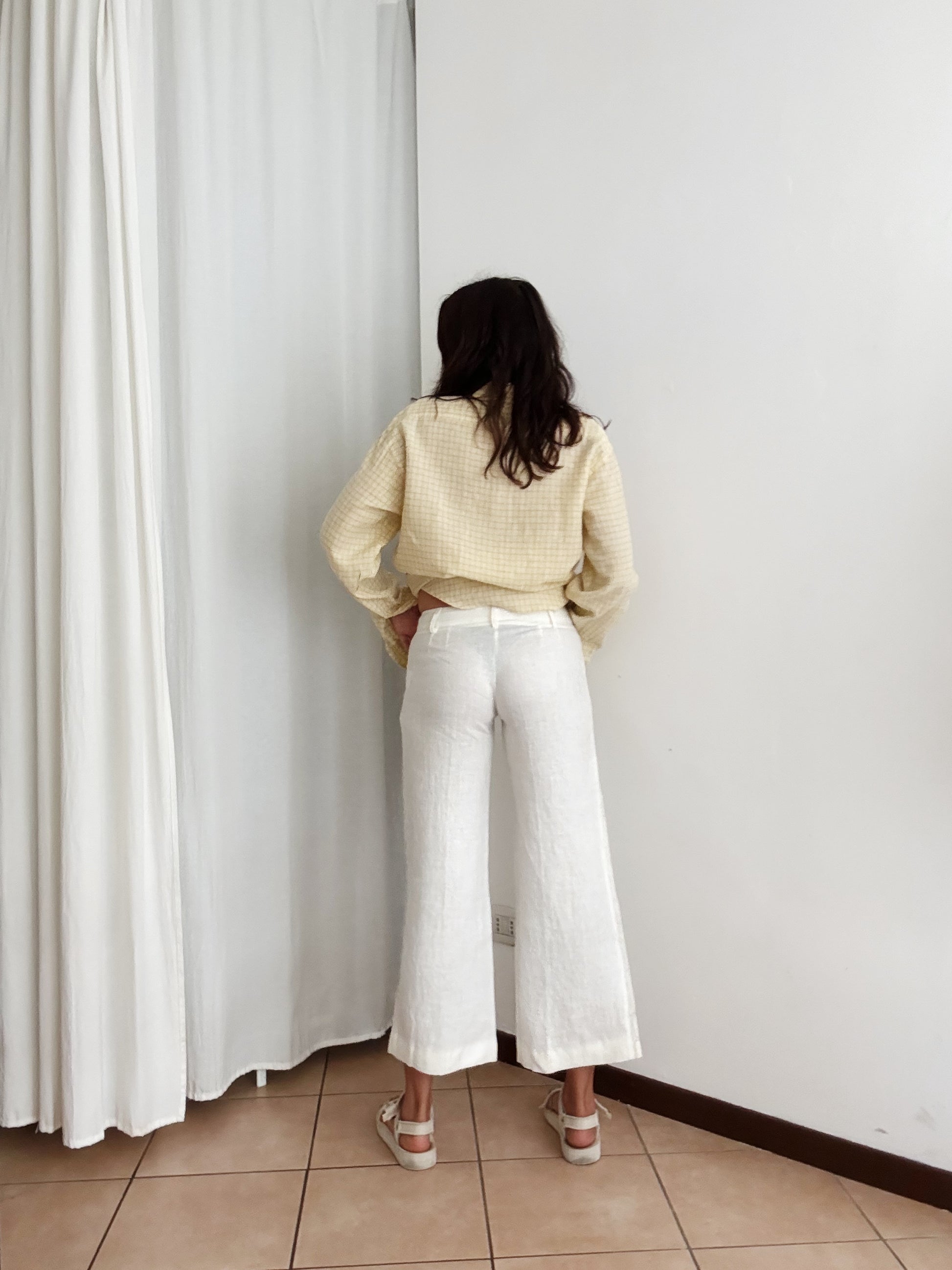 Pantaloni in lino bianco avorio, riportano taglia 42 ma vestono meglio 40. Ricami sul davanti. Misure: vita 39, fianchi 47, cavallo 24/28, coscia 30, gamba dal cavallo 70