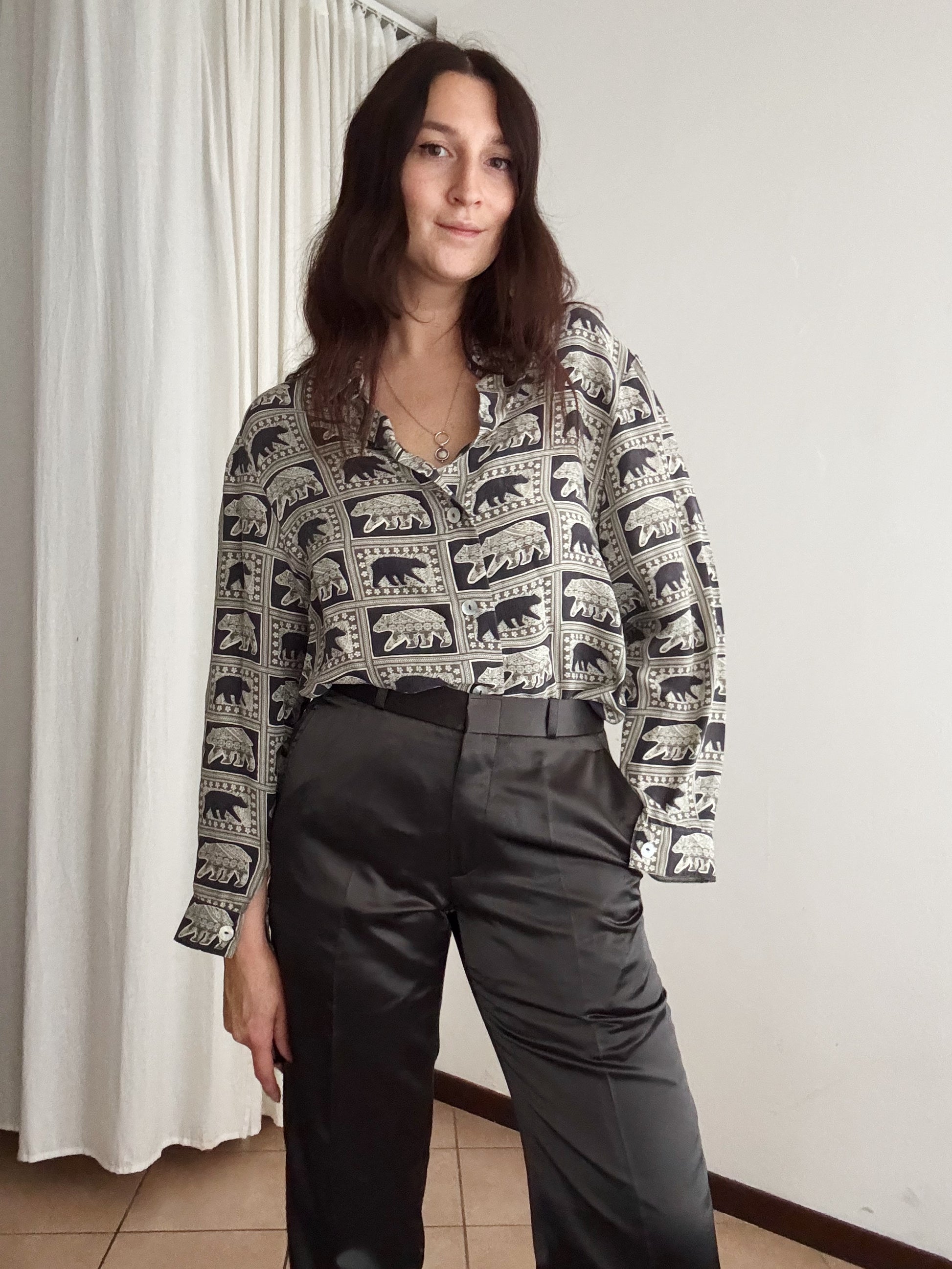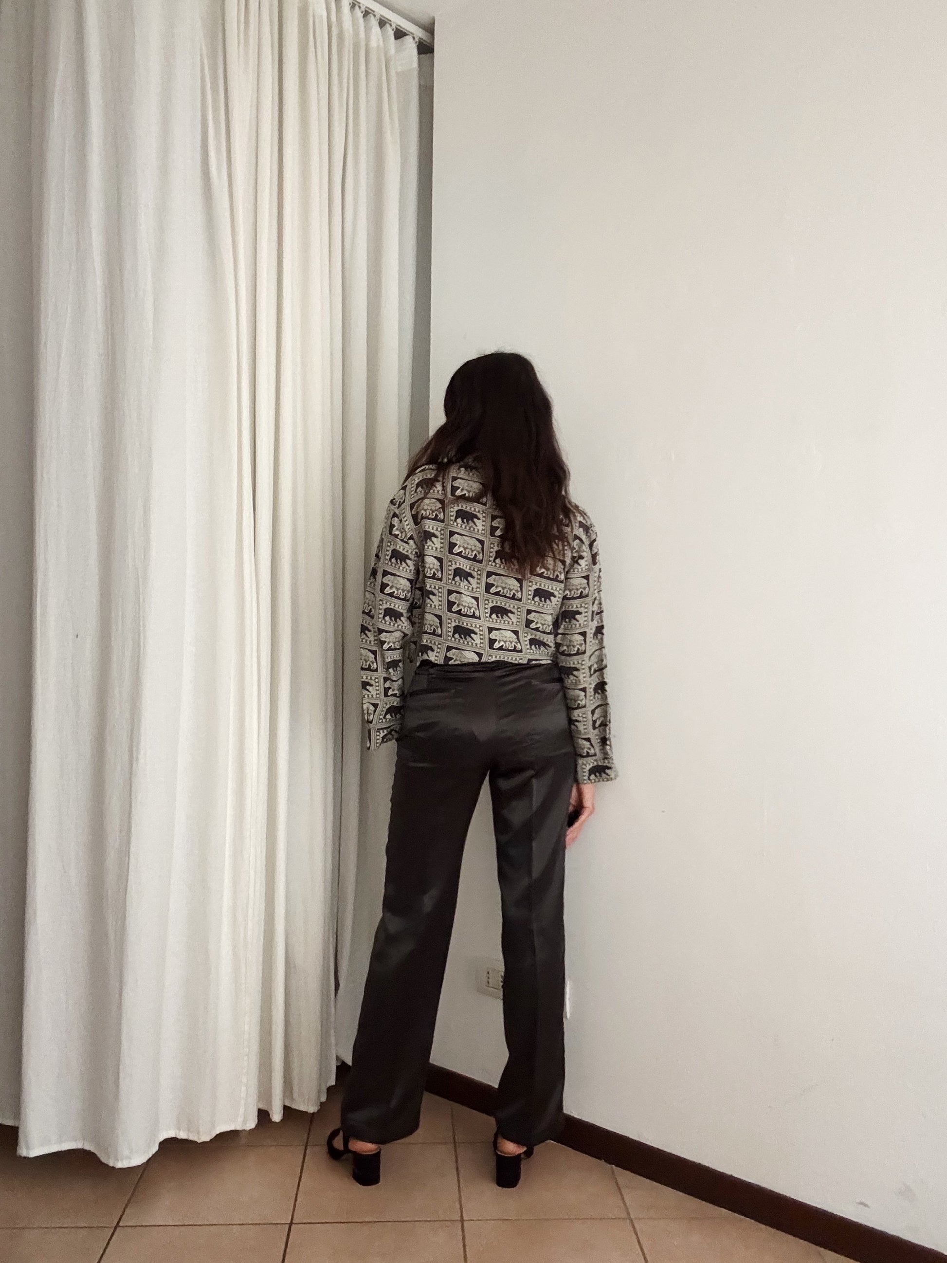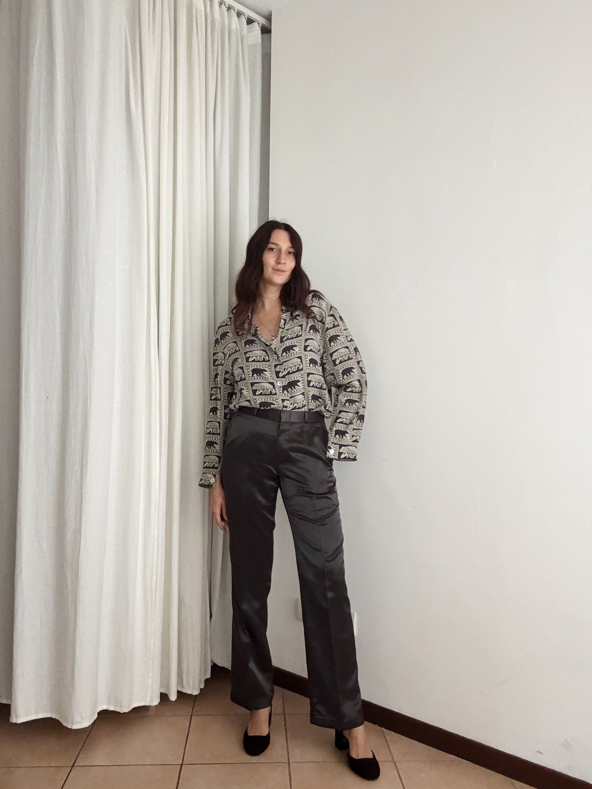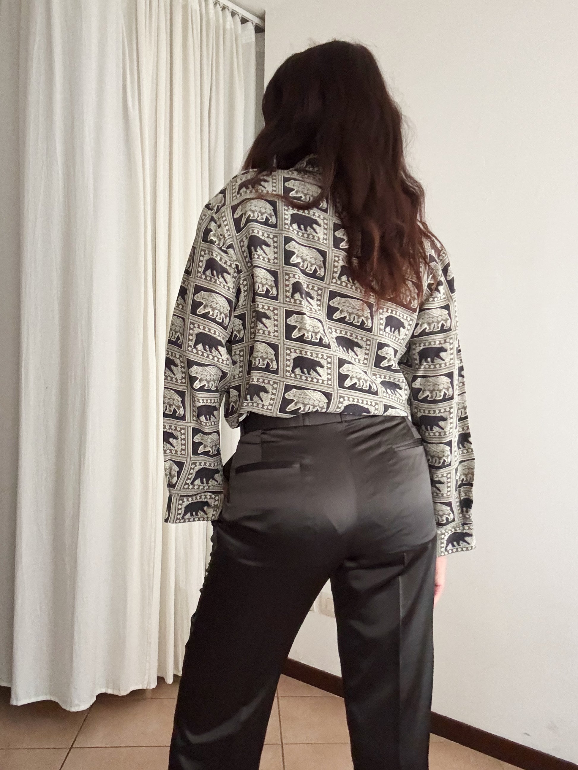 Pantaloni vintage sartoriali in raso, vestono taglia 44 Misure in piano: vita 39, fianchi 59, cavallo 30-33, coscia 27, gamba dal cavallo 82.