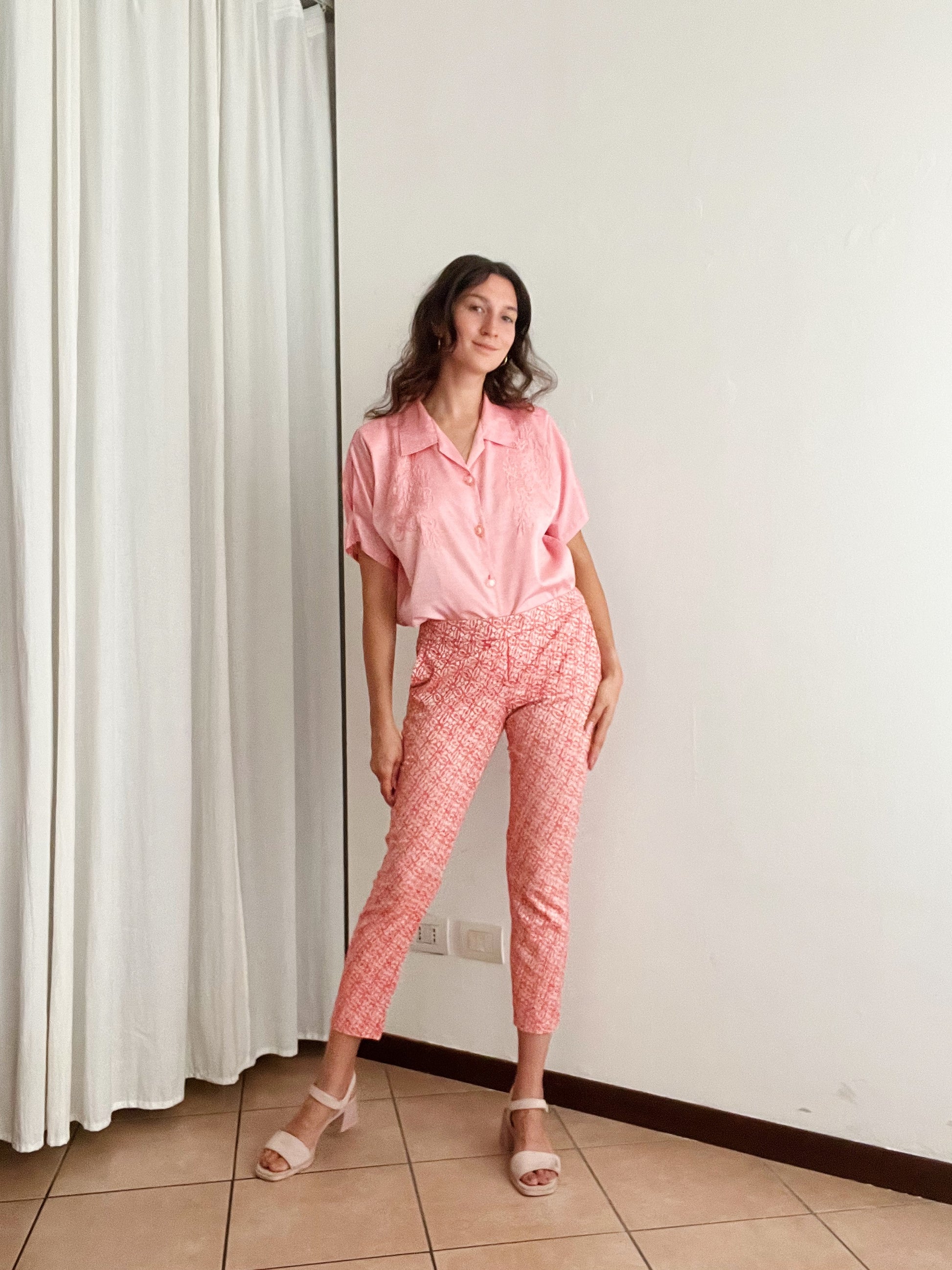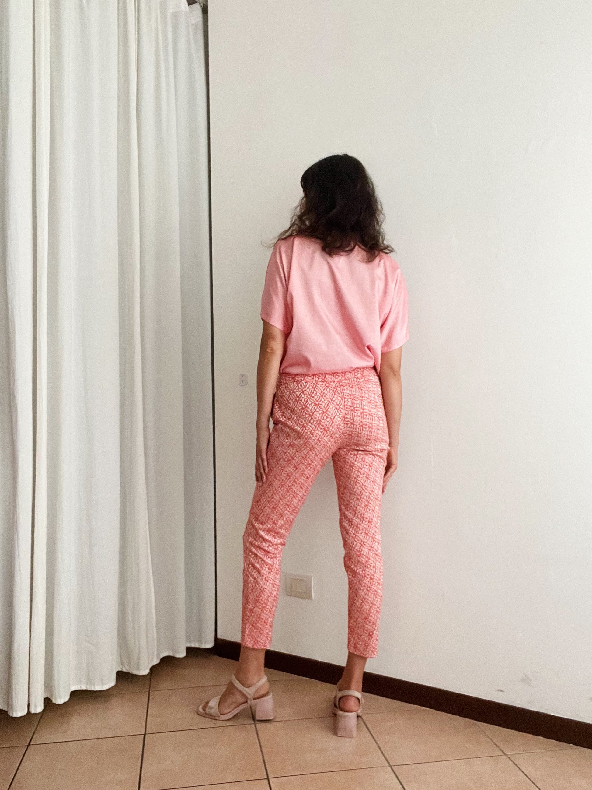 Pantaloni Marella rosa salmone taglia 42. Vita media/all’ombelico. Vita 39, fianchi 48, cavallo 25/30, coscia 27, lunghezza 68. Tessuto leggermente elasticizzato