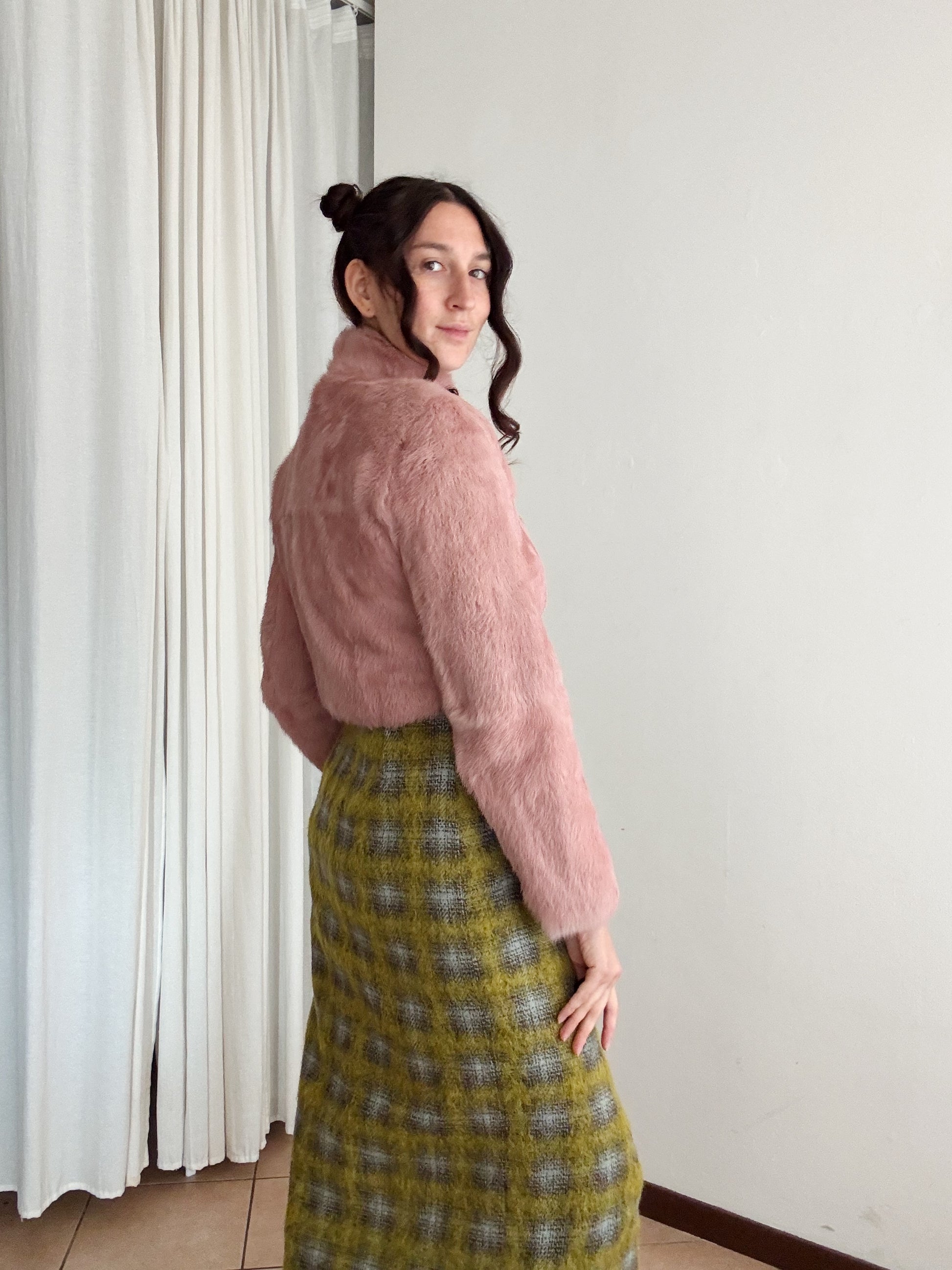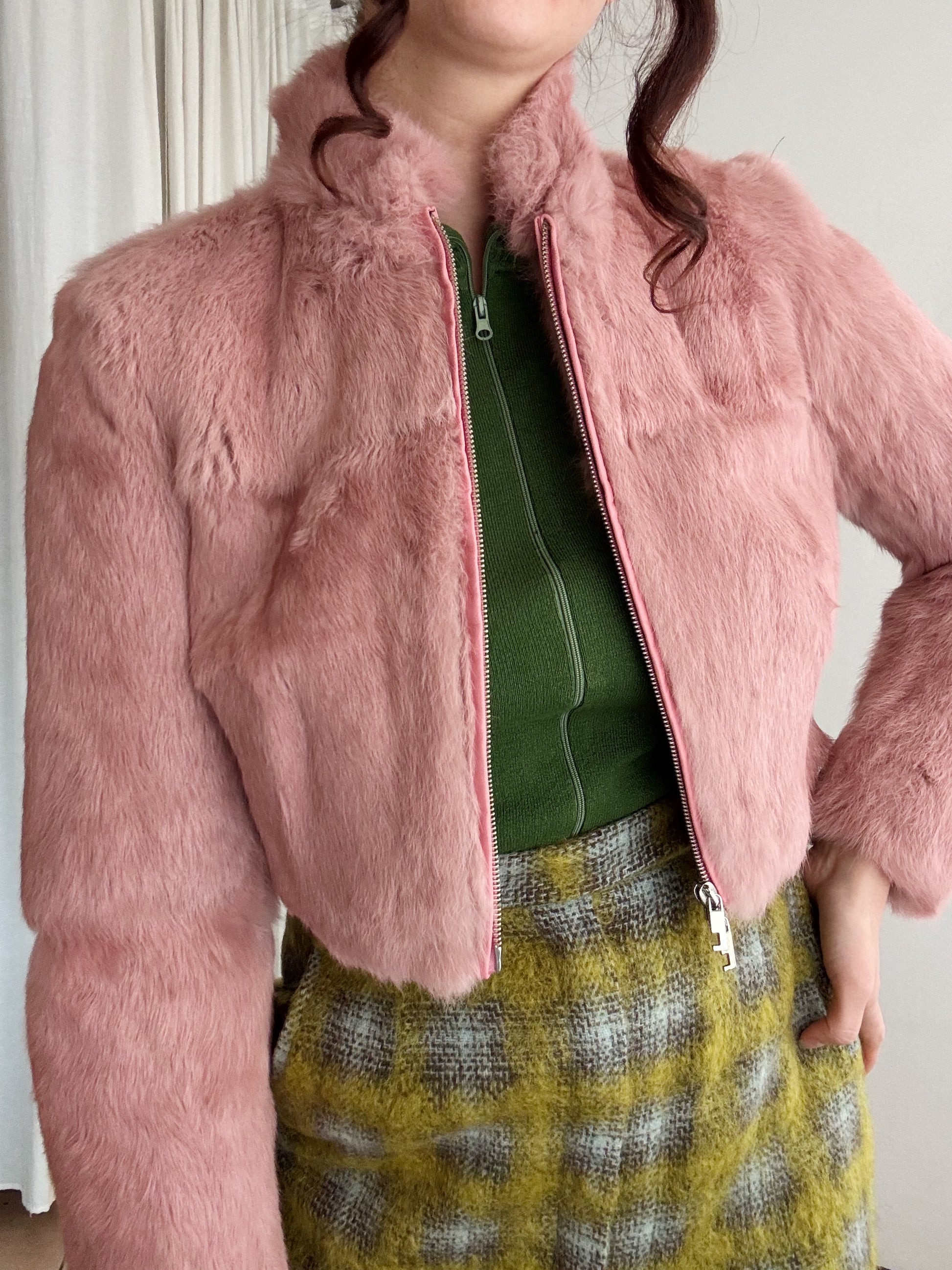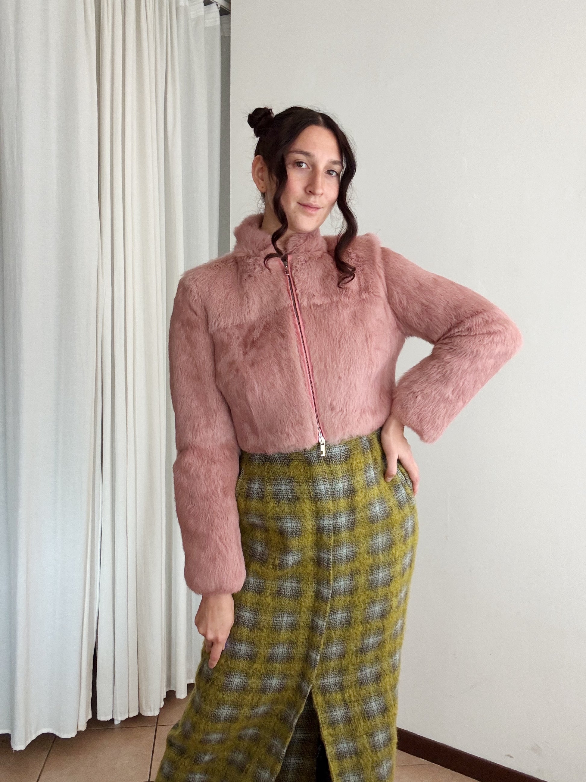 Pelliccia orta rosa in lapin, riporta taglia L ma veste meglio fino a una 44 per non limitare i movimenti.