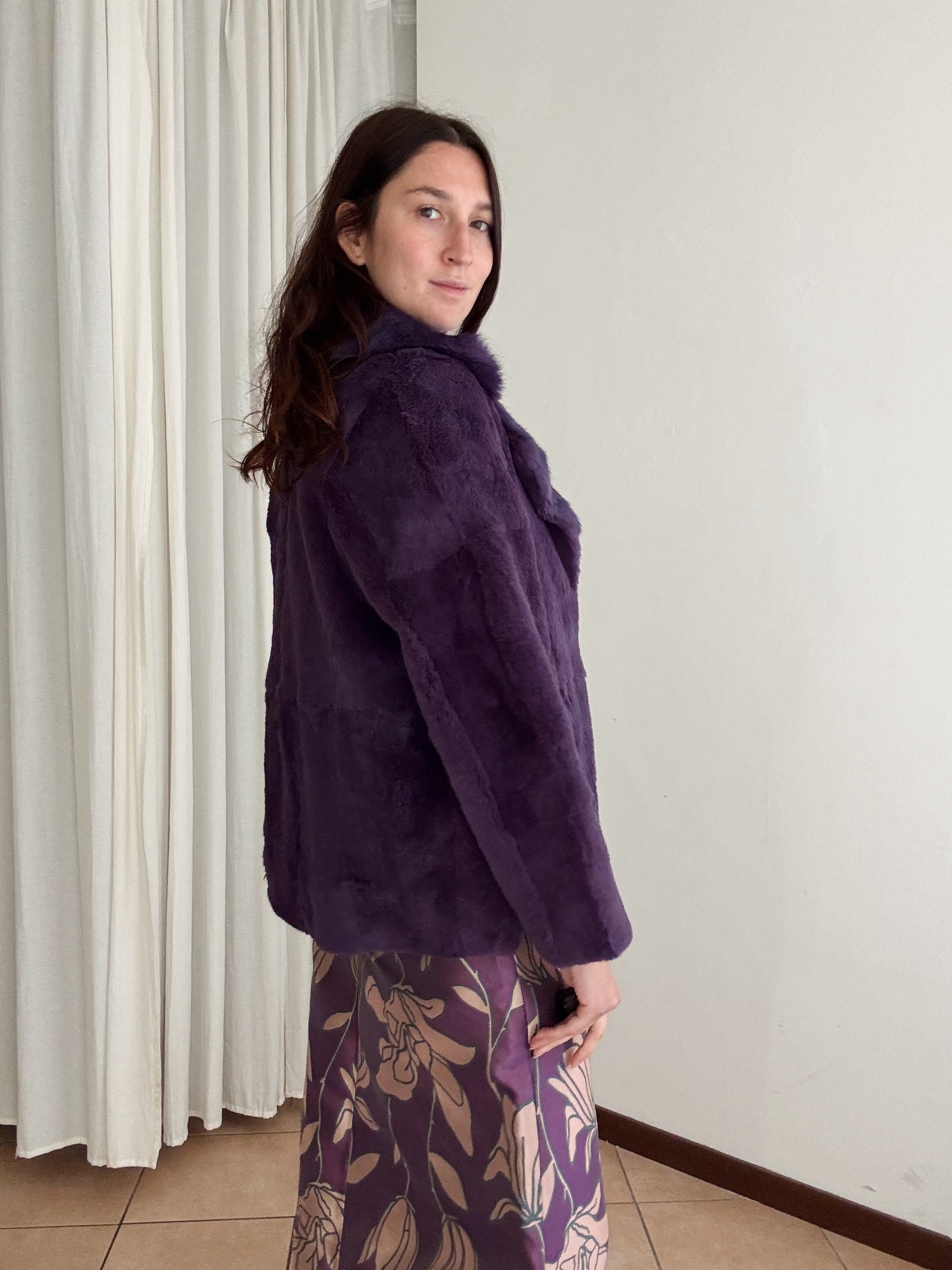 Pelliccia vintage viola in lapin, riporta taglia XL ma veste meglio fino a una L.
