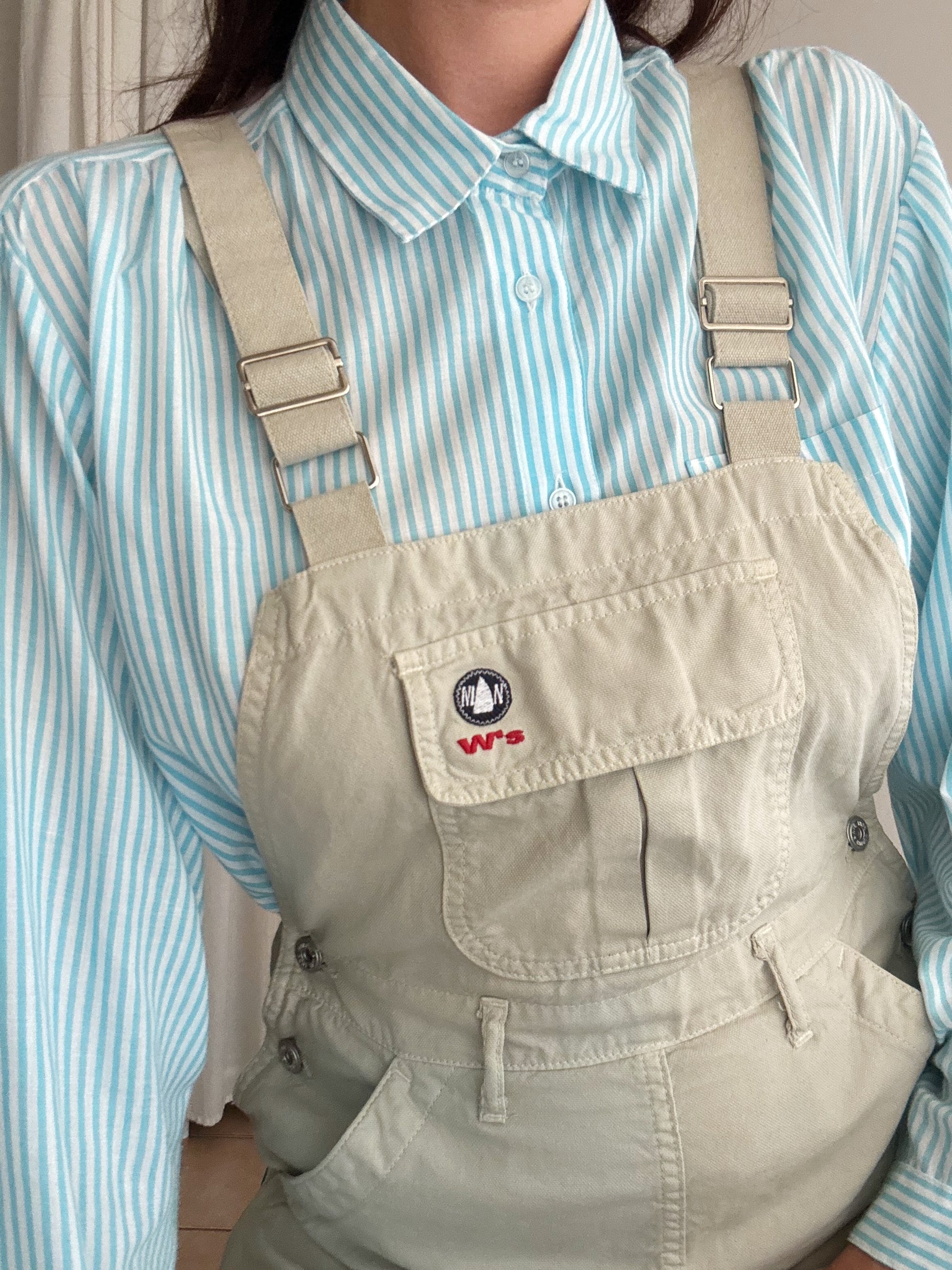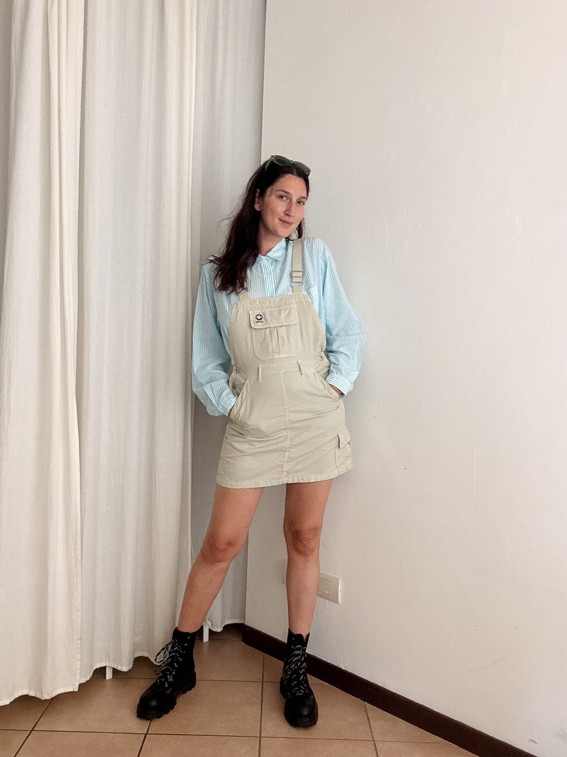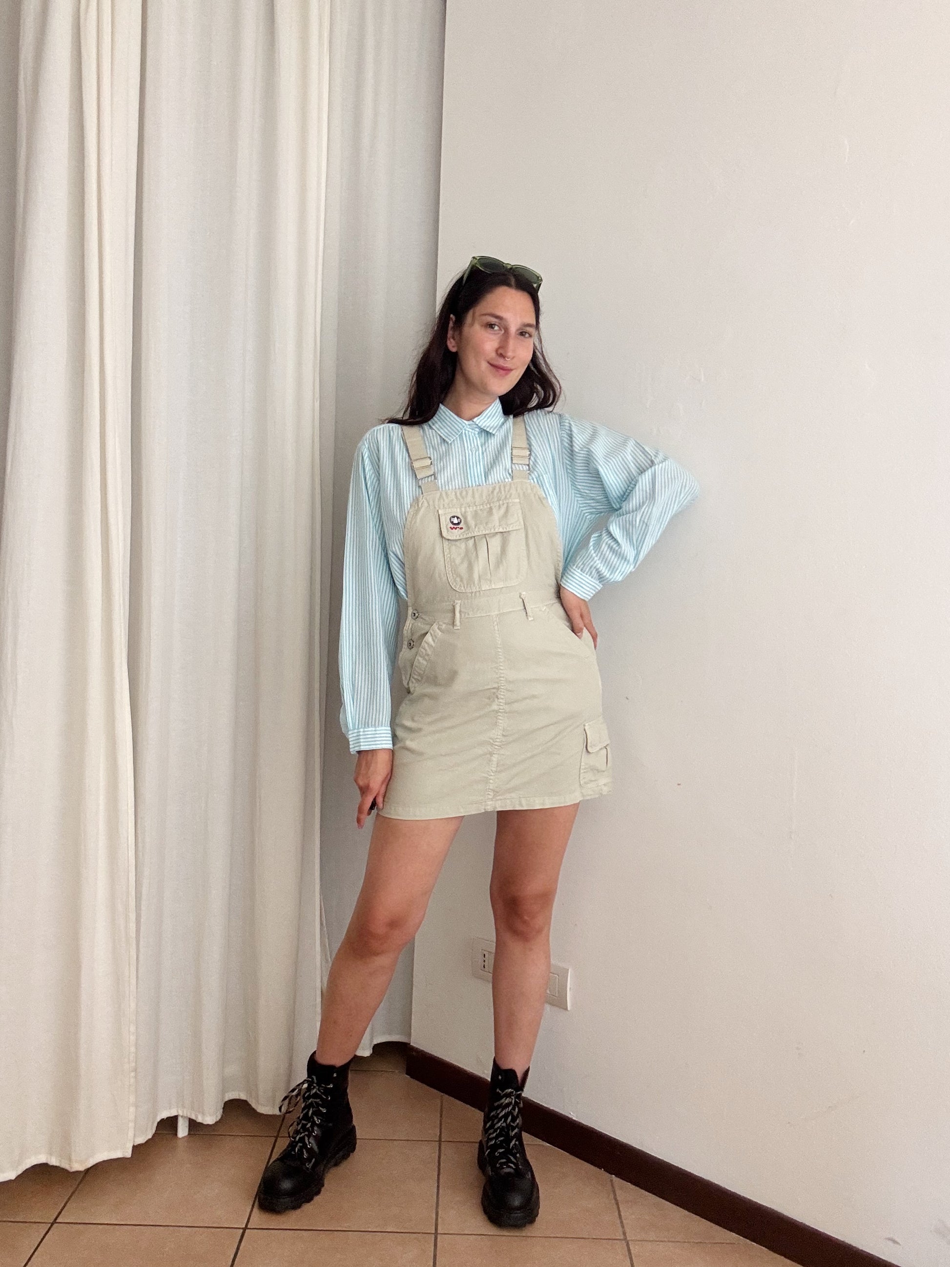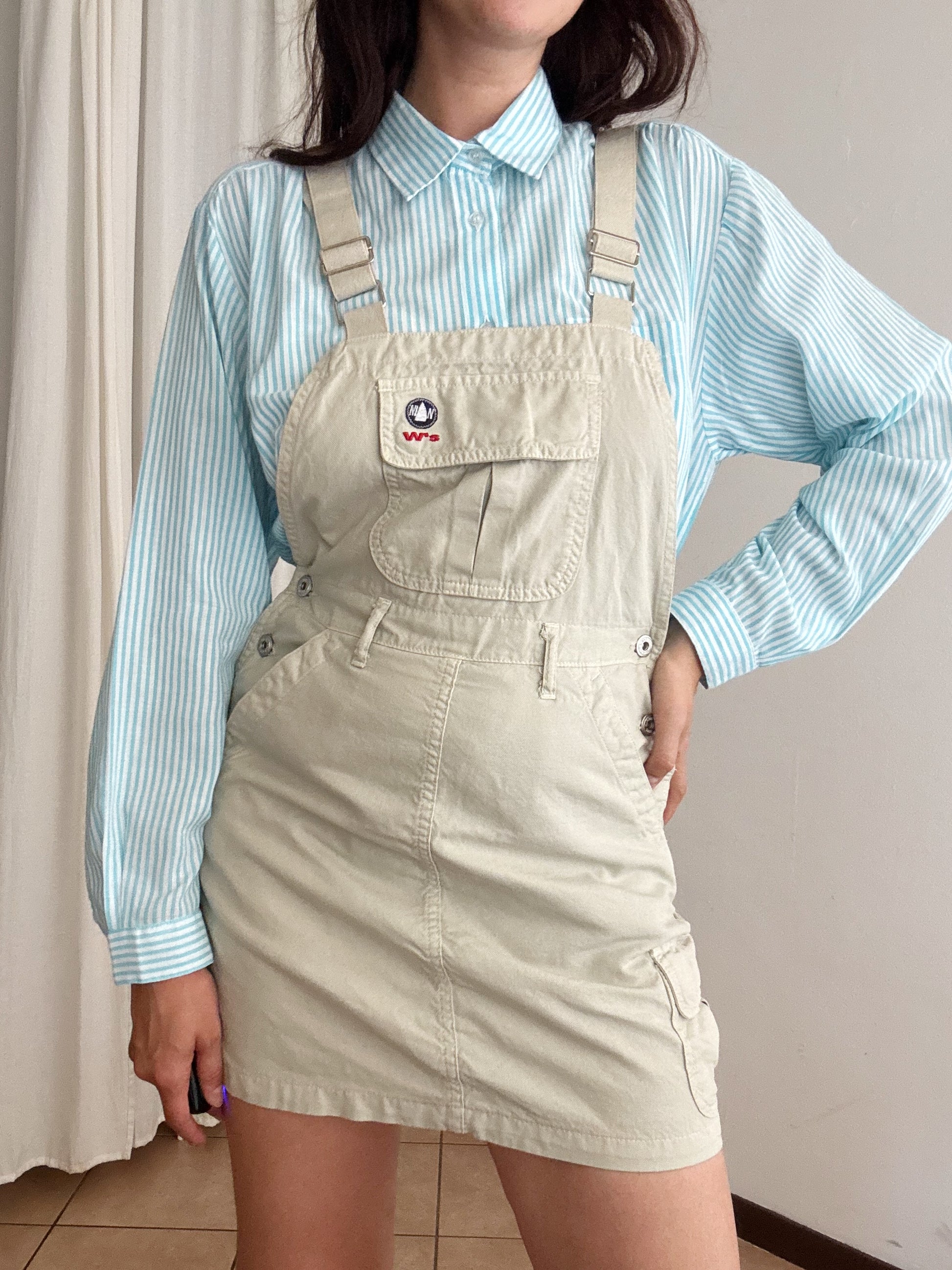 Salopette con gonna beige taglia 29, veste fino a una 42. Elastico sul retro. Misure: vita 35-38
