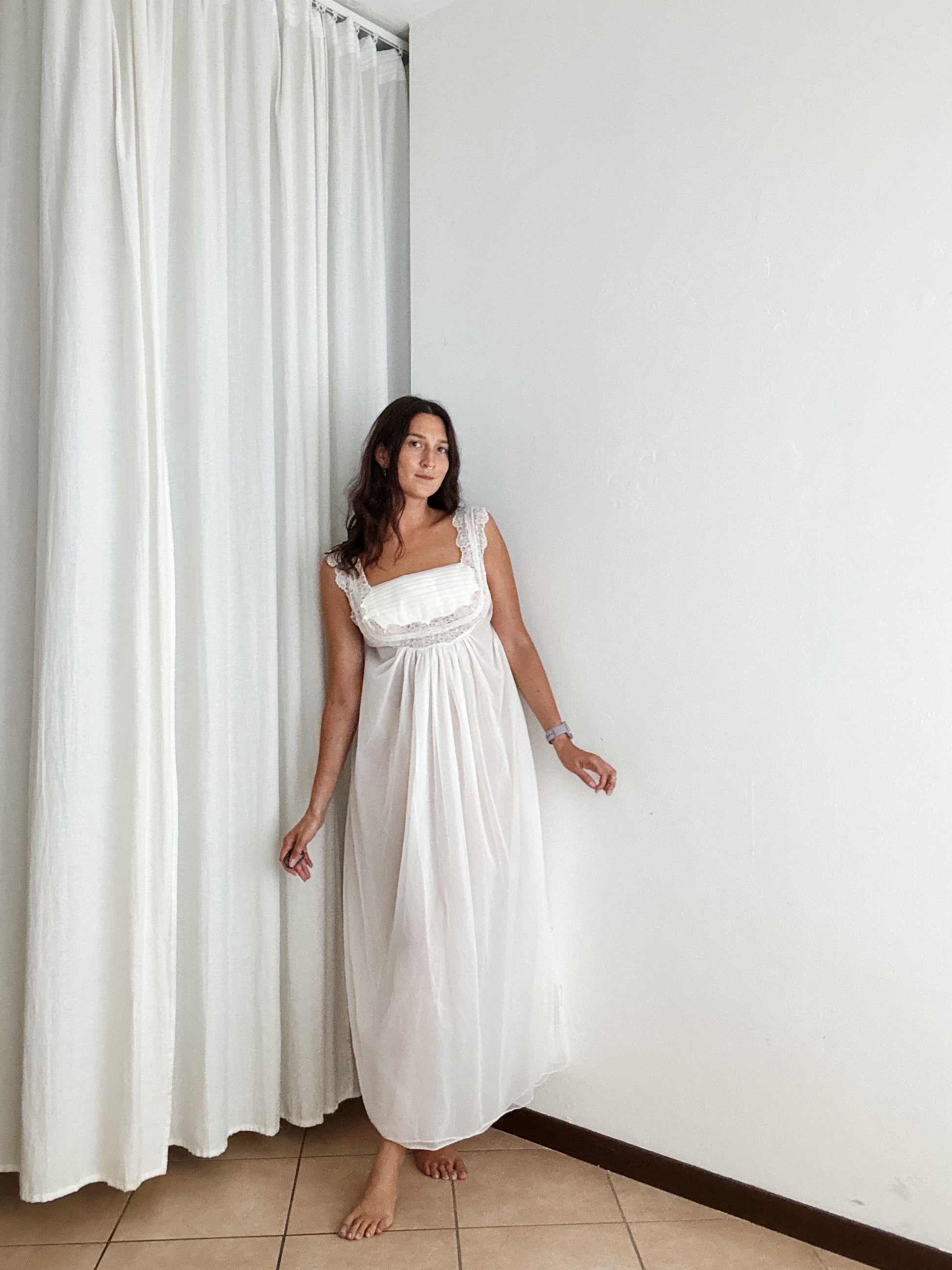 Abito sottoveste vintage bianco con pizzo. Riporta taglia 48 ma veste meglio fino a una taglia M. Misure: ascelle 44, lunghezza 130.