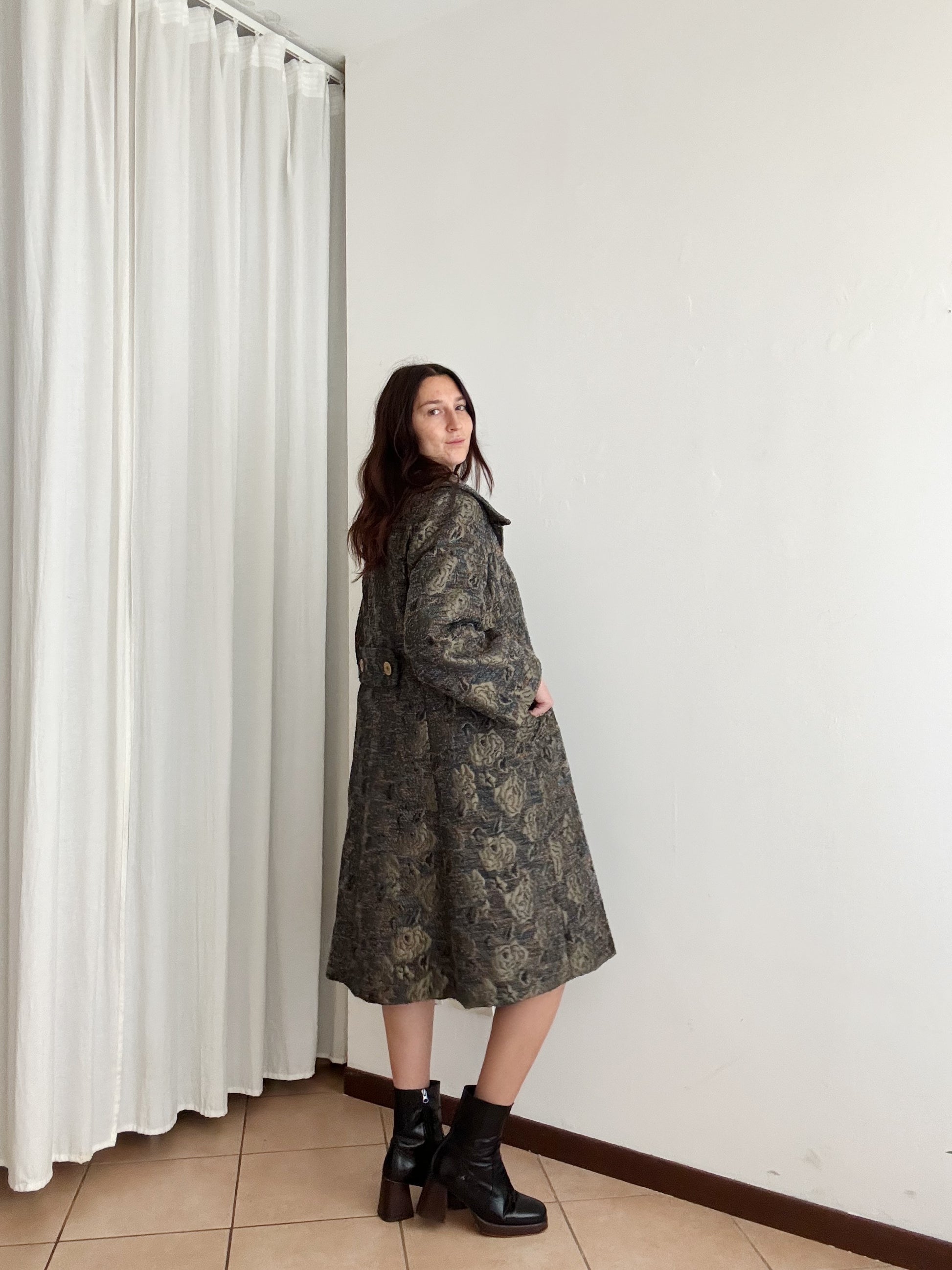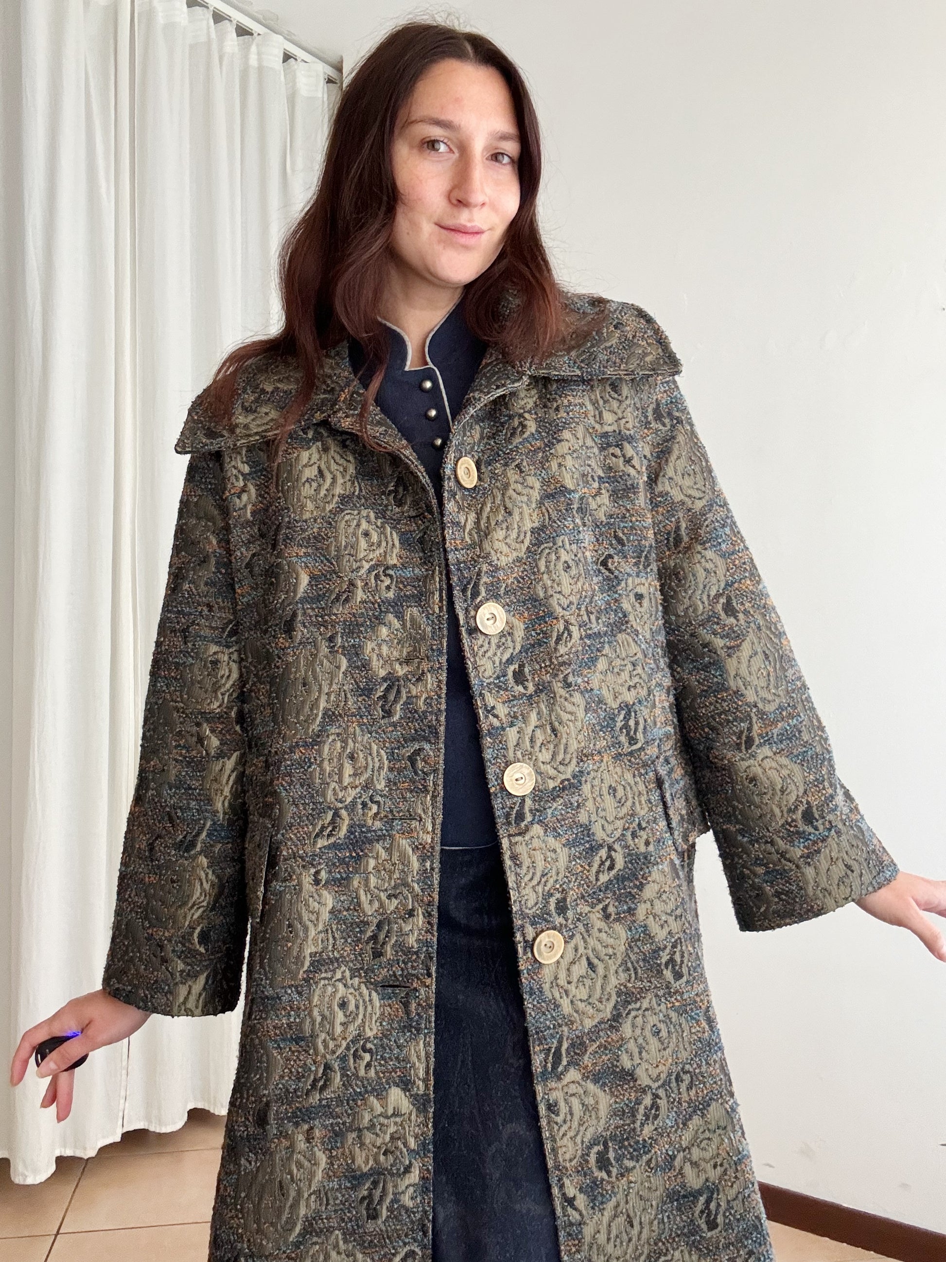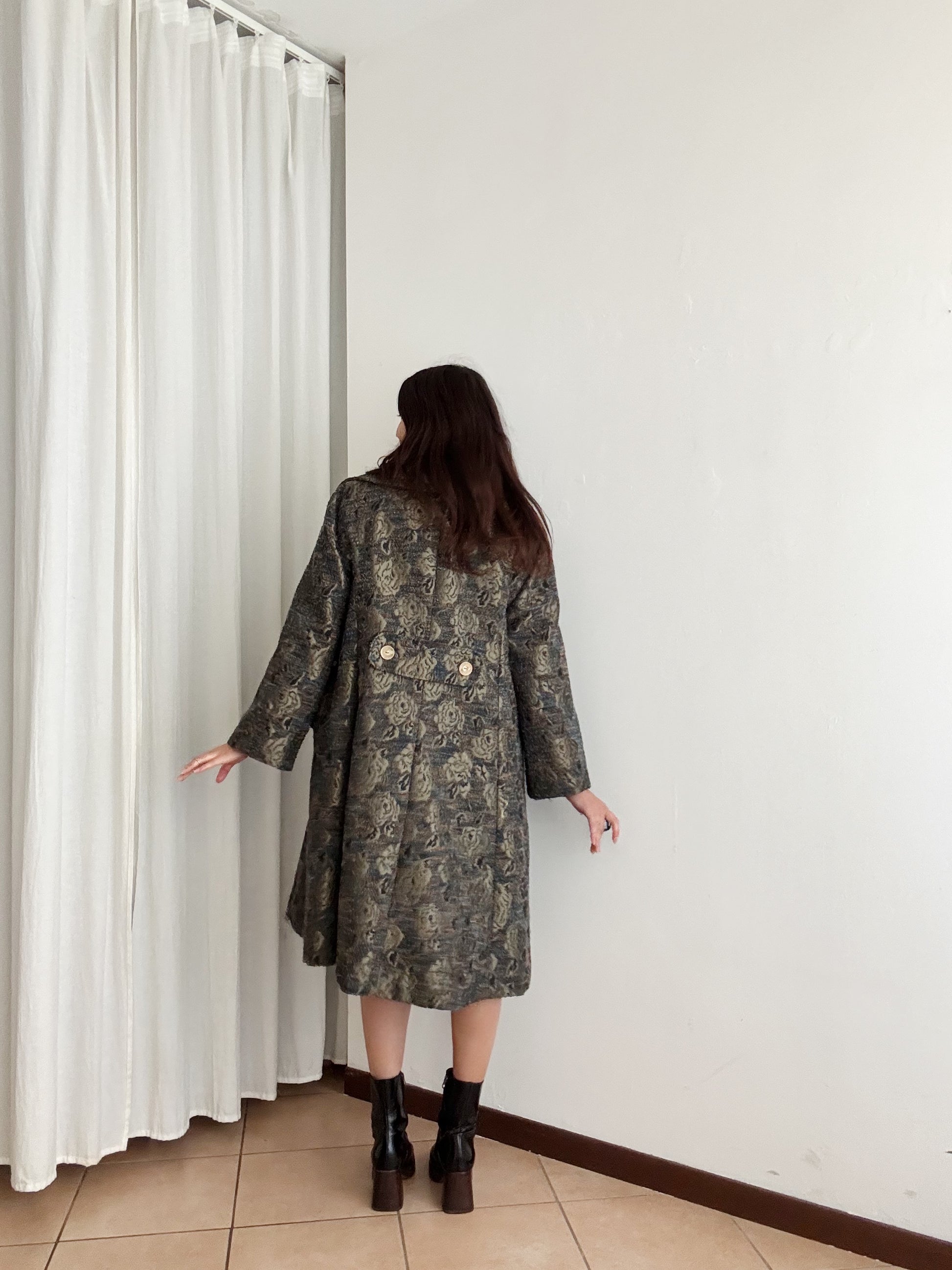 Spolverino vintage sartoriale in tessuto boucle e raso. Taglia non riportata ma veste fino a una L. Misure: spalle 49, ascelle 60 cm in piano, maniche 58. lunghezza 105 cm.
