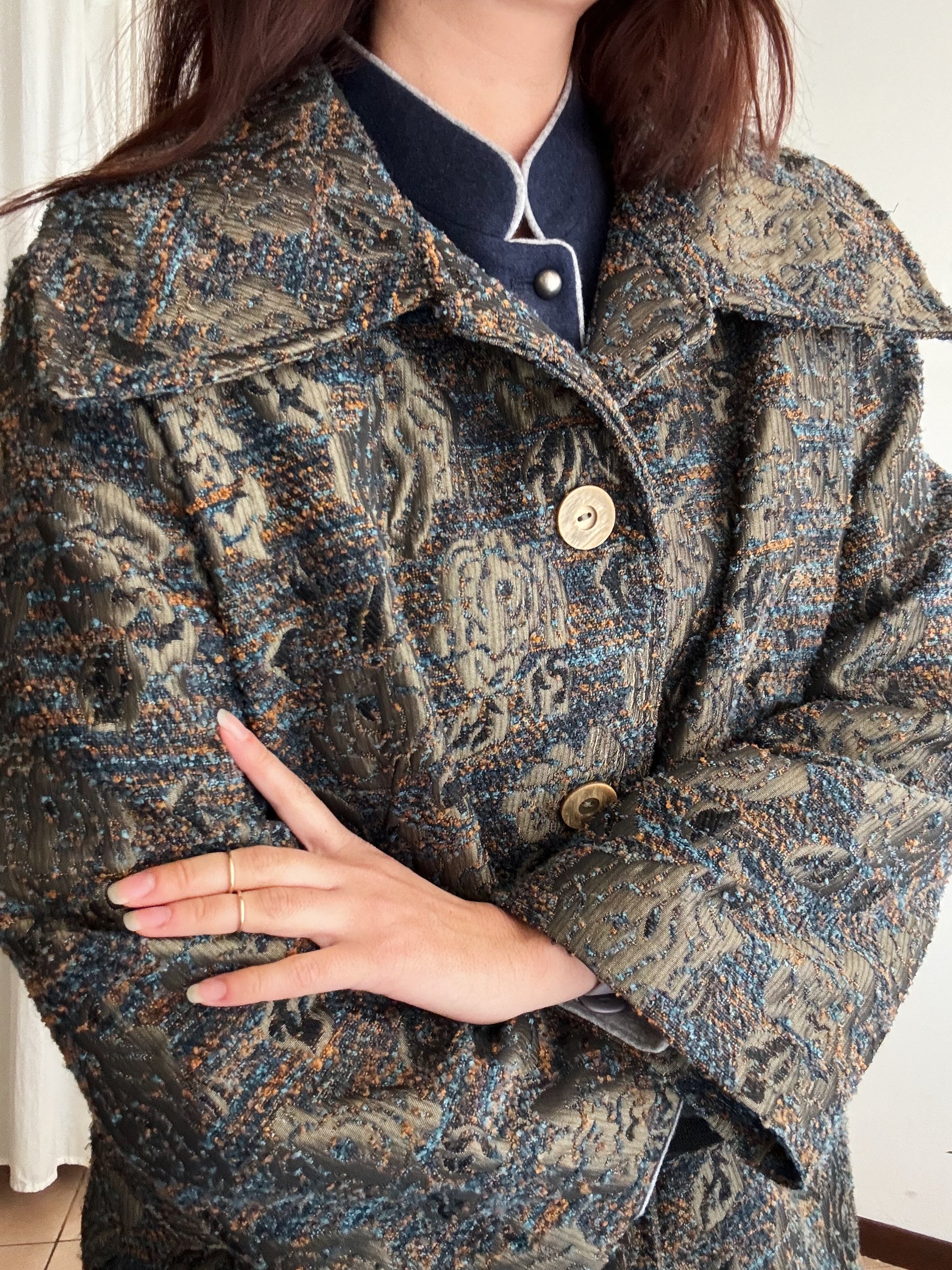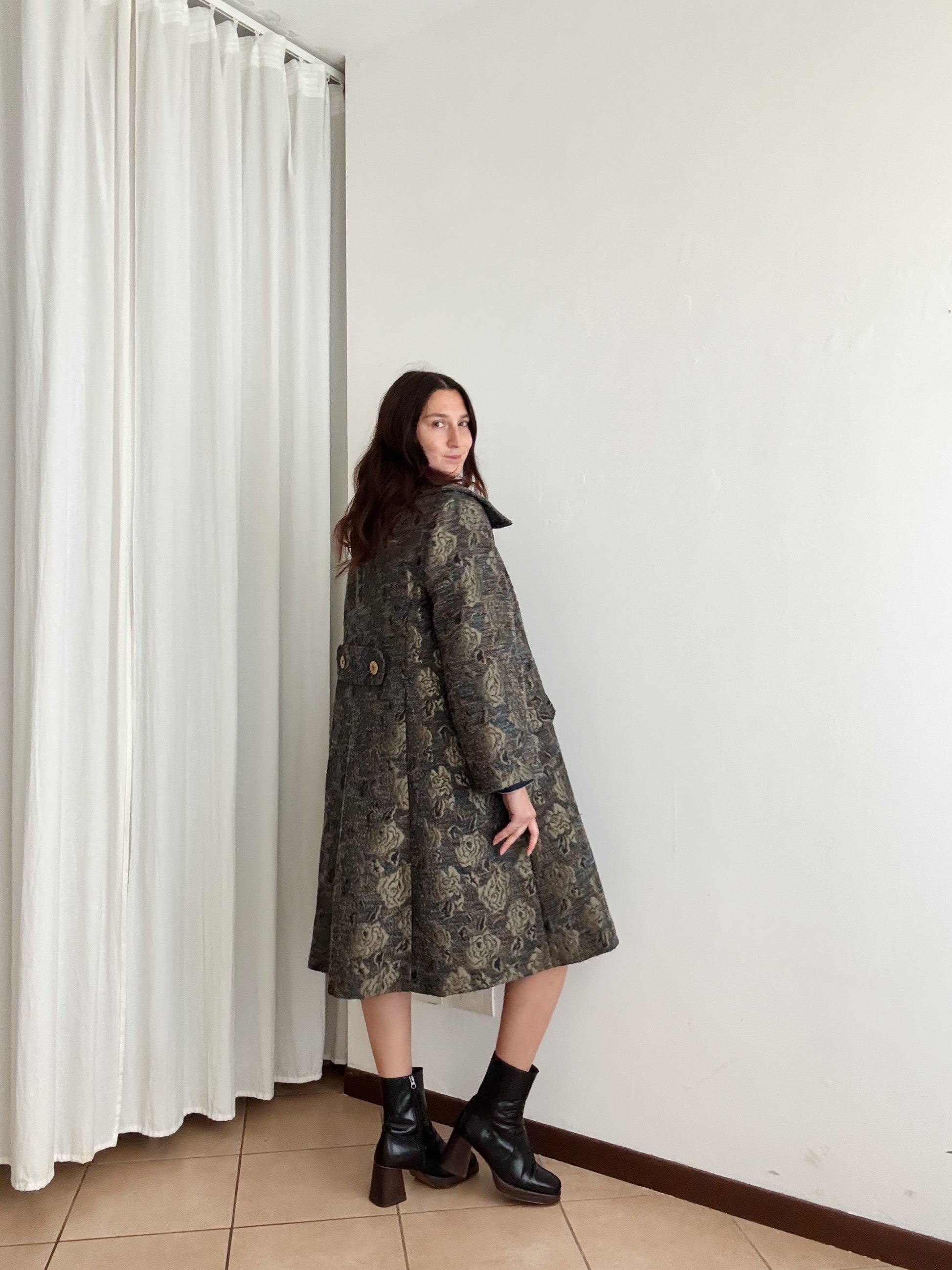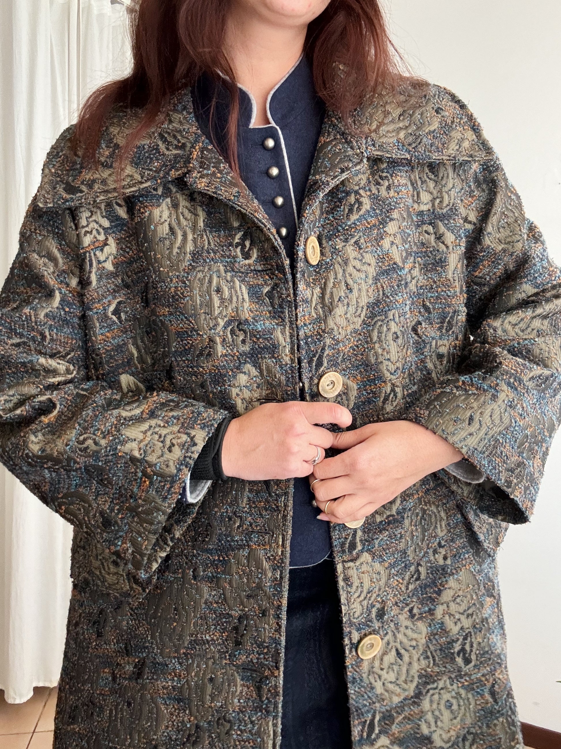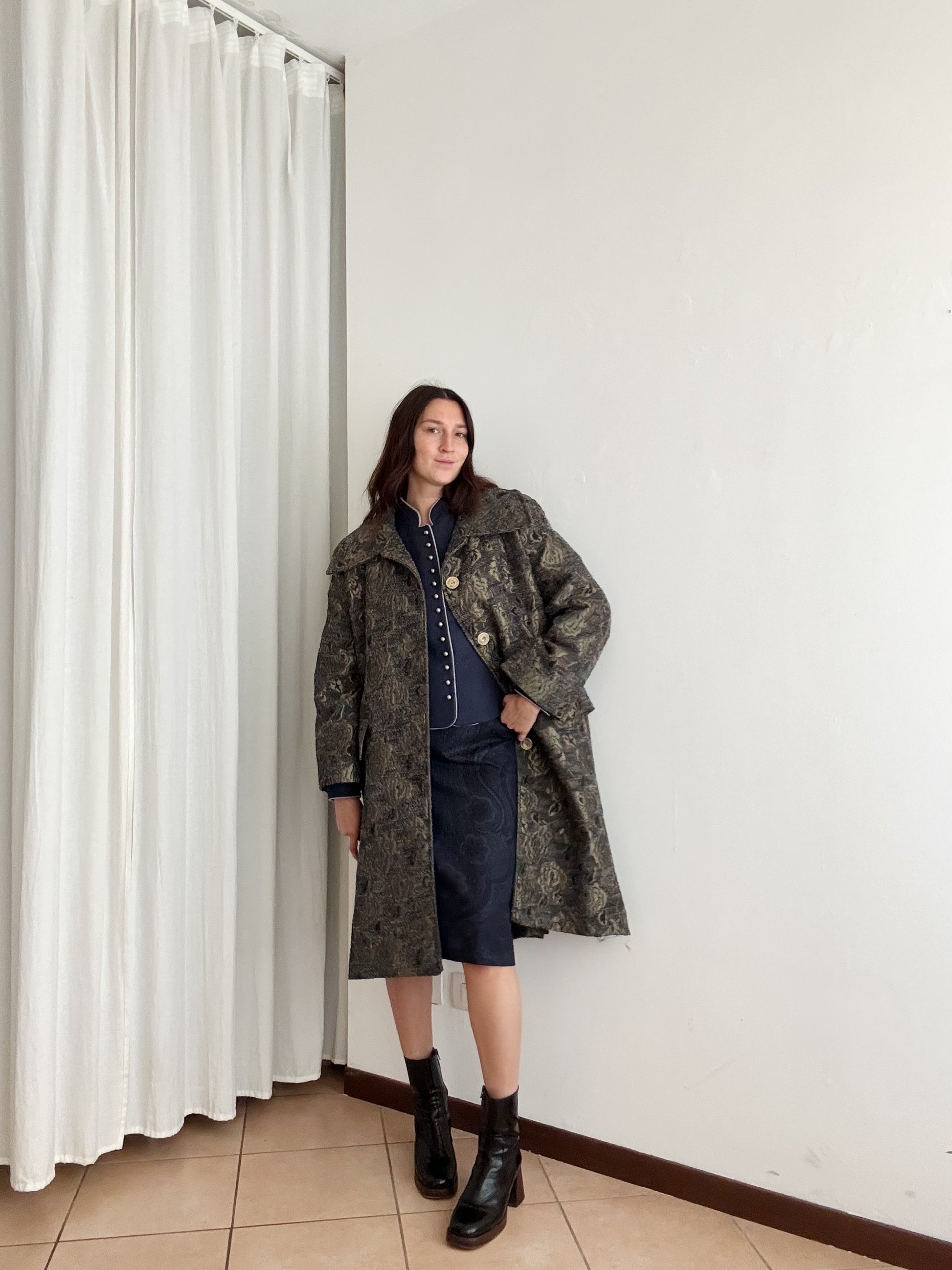 Spolverino vintage sartoriale in tessuto boucle e raso. Taglia non riportata ma veste fino a una L. Misure: spalle 49, ascelle 60 cm in piano, maniche 58. lunghezza 105 cm.