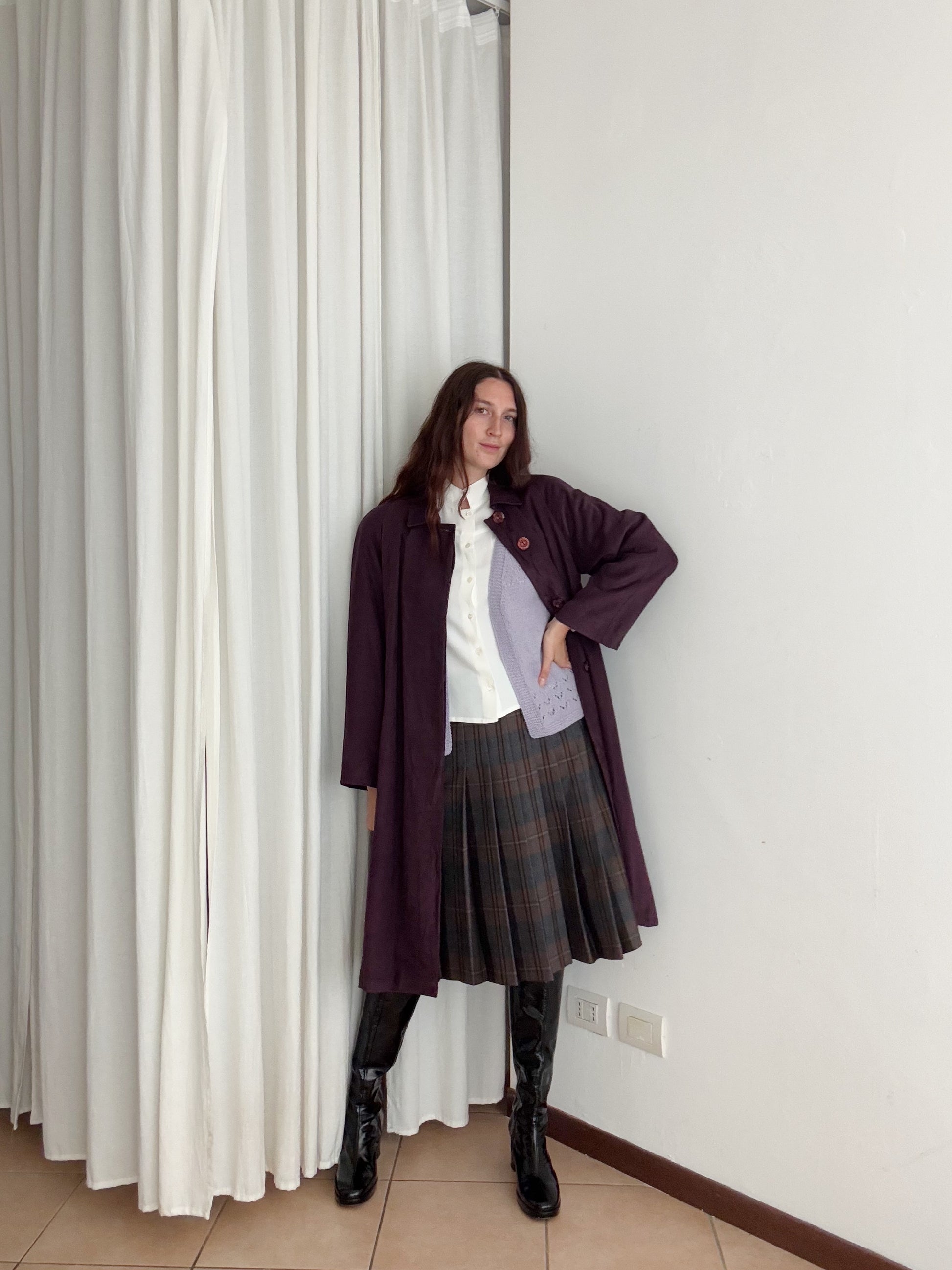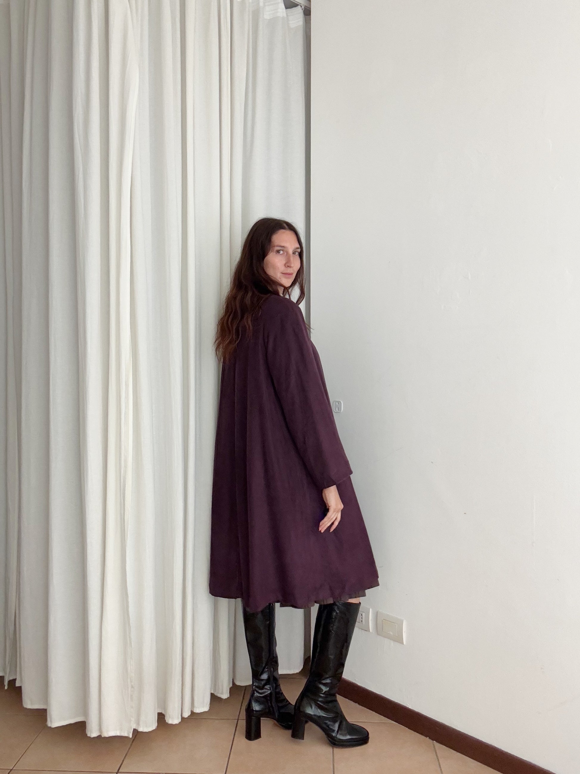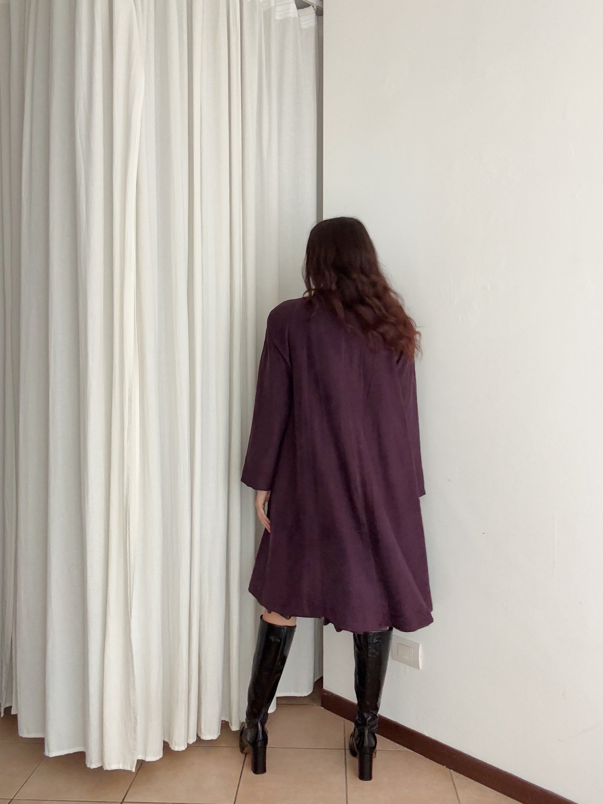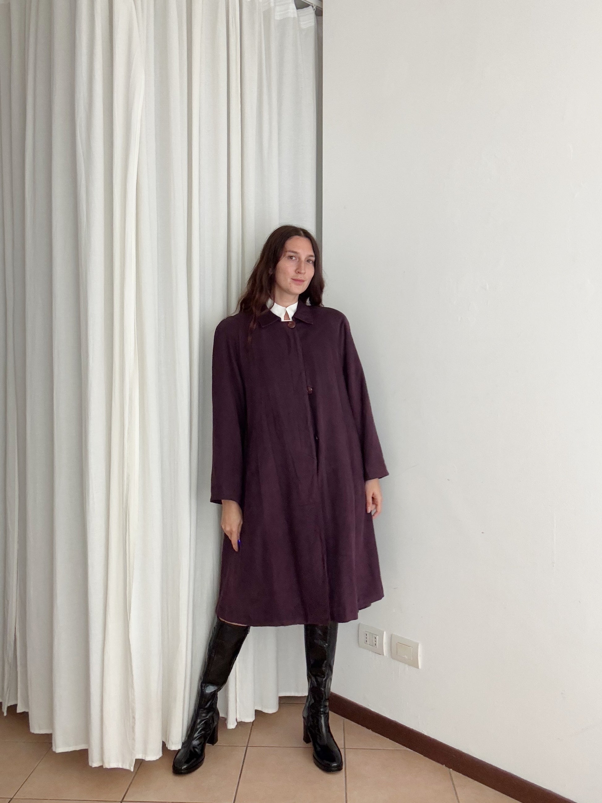 Spolverino vintage color viola melanzana o prugna taglia M. Misure: ascelle 55 cm in piano, lunghezza 110 cm.