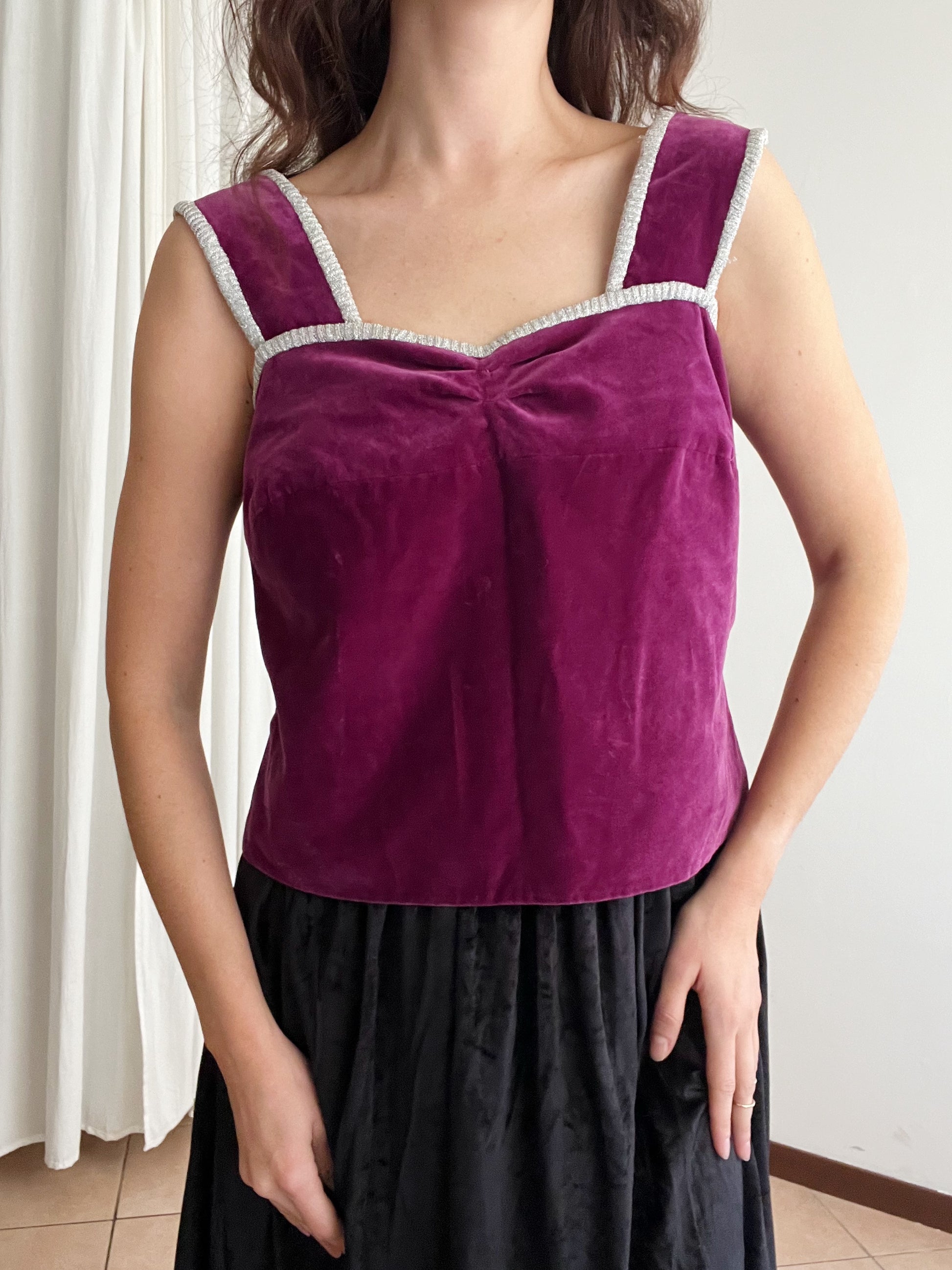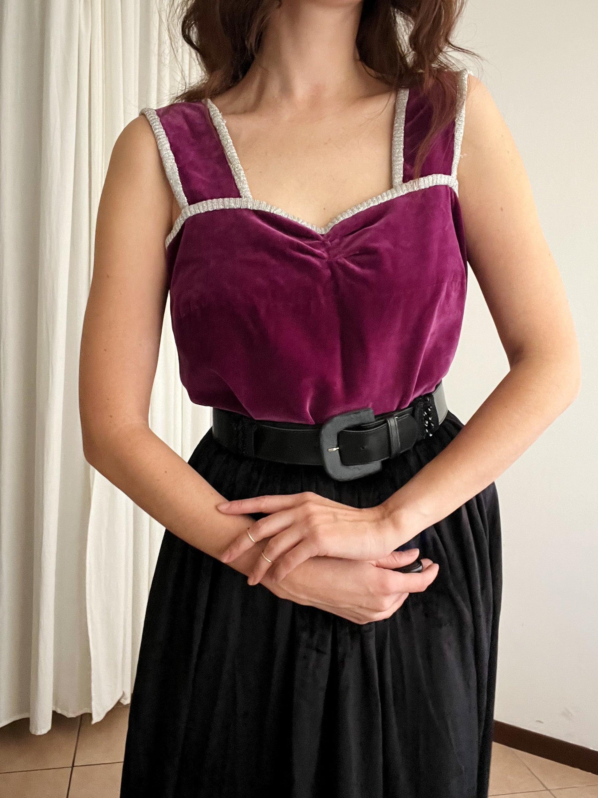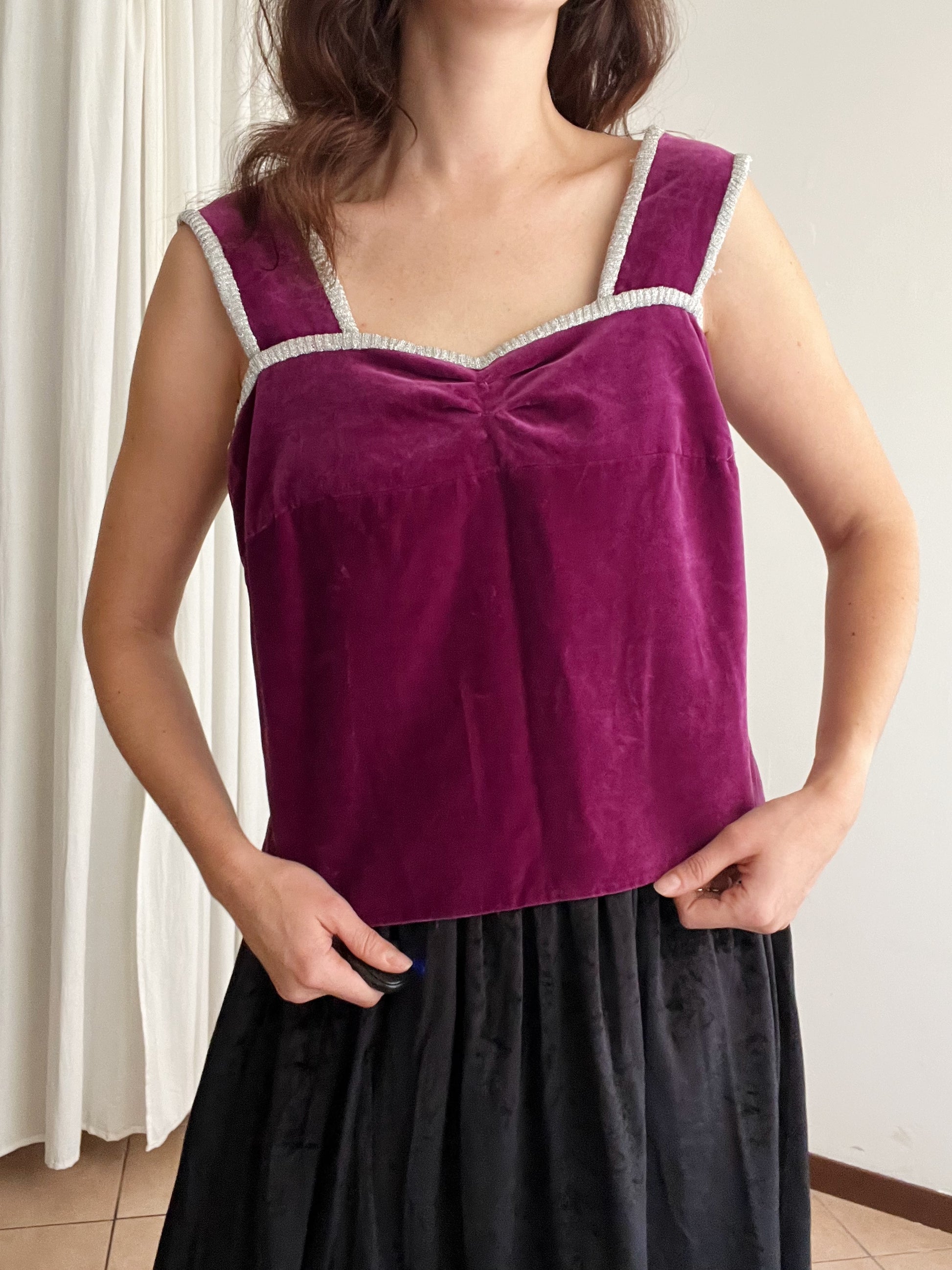 Top vintage in velluto con bordi in lurex argento. Taglia non riportata ma direi una L. Misura ascelle 48 cm