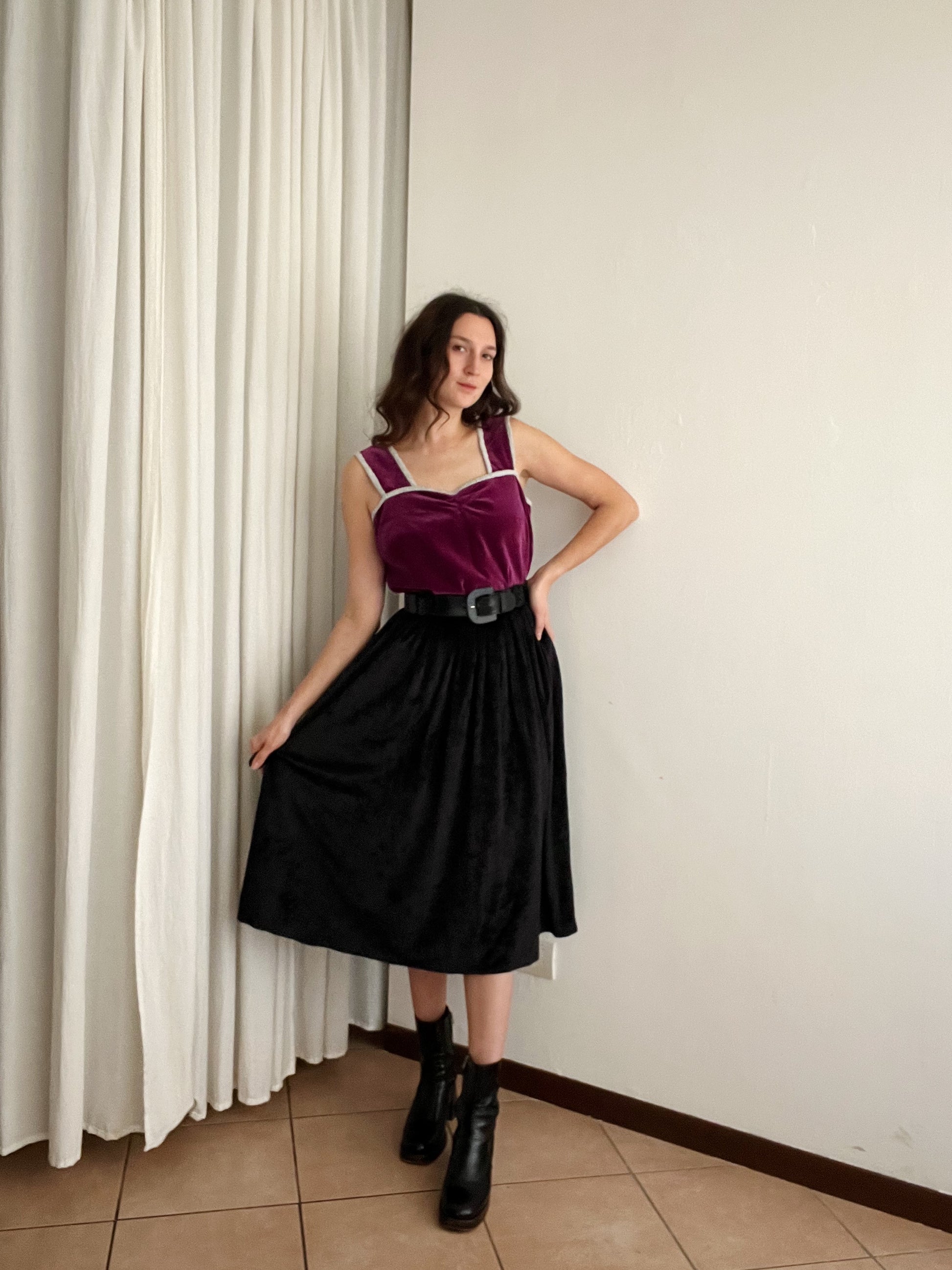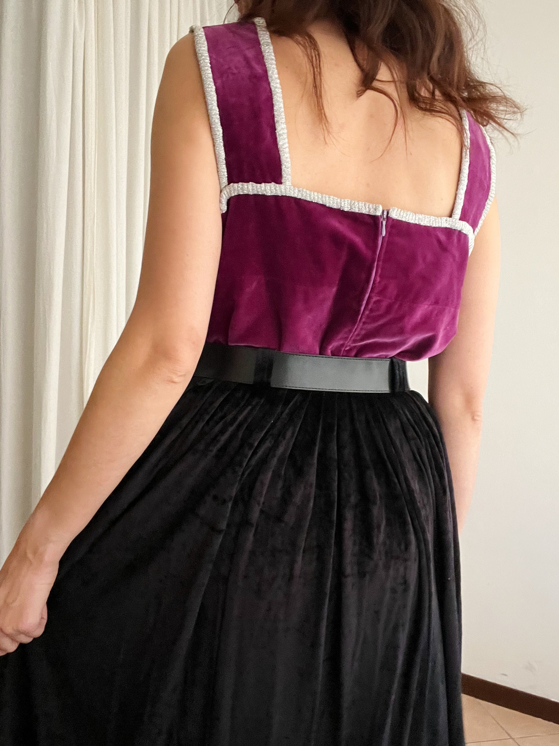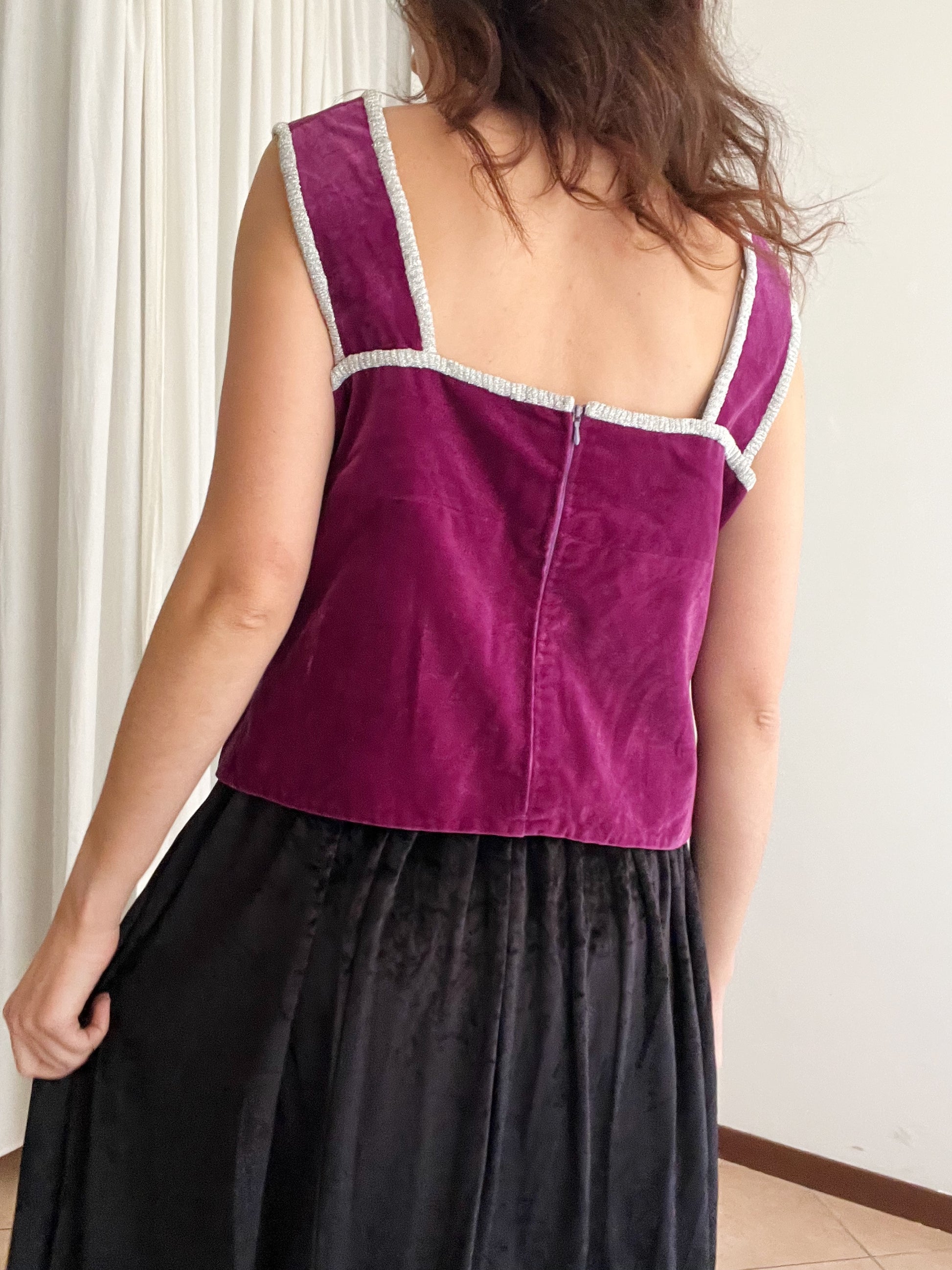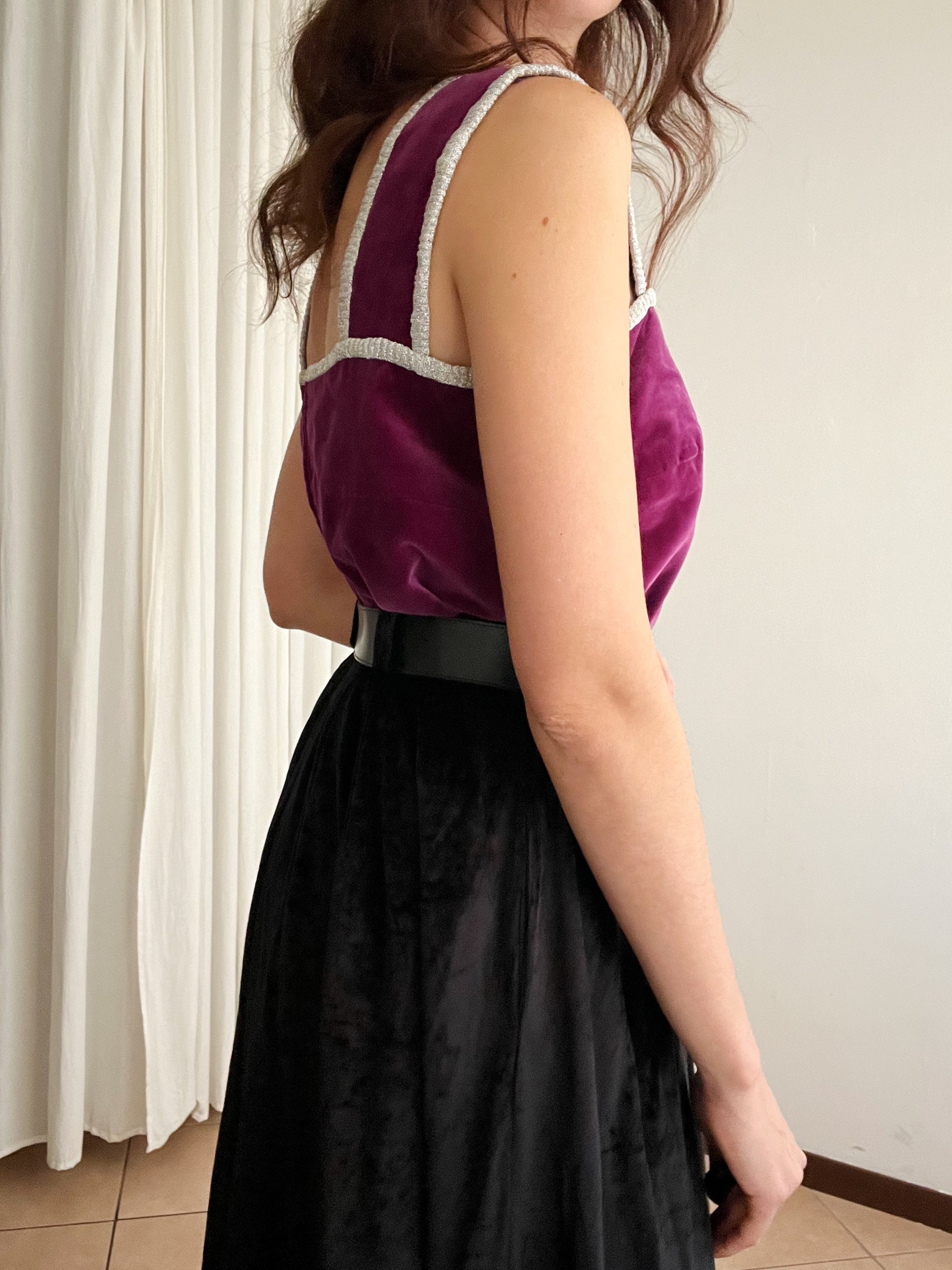 Top vintage in velluto con bordi in lurex argento. Taglia non riportata ma direi una L. Misura ascelle 48 cm