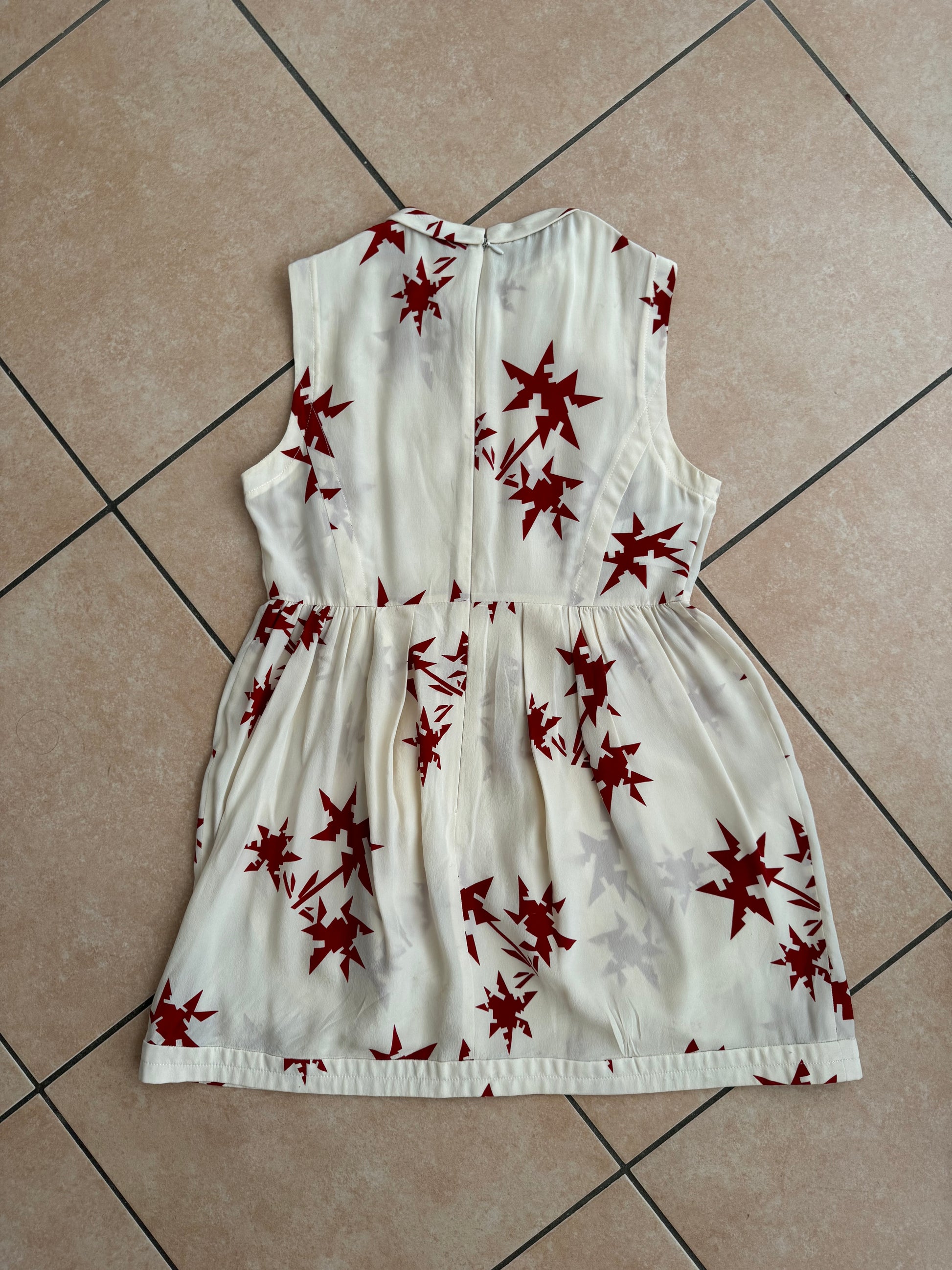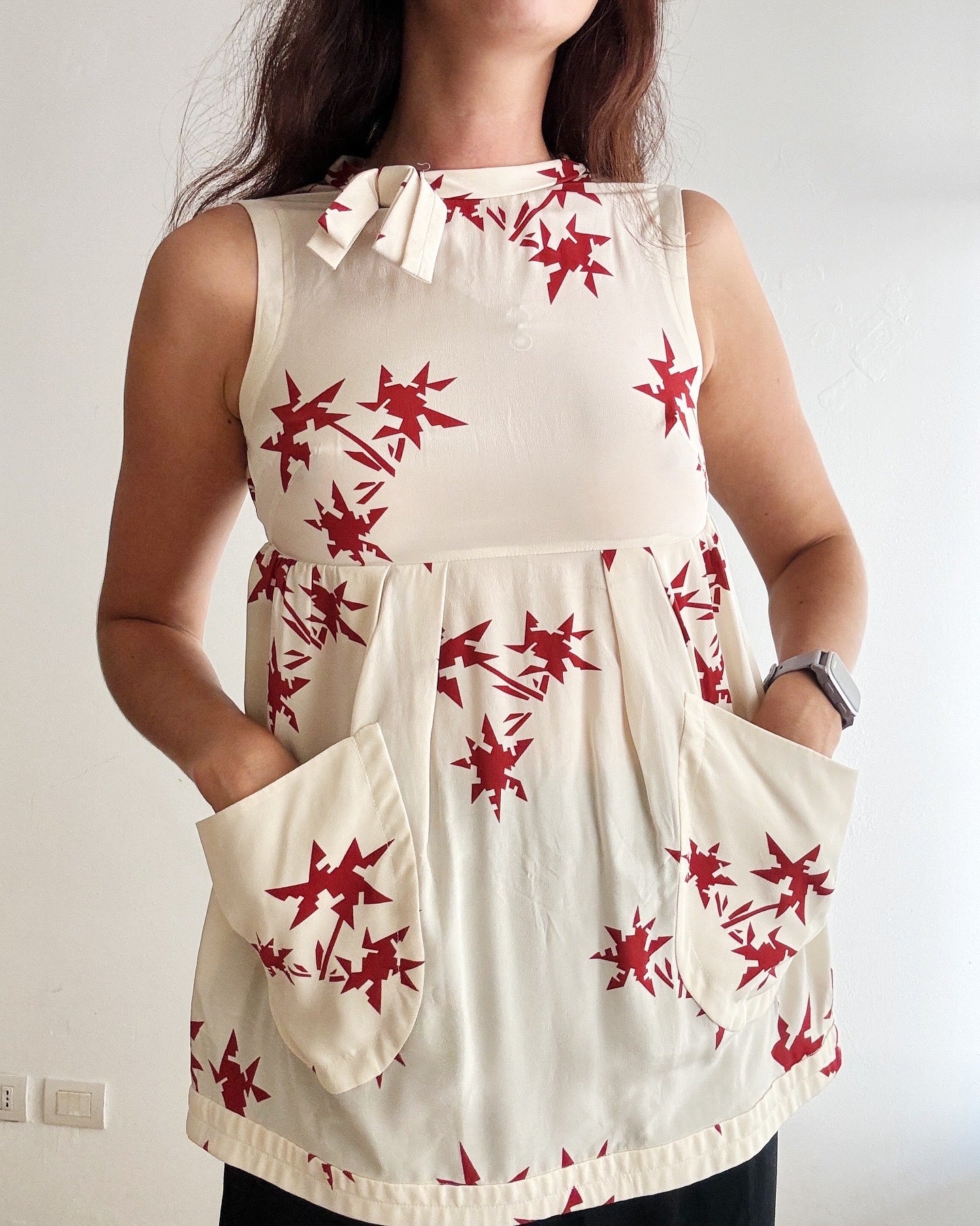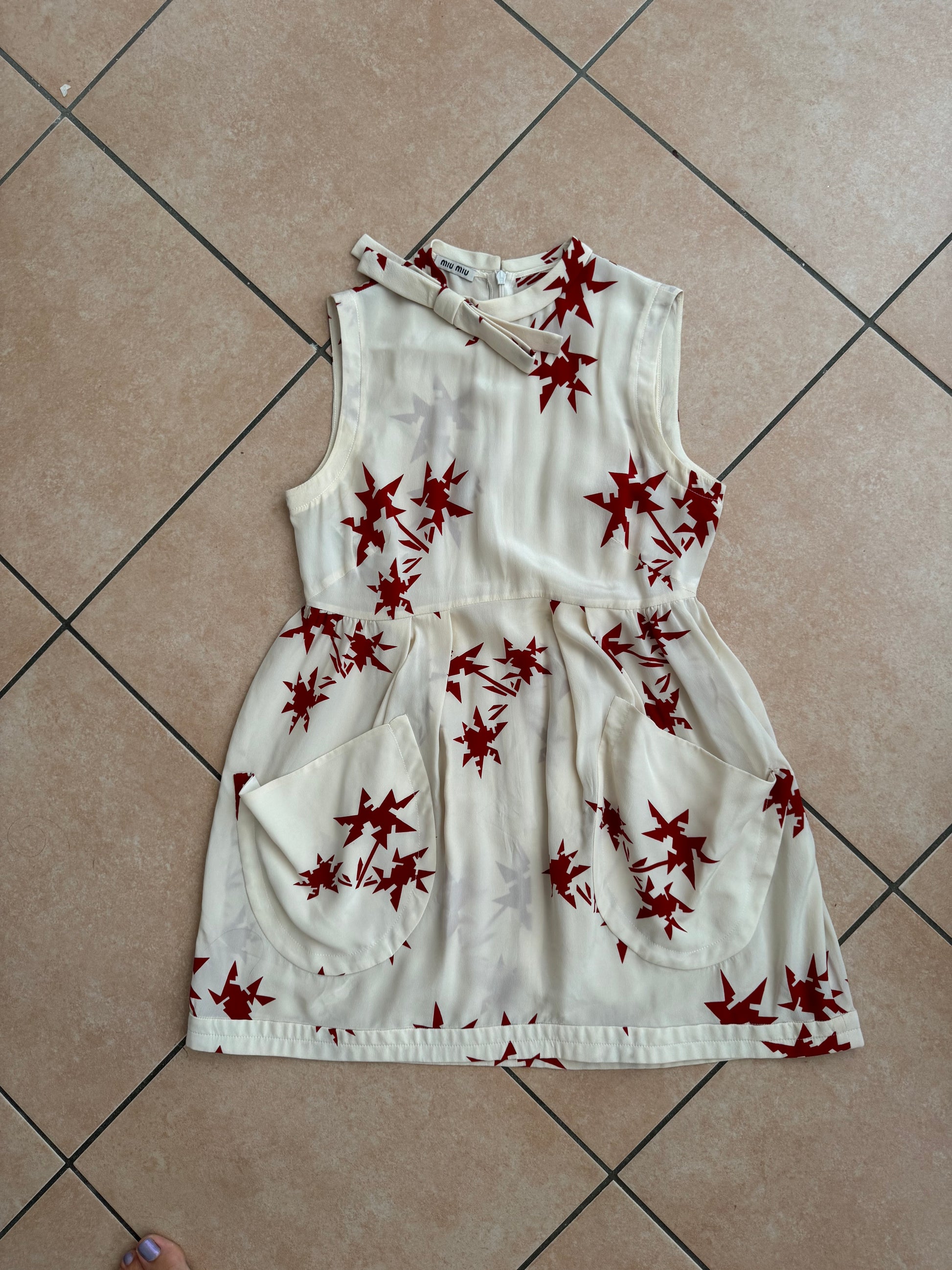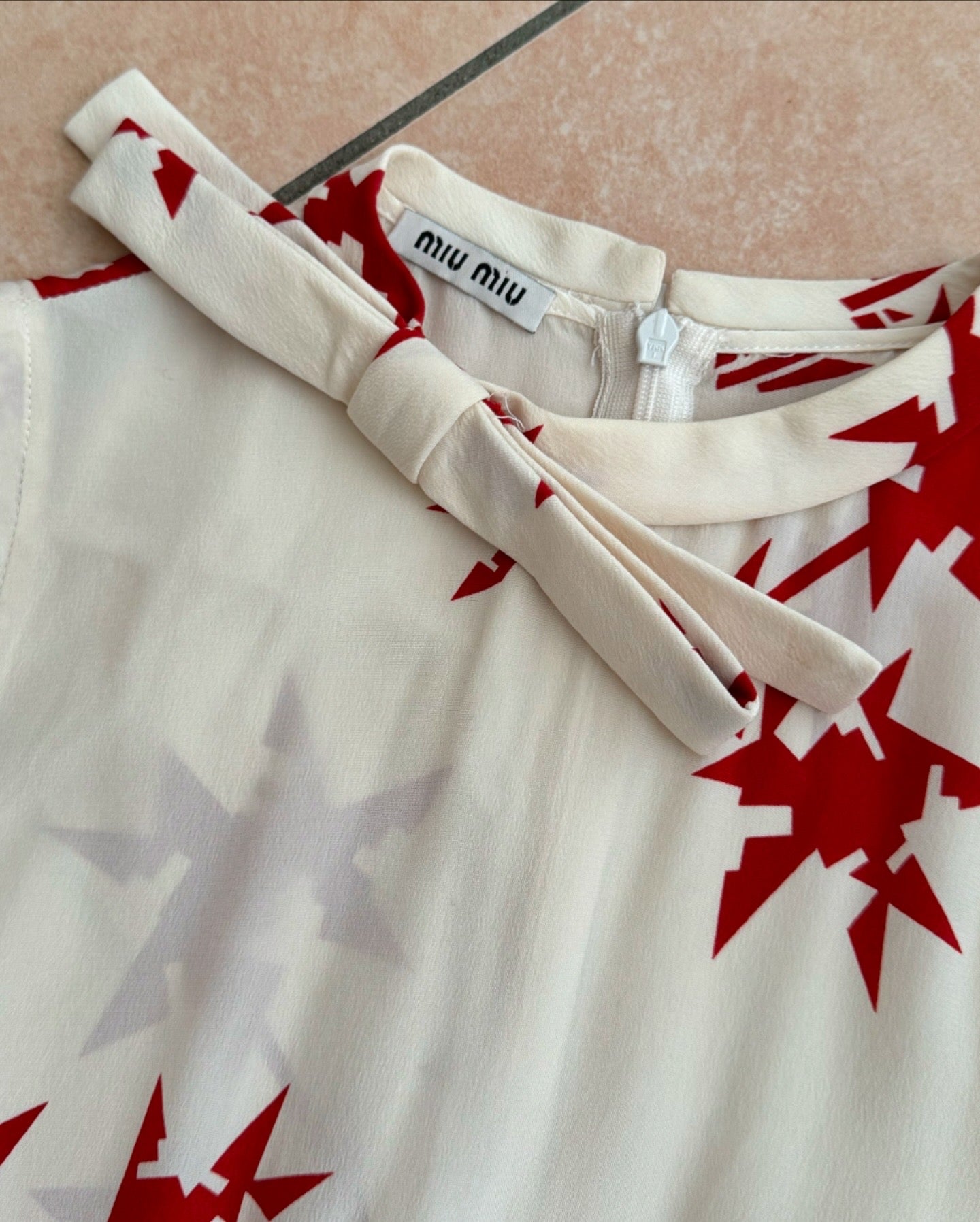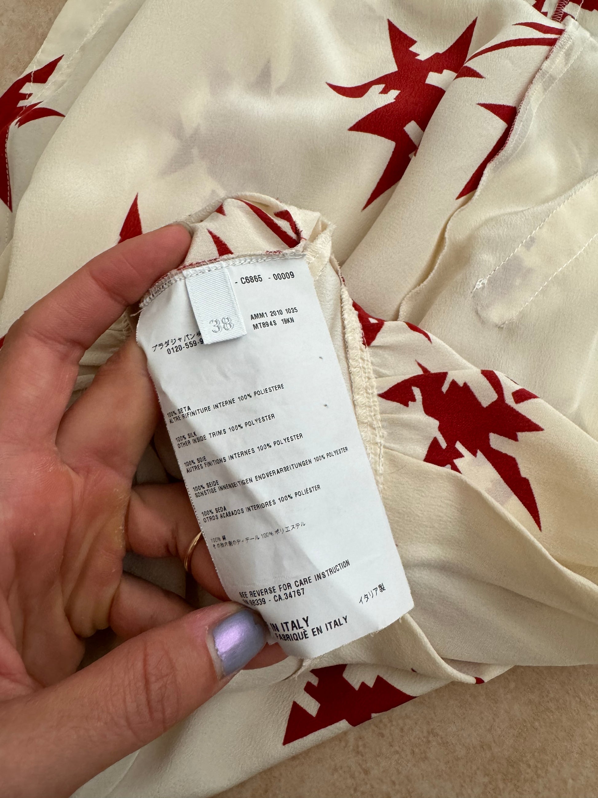 Nlusa in seta beige con stampa bordeaux firmata Miu Miu. Taglia 38. Misure: ascelle 40, vita 34, lunghezza 70.