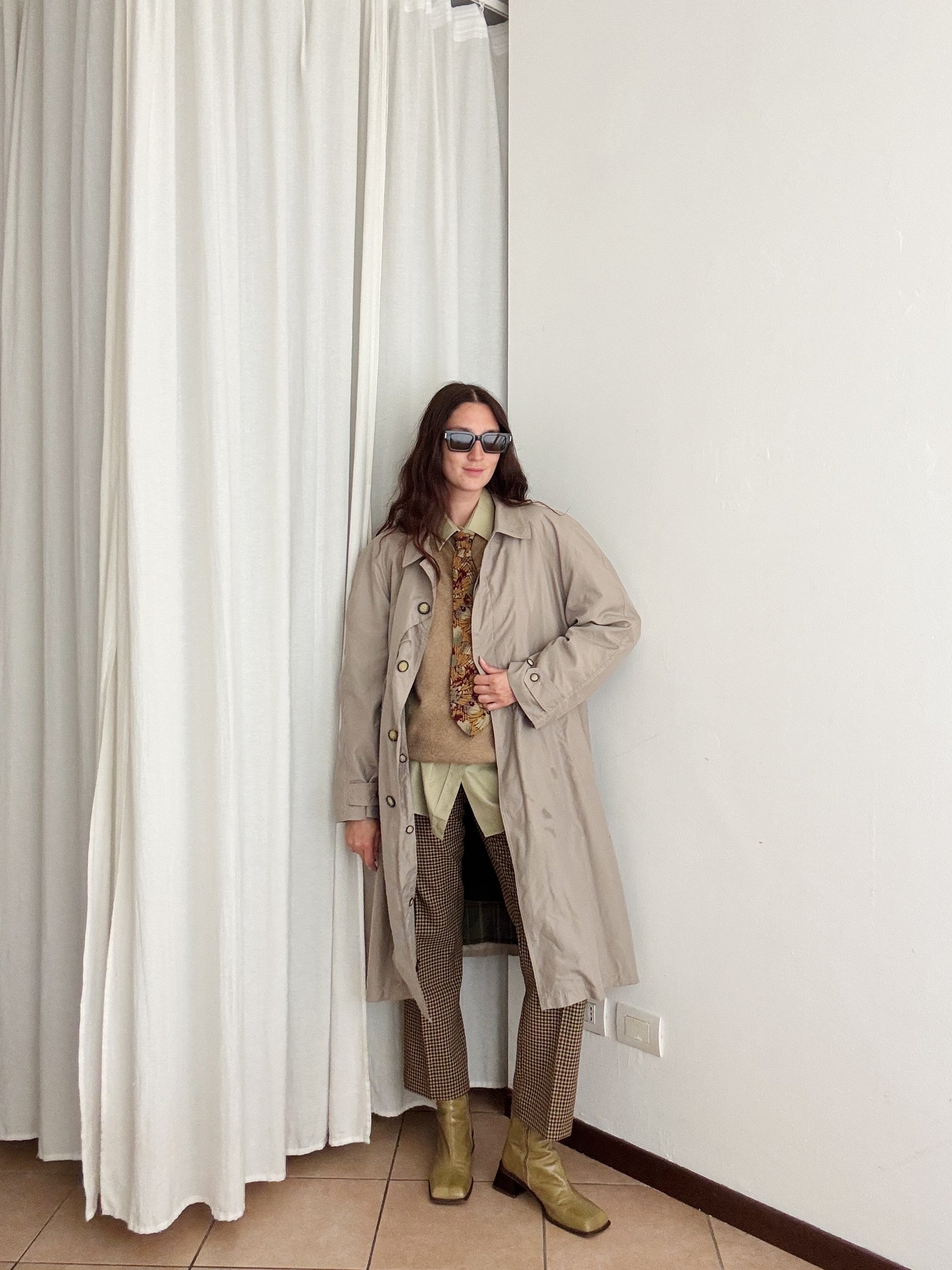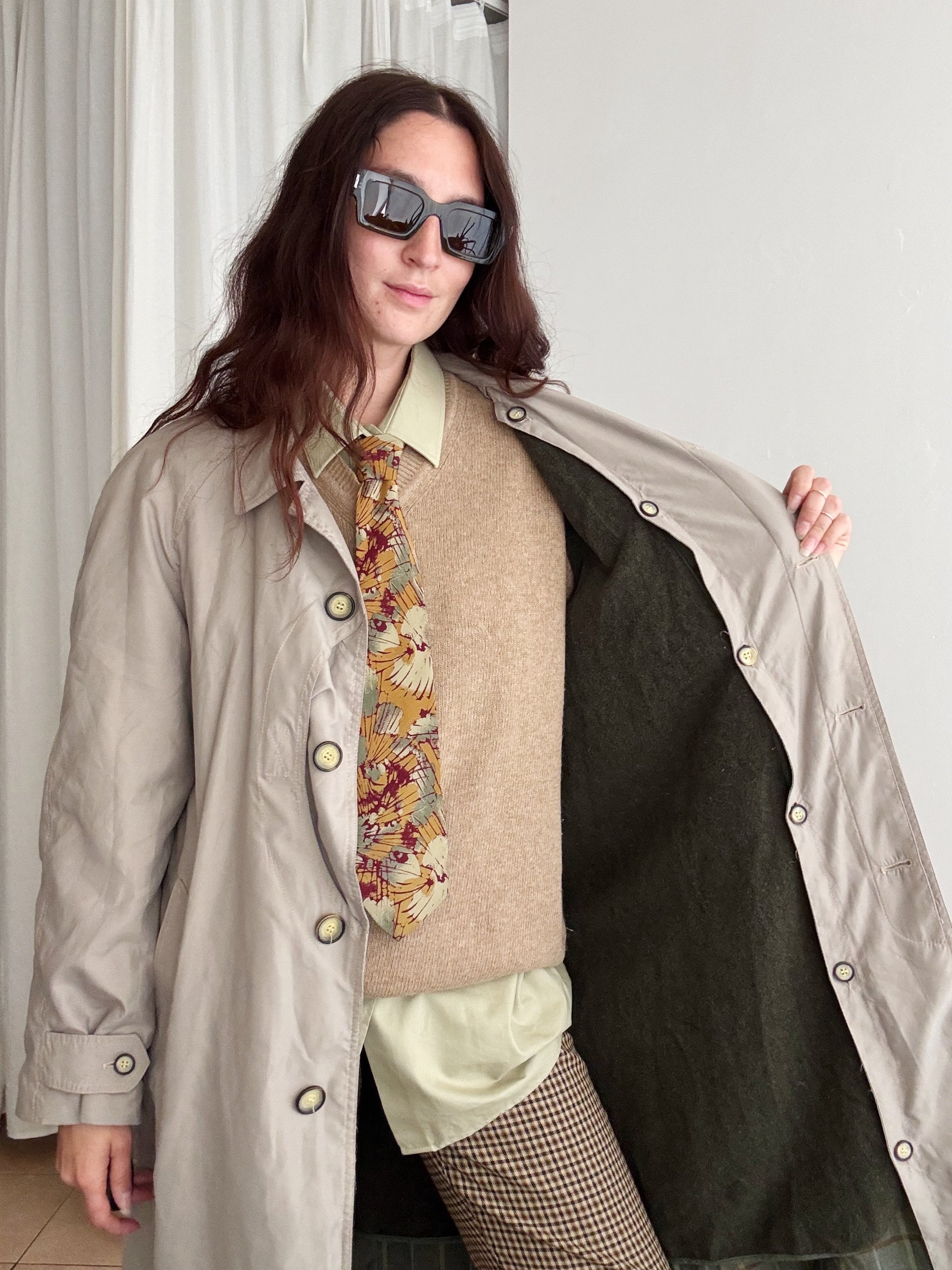 Trench vintage unisex beige con imbottitura in lana rimovibile. Veste taglia L . Misure: ascelle 61, lunghezza 109.